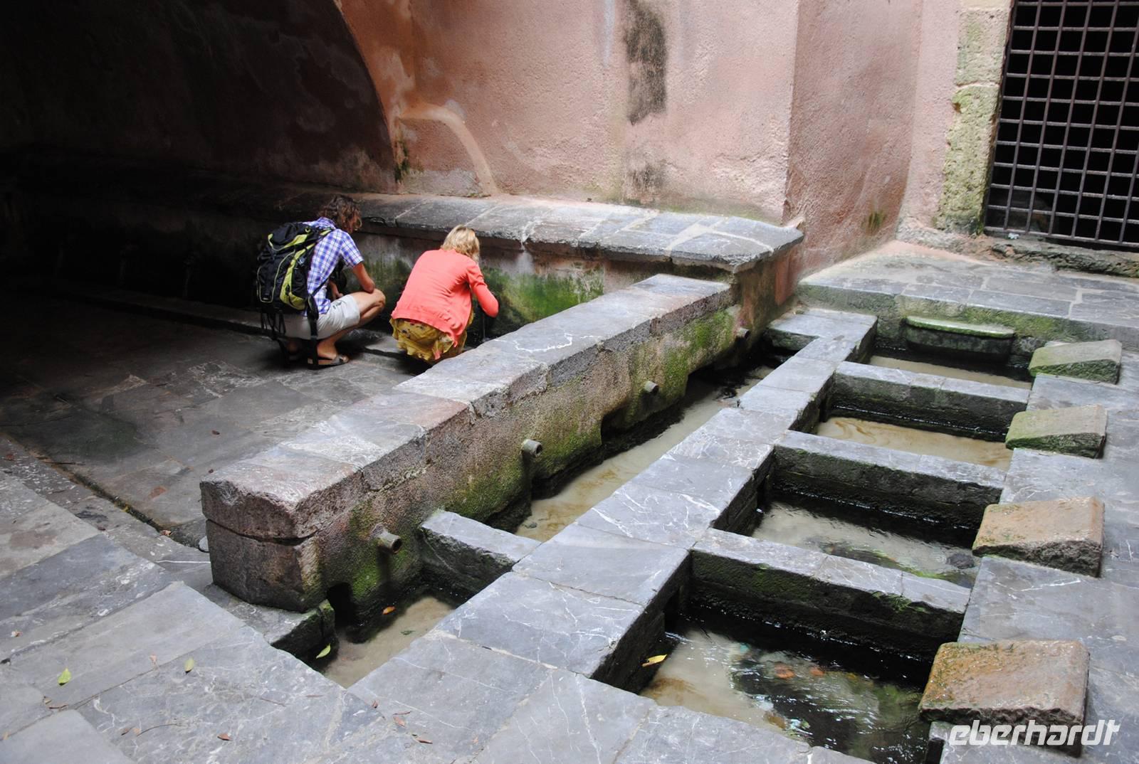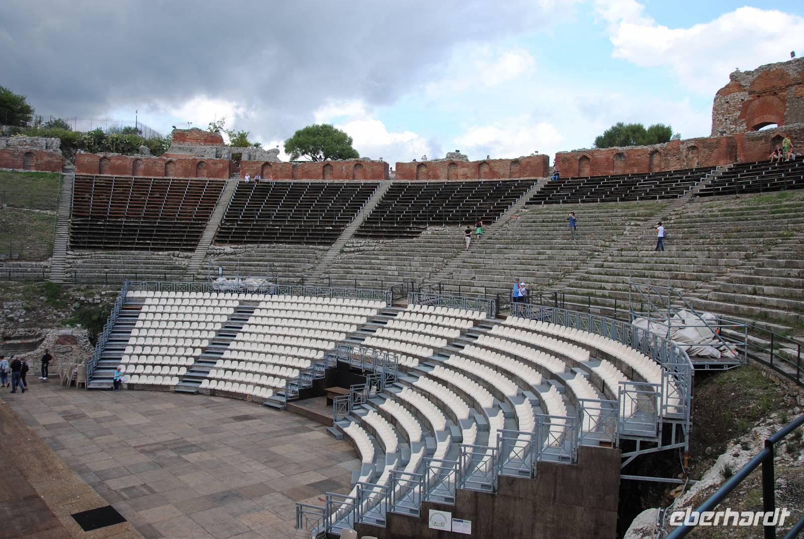 Nach dem Frühstück machten wir uns auf nach Catania, mit fast 300.000 Einwohnern ohne die vielen Tagestouristen mitgerechnet ist sie die zweitgrößte Stadt der Insel. Lebhaft, chaotisch, liebenswürdig, phantasievoll und unberechenbar. All diese Attribute treffen für diese Stadt zu. Die Gebäude aus Lava- u. Kalkstein wirken dunkel u. grau. Manchmal wirken sie wie Phönix aus der Asche kommend. Kein Wunder, sind sie doch von der „Patina" des Ätnastaubs überzogen. Der Berg „La Montagna" ist überall präsent und die Einheimischen haben ein liebevolles Verhältnis zu ihm, trotz des Unheils, den er auch über Catania mehrfach brachte. Die erste vorgeschichtliche Ansiedlung, aus der diese Stadt dann entstand, lag auf einem aus elf verschiedenen Schichten geformten Hügel. Obwohl heute die Denkmäler eher stiefmütterlich behandelt werden suchten wir dennoch die wichtigsten der Stadt auf. Im Stadtzentrum herrscht ein eleganter italienischer Spätbarock vor. Unseren gemeinsamen Rundgang begannen wir am Domplatz. Nach dem Dom, Elefantenbrunnen, Piazza Mazzini, S Nicolo l'Arena, um nur einige zu nennen, durfte auch der Fischmarkt natürlich nicht fehlen. Nach etwas Zeit für eigene Erkundungen und Mittagspause ging es am Nachmittag nach Taormina. Es ist ein kleines schmuckes Dörfchen, das früher nur mit Mauleseln erreicht werden konnte. Das Landschaftsbild das sich dort bot ist kaum zu übertreffen. Die Reste von der Stadtmauer, einige Paläste und Kirchen aus dem späten Mittelalter im sog. arabisch-normannischen Stil geben dem Ort einen besonderen malerischen Charakter. Schon Baron Wilhelm von Gloeden hielt schon Ende des 19. Jh. hier alles fotographisch fest. Erst. mit diesen Bildern hatte man das Interesse für den Ort geweckt und so kamen zuerst der sog. „Elitetourismus" in den Wintermonaten, bevor jetzt eher der Normaltourismus in den Sommermonaten kommt. Vorbei an Eisdielen und Souvenirläden ging es direkt zunächst zum griechischen Theater. Schon Goethe war von ihm entzückt und unzählige Gemälde und Stiche aus dem 18. u. 19. Jahrhundert haben es zur bekanntesten antiken Ruine Sizilien werden lassen. Zwar kleiner als das Theater in Syrakus aber durch den Umbau und die damit verbundenen zusätzlichen Holzsitze bot es deutlich mehr Platz. Ebenfalls sind die baulichen Veränderungen des Orchestras anzumerken, die für Gladiatorenkämpfe und blutige Wasserkämpfe genutzt wurden. Vom grölenden Etna oder Zeus knurrender Magen wurden wir etwas überrascht. Nach einem kurzen Stopp am Eisstand ging es zum Stadtpark mit herrlichen Blick auf die Bucht und das Meer. Leichter Regen setzte ein, der aber dem weiteren Verlauf keinen Abbruch tat. Noch etwas Zeit für eigene Erkundungen und dann ging es wieder in Richtung Hotel zurück, wo schon ein gutes Abendessen auf uns wartete. Während der Rückfahrt wurden wir mit einem herrlichen Regenbogen und einen Blick zum Festland Kalabrien für den kurzen Regenschauer entschädigt.