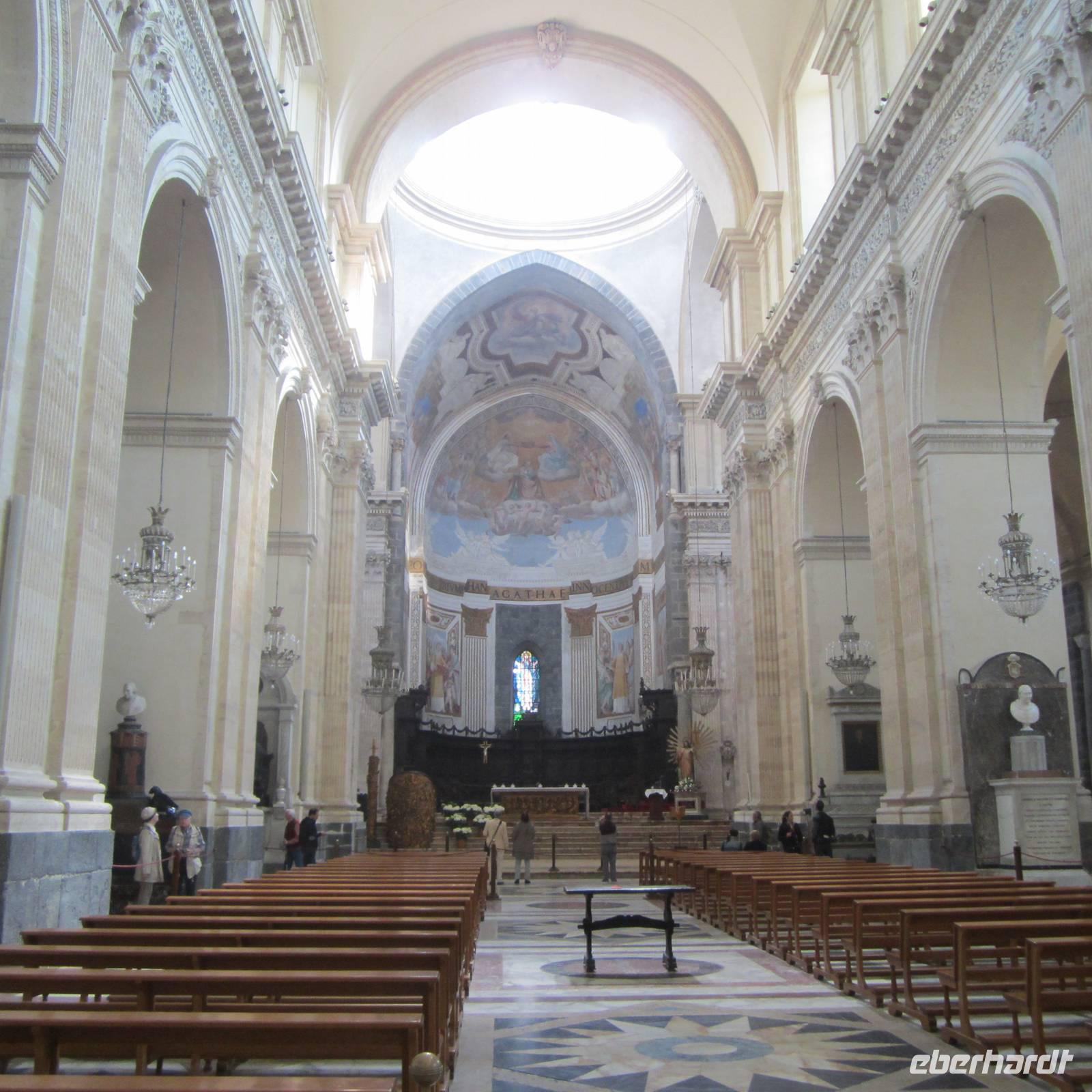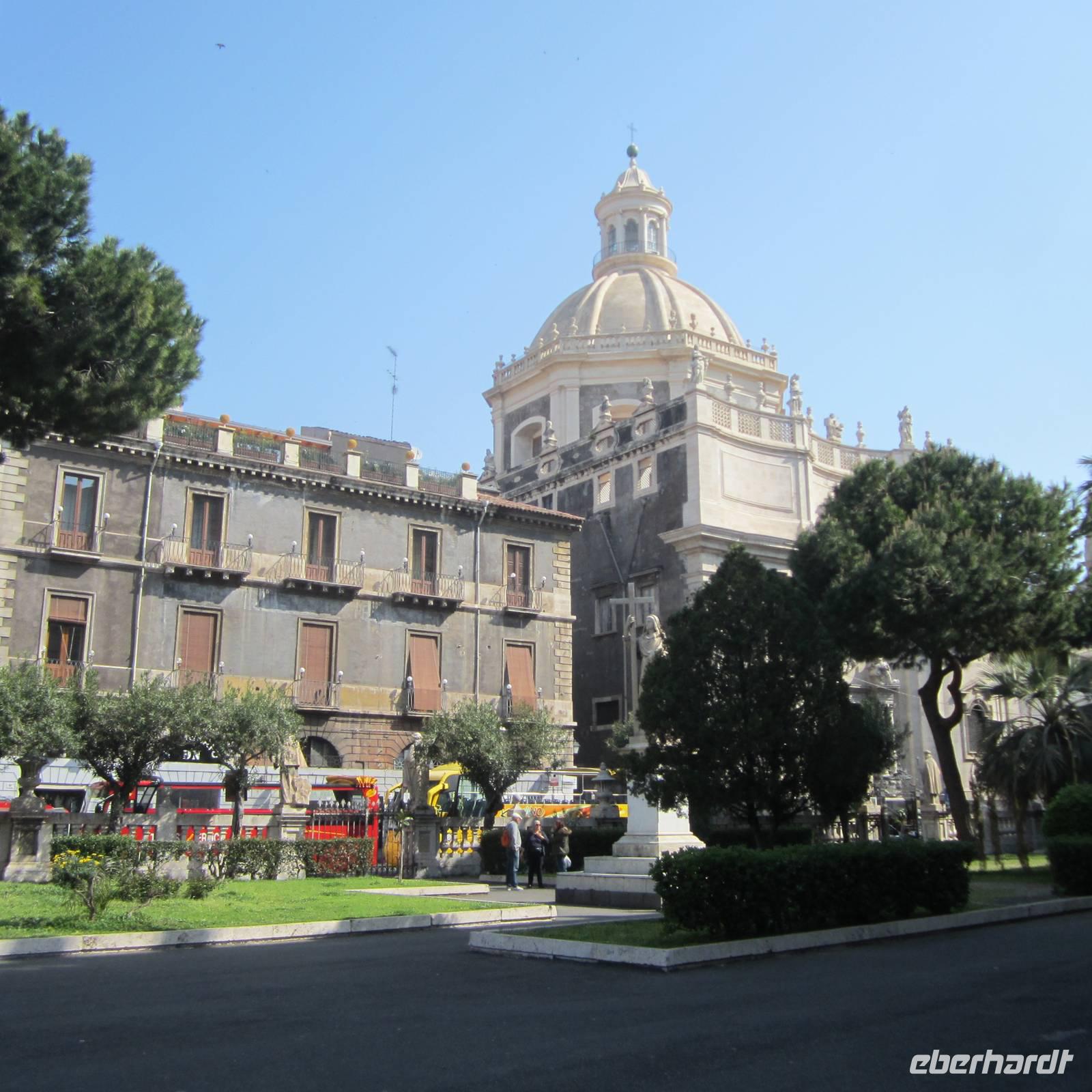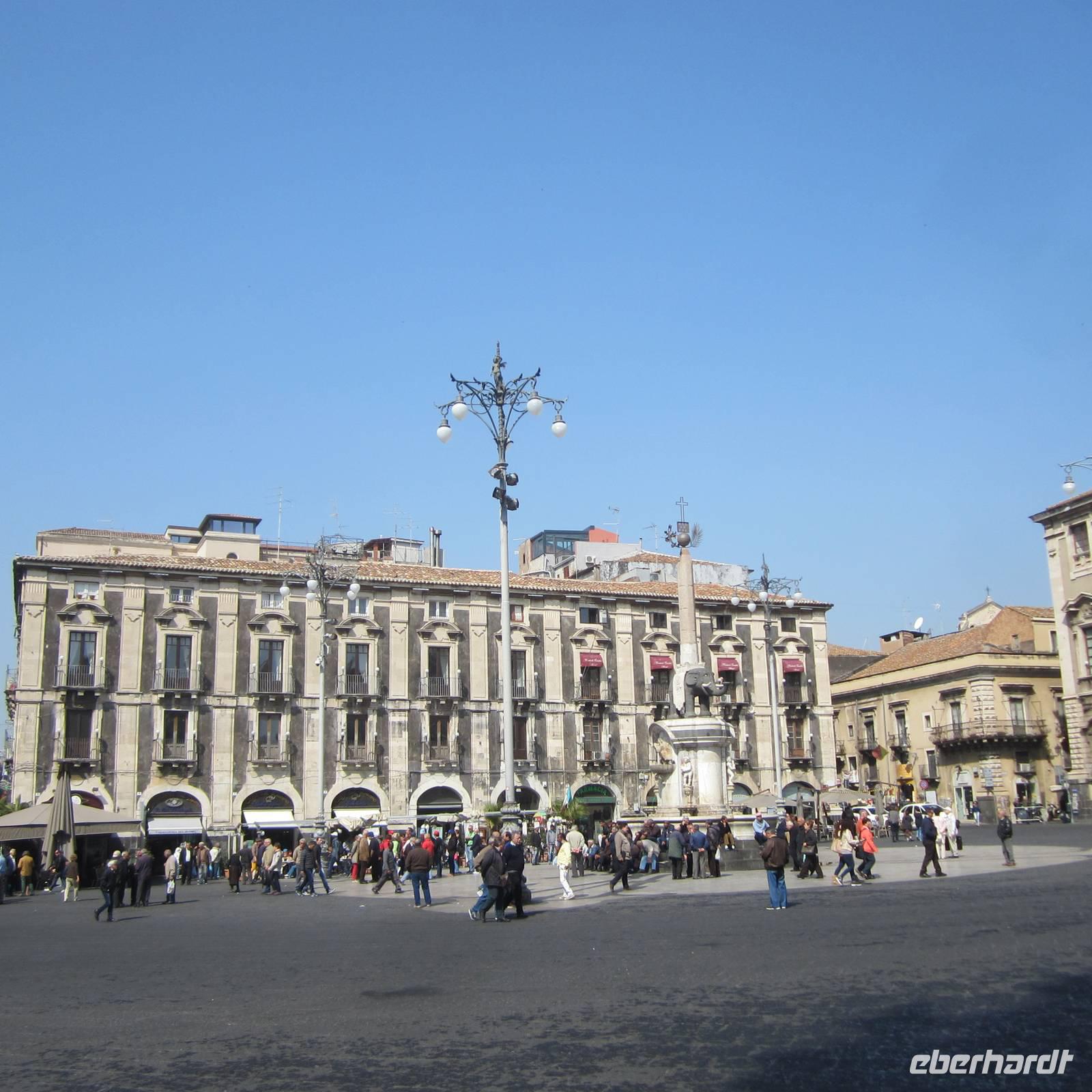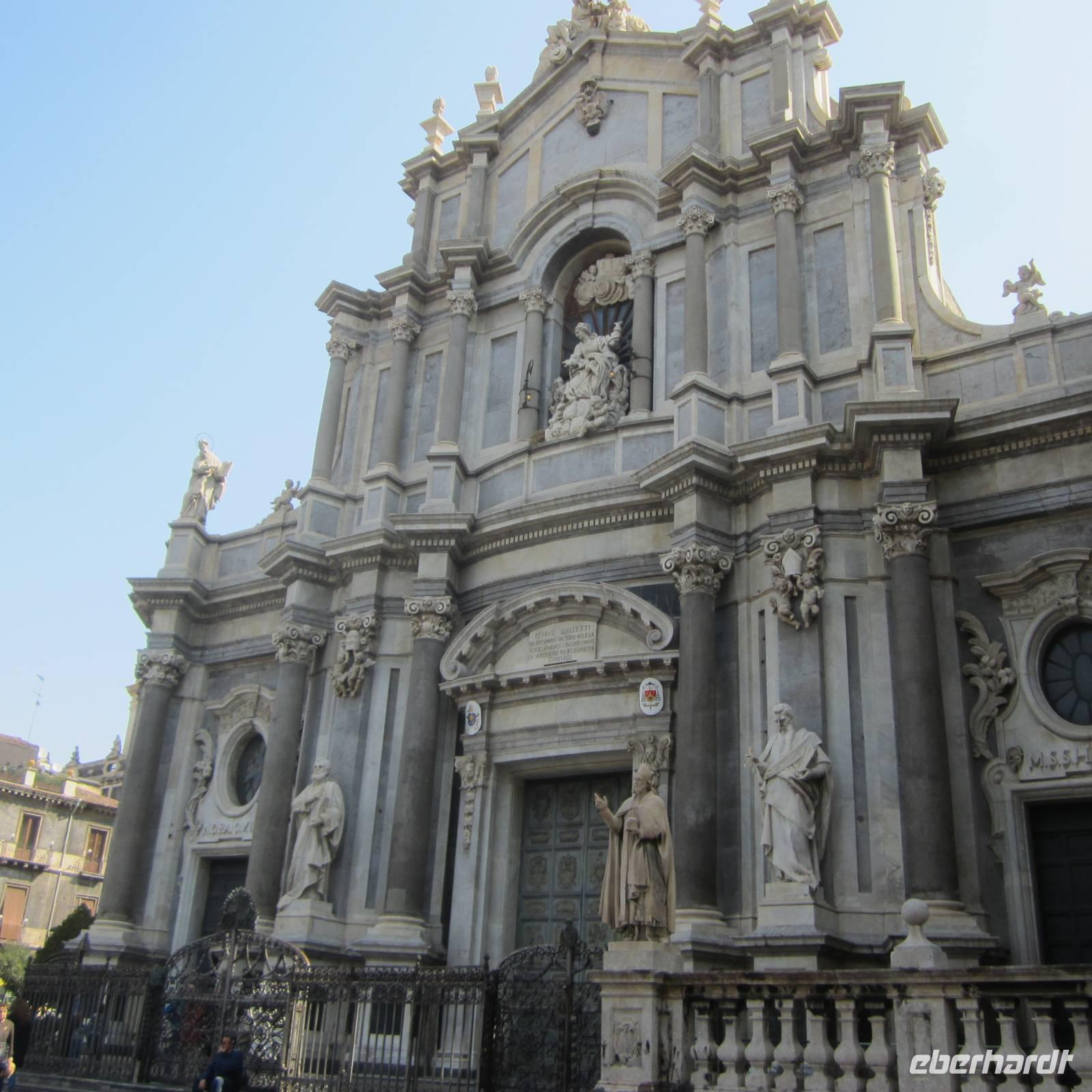 Auf dem Programm für heute stehen zwei Städte an der Ostküste. Catania ist die erste Stadt, die wir kennen lernen. Sie liegt in einer fruchtbaren Ebene zwischen Ätna und Meer, der Piana di Catania. Wir erleben eine vitale Stadt mit der ältesten Universität von Sizilien und entlang der Via Etnea erkennen wir ihre barocken Sakral-und Profanbauten. Auf dem Piazza del Duoma sehen wir den Elefantenbrunnen, das Symbol der Stadt. Der Elefant aus schwarzer Lava trägt einen kleinen ägyptischen Obelisken.(Vorbild war Berninis Elefantenobelisk in Rom). Dem Brunnen gegenüber besuchen wir den Dom Sant Agata. An dem Ort soll die heilige Agathe 251 den Märtyrertod erlitten haben.