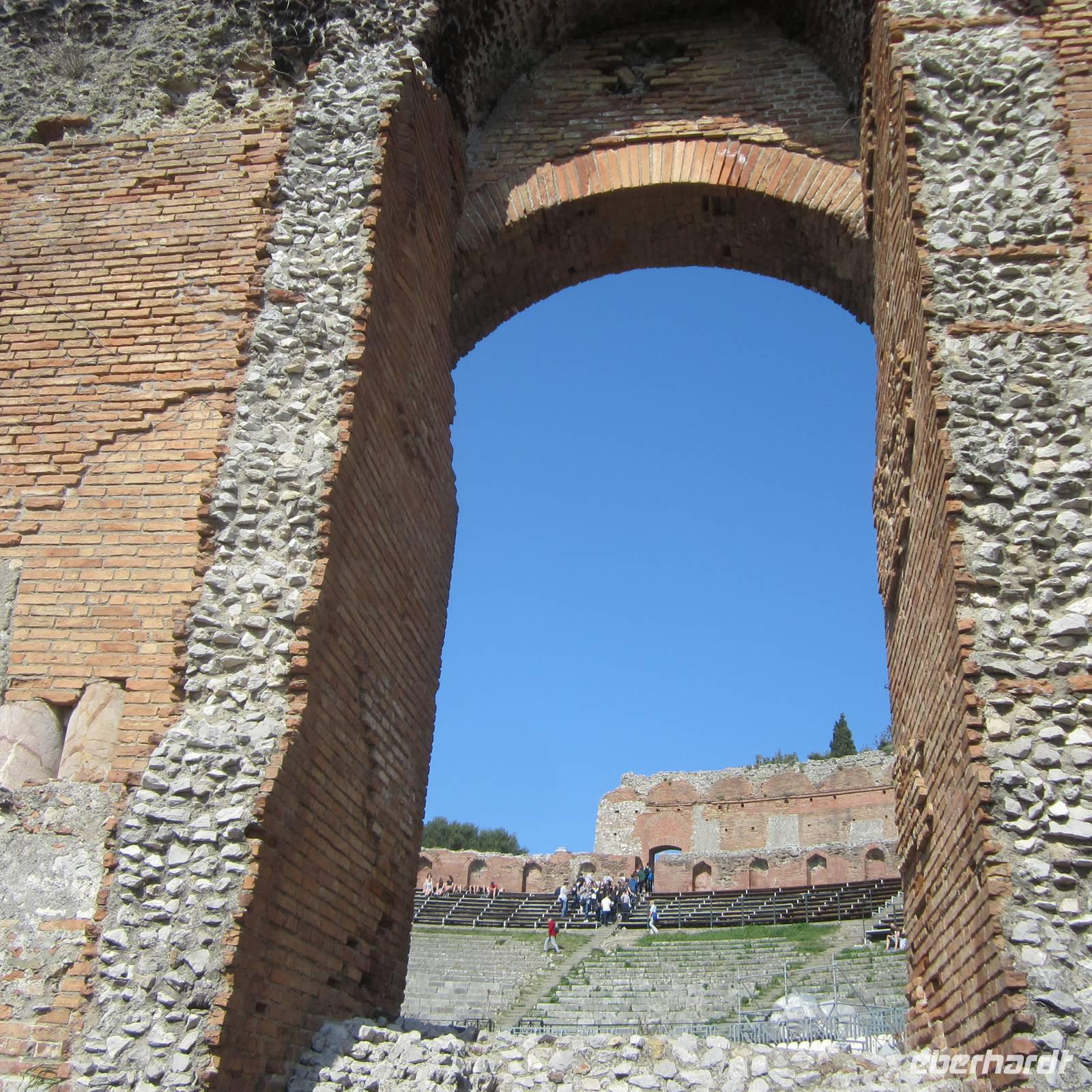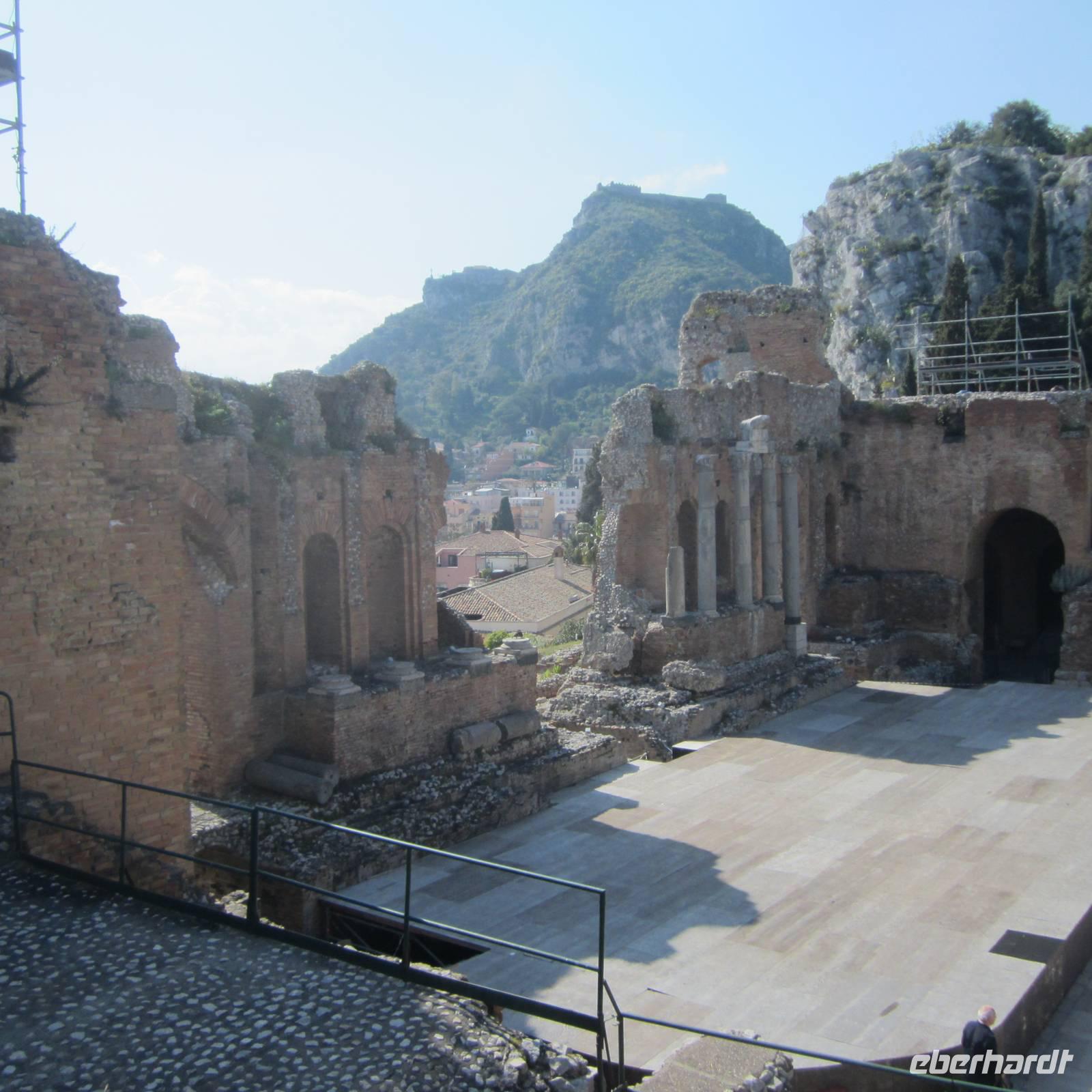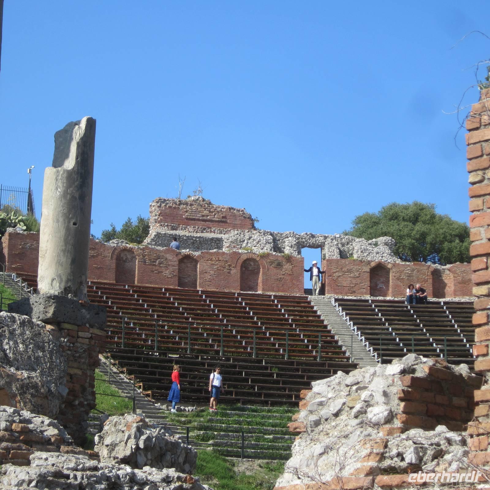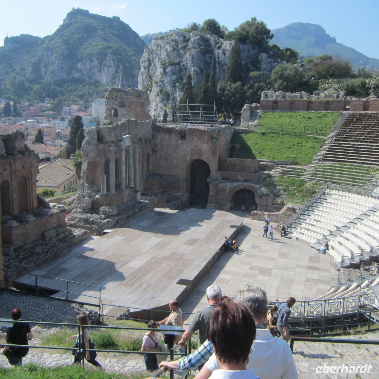 Nur von Weitem sehen wir das Opernhaus (Teatro Bellini), in dem 1890 die bekannteste Oper von Vincenzo Bellini, "NORMA" uraufgeführt wurde. Gegen Mittag verlassen wir die Stadt und steuern den Bauernhof - Limoneto- an und hier werden wir mit den unterschiedlichen sizilianischen Speisen verwöhnt. Danach fahren wir nach Taormina, es soll die schönste Stadt der Insel sein. Hoch über uns und nicht weit entfernt von unserem Hotel liegt sie. Wir fahren mit einem Shuttlebus in die Stadt und besuchen als Erstes das griechische Theater. Es beinhaltet aber auch alle Merkmale eines spezifisch römischen Theaters. Begründet ist es darin, dass das Theater im 3.Jh.v,Christus unter Hieron II. von Syrakus angelegt wurde. In der römischen Zeit wurde es rundum erneuert und deshalb sehen wir auch ein römisches Theater. Christiane wird nicht müde uns dieses Wissen zu vermitteln und alle hören gespannt zu. Weiter geht unser Rundgang durch die Stadt und wir sehen noch die Villa Comunale und den Stadtpark.