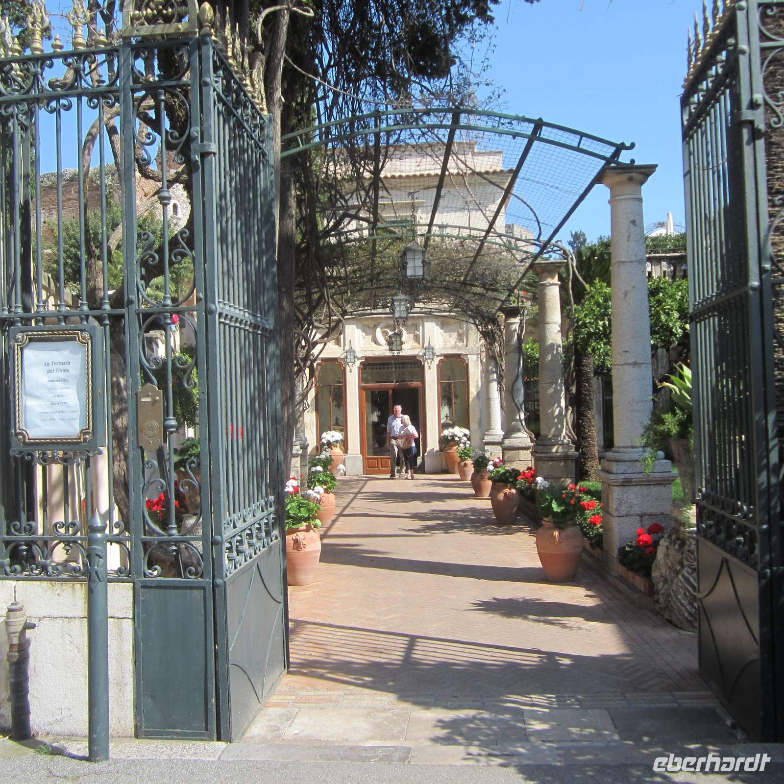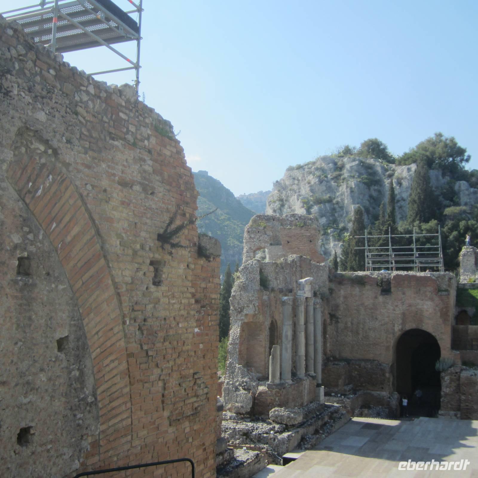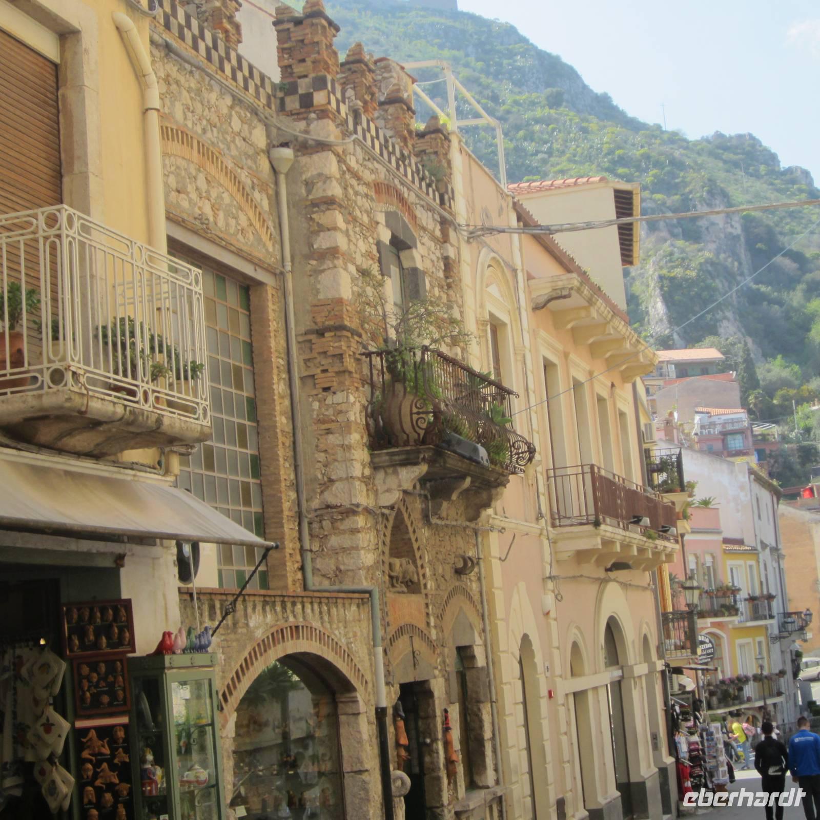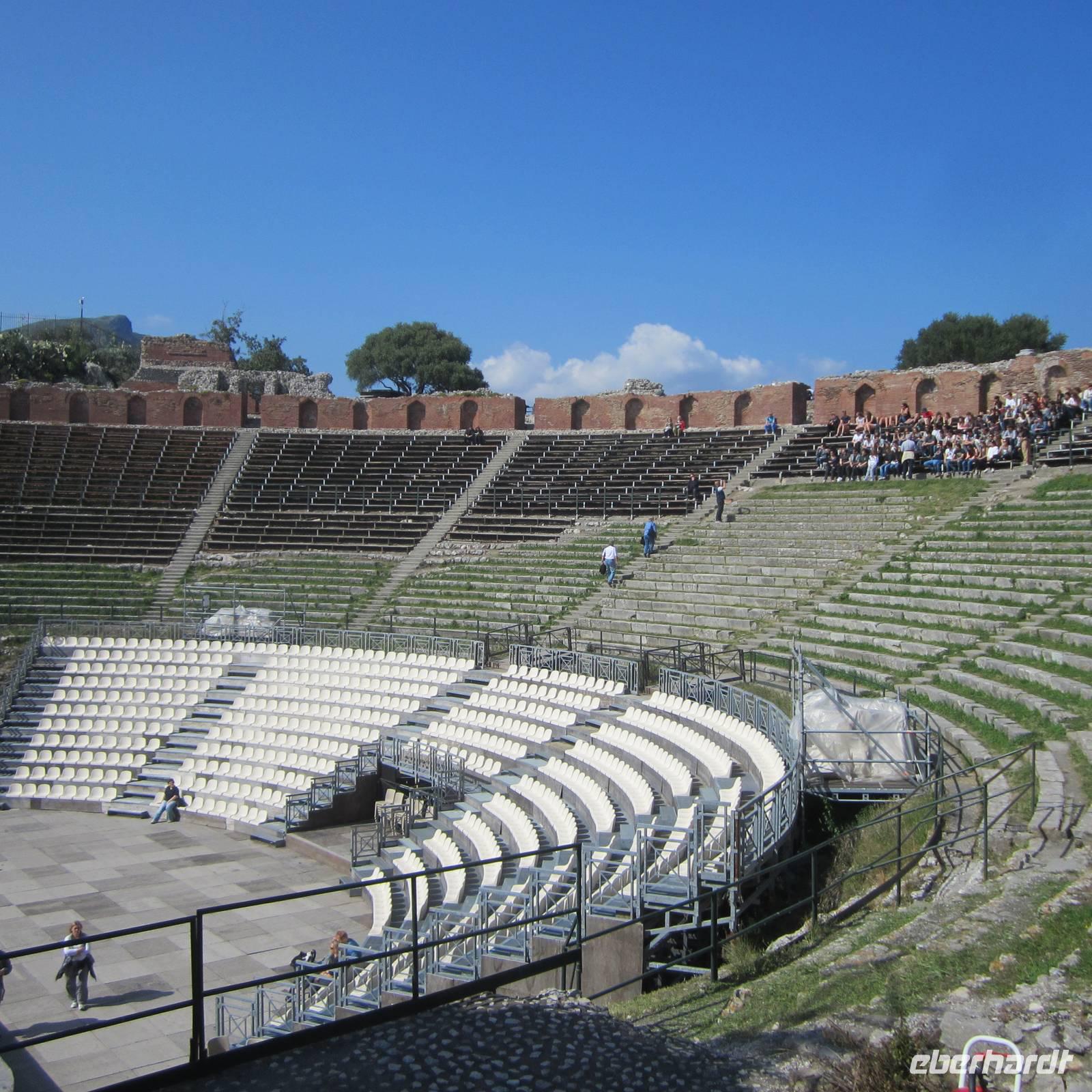 Nur von Weitem sehen wir das Opernhaus (Teatro Bellini), in dem 1890 die bekannteste Oper von Vincenzo Bellini, "NORMA" uraufgeführt wurde. Gegen Mittag verlassen wir die Stadt und steuern den Bauernhof - Limoneto- an und hier werden wir mit den unterschiedlichen sizilianischen Speisen verwöhnt. Danach fahren wir nach Taormina, es soll die schönste Stadt der Insel sein. Hoch über uns und nicht weit entfernt von unserem Hotel liegt sie. Wir fahren mit einem Shuttlebus in die Stadt und besuchen als Erstes das griechische Theater. Es beinhaltet aber auch alle Merkmale eines spezifisch römischen Theaters. Begründet ist es darin, dass das Theater im 3.Jh.v,Christus unter Hieron II. von Syrakus angelegt wurde. In der römischen Zeit wurde es rundum erneuert und deshalb sehen wir auch ein römisches Theater. Christiane wird nicht müde uns dieses Wissen zu vermitteln und alle hören gespannt zu. Weiter geht unser Rundgang durch die Stadt und wir sehen noch die Villa Comunale und den Stadtpark.