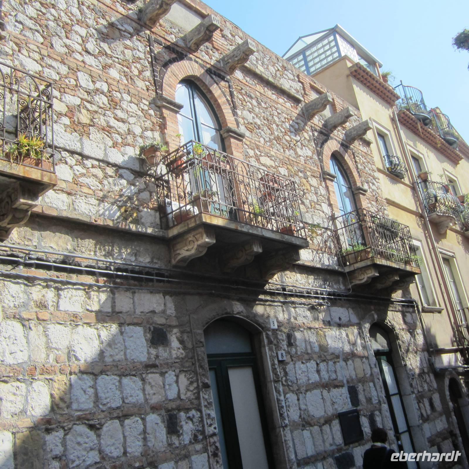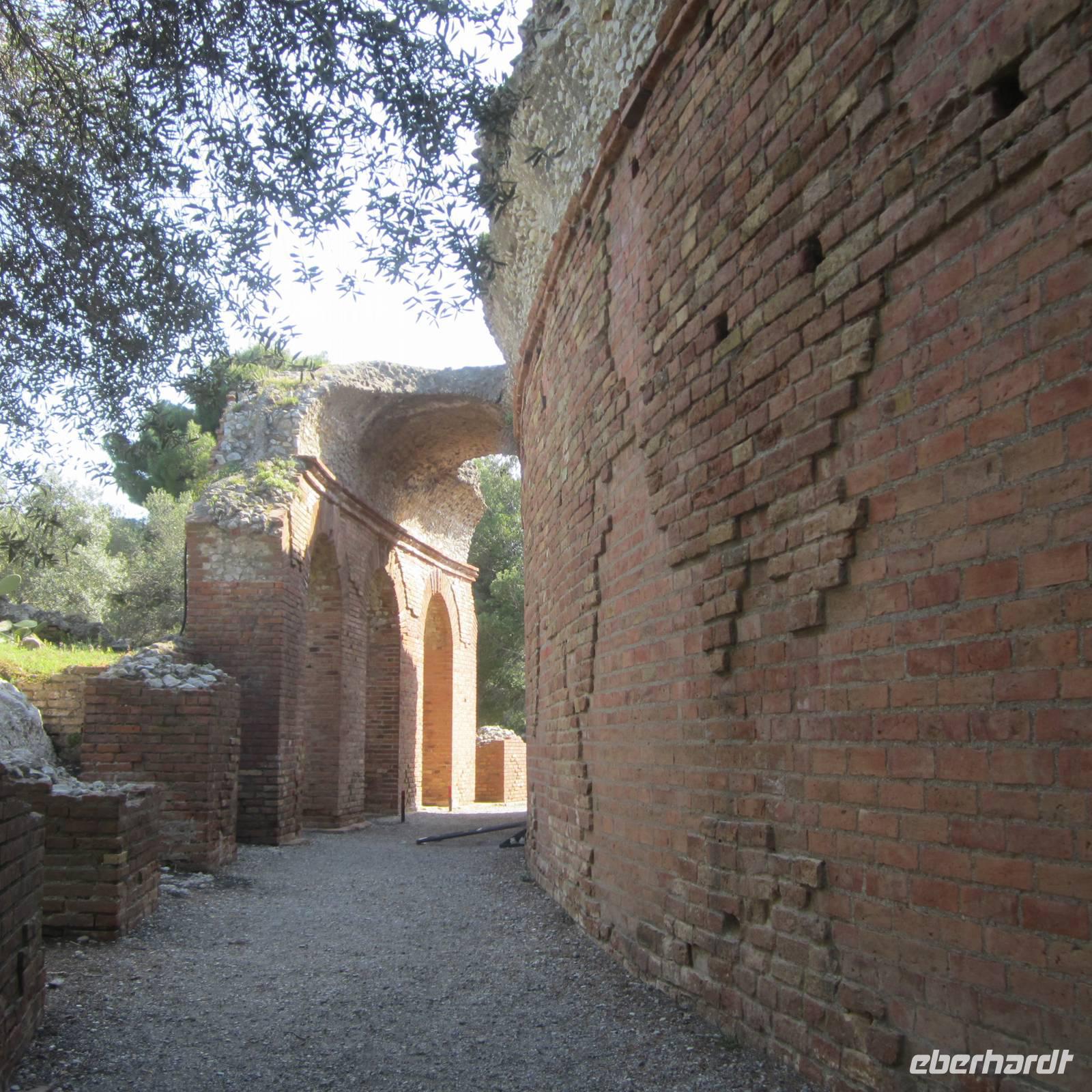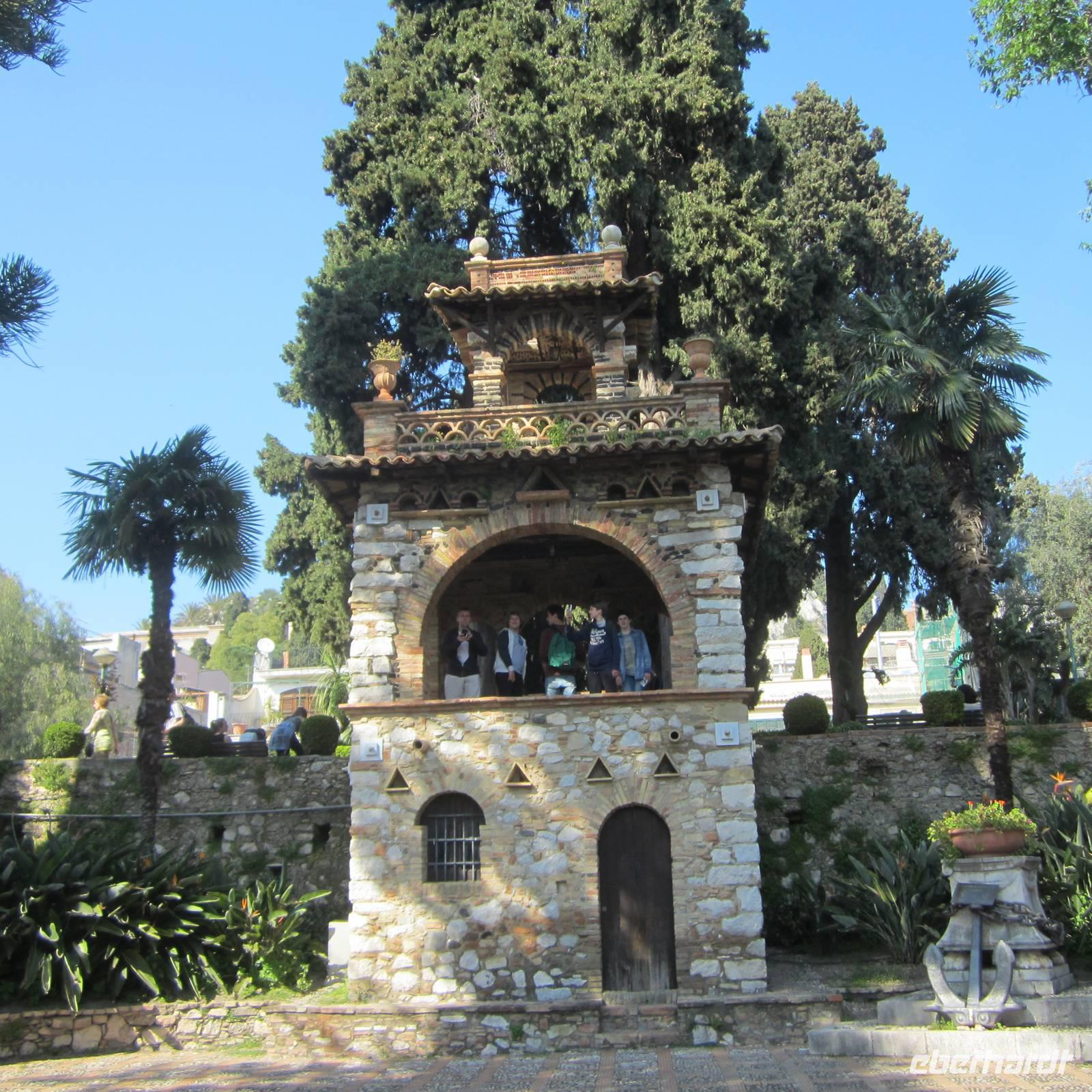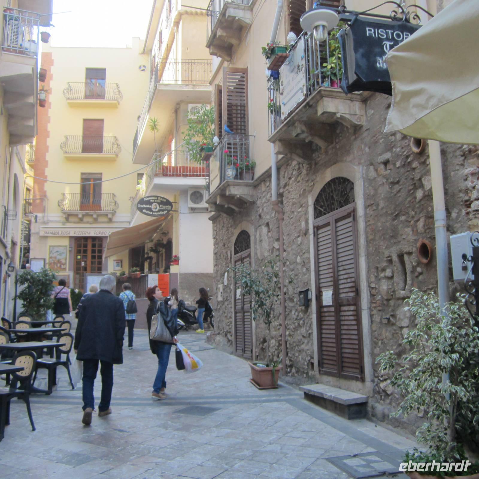 Nur von Weitem sehen wir das Opernhaus (Teatro Bellini), in dem 1890 die bekannteste Oper von Vincenzo Bellini, "NORMA" uraufgeführt wurde. Gegen Mittag verlassen wir die Stadt und steuern den Bauernhof - Limoneto- an und hier werden wir mit den unterschiedlichen sizilianischen Speisen verwöhnt. Danach fahren wir nach Taormina, es soll die schönste Stadt der Insel sein. Hoch über uns und nicht weit entfernt von unserem Hotel liegt sie. Wir fahren mit einem Shuttlebus in die Stadt und besuchen als Erstes das griechische Theater. Es beinhaltet aber auch alle Merkmale eines spezifisch römischen Theaters. Begründet ist es darin, dass das Theater im 3.Jh.v,Christus unter Hieron II. von Syrakus angelegt wurde. In der römischen Zeit wurde es rundum erneuert und deshalb sehen wir auch ein römisches Theater. Christiane wird nicht müde uns dieses Wissen zu vermitteln und alle hören gespannt zu. Weiter geht unser Rundgang durch die Stadt und wir sehen noch die Villa Comunale und den Stadtpark.