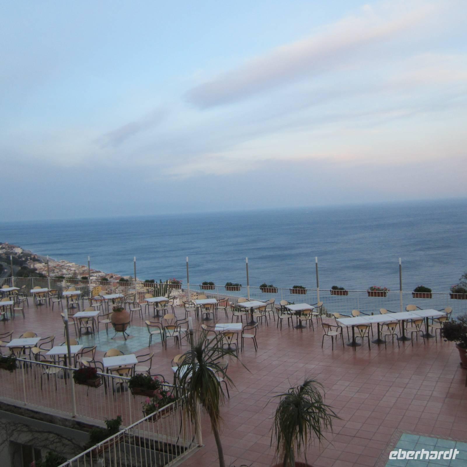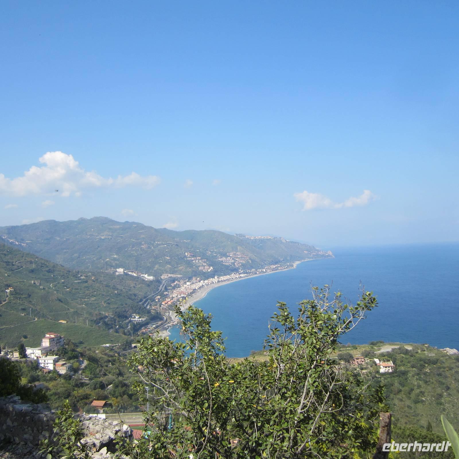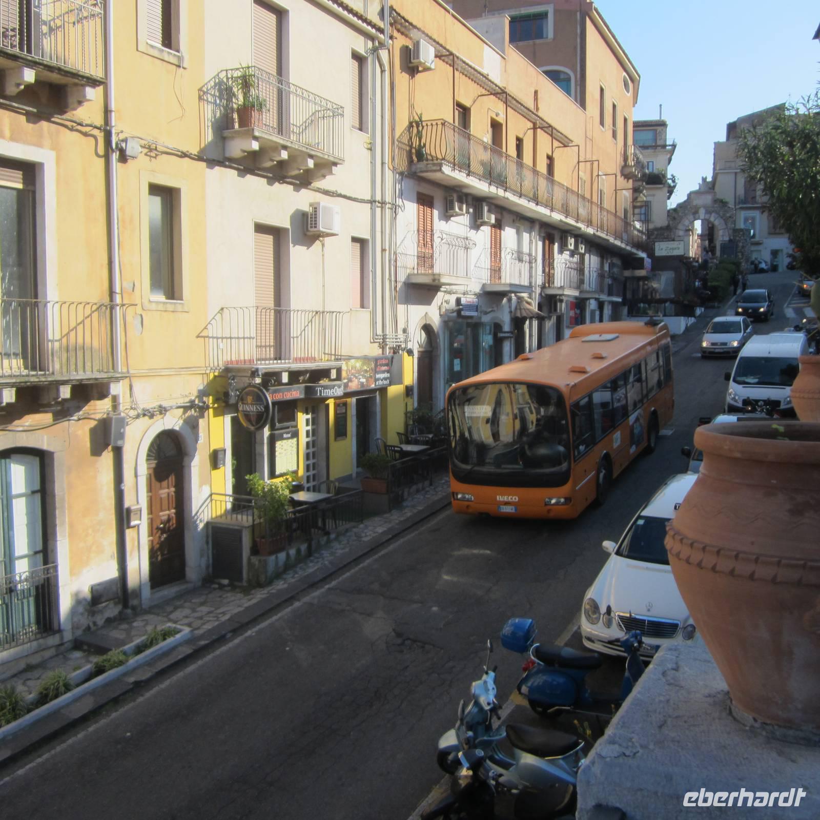 Vincenzo unserer sizilianischer Busfahrer, der uns in den nächsten Tagen über die Insel chauffieren wird. Von Catania-der schwarzen Stadt, am Fuße des Ätnas, erfahren wir in den nächsten Tagen mehr. Heute ist Letojanni unser Ziel, ein beliebter Badeort an der Ostküste der Insel. Zuvor planen wir einen Aufenthalt in Giardini-Naxos.(Naxos war die erste griechische Stadt in Sizilien).Hier treffen wir unsere örtliche Reiseleiterin, die in den nächsten Tagen mit uns unterwegs ist. Im Hafen haben wir die erste Möglichkeit die sizilianische Küche zu probieren und die ist gut. Nach dem Aufenthalt fahren wir zu unserem Hotel "Olimpo-Lerrazze". Wir können von uns schon behaupten, wir sind im Olymp angekommen. Es geht hoch hinauf. Vincenzo zeigt uns schon bei dieser Fahrt, was er kann.