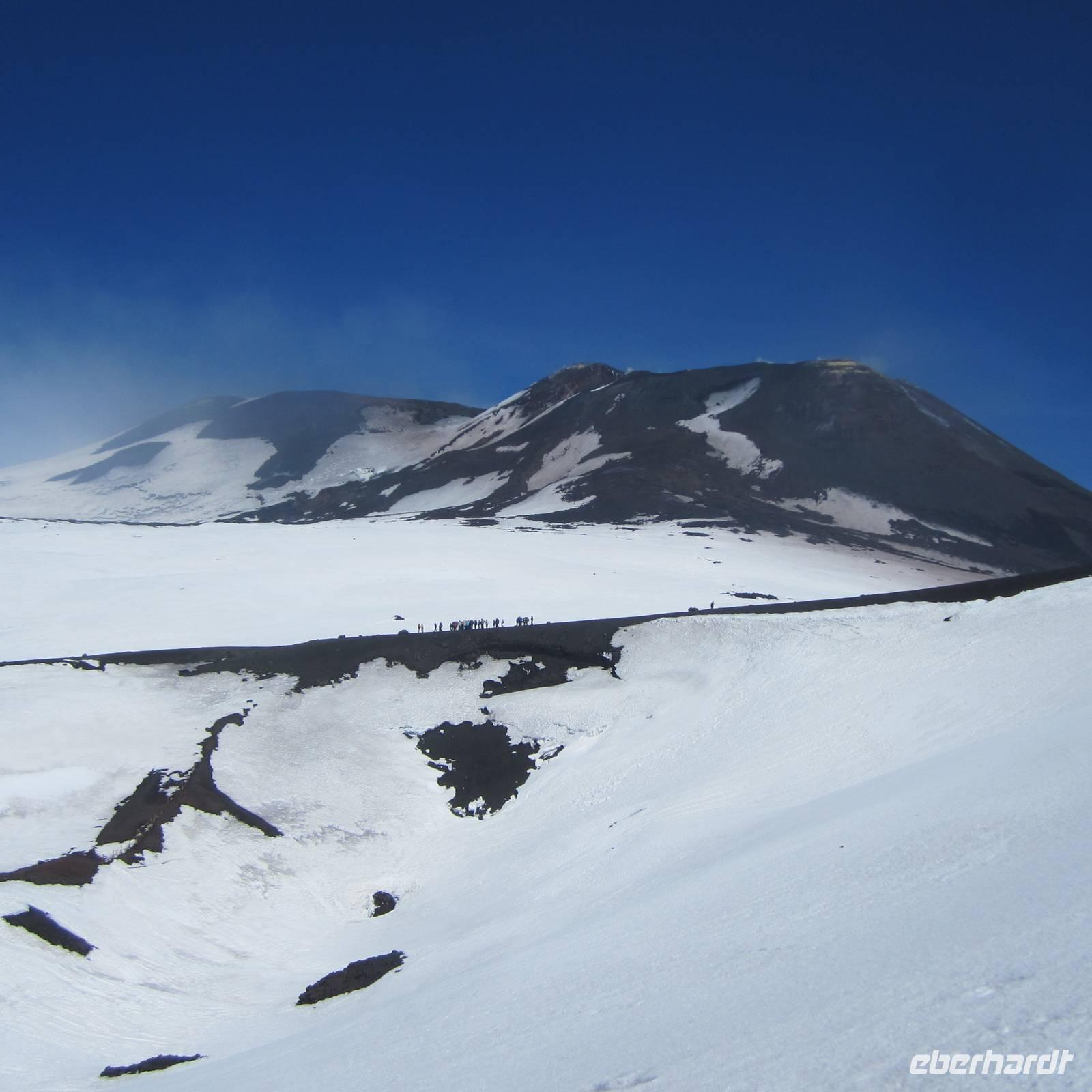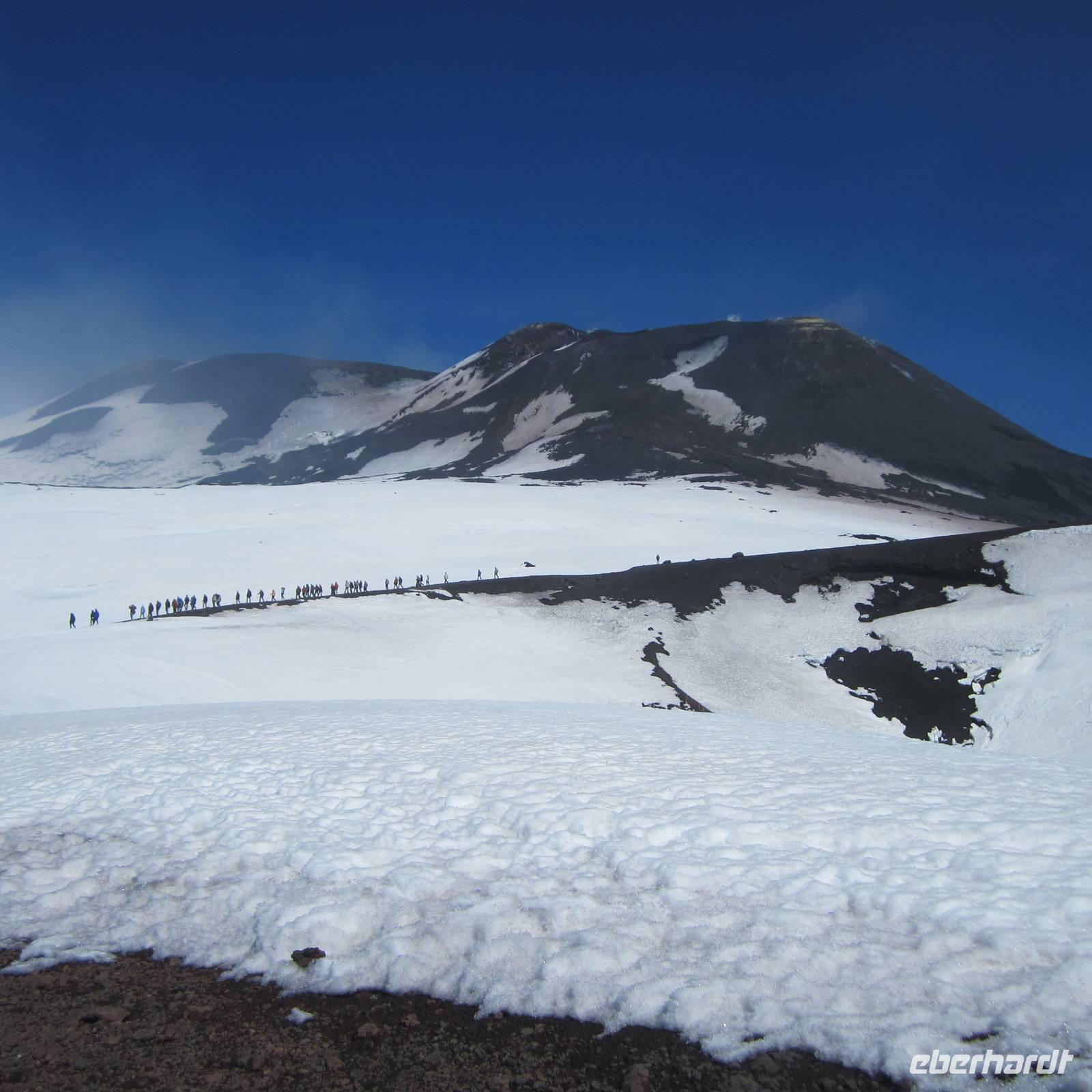 Der Blick verspricht Gutes. Zeitig geht es heute über Zafferana Etnea mit Blick auf die gewaltigen Lava-und Tuffsteinmassen, zum Ätna, der größte und höchste Vulkan Europas mit ca. 3345 m zeigt sich in seiner vollen Schönheit. Gegen 10.00 Uhr fährt ein Teil der Gruppe mit der Gondel eine Station und weiter geht es mit dem Jeep bis zu den ersten Kratern. Bei einer kleinen Wanderung ist es schon wichtig, Handschuhe und Kopfbedeckung dabei zu haben. Das Erlebnis bei dieser Sicht ist einmalig.
