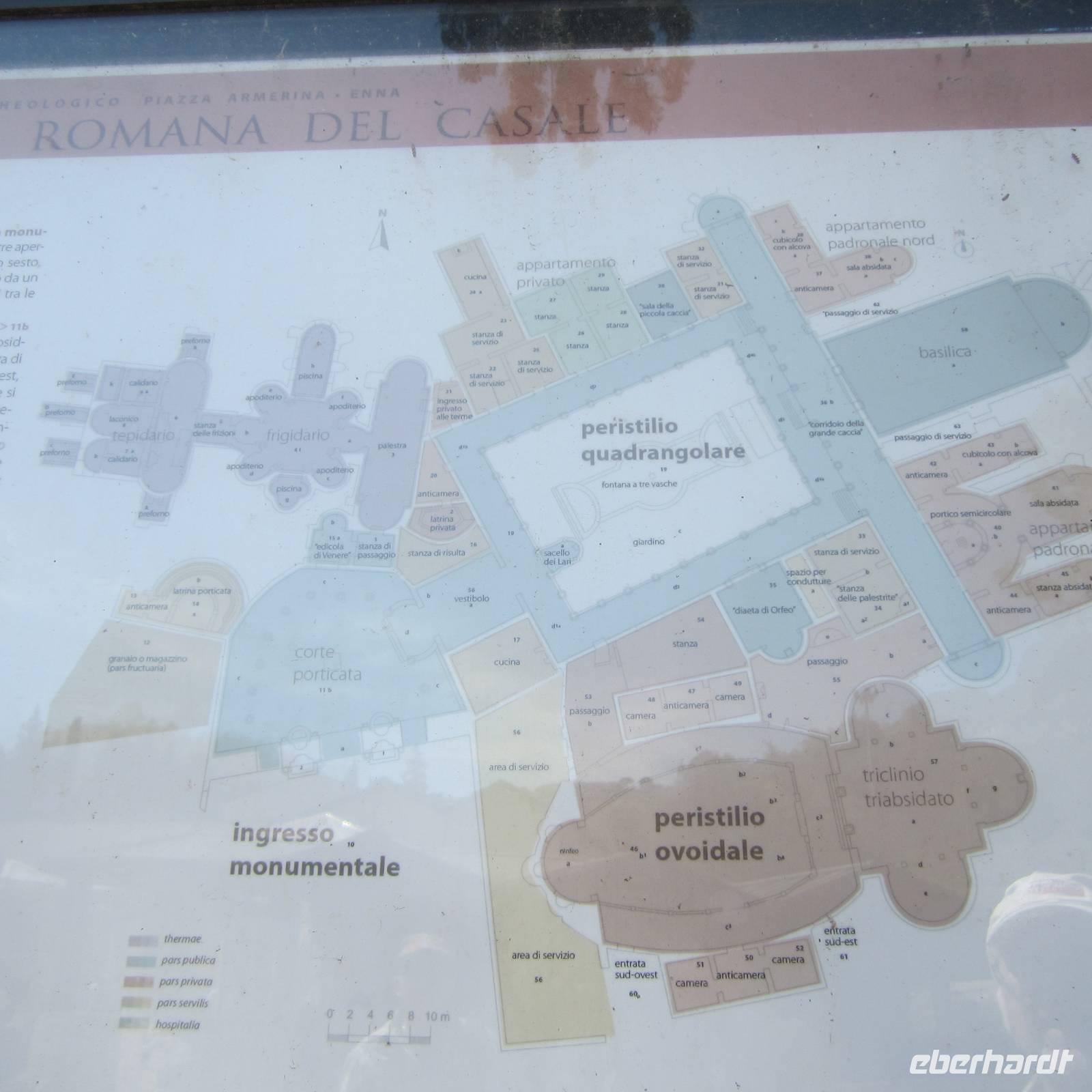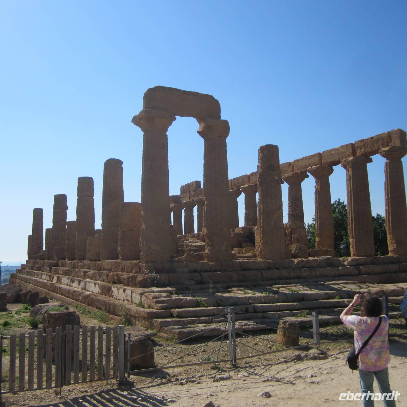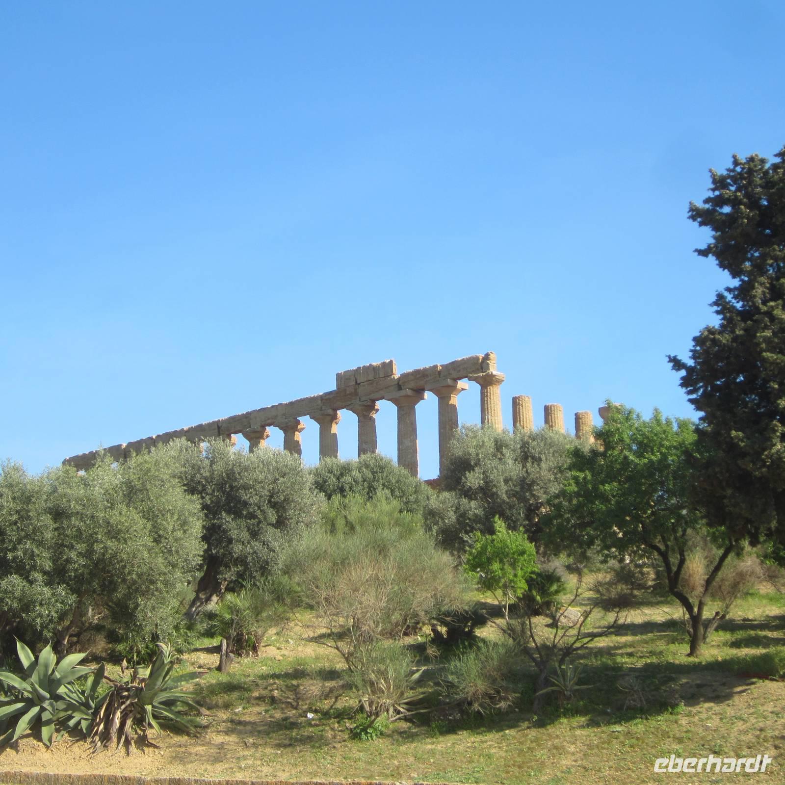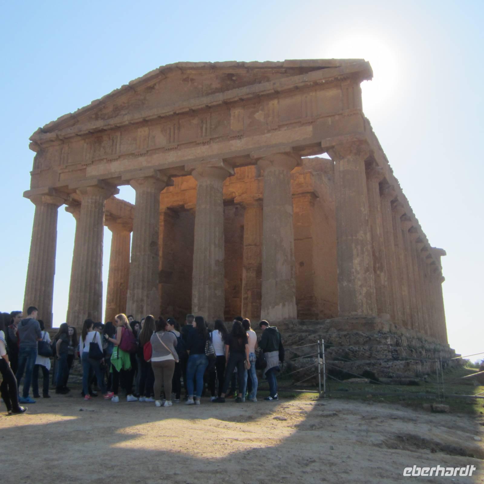 Heute müssen wir die Koffer in den Bus verstauen. Wir verlassen unser erstes Hotel und fahren in das Landesinnere. Unsere Fahrt führt uns vorbei an Catania entlang der A19 mit Blick auf Enna weiter an Valguamera vorbei nach Piazza Armerina zur Villa Romana del Casale. Für uns ist es ein Erlebnis, das wir die Villa, die erst seit 2012 vollständig zugänglich ist, besuchen dürfen. Wir sehen eine römische Villa (Weltkulturerbe der UNESCO), die im 12. Jh. durch einen Erdrutsch verschüttet wurde. Es war ein Luxusdomizil. Bisher ist das Herrenhaus mit seinen annähernd 50 Räumen freigelegt wurden. Hervorzuheben sind die Mosaikarbeiten. Für uns ist es beeindruckend, welche Leistung und Arbeiten vollbracht wurden. Bewunderung finden auch von uns, die weltweit bekannten Bikini-Mädchen. Nach diesem Besuch legen wir eine Mittagspause ein bevor wir das Tal der Tempel in Agrigento besuchen. Auf dem Höhenzug befinden sich die Tempel Herakles, Concordia und Hera Lakinia. Christiane erklärt uns den Bau der griechischen Tempel. Sie wissen doch noch, dass sich in der Cella das Kultbild der Gottheit befand und das der Opisthodom, der Raum hinter der Cella ist, wo sich der Tempelschatz befand und die Opfergaben aufbewahrt wurden und der Concordia Tempel einer der besten erhaltenen Tempel der griechischen Welt ist. Viele Grüße an Christiane. Nach zweistündiger Führung durch das Tal fahren wir in unser Hotel KAOS im Stadtteil Kaos . Beeindruckend die Hotelanlage. Leider verweilen wir hier nur eine Nacht. Morgen setzen wir unsere Rundreise fort.