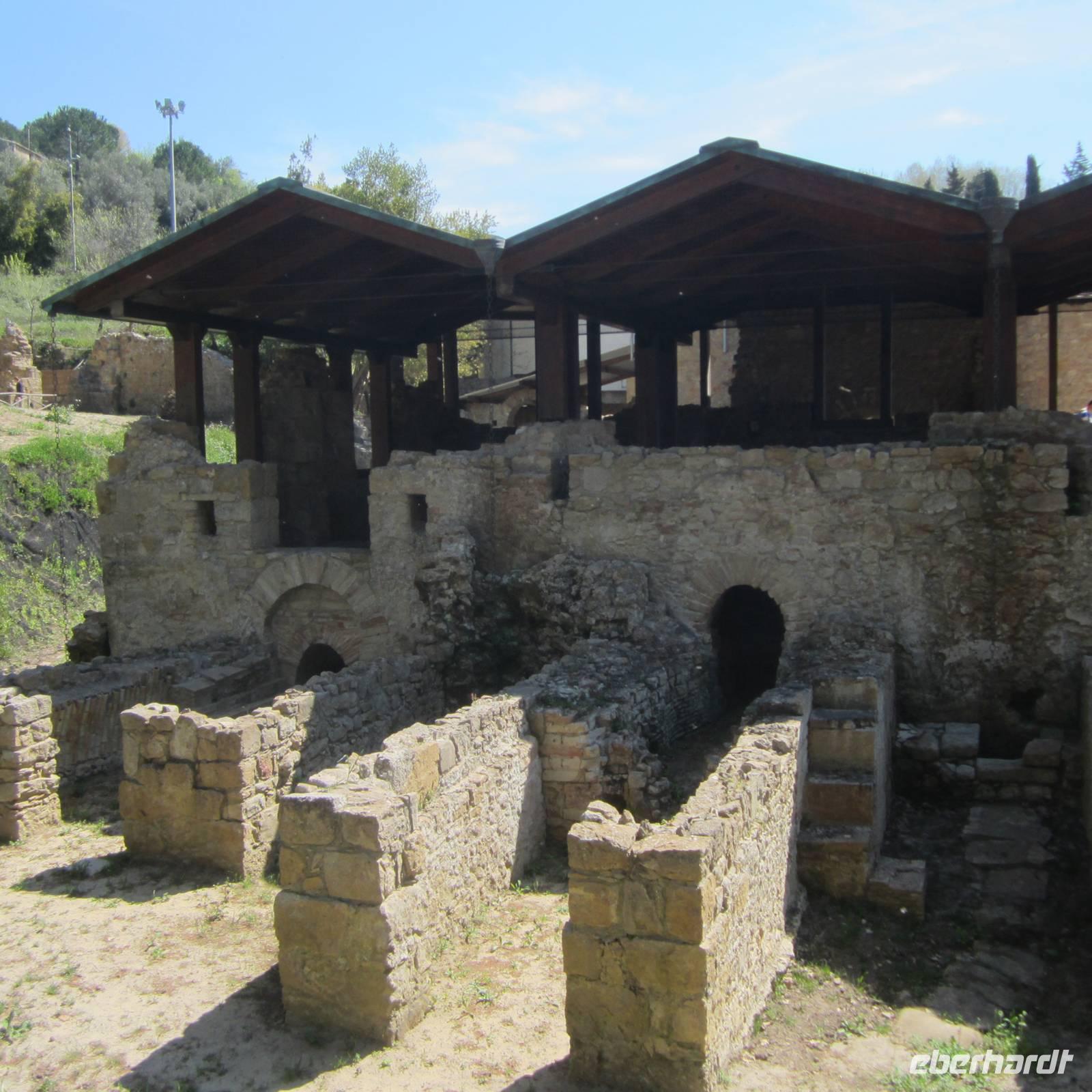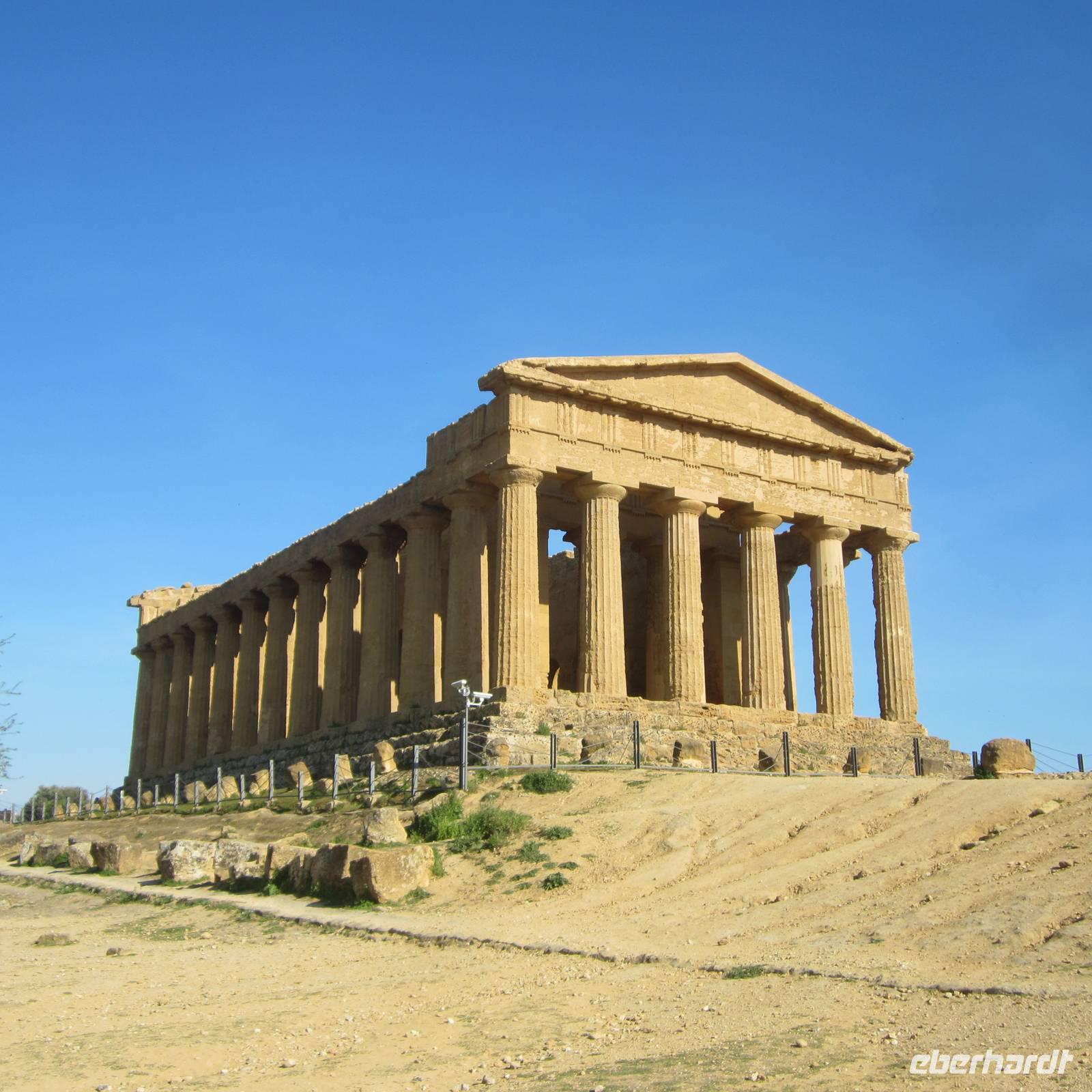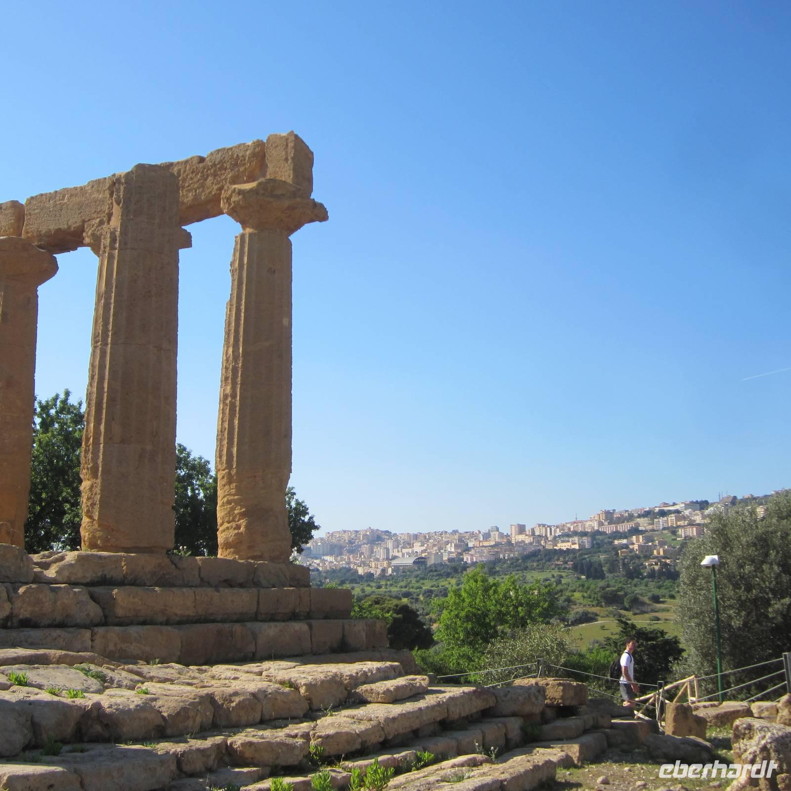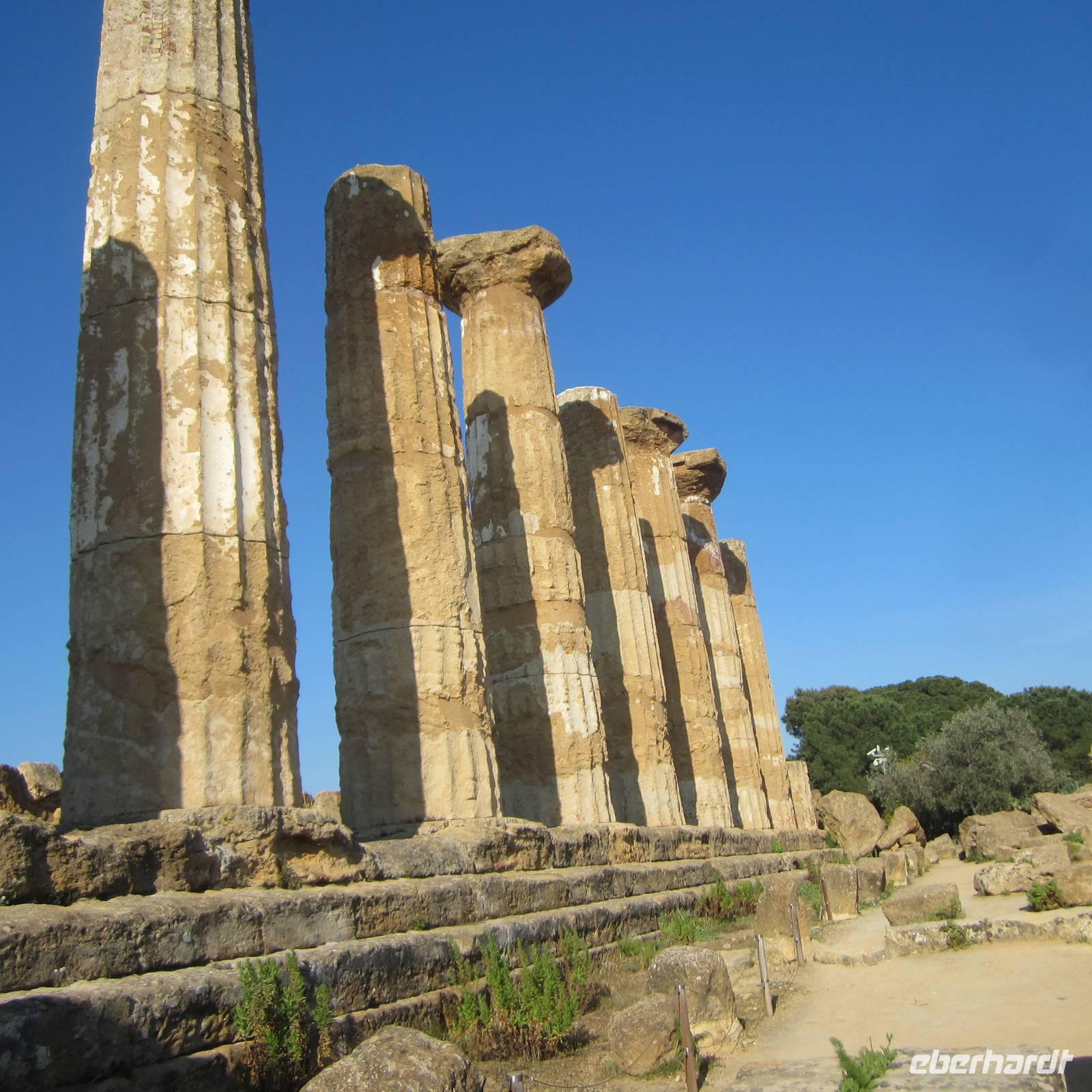 Heute müssen wir die Koffer in den Bus verstauen. Wir verlassen unser erstes Hotel und fahren in das Landesinnere. Unsere Fahrt führt uns vorbei an Catania entlang der A19 mit Blick auf Enna weiter an Valguamera vorbei nach Piazza Armerina zur Villa Romana del Casale. Für uns ist es ein Erlebnis, das wir die Villa, die erst seit 2012 vollständig zugänglich ist, besuchen dürfen. Wir sehen eine römische Villa (Weltkulturerbe der UNESCO), die im 12. Jh. durch einen Erdrutsch verschüttet wurde. Es war ein Luxusdomizil. Bisher ist das Herrenhaus mit seinen annähernd 50 Räumen freigelegt wurden. Hervorzuheben sind die Mosaikarbeiten. Für uns ist es beeindruckend, welche Leistung und Arbeiten vollbracht wurden. Bewunderung finden auch von uns, die weltweit bekannten Bikini-Mädchen. Nach diesem Besuch legen wir eine Mittagspause ein bevor wir das Tal der Tempel in Agrigento besuchen. Auf dem Höhenzug befinden sich die Tempel Herakles, Concordia und Hera Lakinia. Christiane erklärt uns den Bau der griechischen Tempel. Sie wissen doch noch, dass sich in der Cella das Kultbild der Gottheit befand und das der Opisthodom, der Raum hinter der Cella ist, wo sich der Tempelschatz befand und die Opfergaben aufbewahrt wurden und der Concordia Tempel einer der besten erhaltenen Tempel der griechischen Welt ist. Viele Grüße an Christiane. Nach zweistündiger Führung durch das Tal fahren wir in unser Hotel KAOS im Stadtteil Kaos . Beeindruckend die Hotelanlage. Leider verweilen wir hier nur eine Nacht. Morgen setzen wir unsere Rundreise fort.