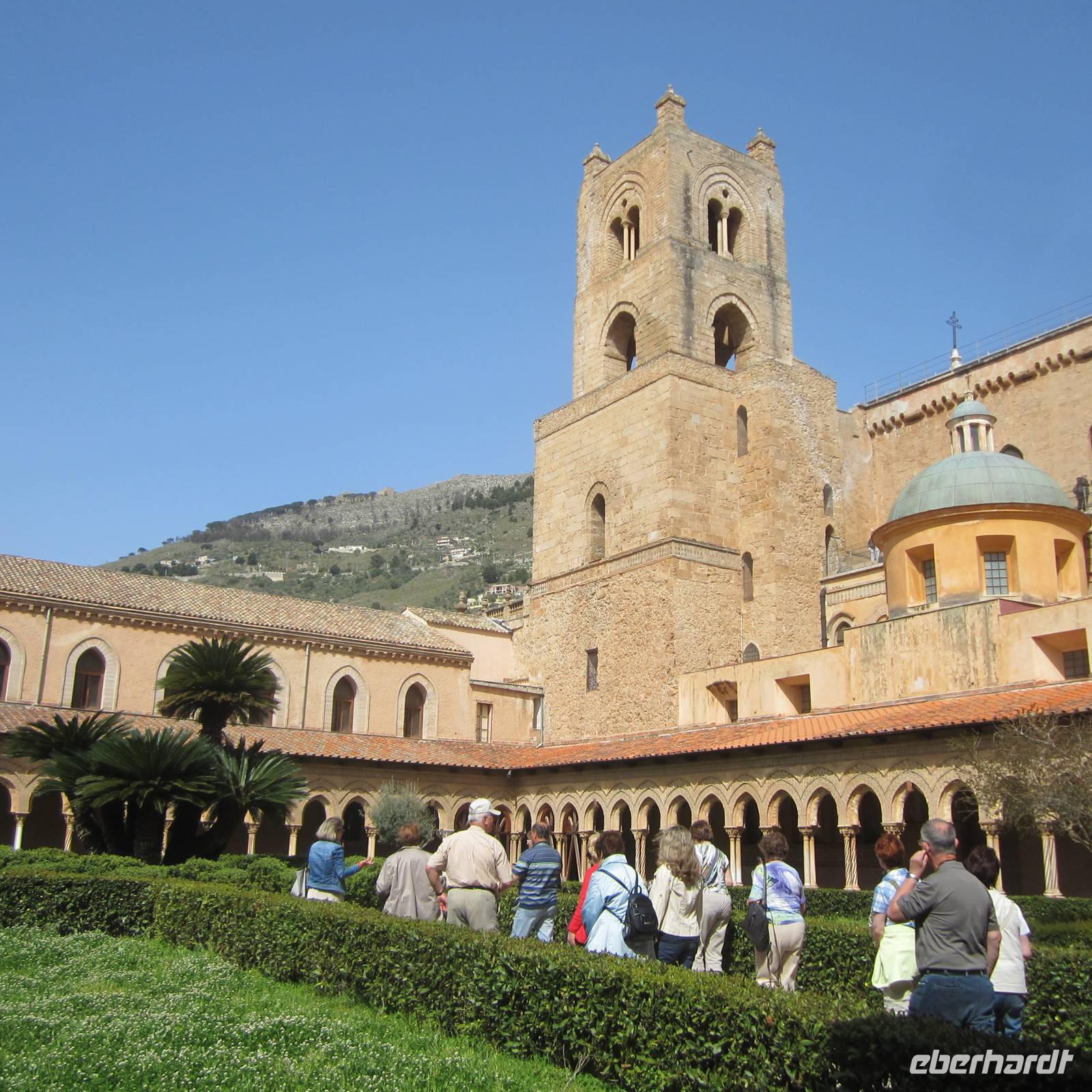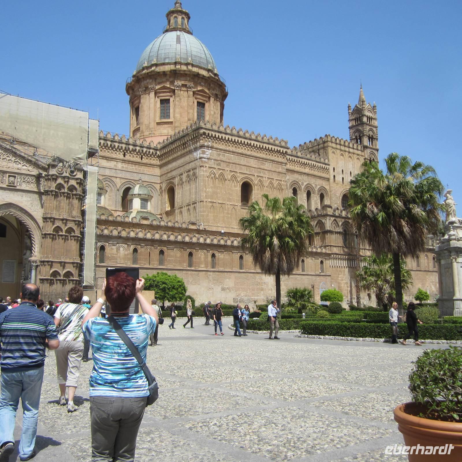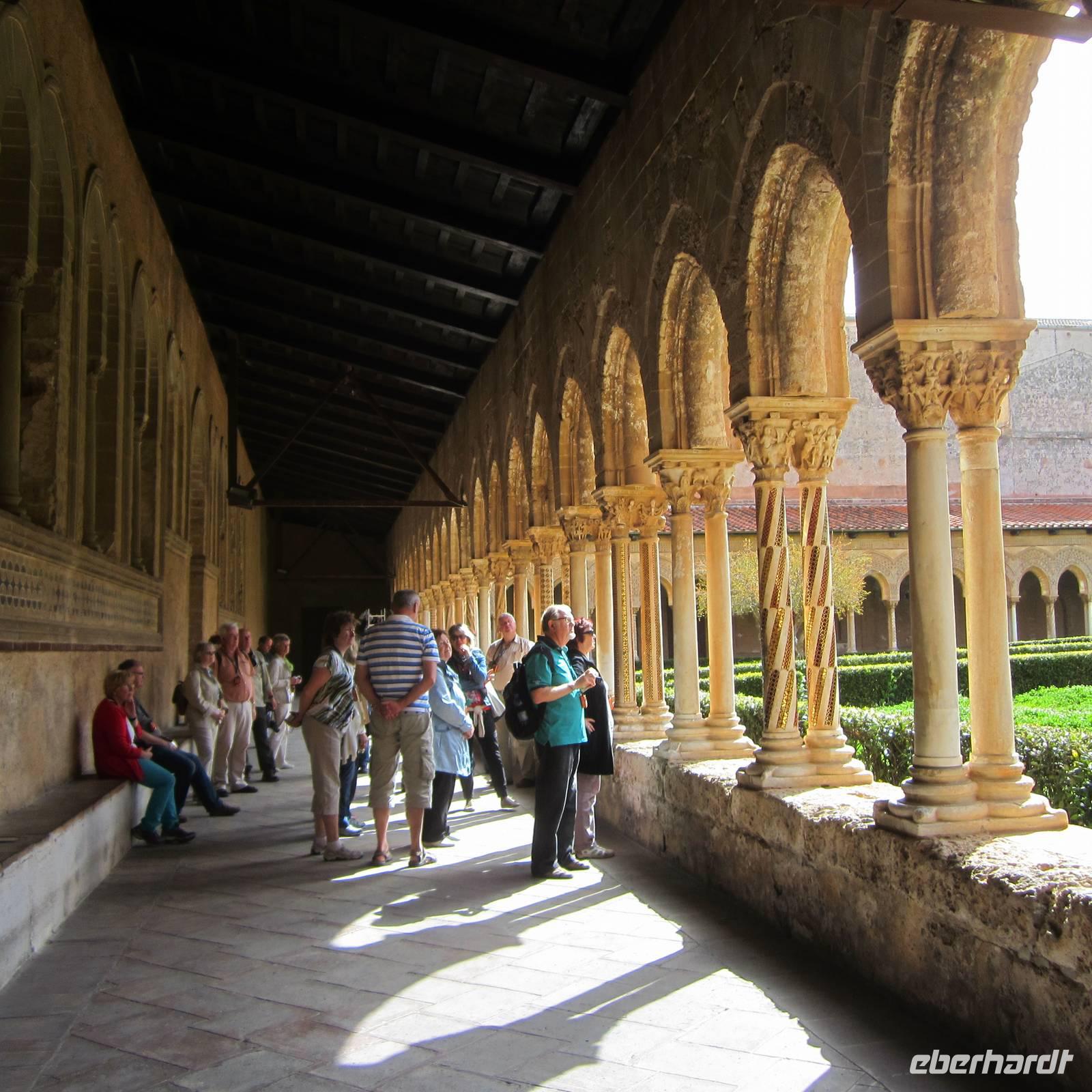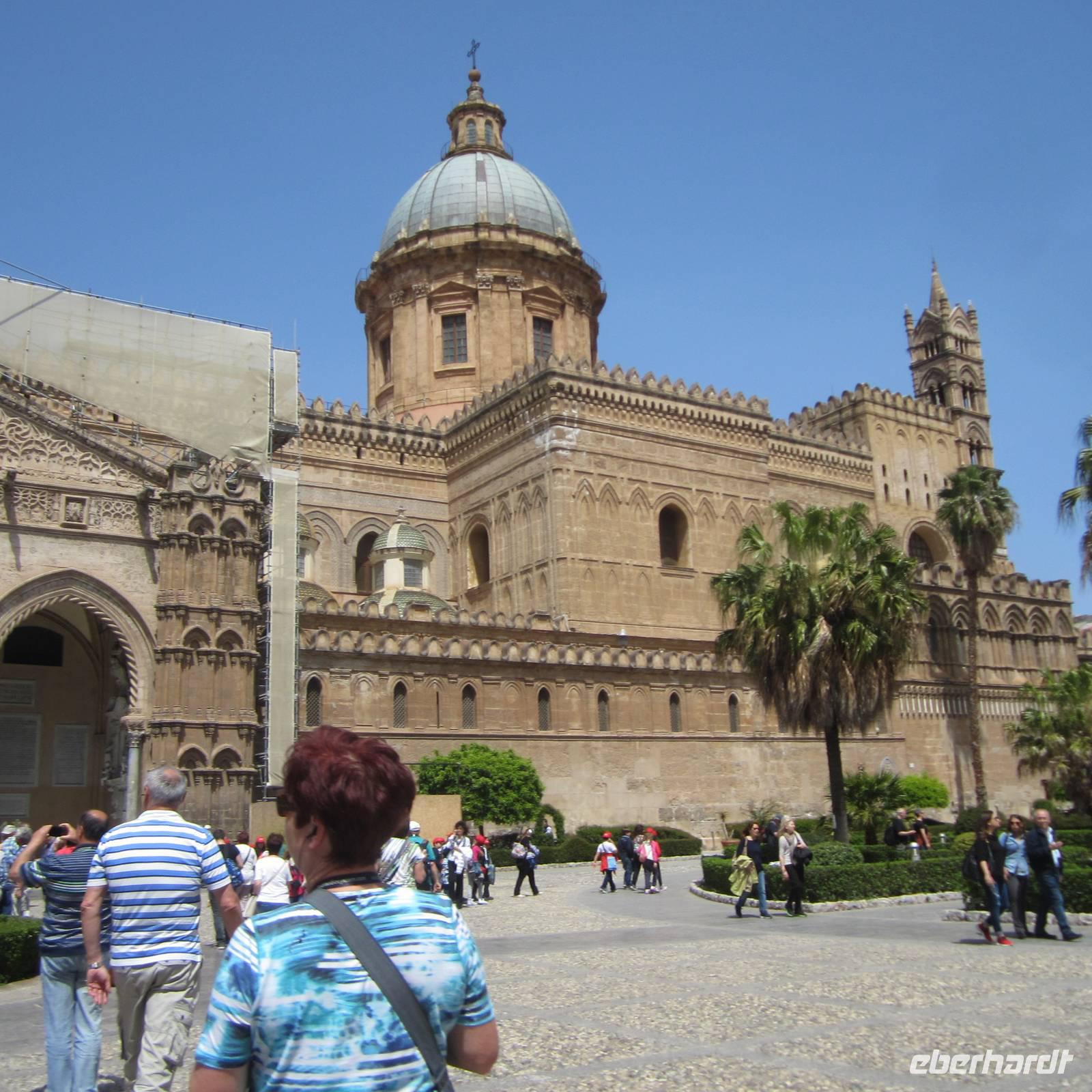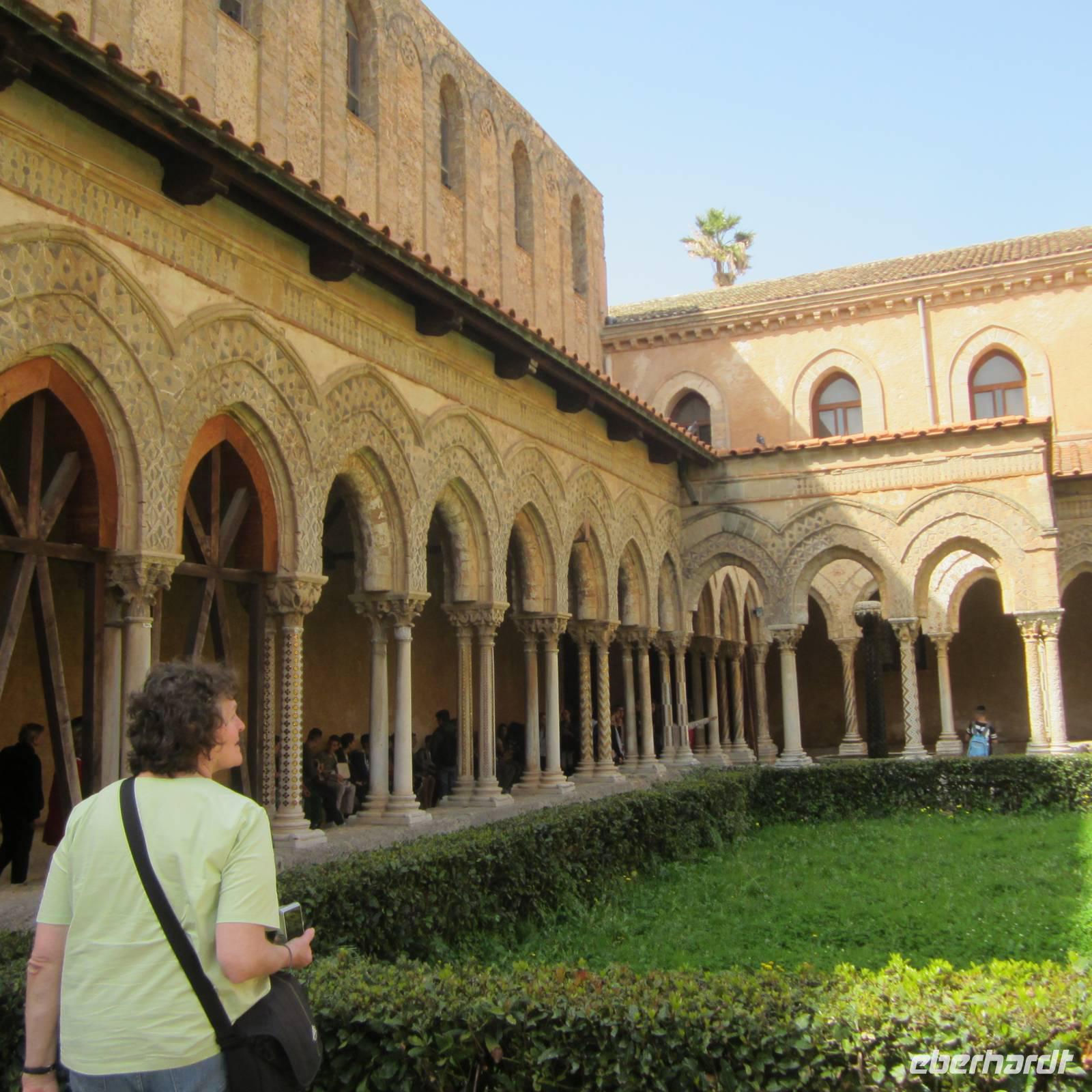 Das Hoch, das uns in den letzten Tagen das schöne Wetter bescherte, hält an und trotzdem möchte keiner den Tag am Meer verbringen, sondern die Hauptstadt der Insel erleben. Wir beginnen die Führung in Monreale und besuchen das bedeutendste Denkmal der Normannenkunst auf Sizilien. Nach den 90 Stufen, die wir gehen oder aber mit einem Taxi fahren, stehen wir vor dem prächtigen Dom. Im Inneren sind wir von den kostbaren Mosaiken überwältigt. Was Künstler hier im 12. Jd. geschaffen haben, ist einmalig. Im Anschluss gehen wir durch den berühmten