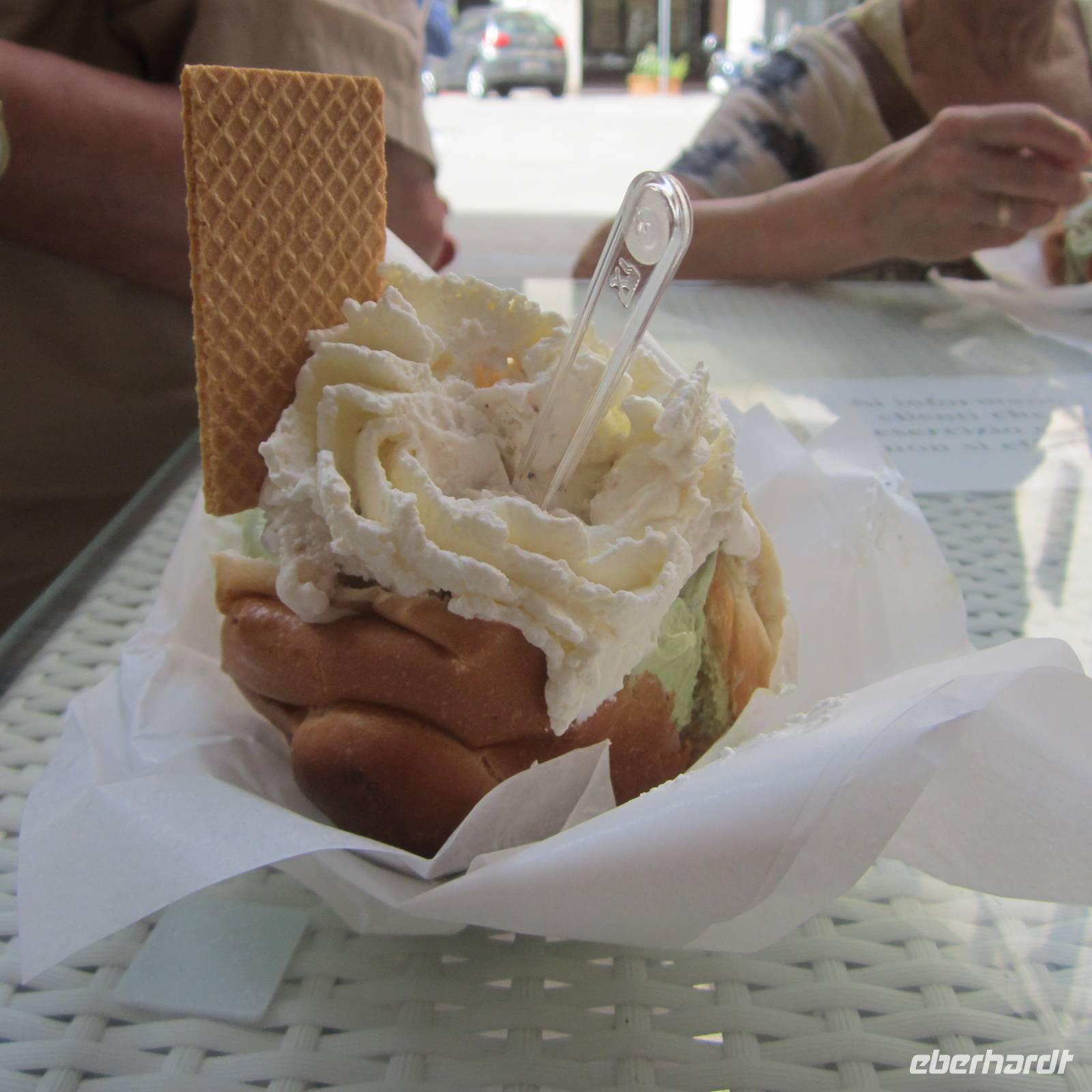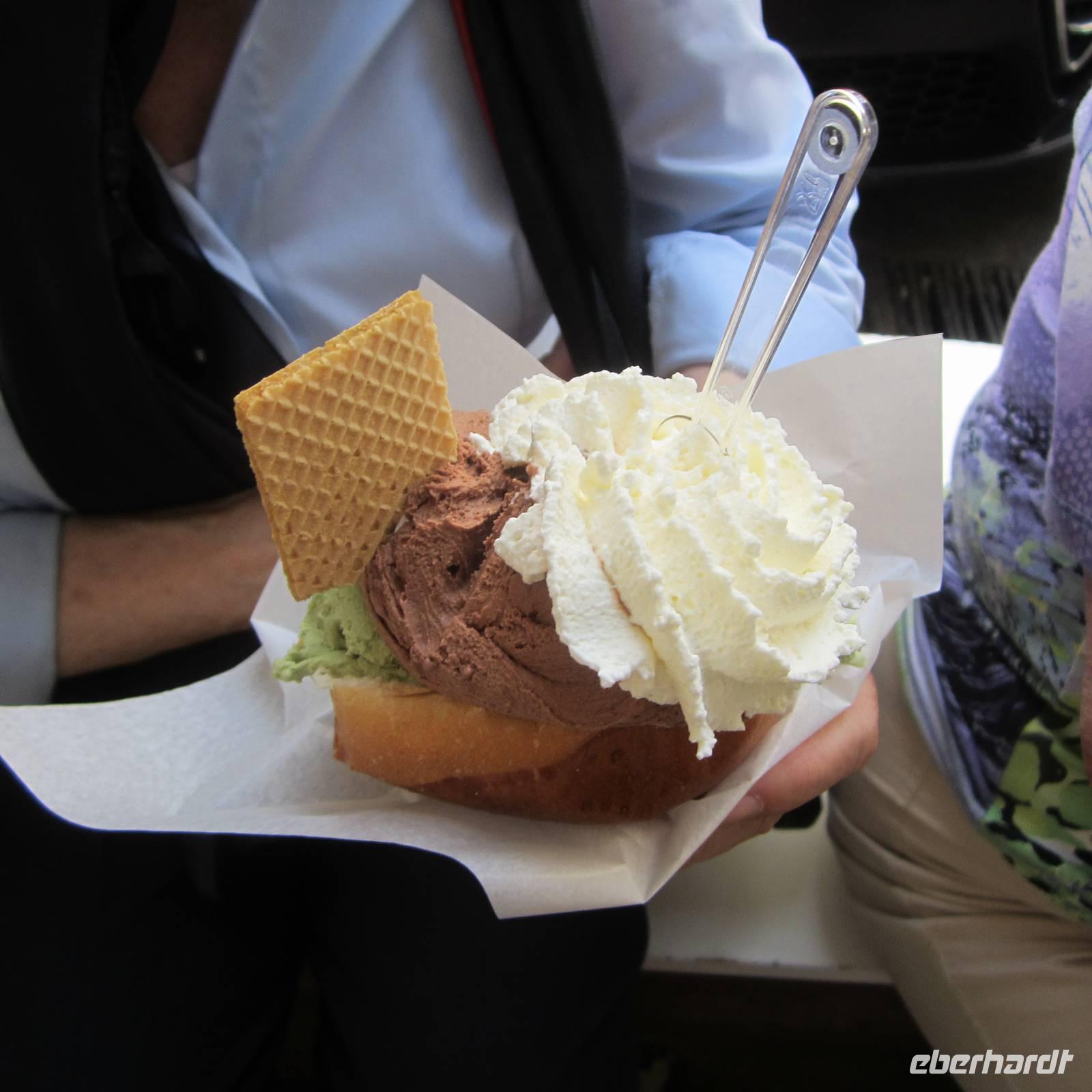 Sehr beeindruckt von Monreale fahren wir nach Palermo. Hier führt uns Christiane durch den Normannenpalast mit der Capella Palentina, in der wiederum die Mosaike eine besondere Wirkung auf uns hinterlassen. Ein Erlebnis ist auch der Besuch der Kathedrale mit den Gräbern der Staufer, insbesondere das Porphygrab des Stauferkaisers Friedrich der II. Nach so viel Geschichte und Kunst erleben wir jetzt das Treiben der chaotisch -vitalen Hauptstadt. Zwischenzeitlich haben wir 27°C und die Einladung in die Gelaterie Oriol kommt zum richtigen Zeitpunkt. Ein Brioches mit Eis ist eine tolle Erfahrung. Anschließend bleibt noch Zeit die Stadt individuell zu erkunden.