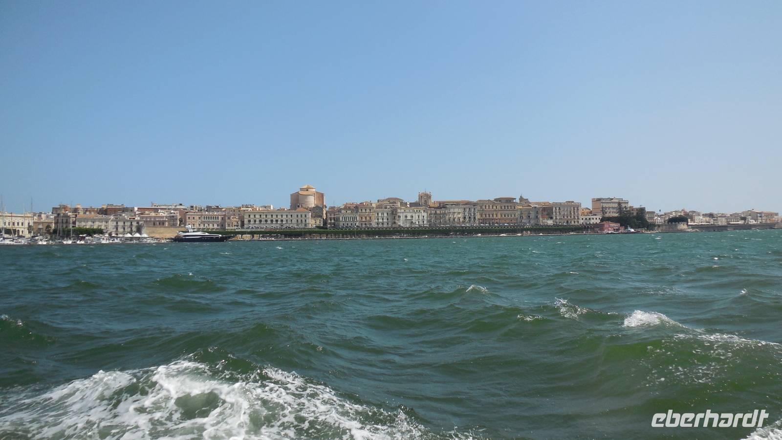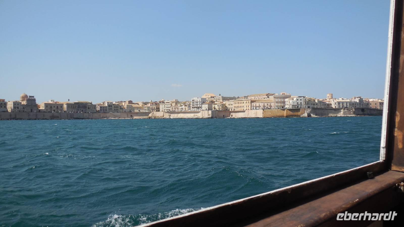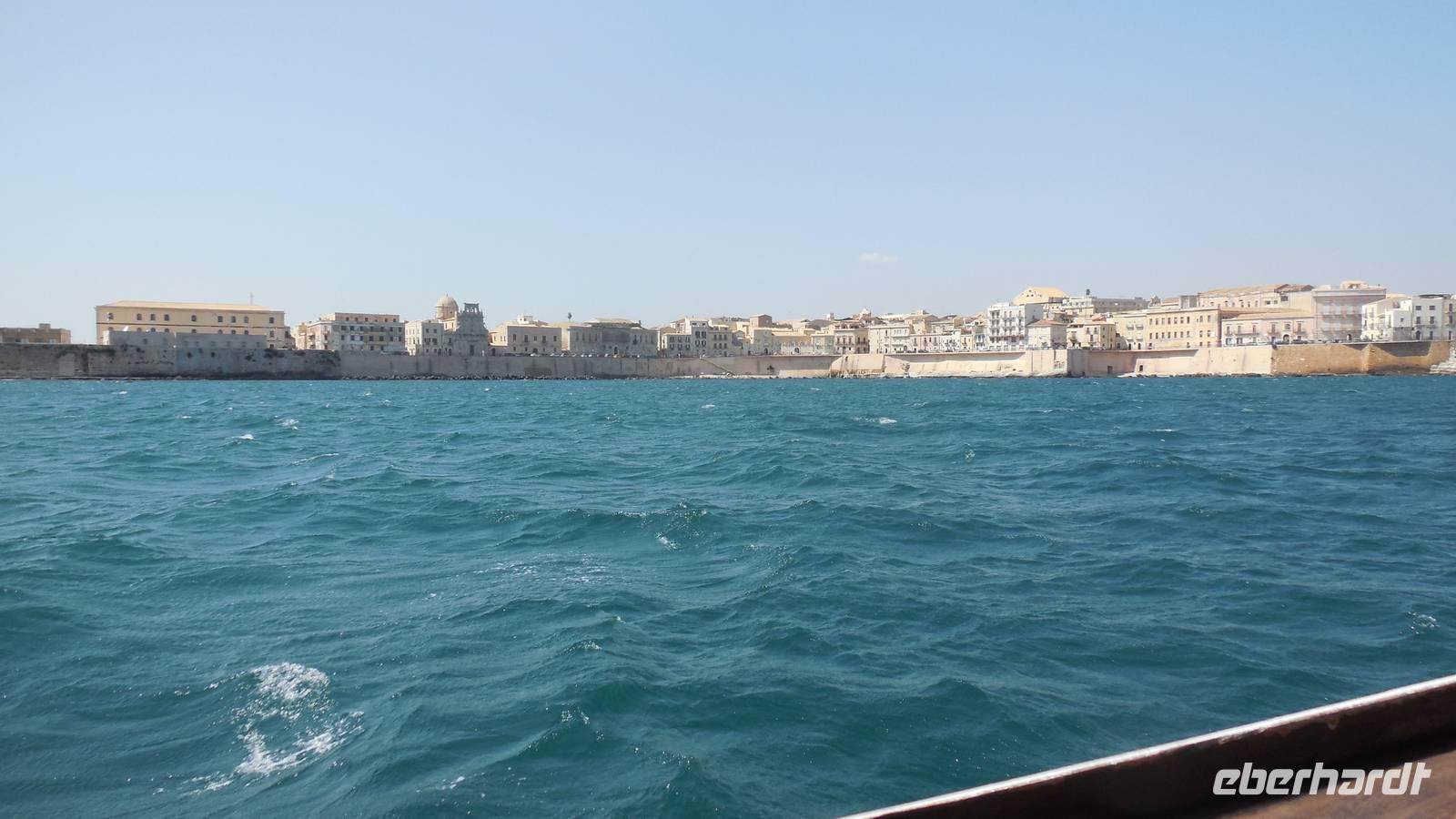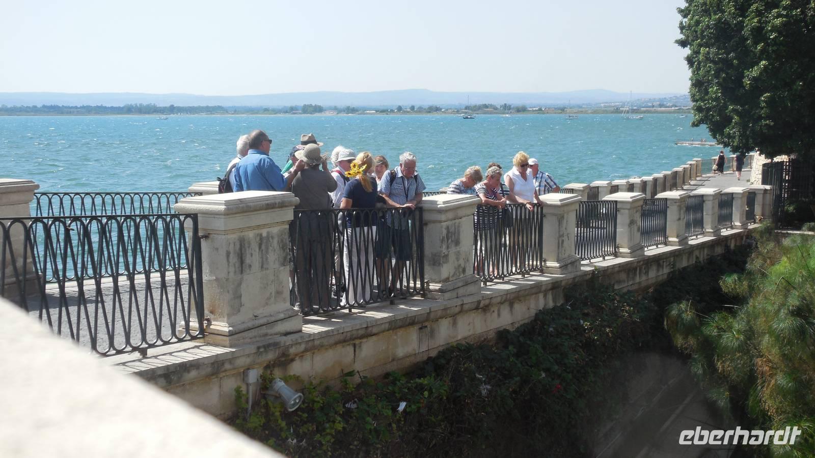 Als wir die archäologische Zone dann erkundet hatten fuhren wir in die Stadt Syrakus und unternahmen eine Schiffsrundfahrt durch die Bucht. Nachdem wir alle wieder gut im Hafen angekommen waren, durchstreiften wir die Stadt und Renate erklärte uns Interessantes über Land und Leute, währenddessen wir uns das Rathaus, die Kathedrale und die Überbleibsel des Apollo-Tempels anschauten.