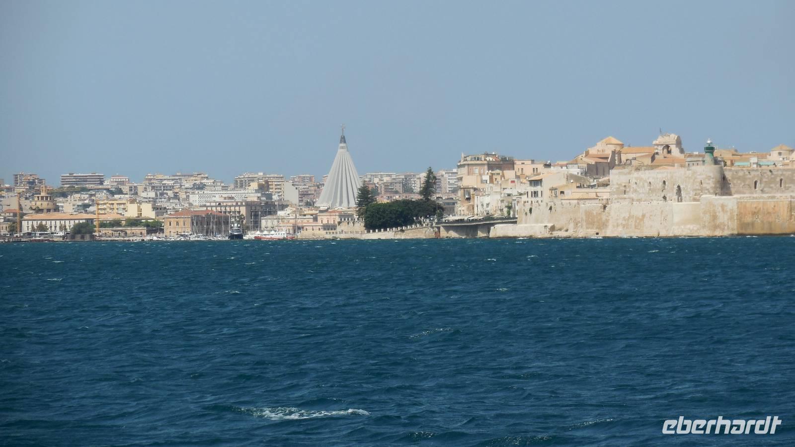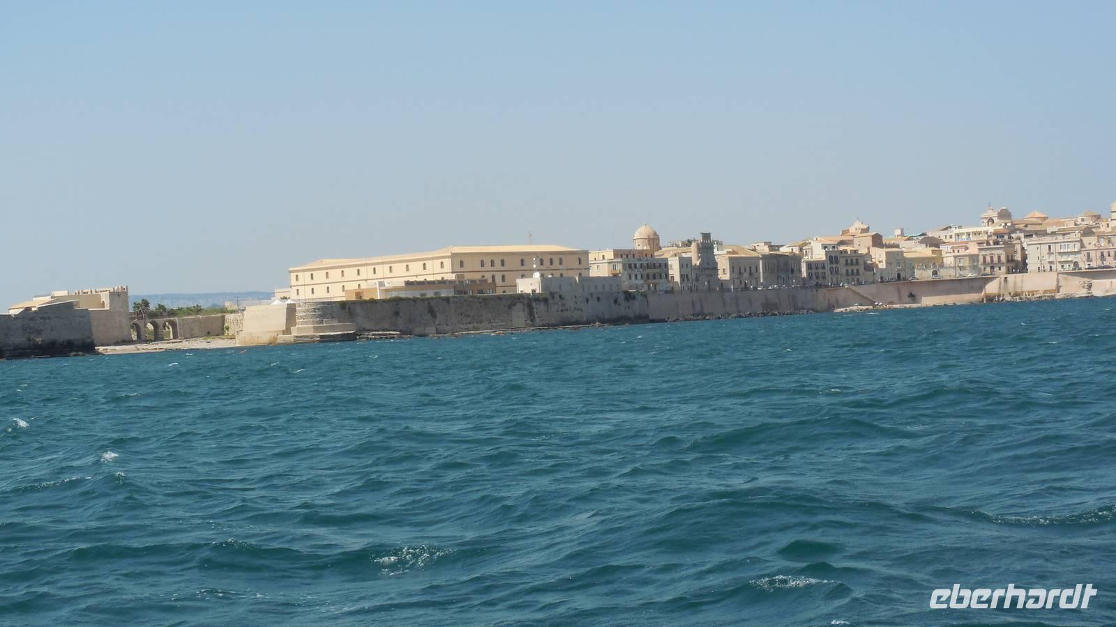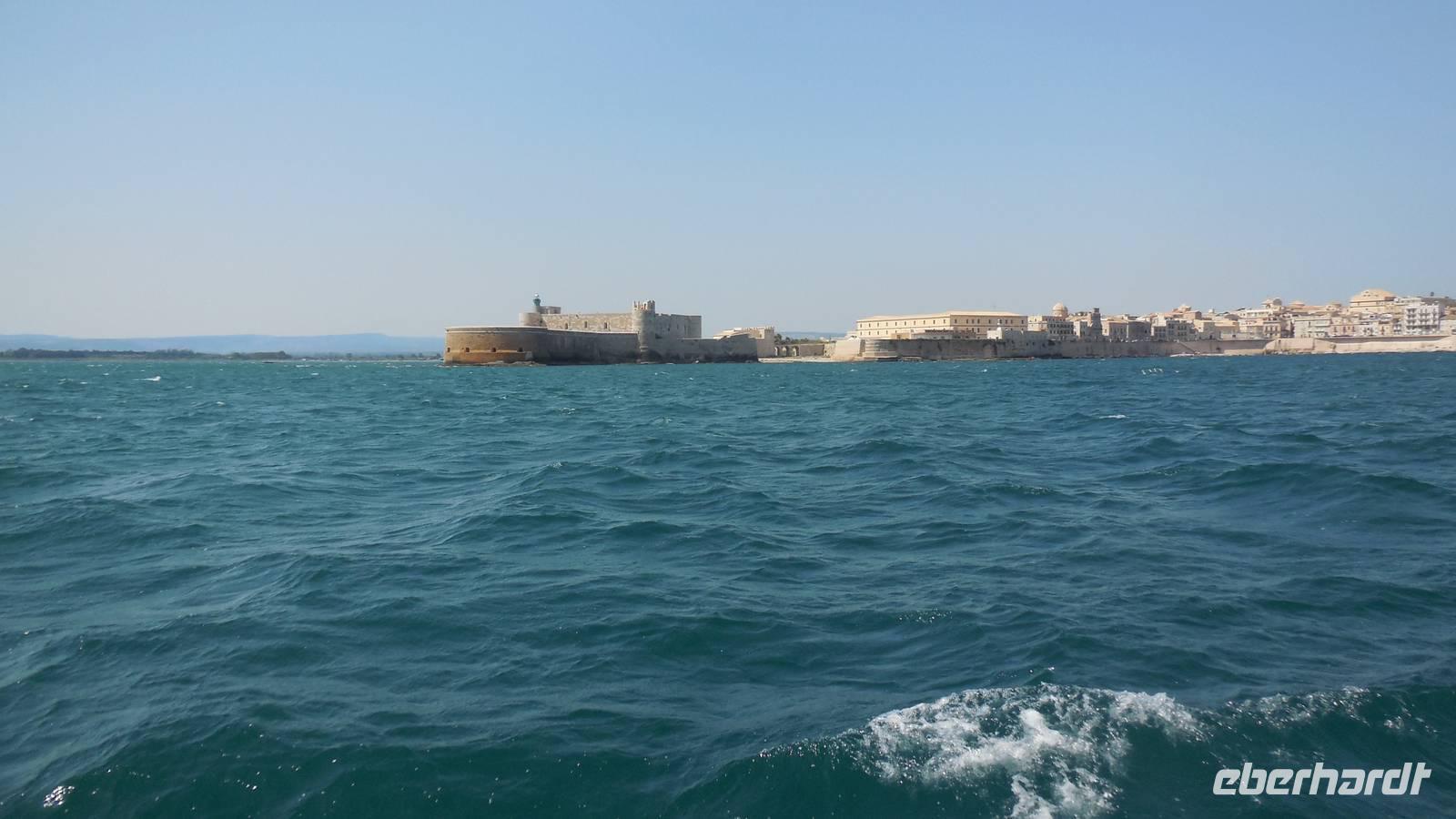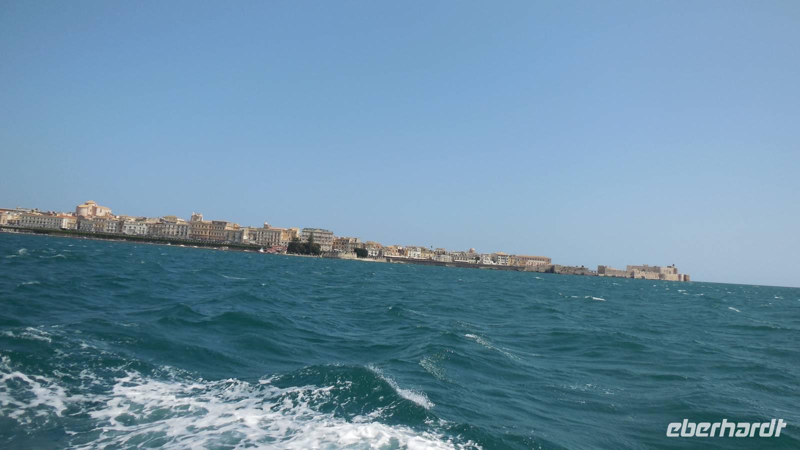 Als wir die archäologische Zone dann erkundet hatten fuhren wir in die Stadt Syrakus und unternahmen eine Schiffsrundfahrt durch die Bucht. Nachdem wir alle wieder gut im Hafen angekommen waren, durchstreiften wir die Stadt und Renate erklärte uns Interessantes über Land und Leute, währenddessen wir uns das Rathaus, die Kathedrale und die Überbleibsel des Apollo-Tempels anschauten.