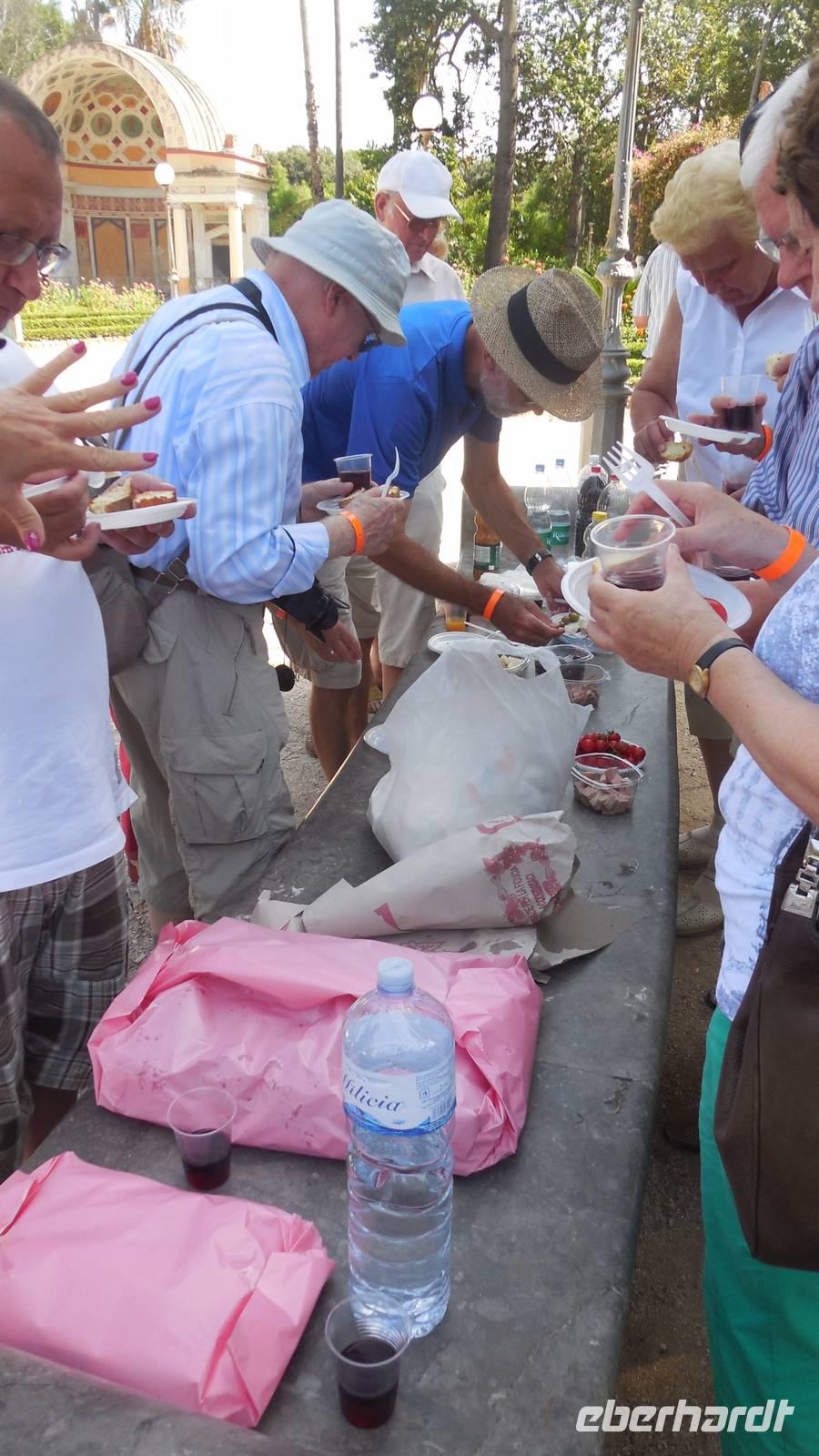 Das Mittagessen wurde heute als Picknick im Park von Palermo durchgeführt. Es gab frisches regionales Obst, sättigende Arancino und auch einige süße Sünden, wie die Cannolo.