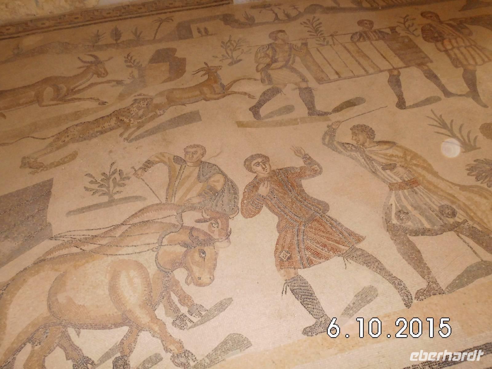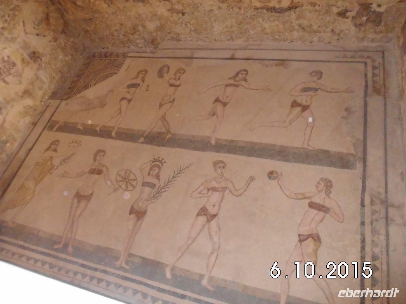 Mosaiken.Auf dem weiteren Weg hielt unser Fahrer Antonio zu einem Fotostopp mit ma- lerischem Blick auf die Stadt Piazza Armerina. Während der Besichtigung der Tempel von