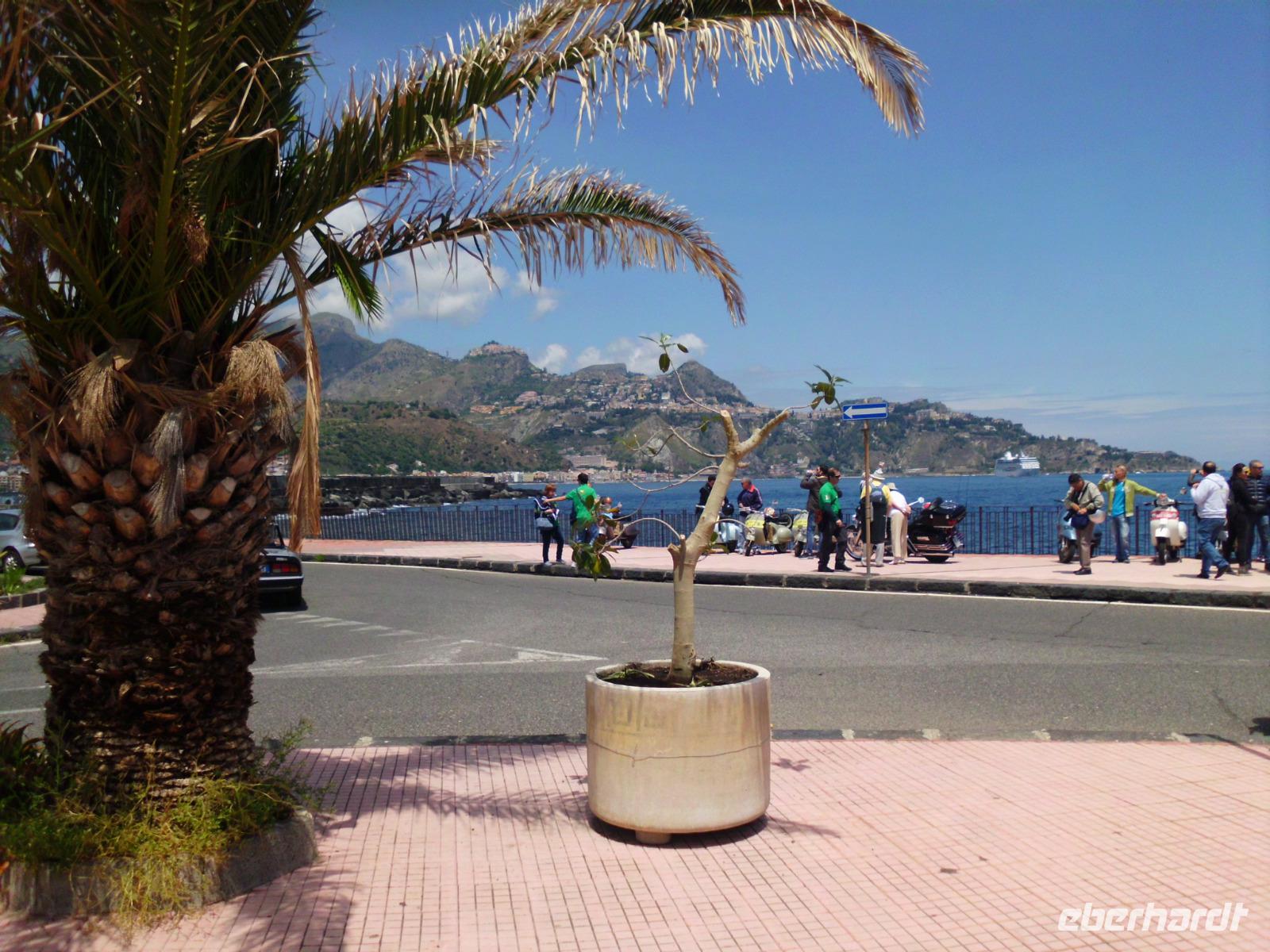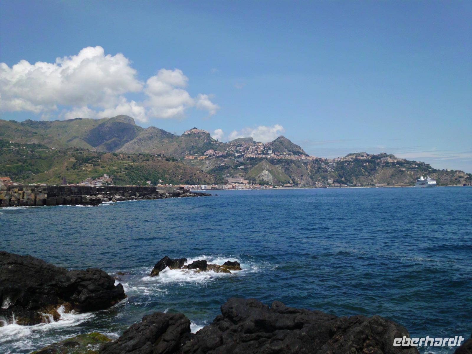 Pünktlich starten wir gegen 8 Uhr unseren Flug, fast mit Wunschsitzplätzen, da wir sehr früh einchecken. Planmäßig 11 Uhr landen wir in Catania, wo uns Reiseleiterin Renate in Empfang nimmt. Da die Zimmer noch nicht fertig sind, fahren wir in ein Restaurant in Giardini Naxos zum Mittagessen. Wir sitzen bei herrlichen Frühlingstemperaturen im Freien mit Blick aufs Meer und auf Taormina sowie das ganz oben auf dem Fels gelegene Castelmola. Dieser Blick lässt so viel Schönes erahnen, was sich auf der Reise bewahrheiten wird.