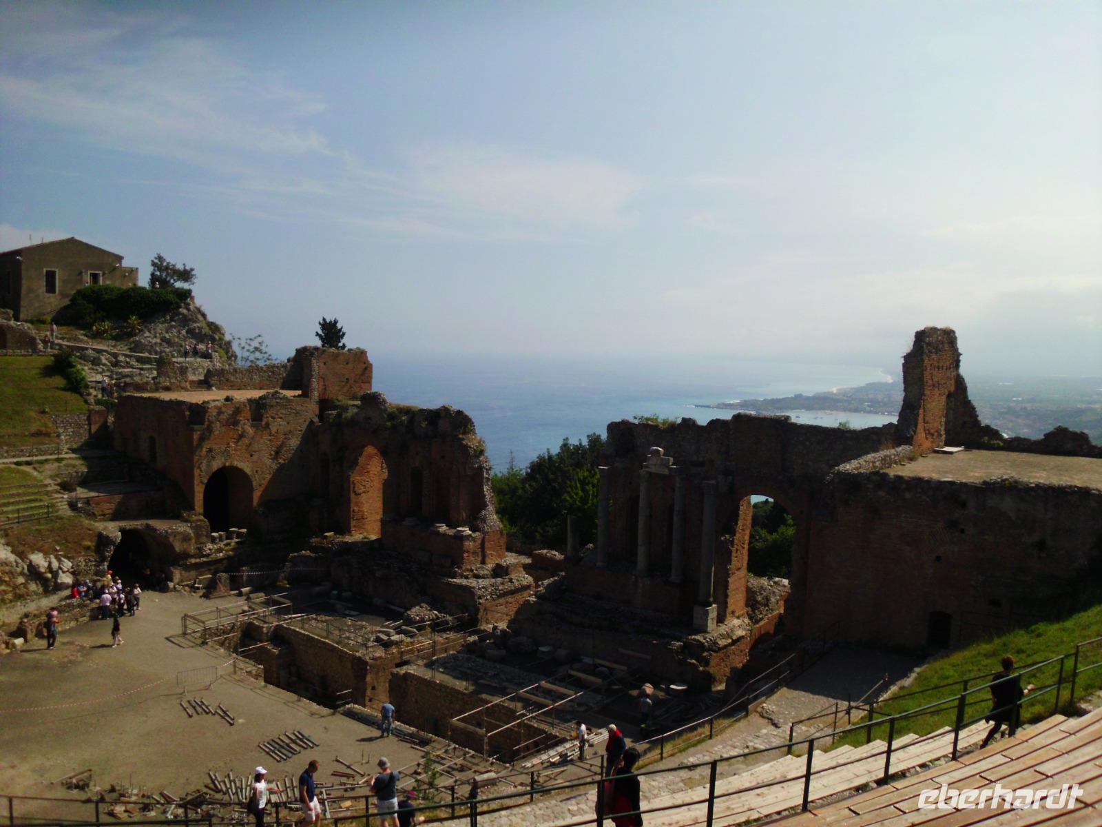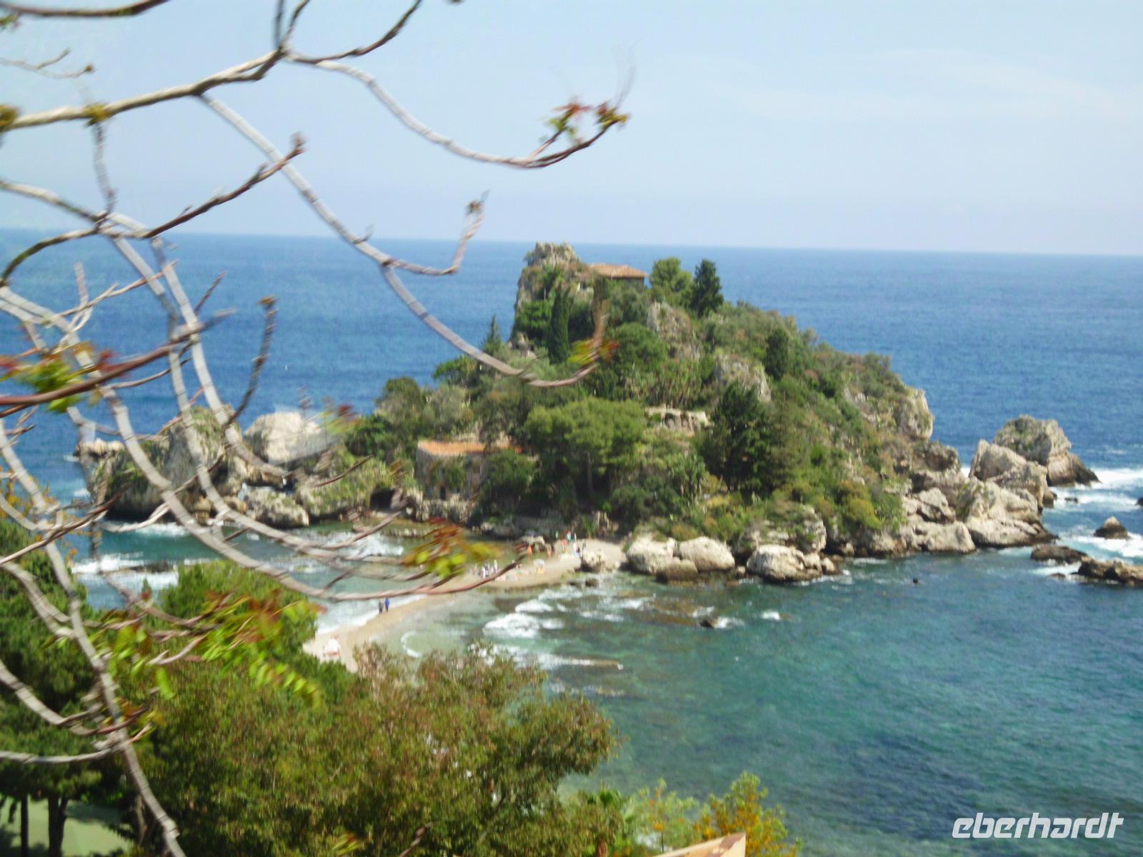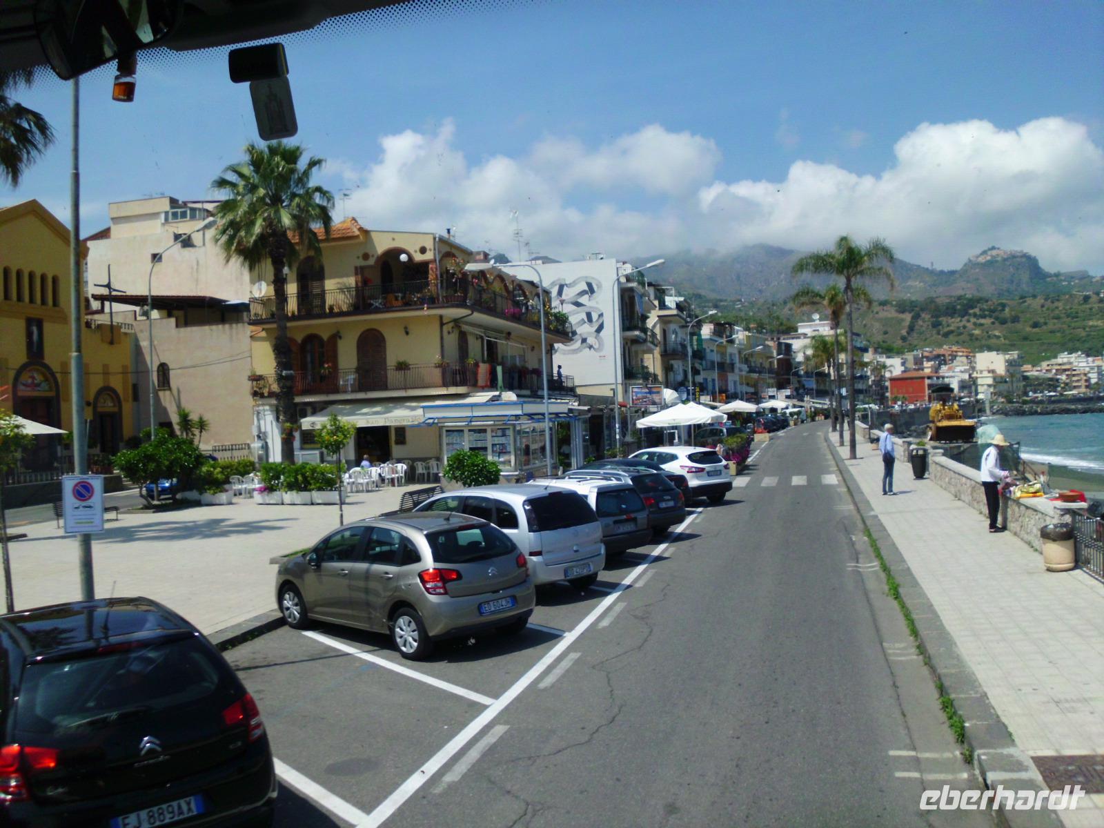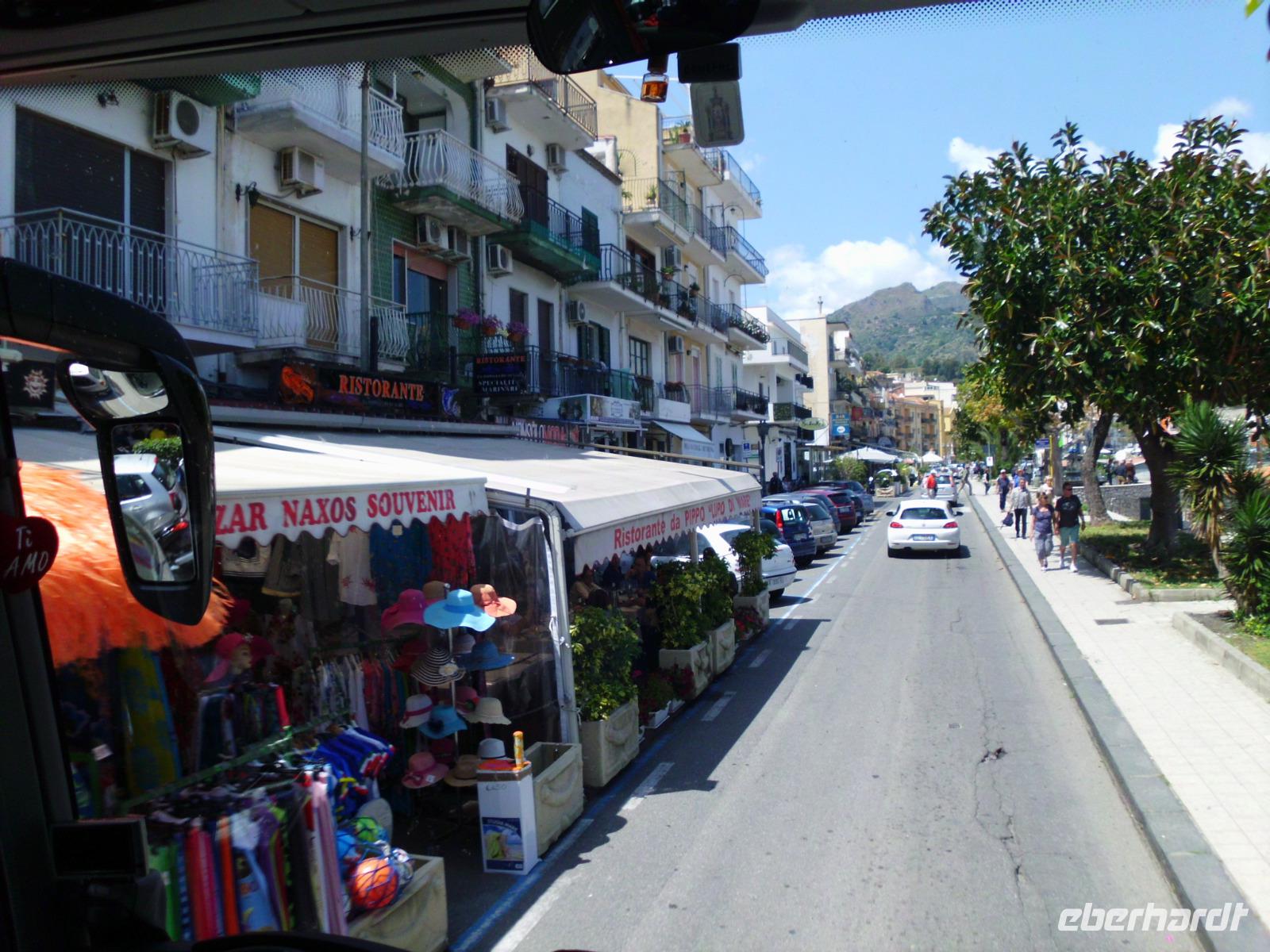 Bevor wir weiter nach Taormina fahren, verbringen wir unsere Mittagspause wieder in dem kleinen Restaurant am Meer in Giardini Naxos. Die schöne Stadt Taormina, die wir von hier aus nur aus der Ferne sahen ist nun zum Greifen nahe. Eindrucksvoll auch die Fahrt vorbei an der Küste von Taormina und der legendären Isola Bella. Nach Taormina bringt uns ein Shuttle-Bus, ein bisschen beschwerlich, da es nur mir Drängeln und Schubsen geht. Wir besichtigen das römische Theater, welches durch seine Lage am Meer und die besondere Bauweise eine hervorragende Akustik aufweist. Es bleibt noch Zeit durch diesen schmucken Ort mit seinen Gässchen und dem Umberto Corso zu bummeln, vorbei an herrlichen Konditoreien mit ihren üppigen Marzipanangeboten. Auf dem Piazza IX. Aprile mit seinem tollen Aussichtspunkt bietet sich ein Kaffeepäuschen regelrecht an.