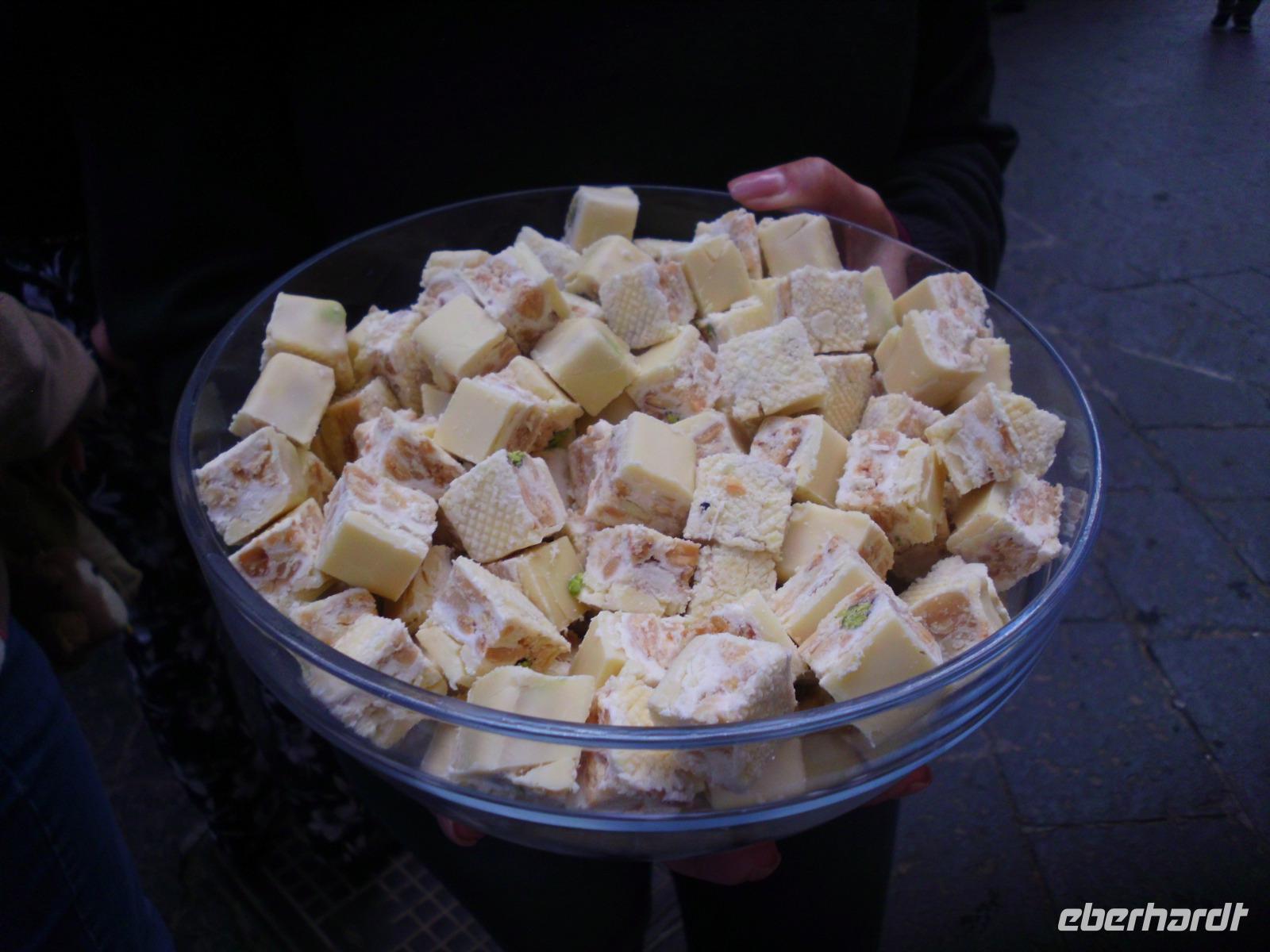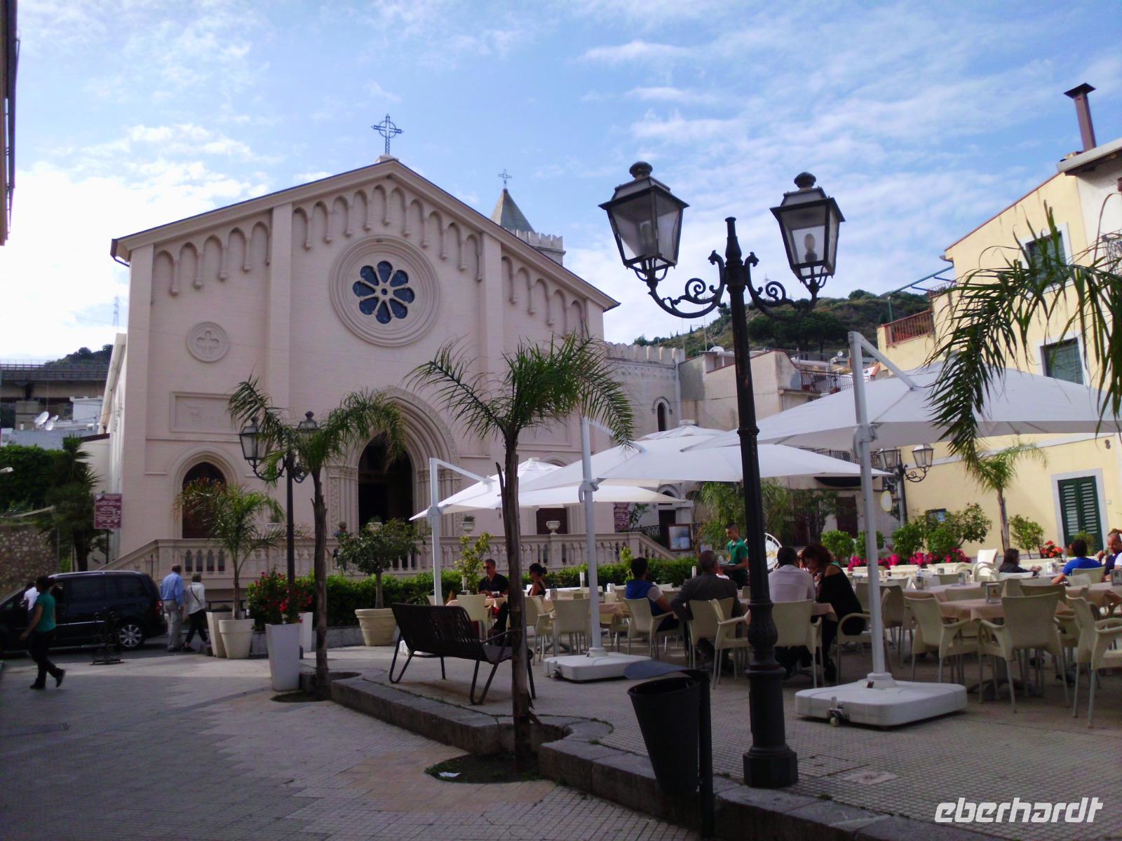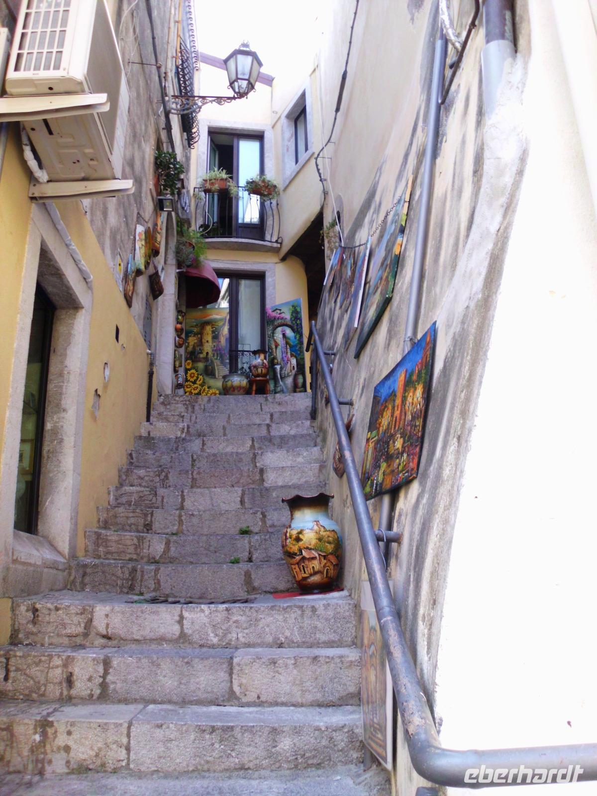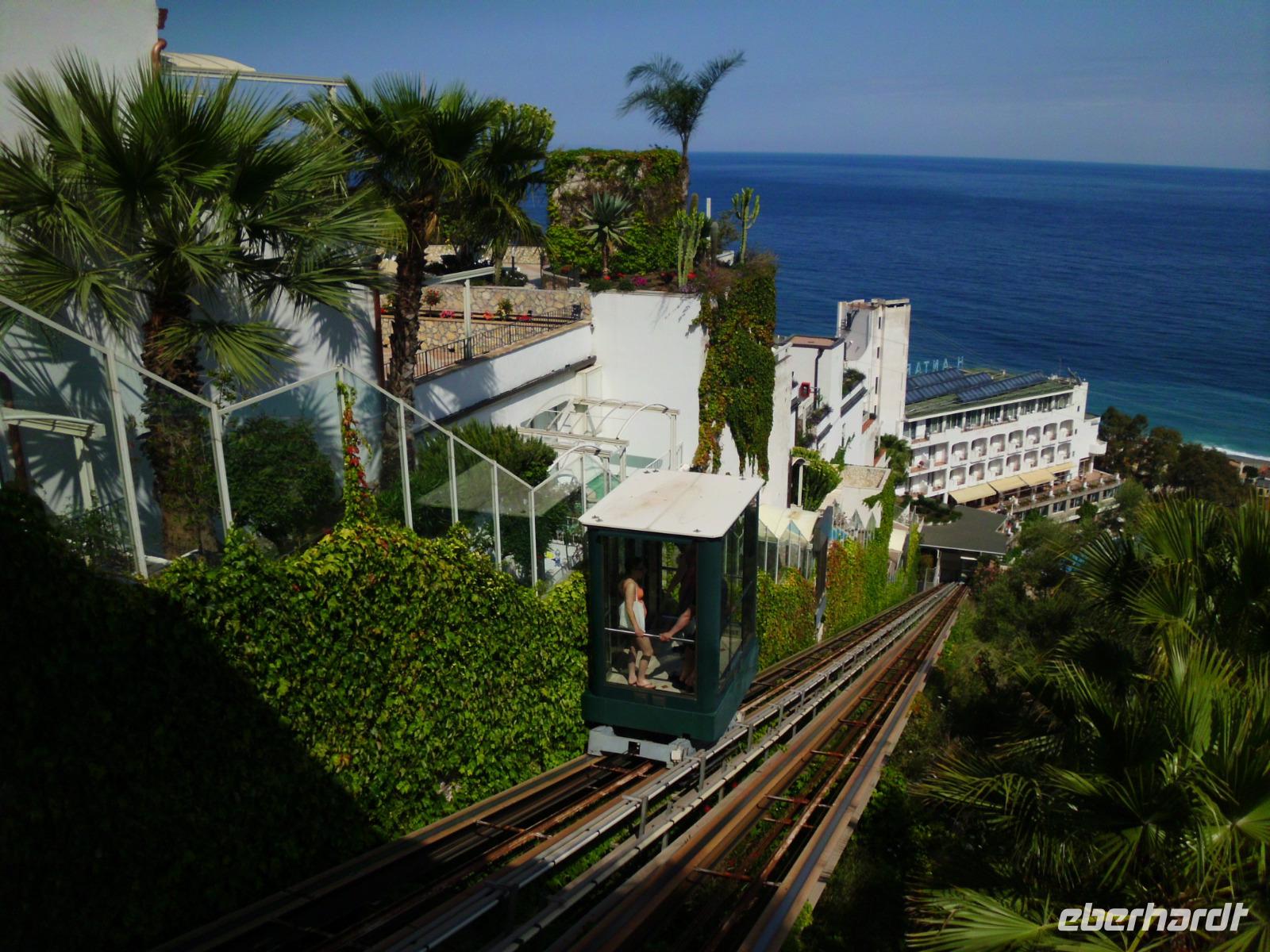 Bevor wir weiter nach Taormina fahren, verbringen wir unsere Mittagspause wieder in dem kleinen Restaurant am Meer in Giardini Naxos. Die schöne Stadt Taormina, die wir von hier aus nur aus der Ferne sahen ist nun zum Greifen nahe. Eindrucksvoll auch die Fahrt vorbei an der Küste von Taormina und der legendären Isola Bella. Nach Taormina bringt uns ein Shuttle-Bus, ein bisschen beschwerlich, da es nur mir Drängeln und Schubsen geht. Wir besichtigen das römische Theater, welches durch seine Lage am Meer und die besondere Bauweise eine hervorragende Akustik aufweist. Es bleibt noch Zeit durch diesen schmucken Ort mit seinen Gässchen und dem Umberto Corso zu bummeln, vorbei an herrlichen Konditoreien mit ihren üppigen Marzipanangeboten. Auf dem Piazza IX. Aprile mit seinem tollen Aussichtspunkt bietet sich ein Kaffeepäuschen regelrecht an.