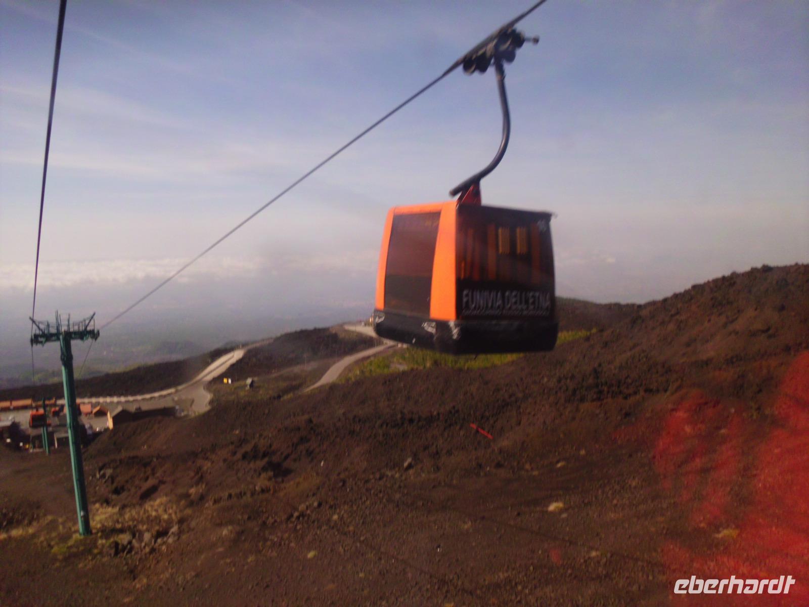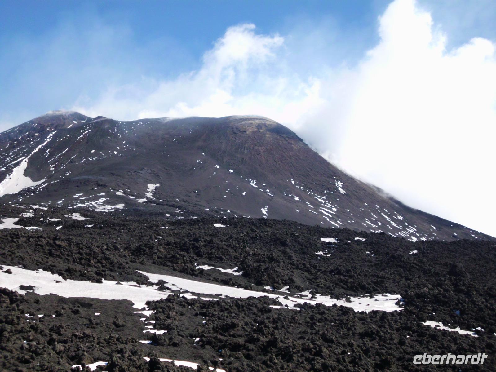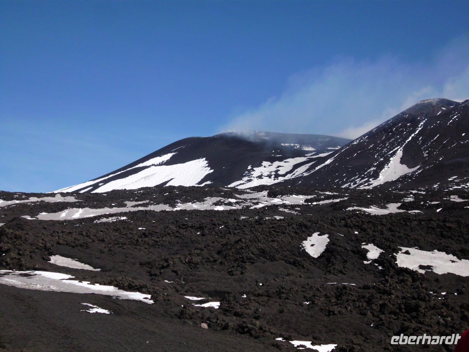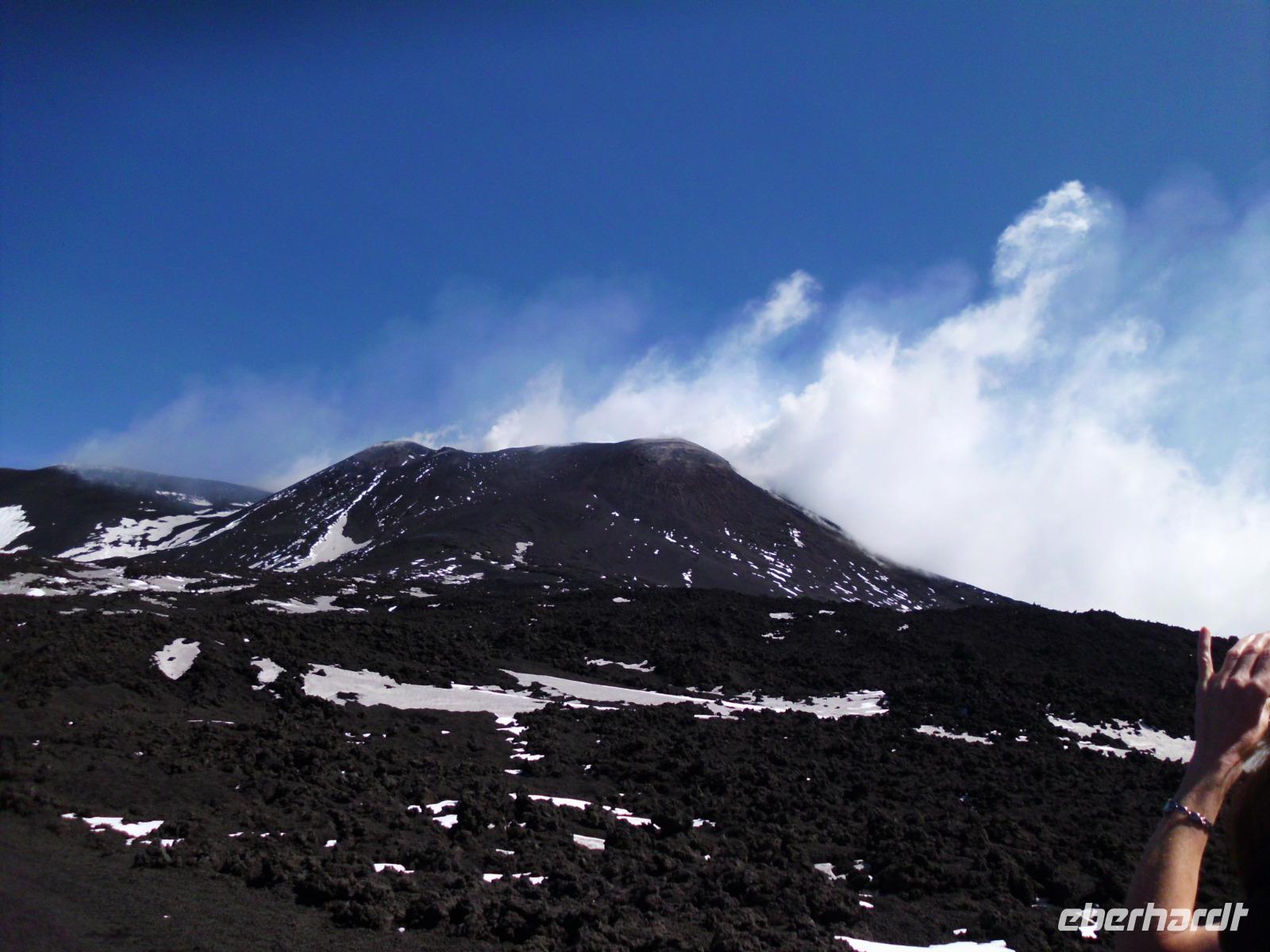 Es ist wohl ein Glückstag für die ganze Gruppe. Das Wetter passt, ein klarer Sonnentag und kaum Wind. Unsere Tour auf den Ätna kann losgehen, denn wir wollen auf 2913m Höhe, bis an den Kraterrand des 3329m hohen Vulkans. Dank guter Planung sind wir mit die Ersten auf dem Silvestrikrater auf einer Höhe von 2000 Metern, von wo aus uns die Seilbahn weiter befördert. Die letzte Station wird in Geländewagen gefahren. Hochinteressant und mystisch ist die Geschichte des Ätna. Er ist einer der letzten aktiven Vulkane Europas, auch wenn er scheinbar schlummert. Er raucht und brodelt ständig. Bei den Ausbrüchen 2001 und 2002 wurden Seilbahn und Skilift schwer zerstört, die überall erstarrte Lava lässt die Naturgewalt nur erahnen. Ganz oben in 2913m Höhe erfahren wir von einem Bergführer viel Wissenswertes über die Krater und die erstarrten Lavaströme. Der Ätna bildet immer noch eine leichte Rauchwolke vom letzten Ausbruch, eindrucksvoll schimmert überall schwarzes Lavagestein durch die Schneereste.