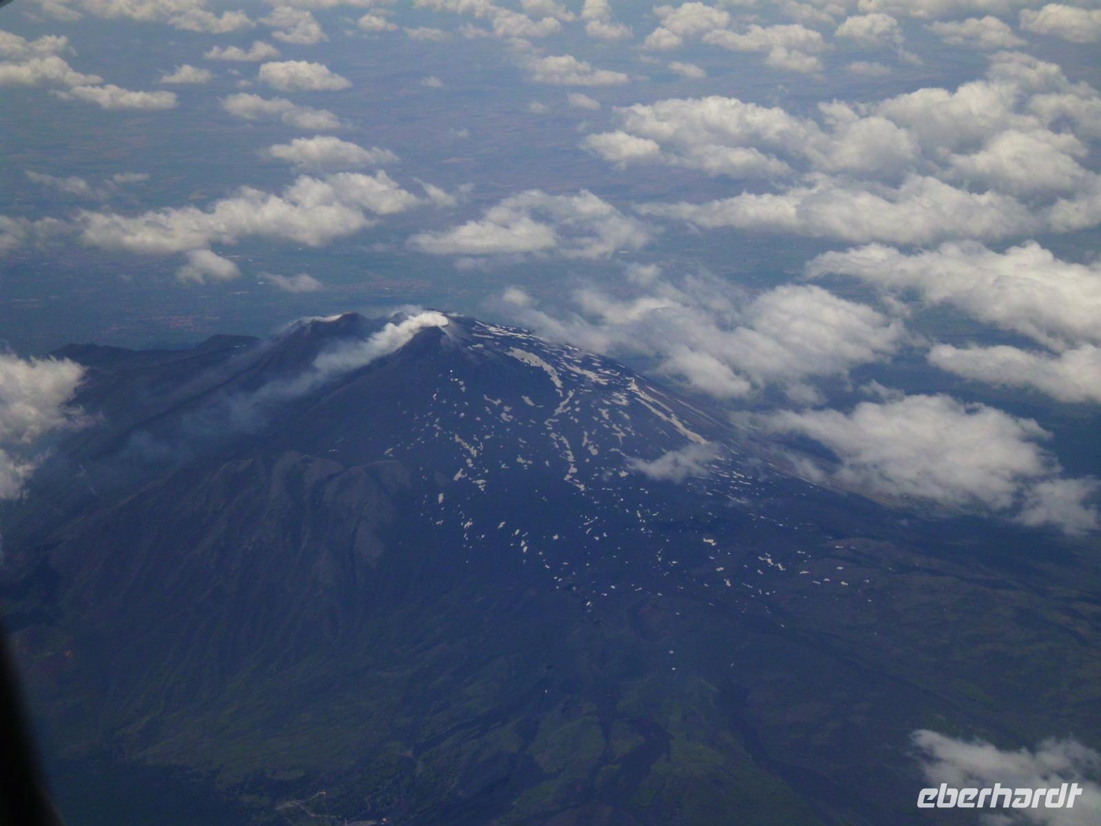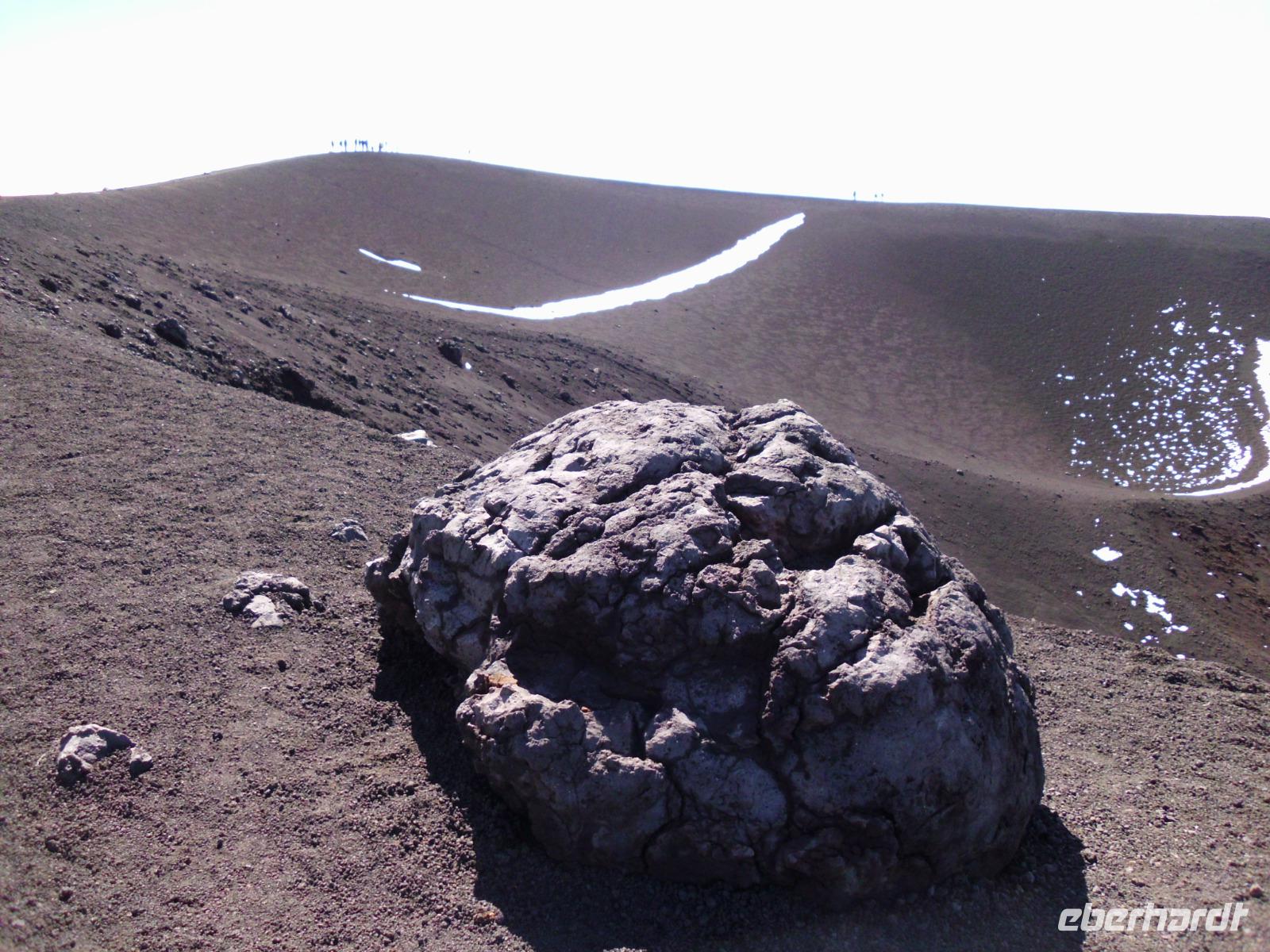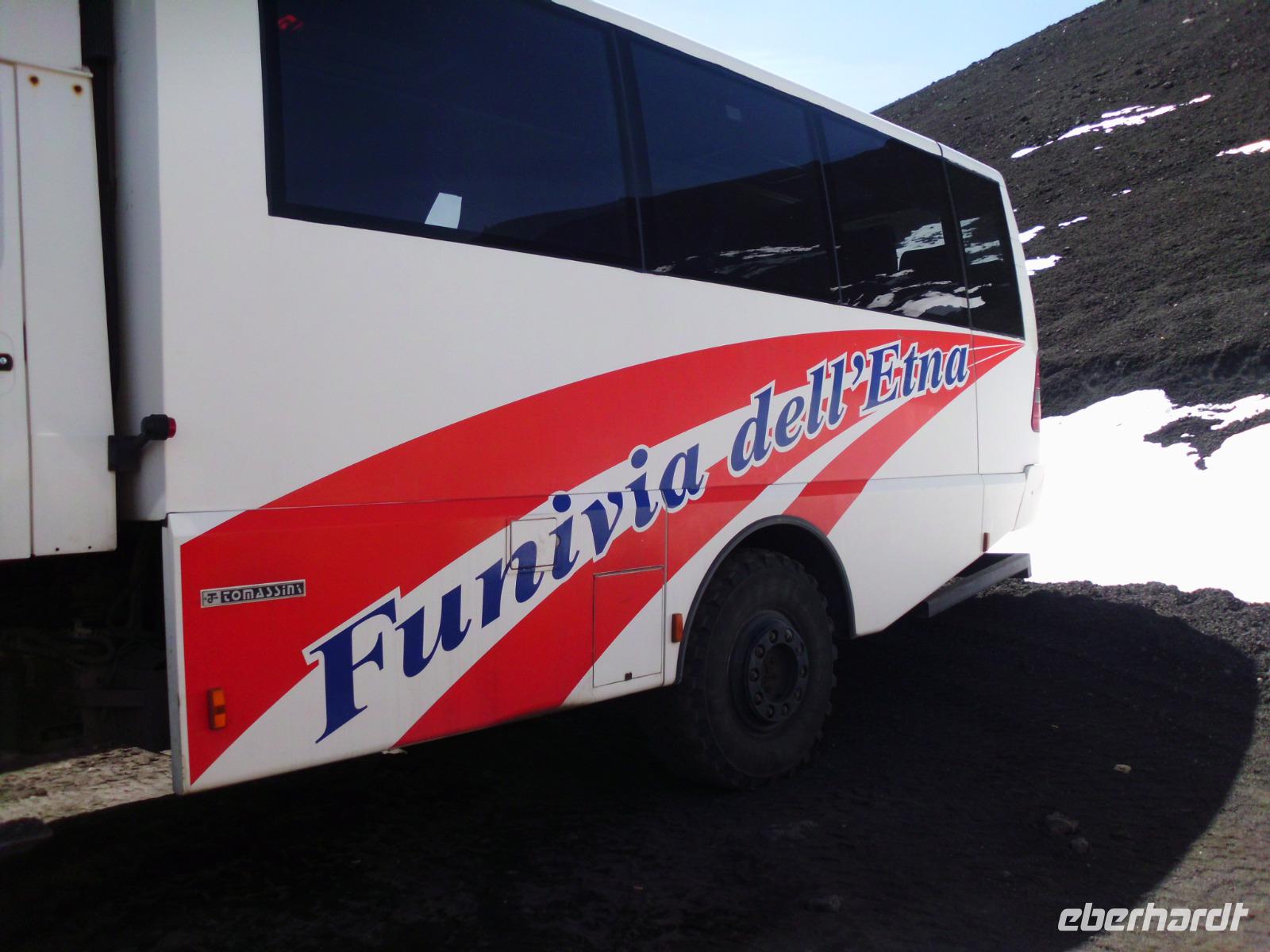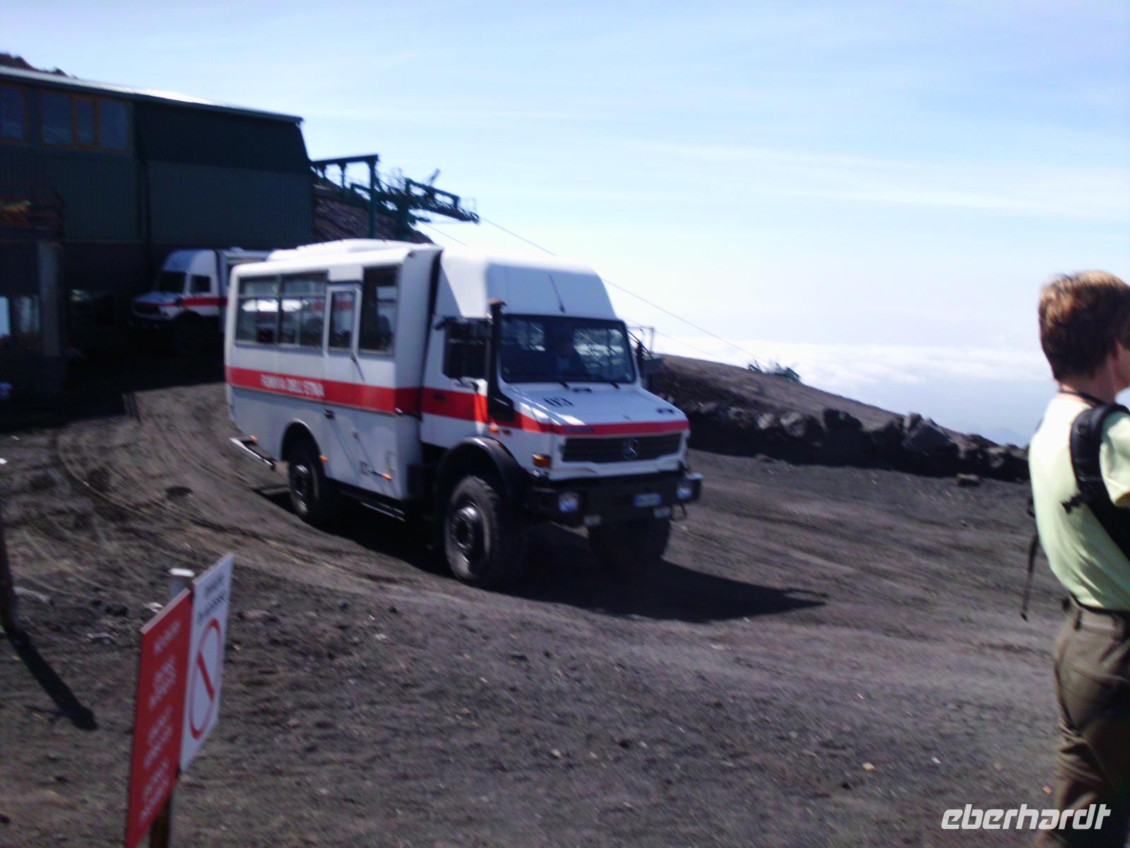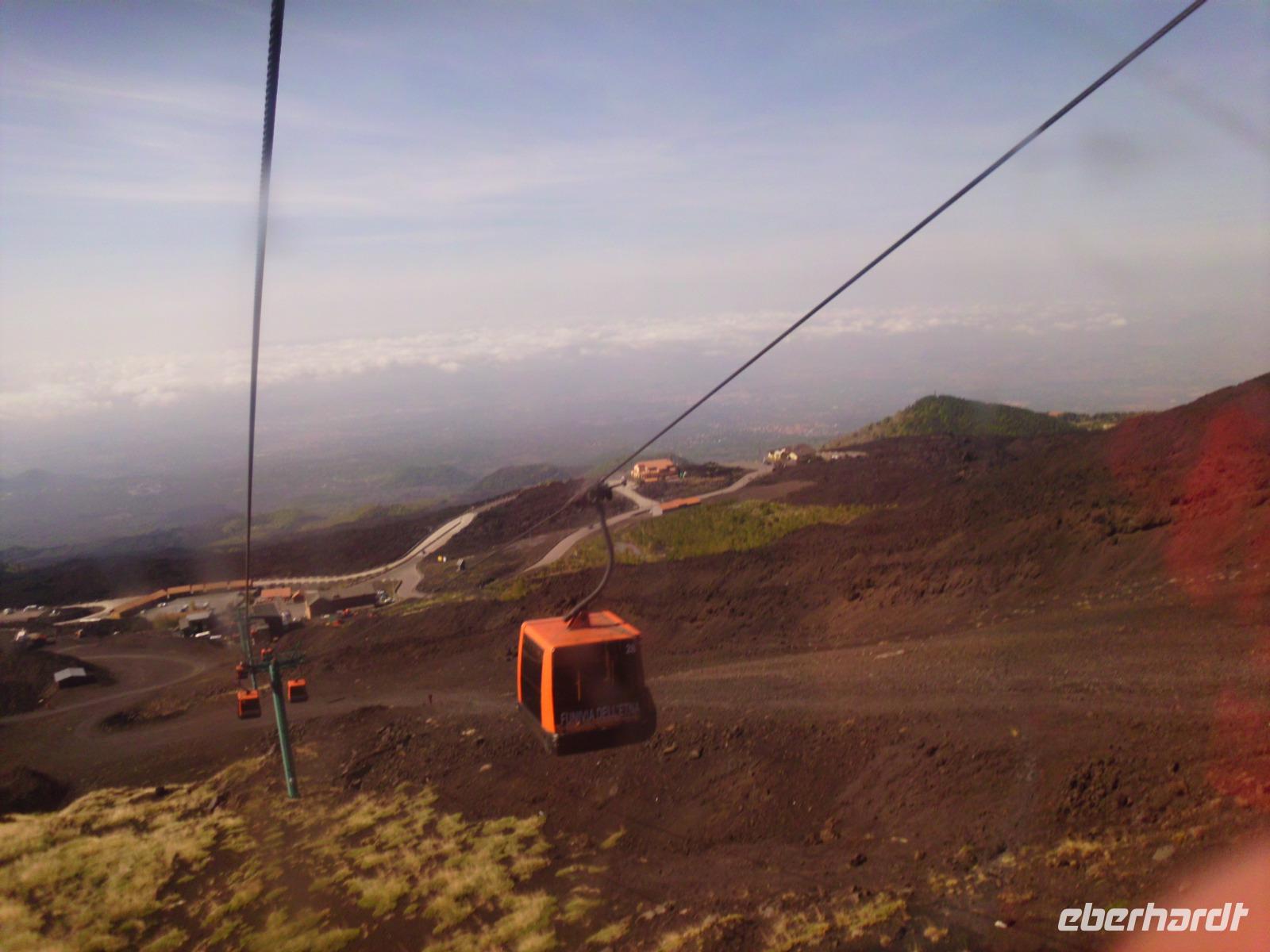 Es ist wohl ein Glückstag für die ganze Gruppe. Das Wetter passt, ein klarer Sonnentag und kaum Wind. Unsere Tour auf den Ätna kann losgehen, denn wir wollen auf 2913m Höhe, bis an den Kraterrand des 3329m hohen Vulkans. Dank guter Planung sind wir mit die Ersten auf dem Silvestrikrater auf einer Höhe von 2000 Metern, von wo aus uns die Seilbahn weiter befördert. Die letzte Station wird in Geländewagen gefahren. Hochinteressant und mystisch ist die Geschichte des Ätna. Er ist einer der letzten aktiven Vulkane Europas, auch wenn er scheinbar schlummert. Er raucht und brodelt ständig. Bei den Ausbrüchen 2001 und 2002 wurden Seilbahn und Skilift schwer zerstört, die überall erstarrte Lava lässt die Naturgewalt nur erahnen. Ganz oben in 2913m Höhe erfahren wir von einem Bergführer viel Wissenswertes über die Krater und die erstarrten Lavaströme. Der Ätna bildet immer noch eine leichte Rauchwolke vom letzten Ausbruch, eindrucksvoll schimmert überall schwarzes Lavagestein durch die Schneereste.