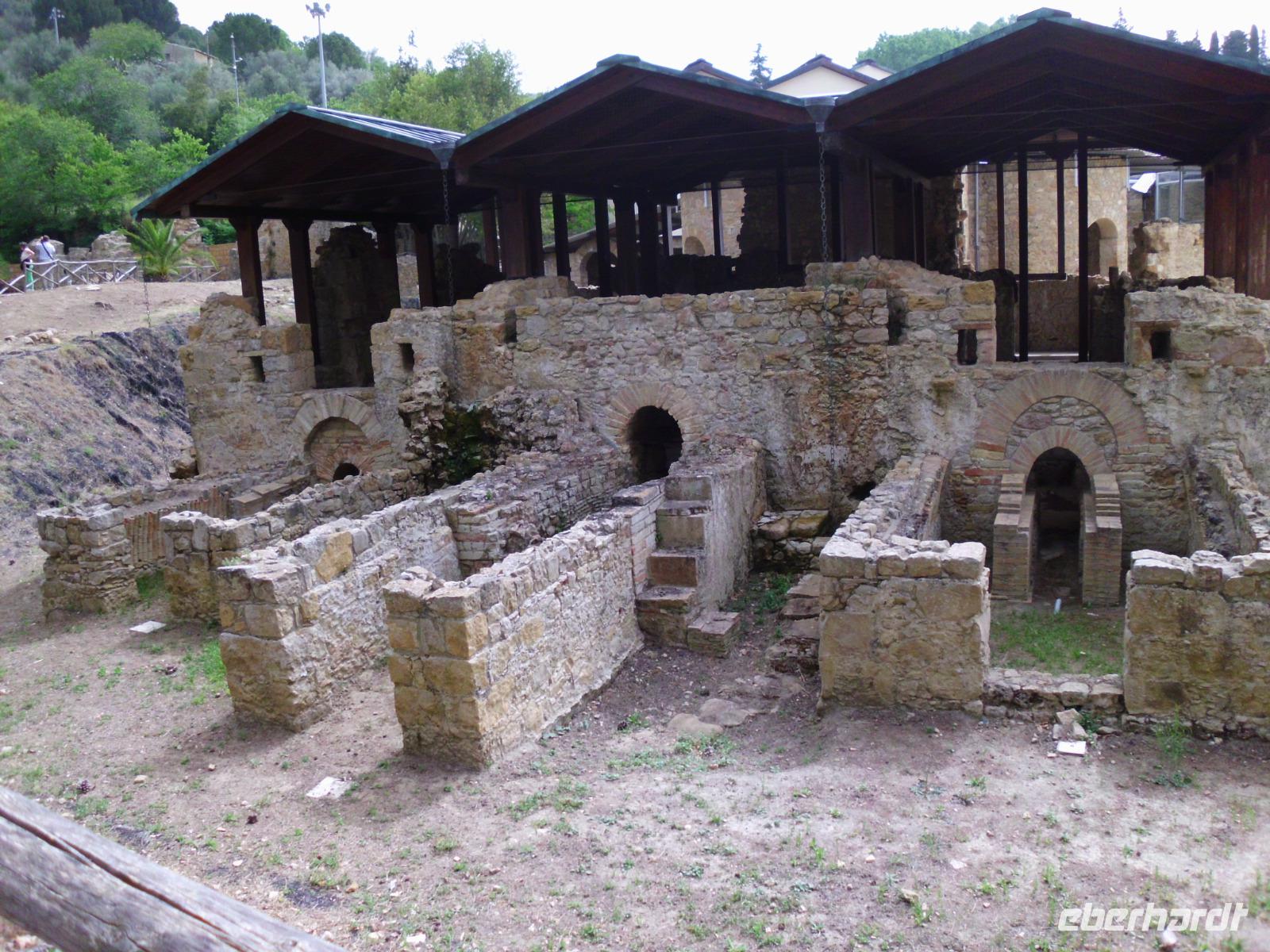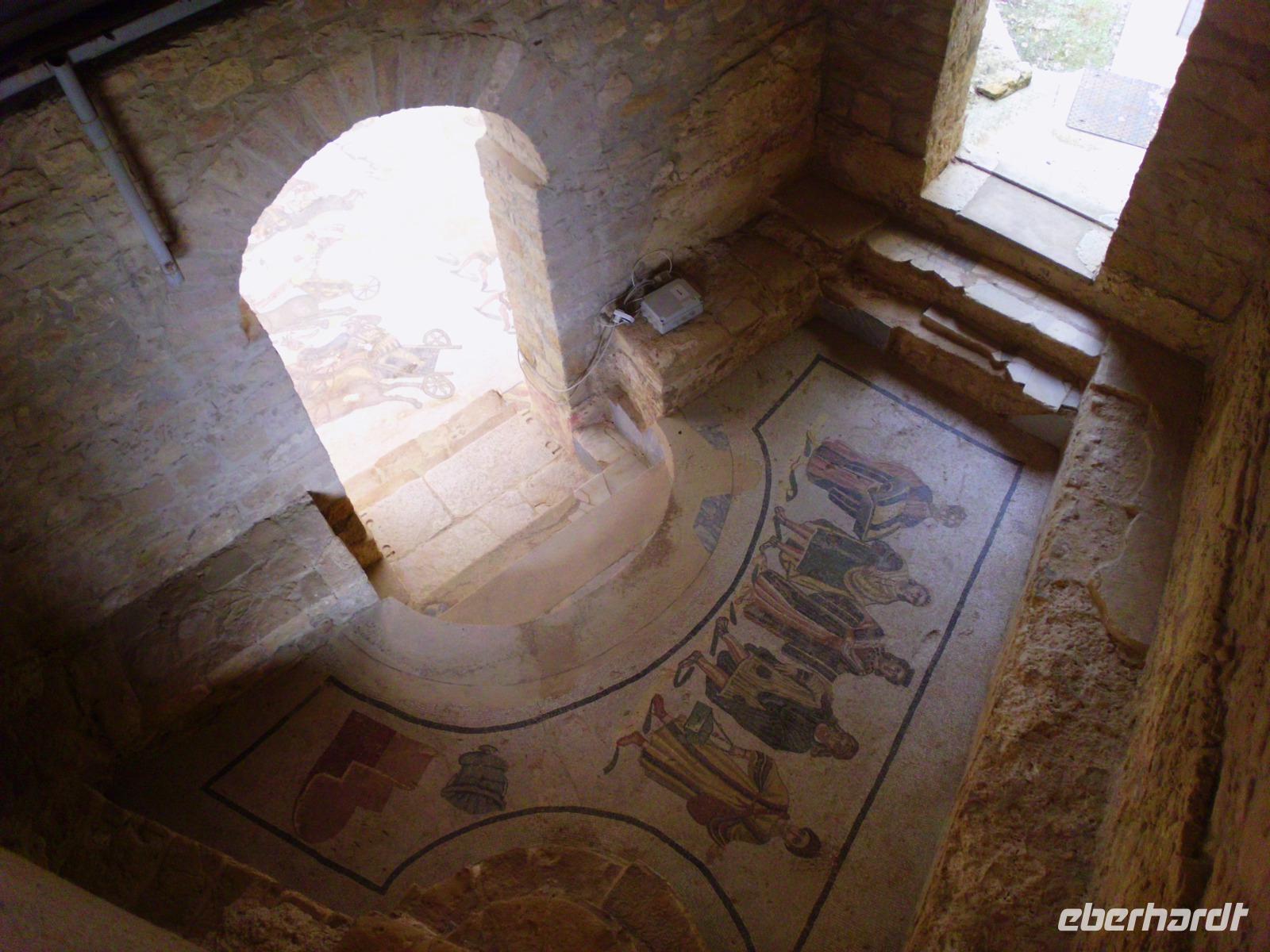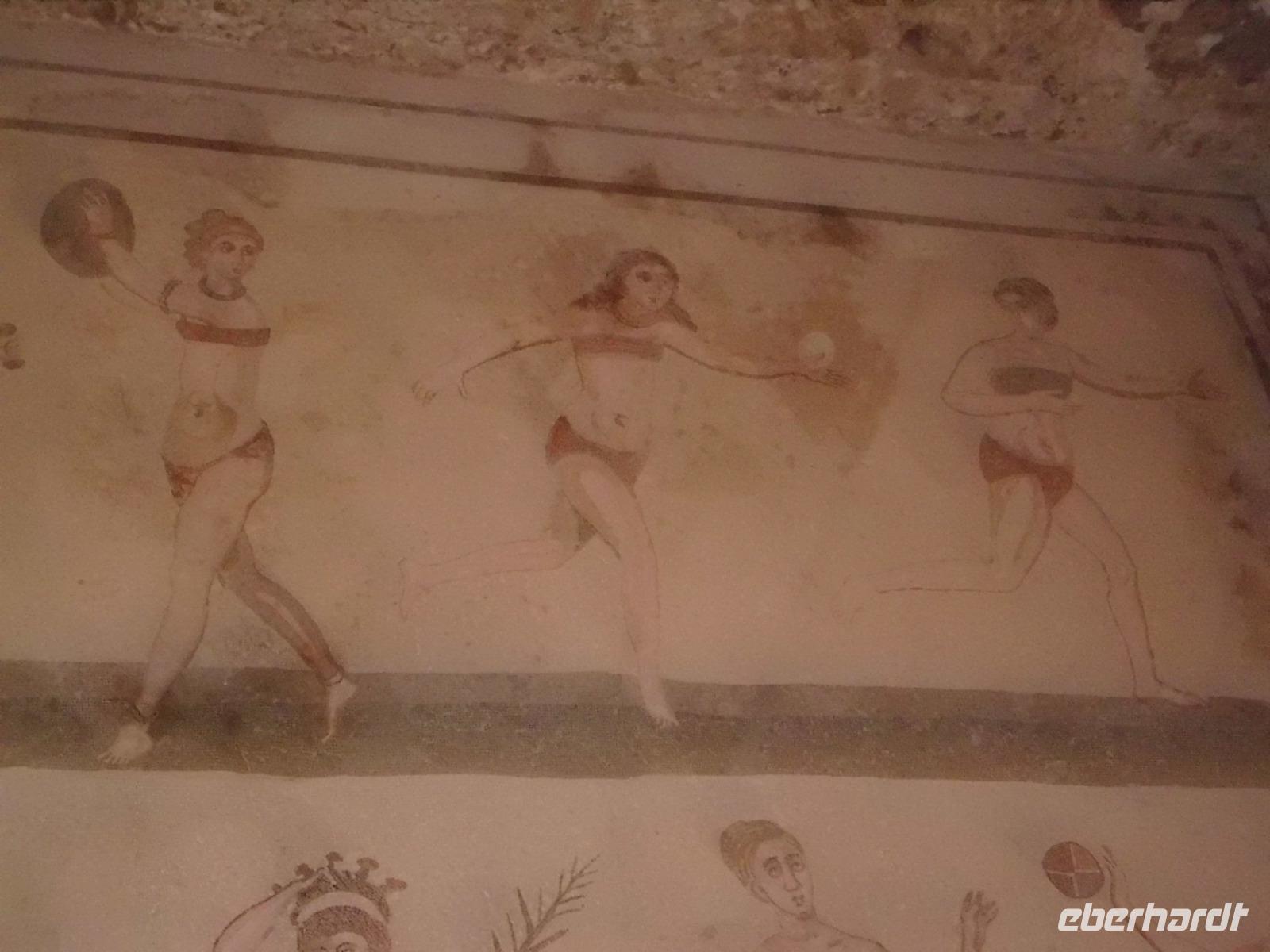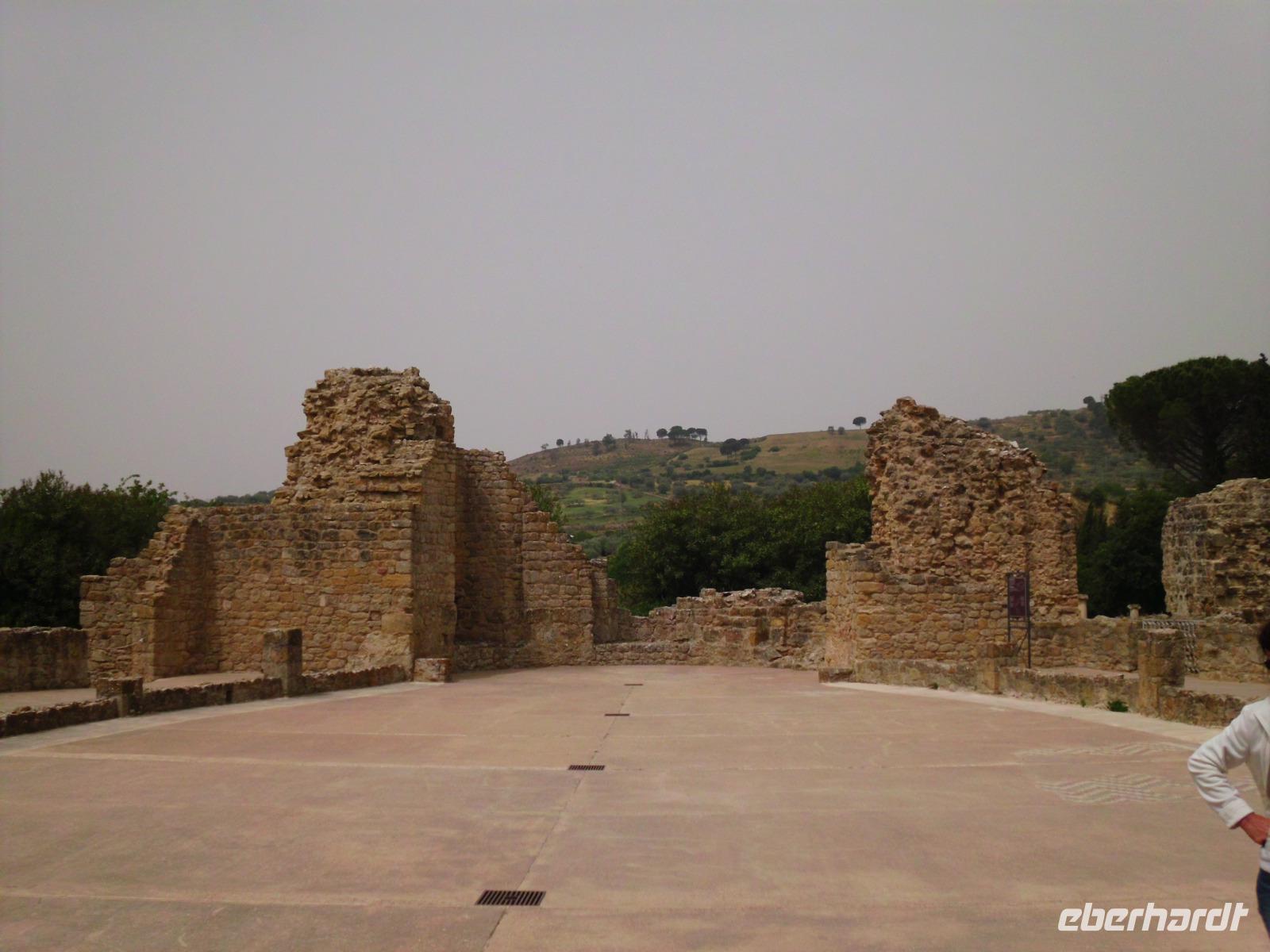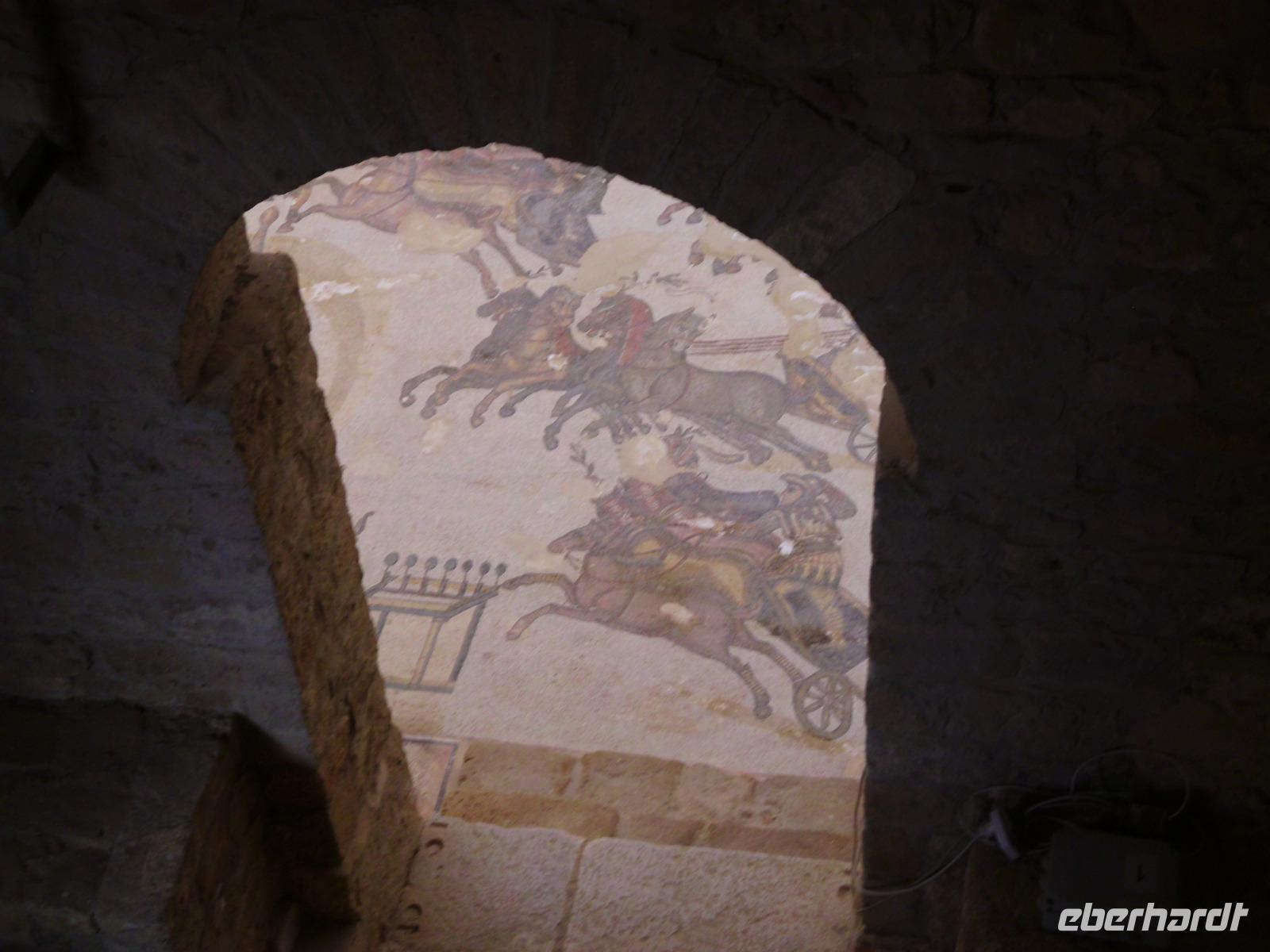Die „Villa Romana del Casale" liegt im Bergarbeiterort Piazza Armerina, den wir beim anschließenden Fotostop noch einmal eindrucksvoll wahrnehmen können. Der Ort klebt malerisch am Hang. Renate führt uns durch die Villa Casale, eine Kaiservilla aus der römischen Zeit im 5.Jahrhundert, die verschüttet wurde und später nach einem Erdrutsch 1926 wieder freigelegt wurde. Eindrucksvoll sind die vielen gut erhaltenen Bodenmosaike, u.a. die berühmten Bikini Mädchen, wir sehen auch das Schlafzimmer und die Kinderzimmer. Es ist immer wieder beeindruckend, wie diese stummen Zeitzeugen einer vergangenen Zivilisation uns zu großen Emotionen anregen, auch ohne Stimme zu uns sprechen.