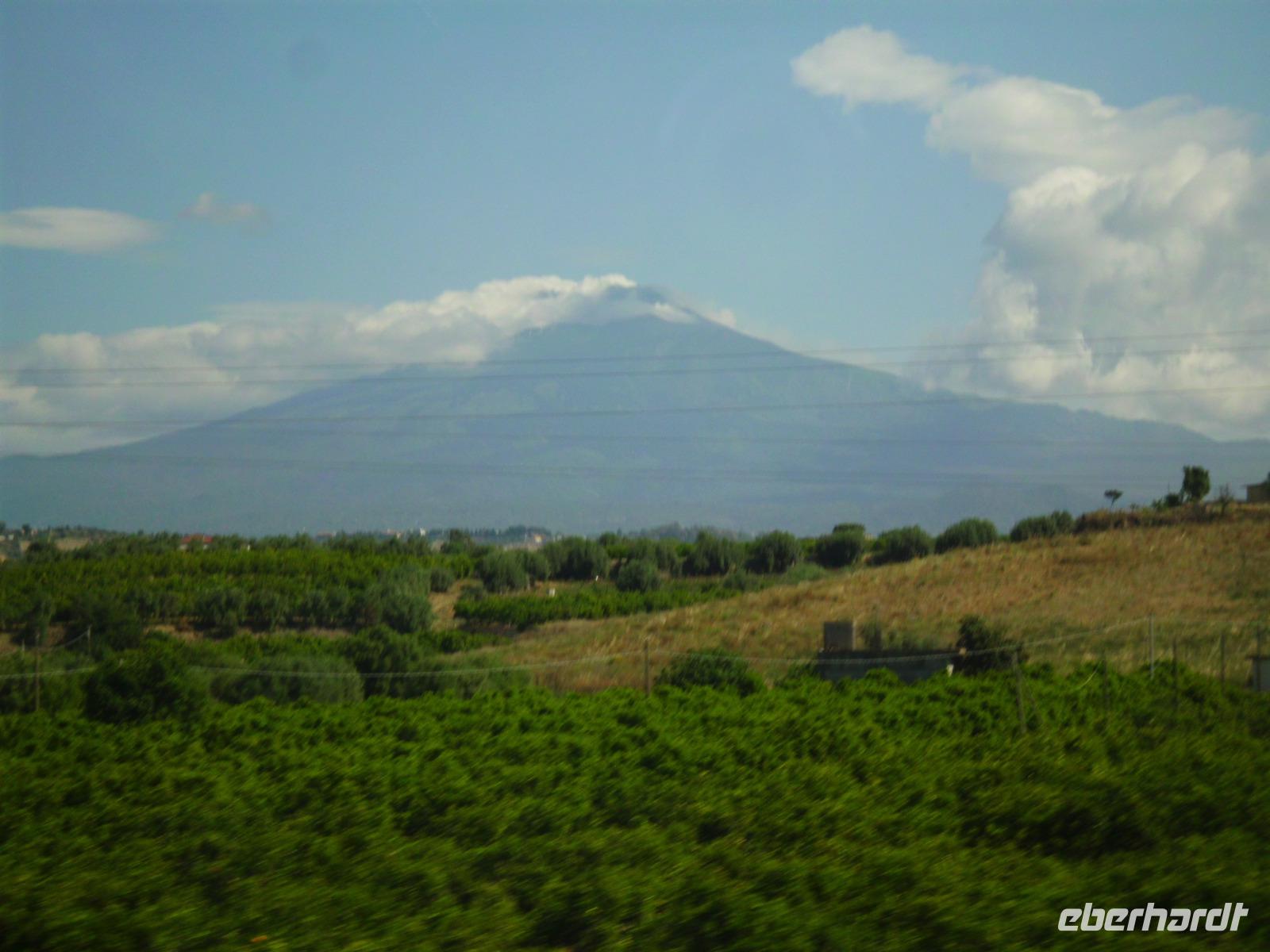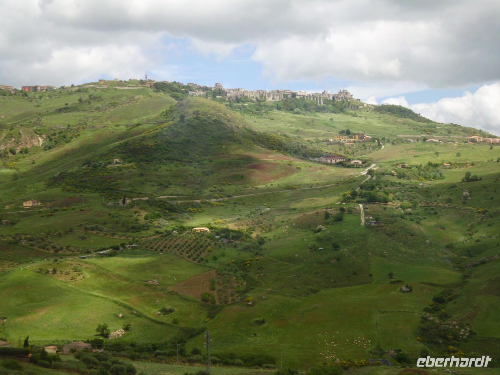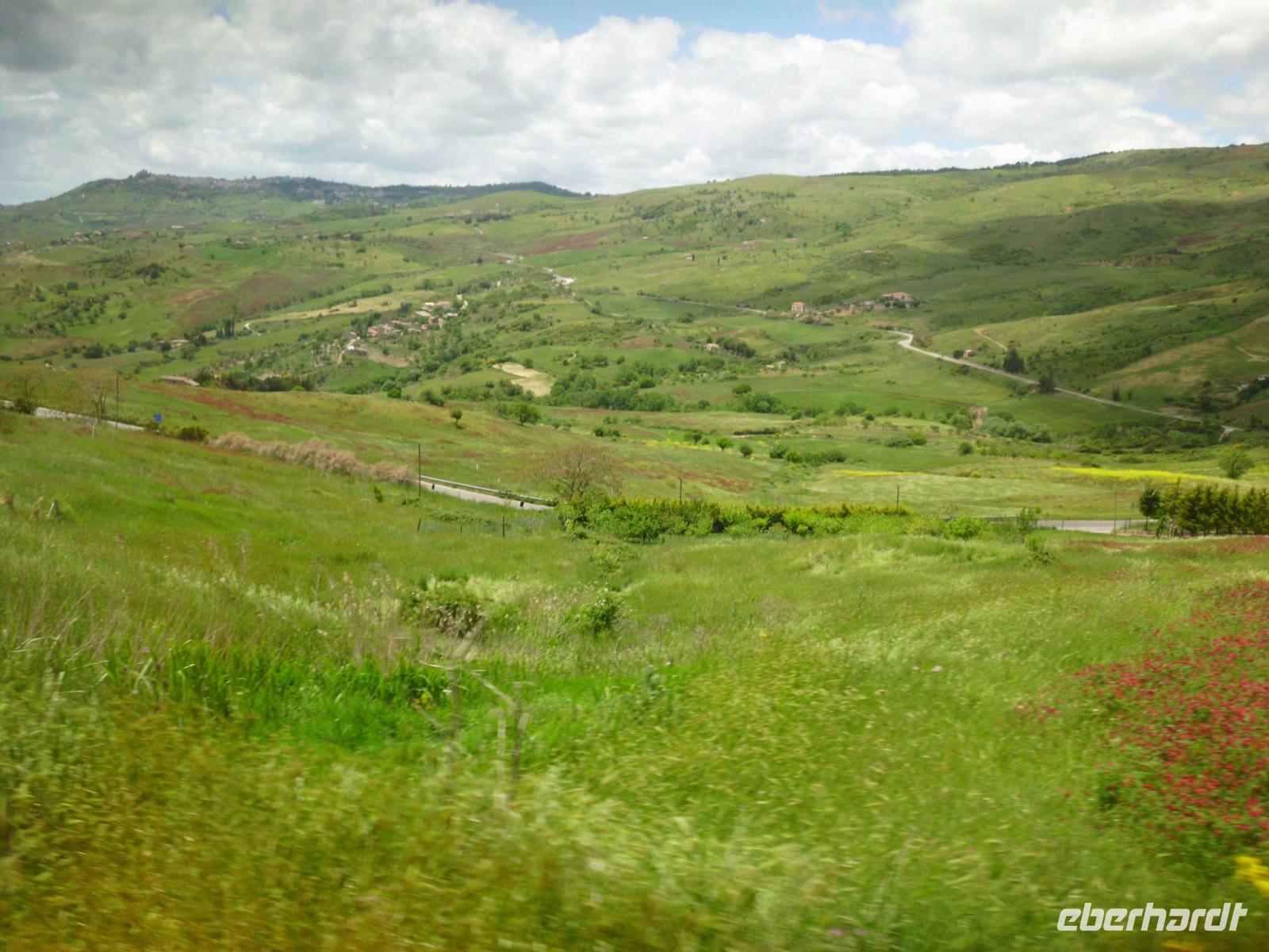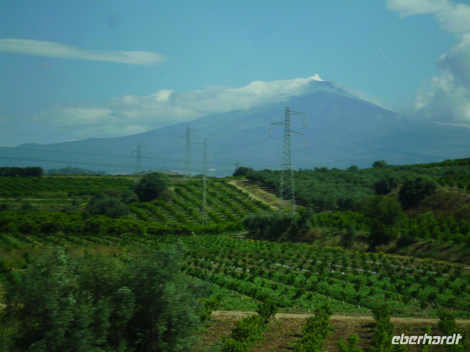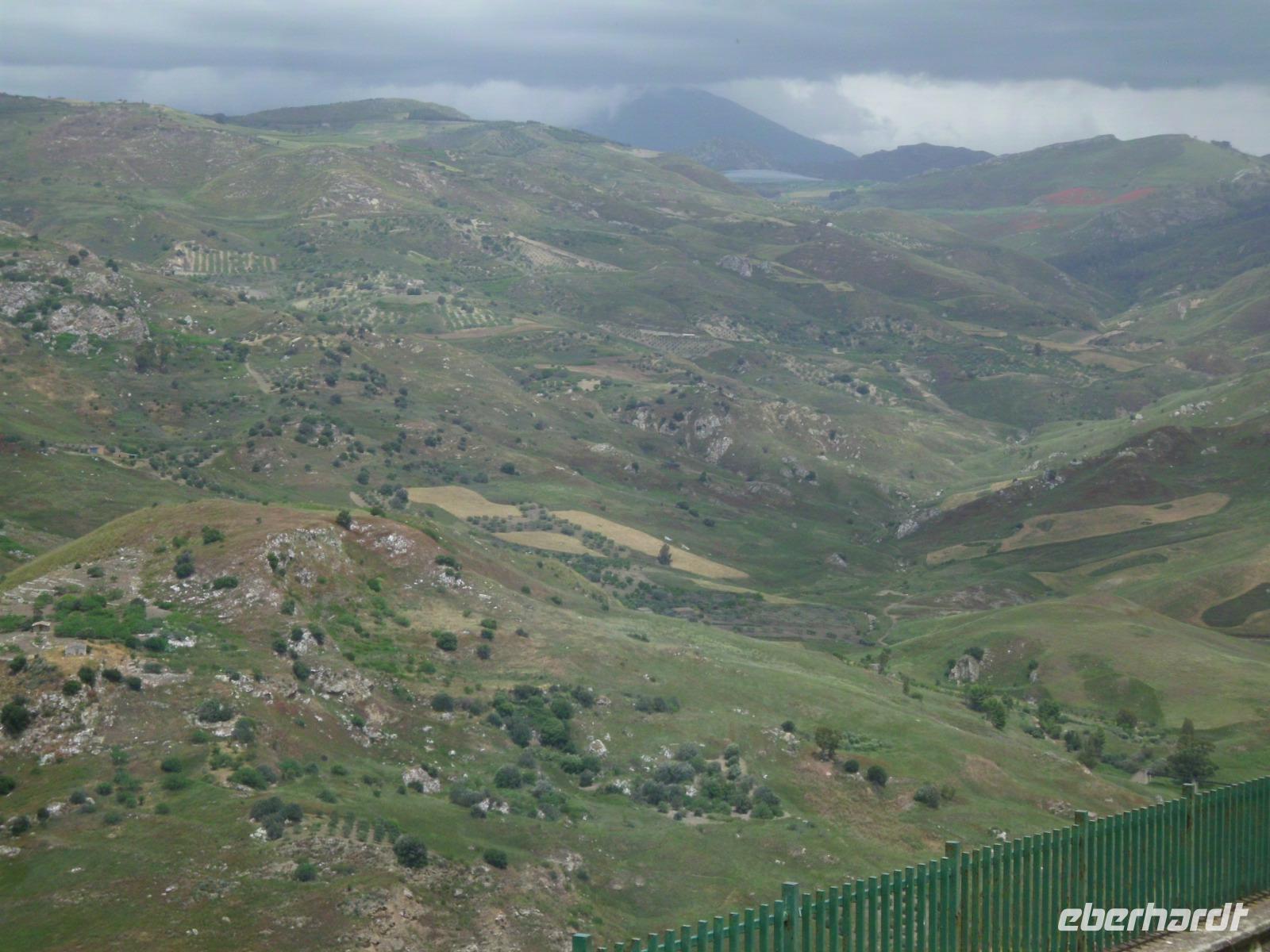 Mit gepackten Koffern nehmen wir Abschied von unserem schönen Hotel in Letojanni und fahren in das Innere der Insel. D.O.C. Maurizio unser Busfahrer meistert die kurvenreichen Strecken mit Ruhe und Eleganz, wie es nur ein Sizilianer kann. Wir erfahren auch, dass Sizilianer keine Italiener sind, sondern eben SIZILIANER. Die Fahrt geht vorbei an riesigen Orangenplantagen, bunten Blumenwiesen und Zitronenbäumen, die, wie wir erfahren aller 3 Monate Früchte tragen.