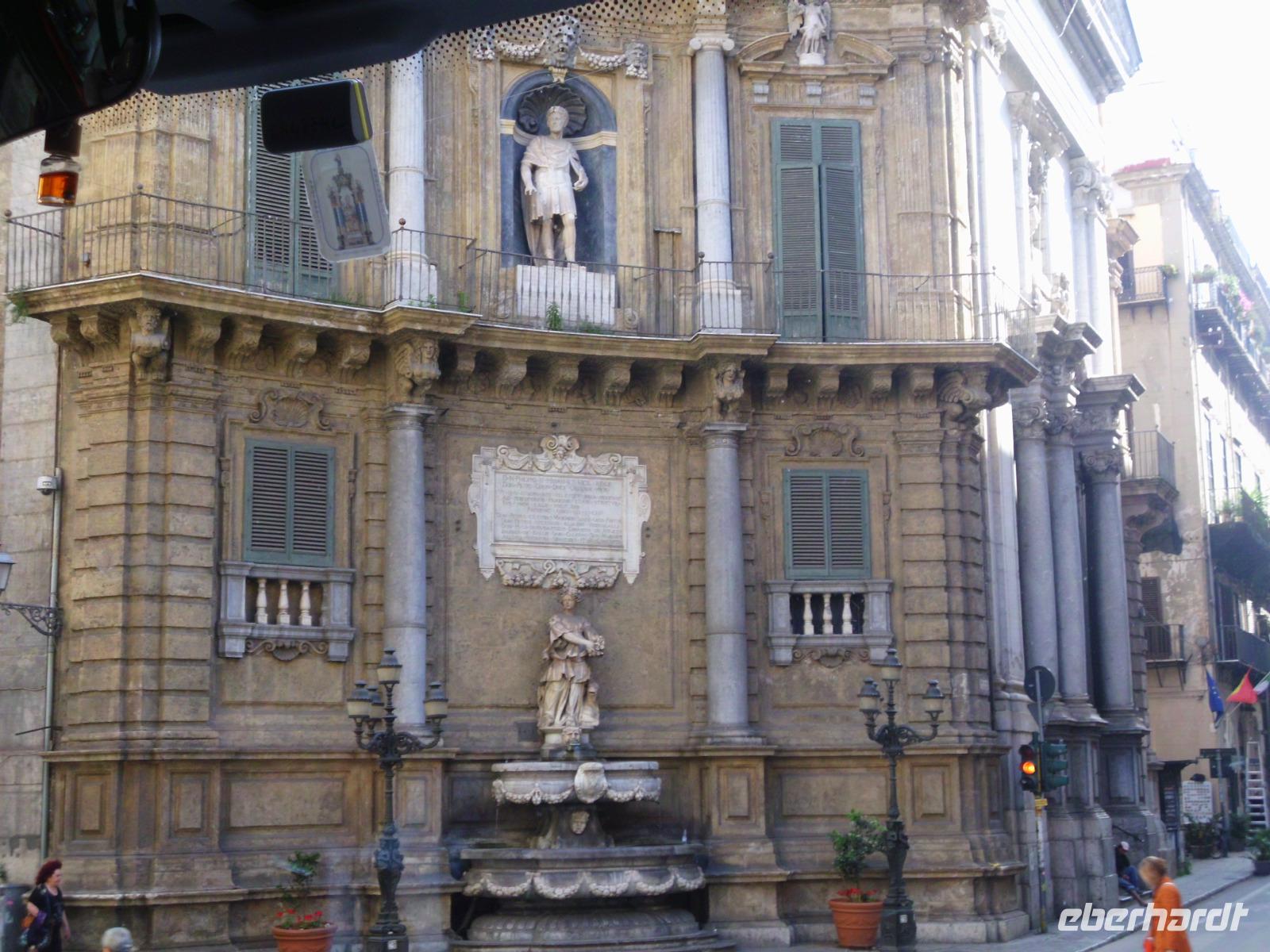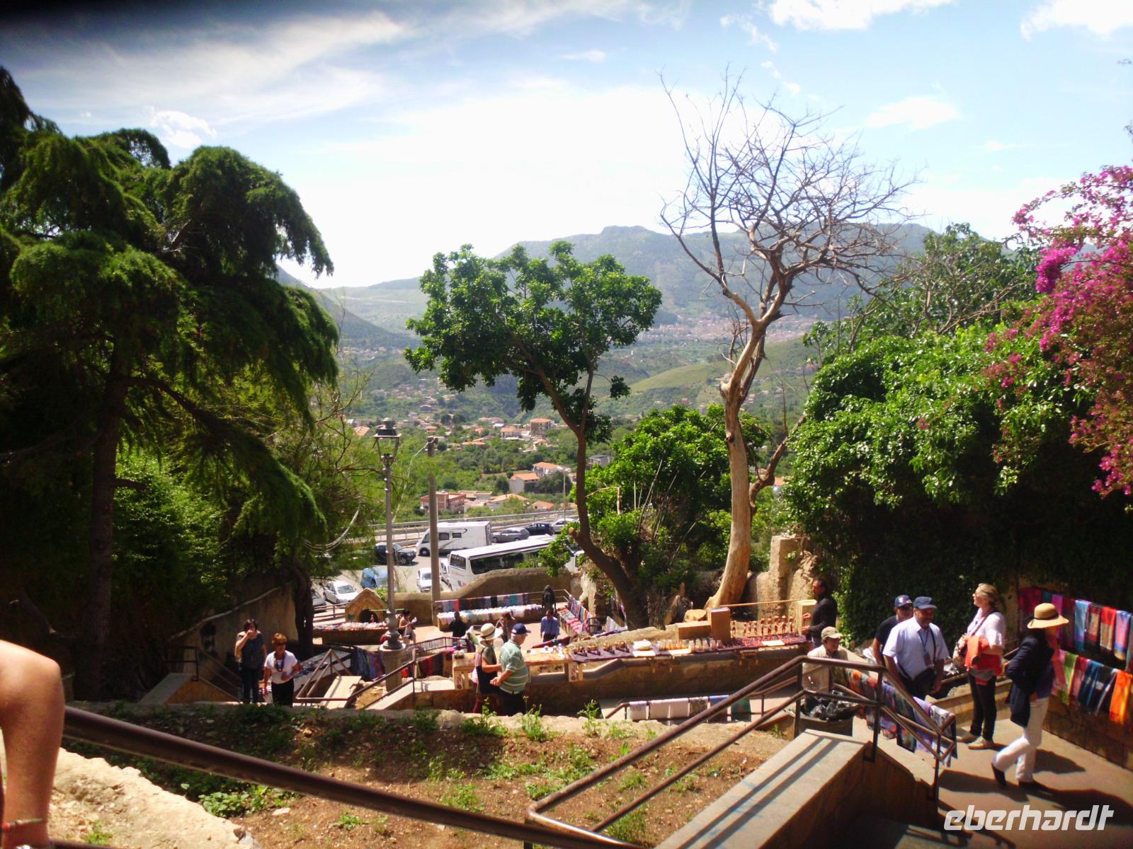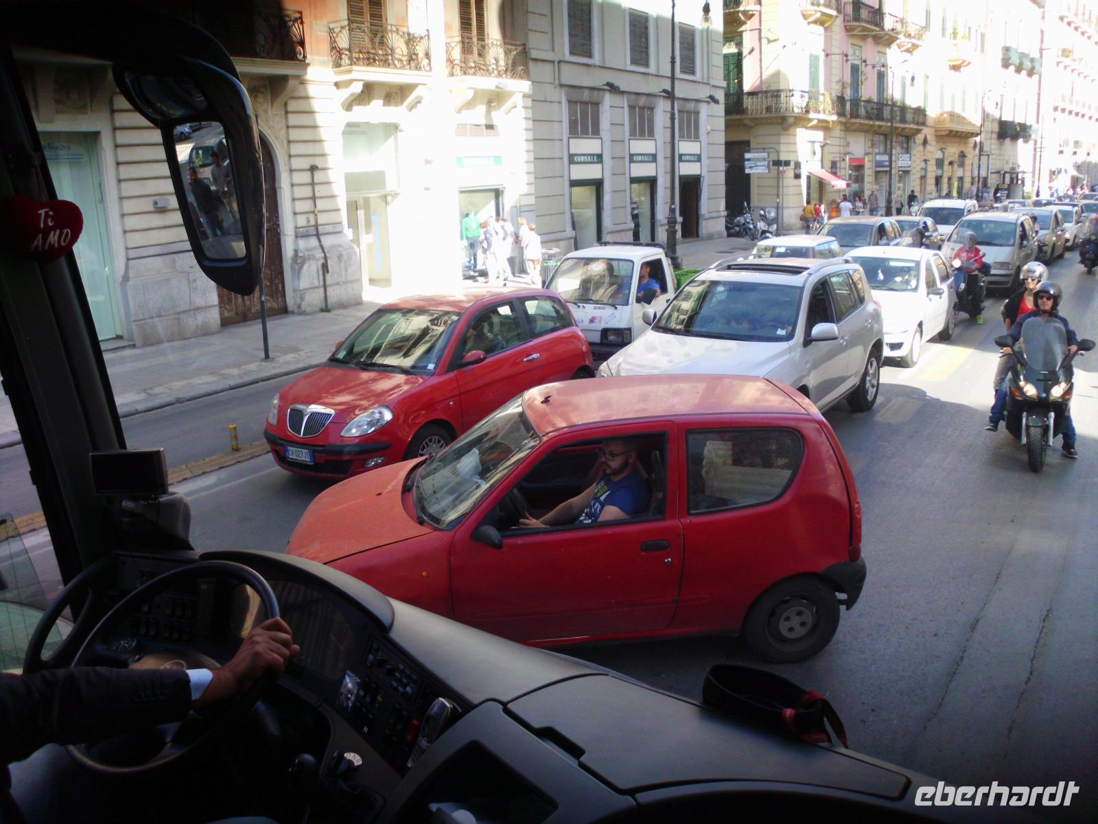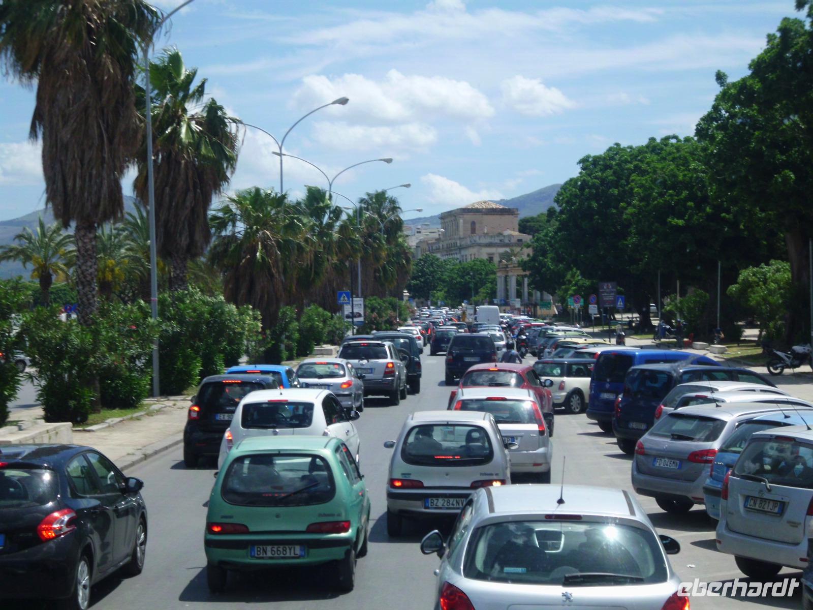 Es konnte auch nicht anders sein, alle Gäste haben sich für den Palermo Ausflug entschieden, die Hauptstadt Siziliens, die malerisch unterhalb des Monte Pelegrino liegt. Wir starten zeitig, dennoch sind Staus in dieser Metropole nicht zu vermeiden. Da braucht man starke Nerven, die Maurizio auch während der Stadtrundfahrt zeigt. Kreuz und quer wird gefahren, bis endlich einer nachgibt.