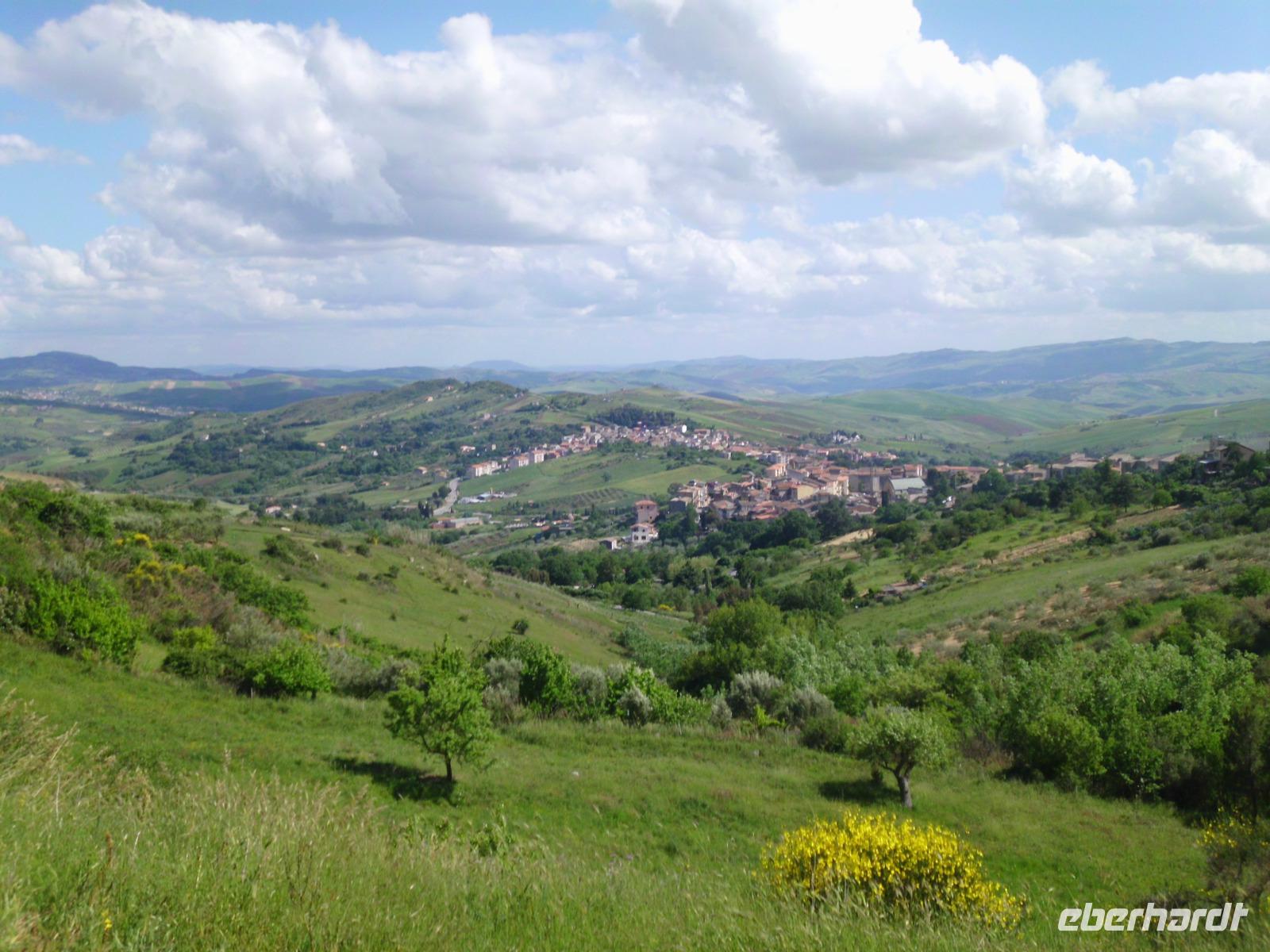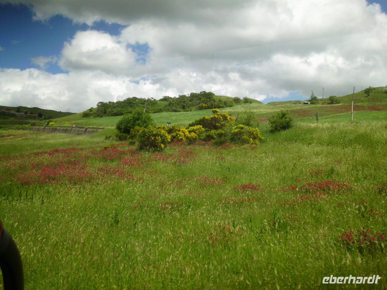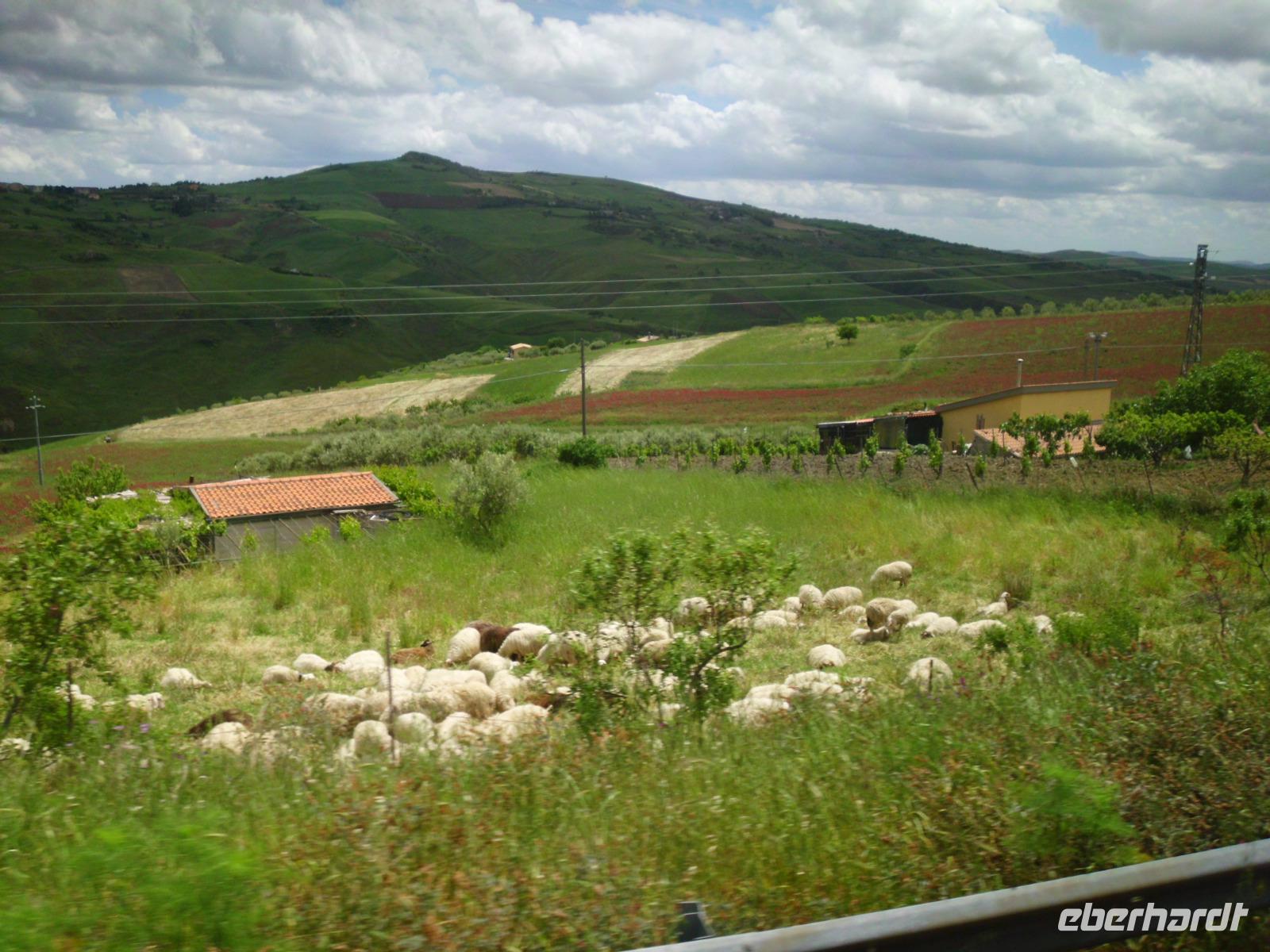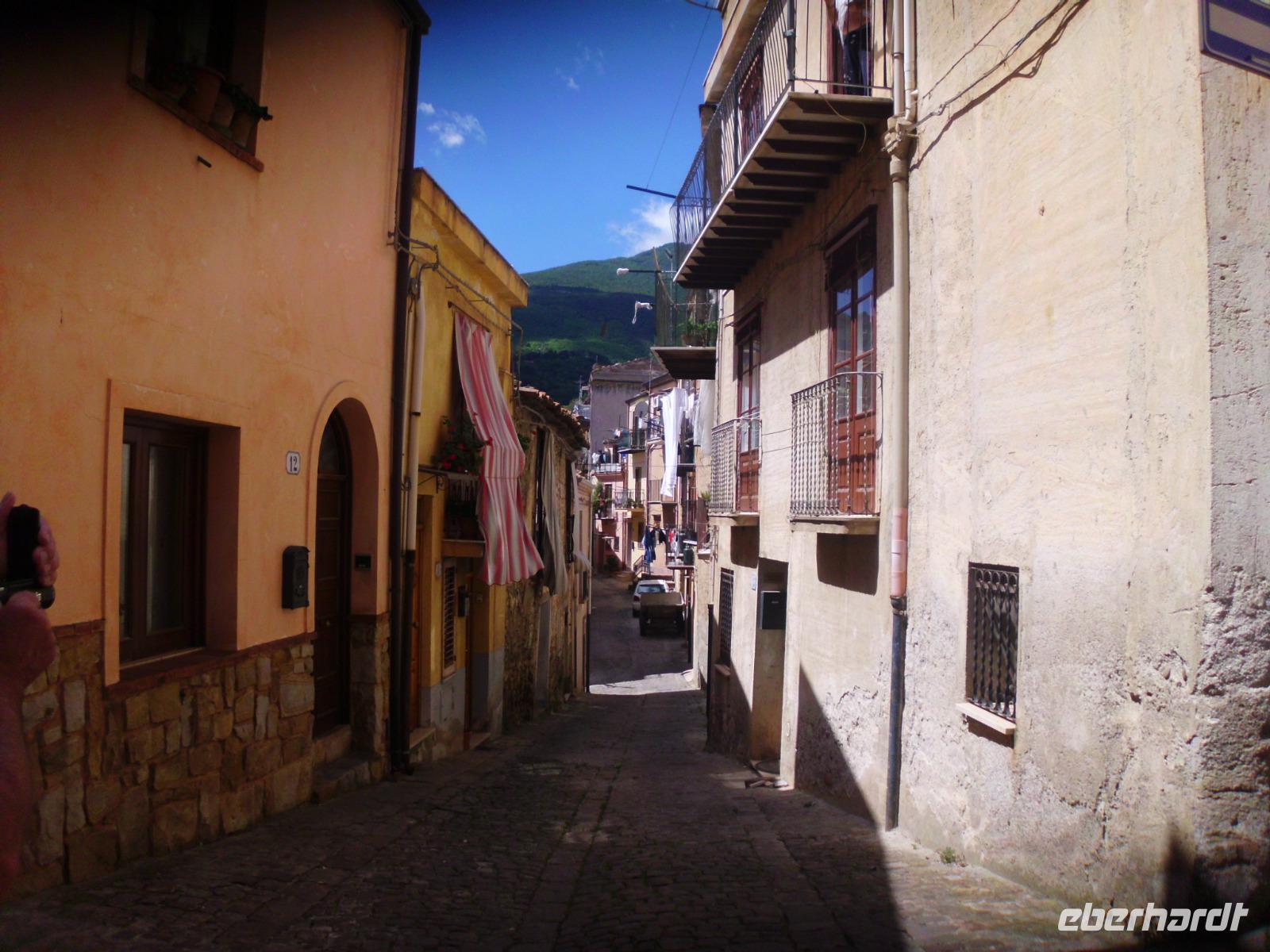 Nun geht es weiter ins Dorf nach Castelbouno, die Fahrt vorbei an herrlicher Landschaft des Madonie-Gebirges. Auf den Wiesen mischt sich Ginster mit rotem Klee, ein Farbschauspiel. Angekommen in Castelbouno kann Renate es kaum erwarten, uns die Müllabfuhr des Dorfes zu zeigen. Sie kommen im Doppelpack auf dem Eselchen Valentina und haben ihre Schicht gerade beendet. Das Dorf ist klein, aber lebt. Der beschauliche Marktplatz zieht alle an. In der Konditorei kosten wir wieder Spezialitäten und wählen einige als Mitbringsel aus.