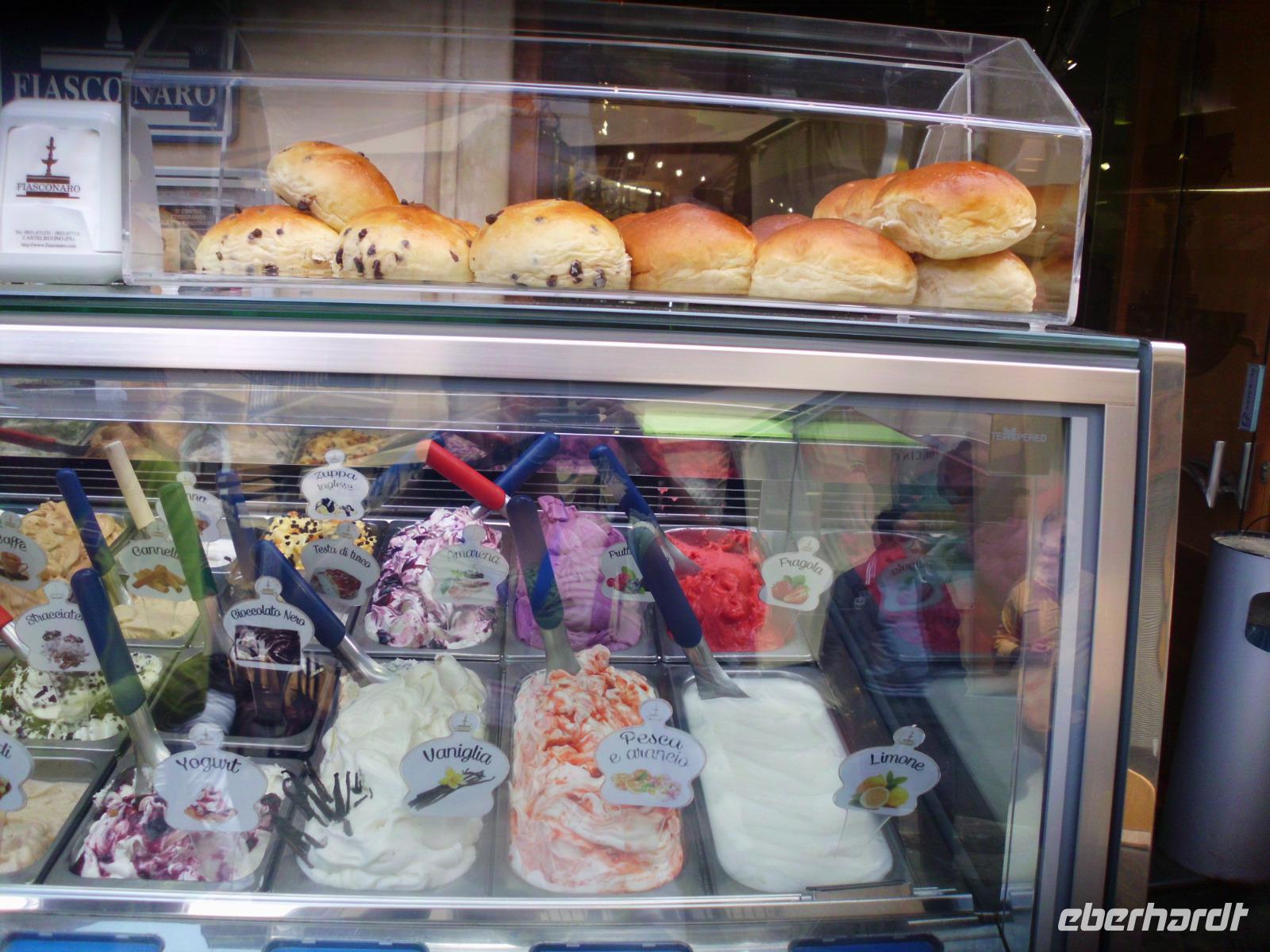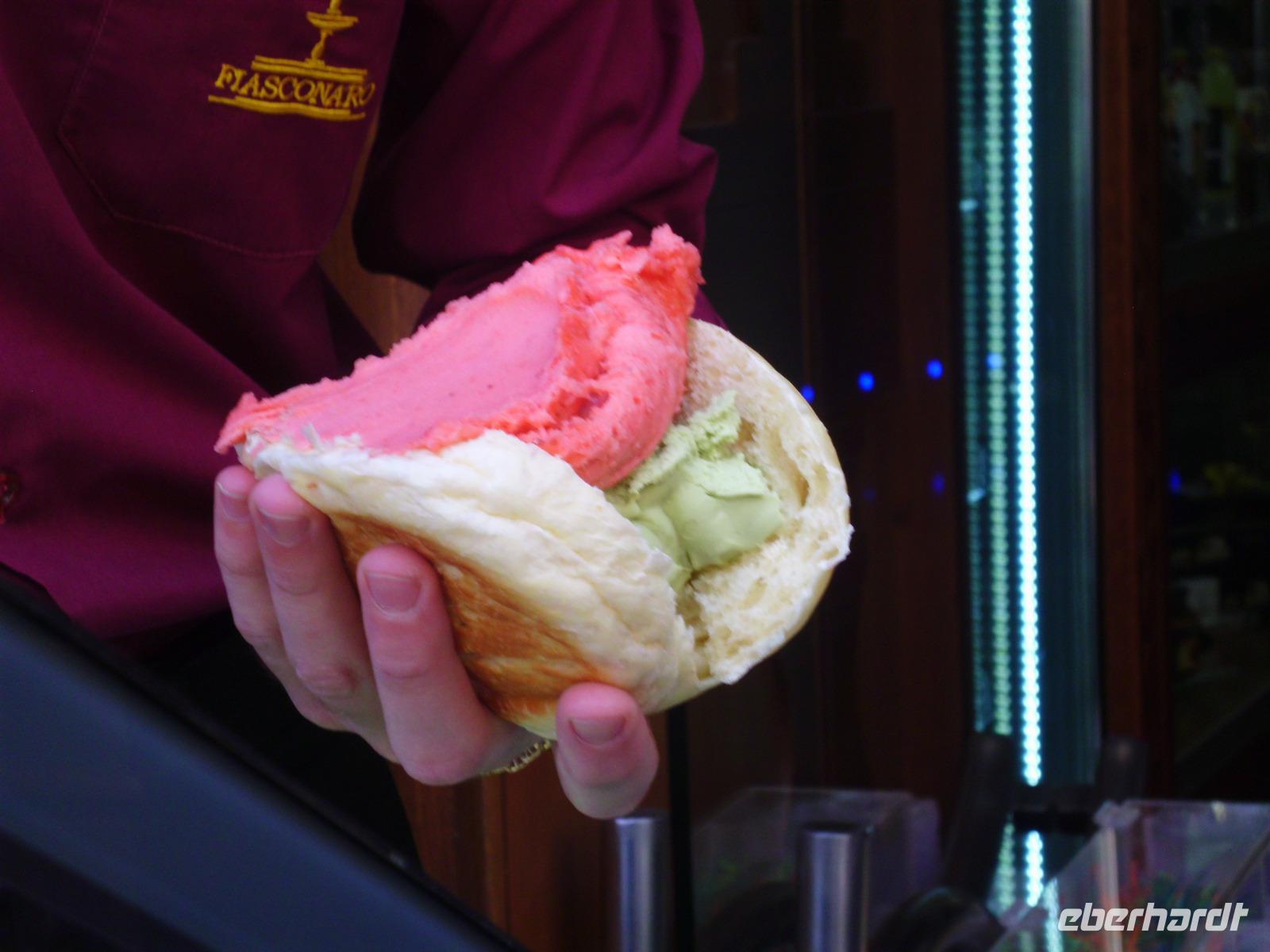 Endlich beziehen wir unser Hotel Antares in Letojanni und starten schon bald einen Spaziergang durch Letojanni. Es gibt ein erstes italienisches Eis, und viele schöne Eindrücke von dem kleinen Küstenort. Warum die Sizilianer allerdings ihr Eis ins Brötchen packen, haben wir nicht ergründet, aber drollig ist es schon und soll auch schmecken.