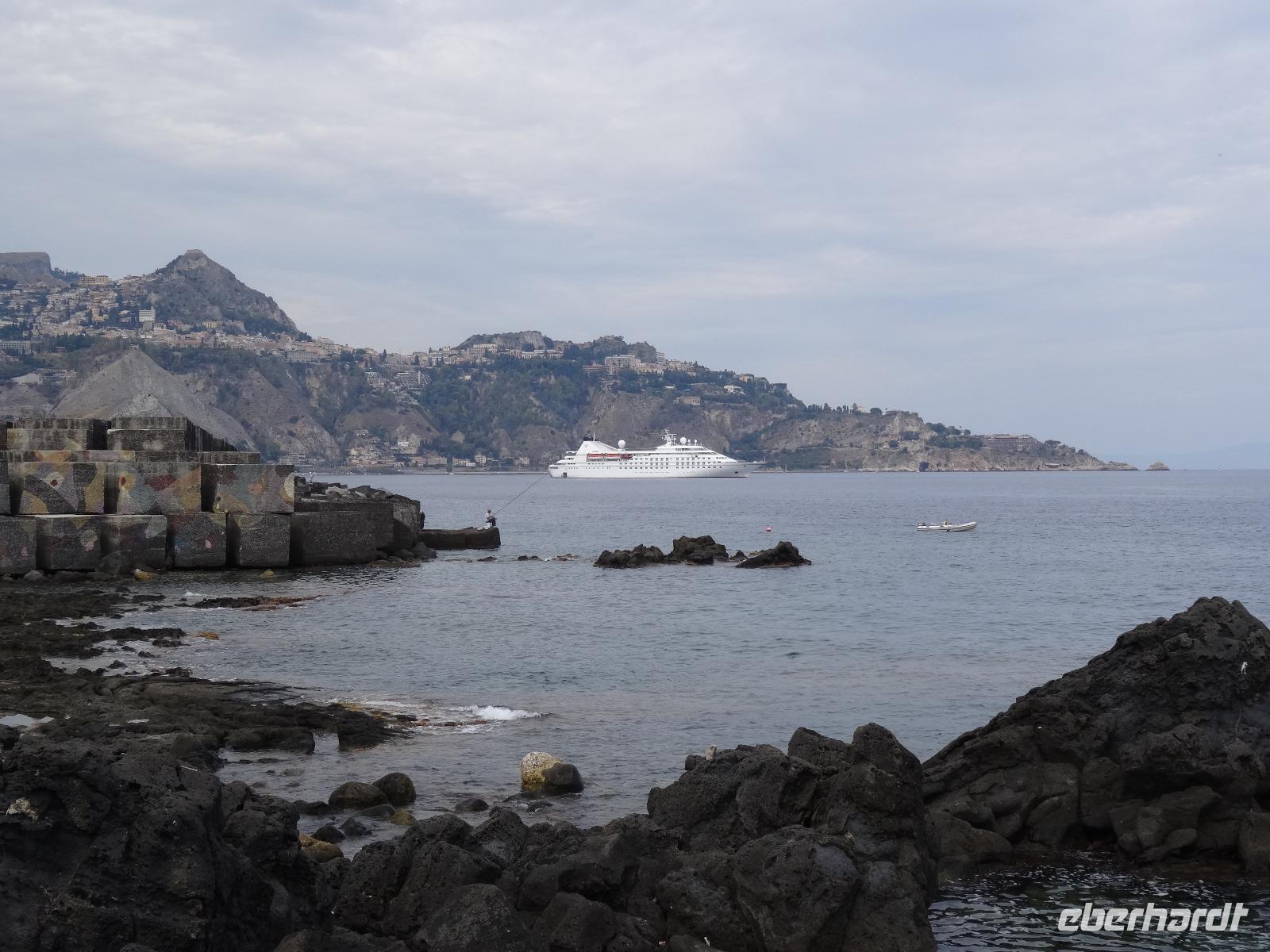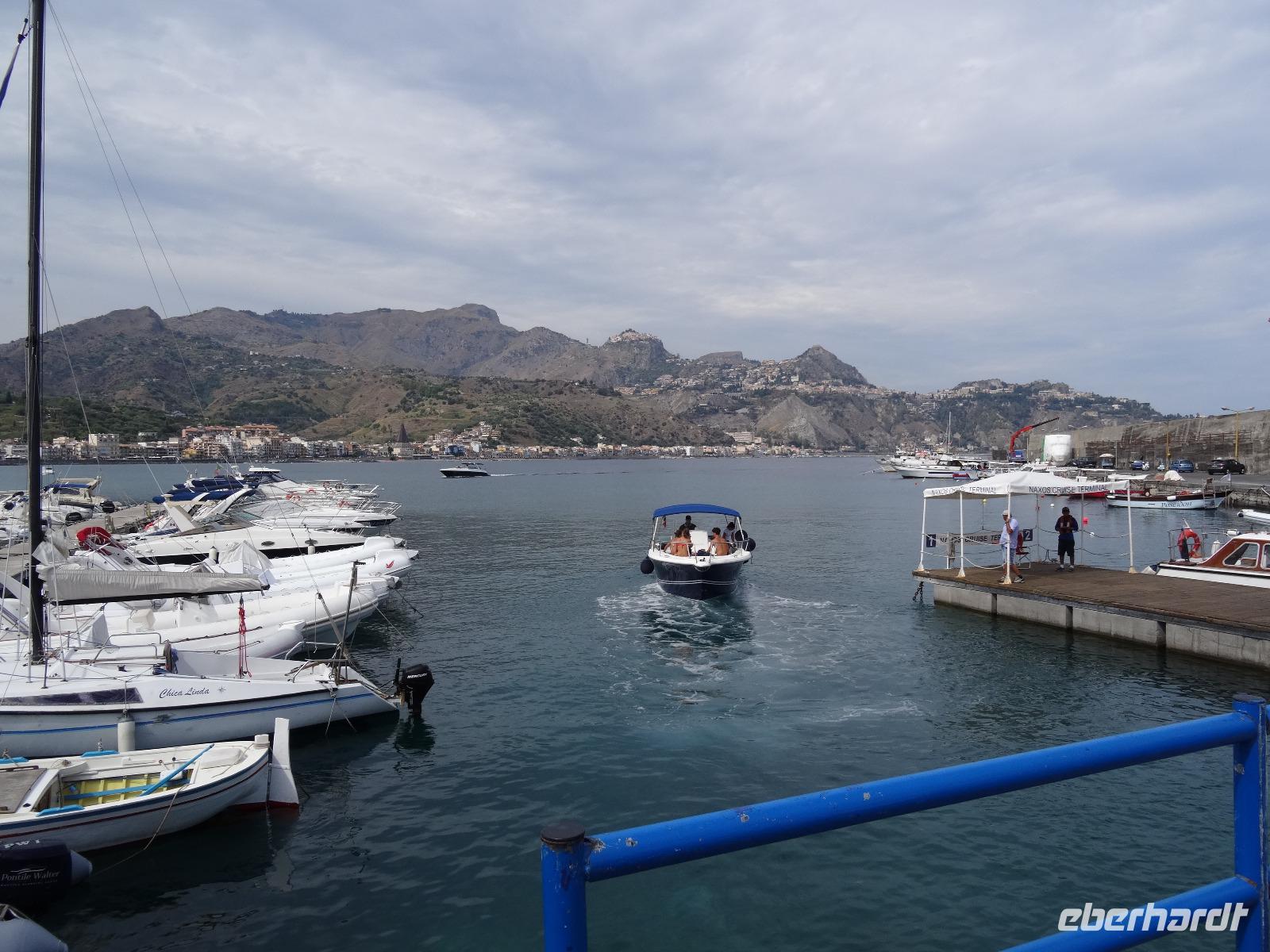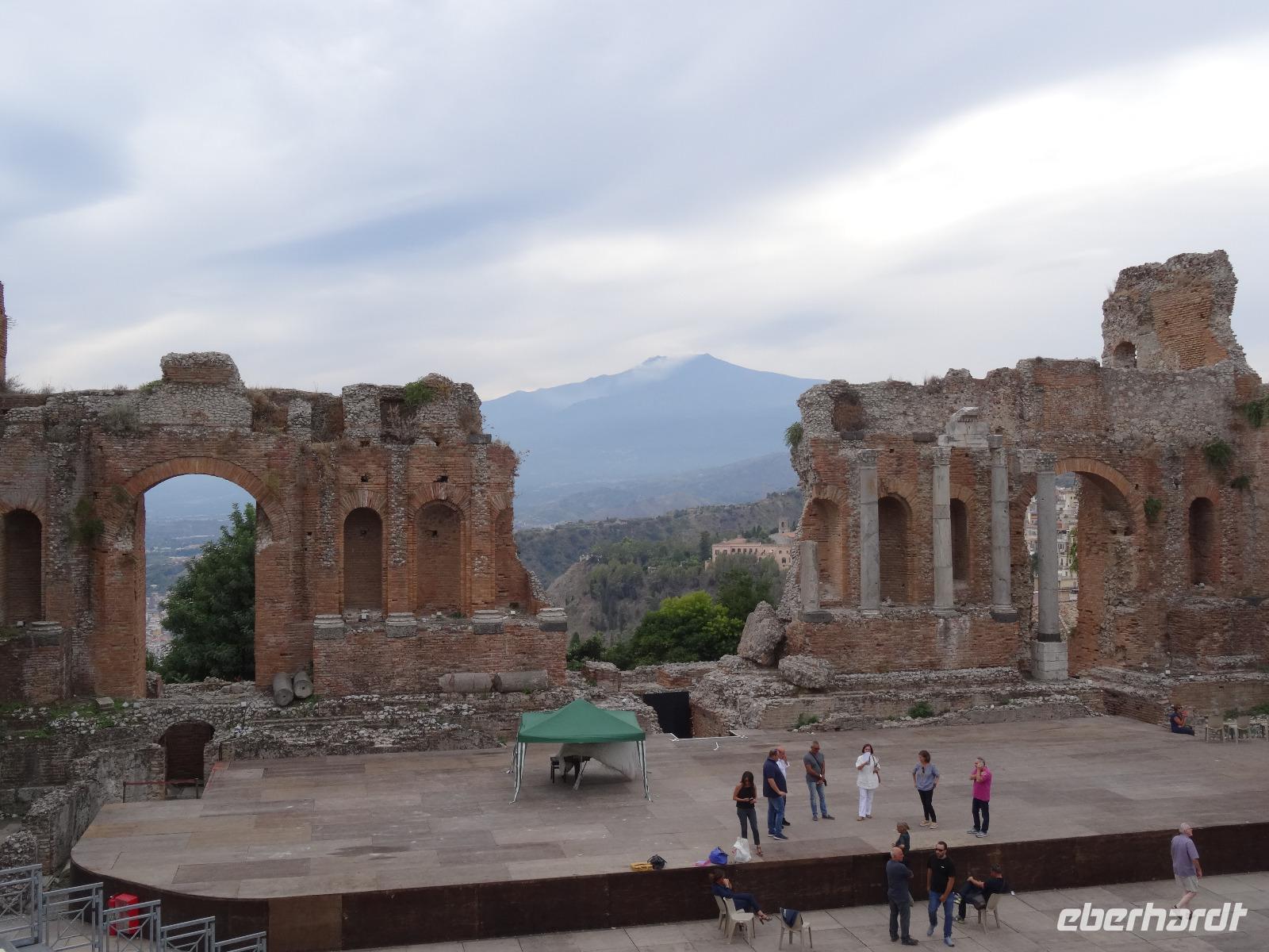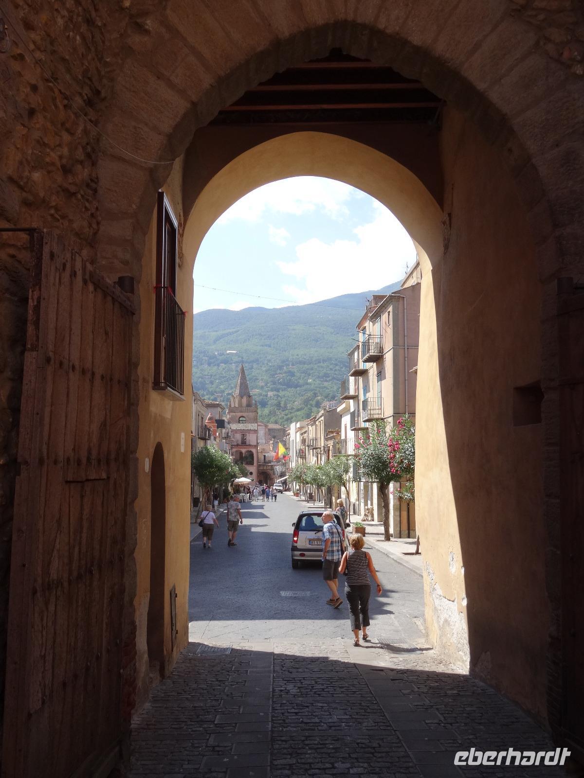 Wir fuhren anschließend weiter nach Giardini Naxos, wo wir unsere Mittagspause einlegten. Nachdem wir uns gestärkt hatten, ging es über die Küstenstraße später weiter nach Taormina, dem aus touristischer Sicht wohl wichtigsten und schönsten Städtchen auf Sizilien. Dabei passierten wir die zauberhafte Isola Bella, die schöne Insel, welche über eine kleine Sandbank mit dem "Festland" verbunden ist und mittlerweile unter Naturschutz steht. Unser Ziel war aber das antike Theater von Taormina, in seiner Größe nur dem Theater in Syrakus nachstehend. Im dritten Jahrhundert vor Christus errichtet und später weiter aus- und umgebaut, bot es neben Theateraufführungen später auch Gladiatorenkämpfe und Tierhatzen. Knapp 5500 Zuschauer konnten so in früherer Zeit "Brot und Spiele" genießen. Heute hat man von seinen Rängen einen traumhaften Blick auf den Ätna und die Küstenlinie des Golfs von Giardini Naxos. Auf unserem Rückweg in die Altstadt durchquerten wir den Giardino Pubblico, eine öffentliche Gartenanlage englischer Prägung, mit kleinen Tempeln und Skulpturen, welche von Bougainville und allerlei mediterranen Gewächsen gesäumt sind. Auf dem Corso Umberto, einer schönen Fußgängerzone, bummelten wir an den bunten Auslagen vorbei, genossen einen Café Latte oder Espresso und sahen dem Treiben der Besucher aus aller Welt zu. Über die Porta Messina, das nördliche Tor, verließen wir die Altstadt, bestiegen unseren Bus und begaben uns auf die kurze Rückfahrt zu unserem Hotel im nahegelegenen Letojanni.