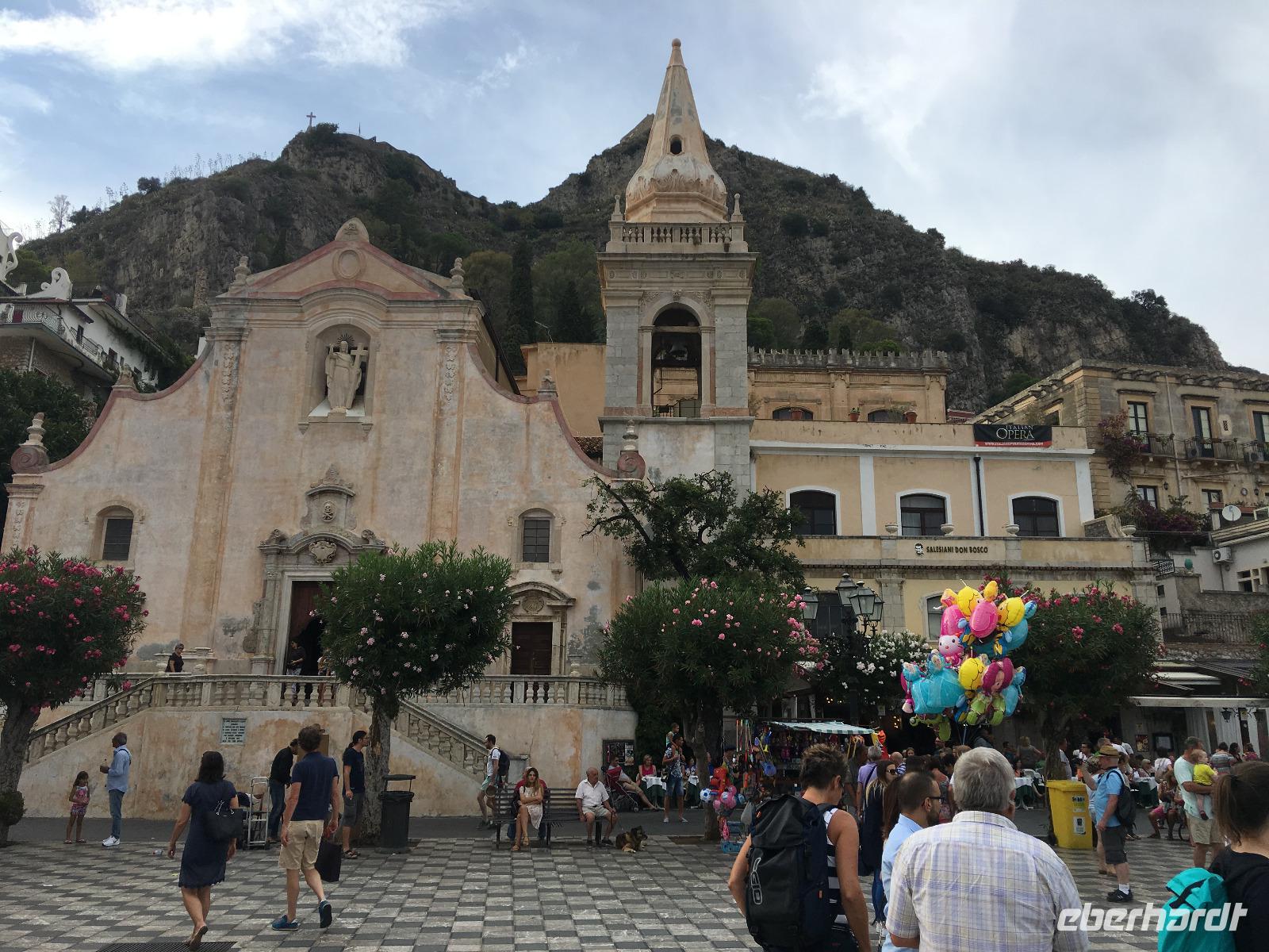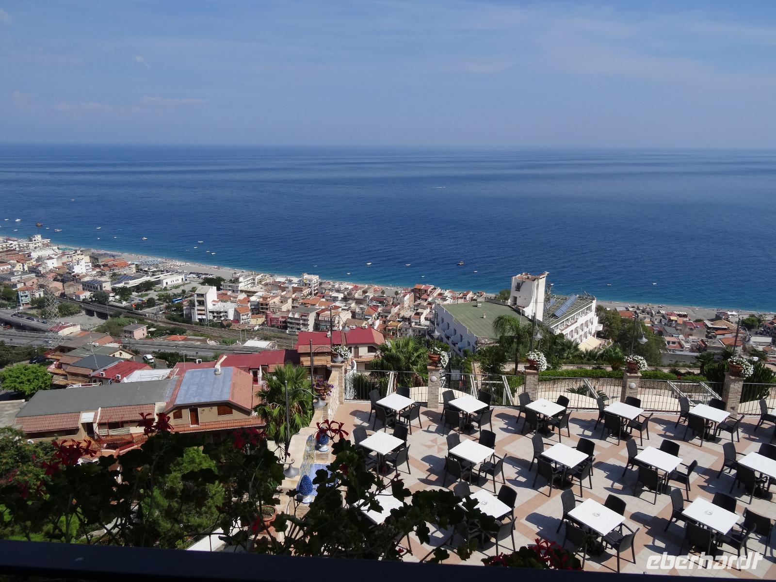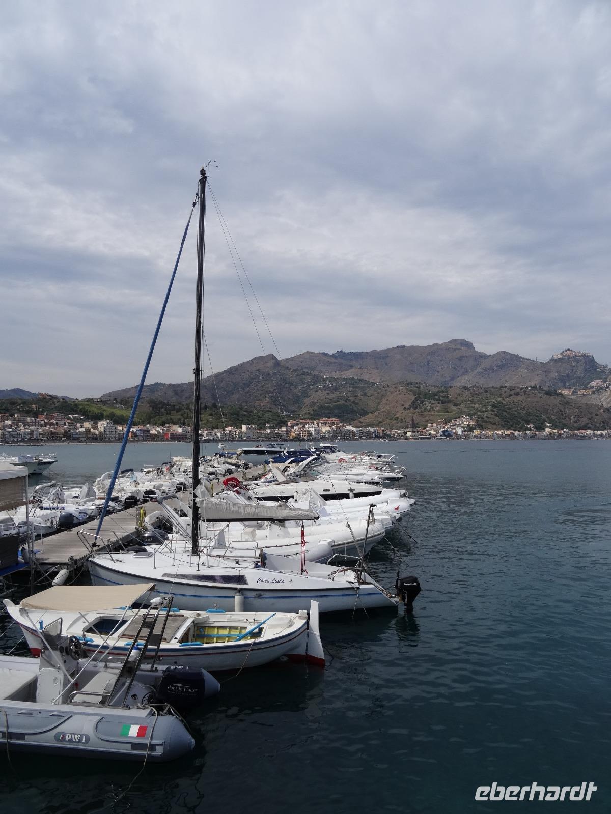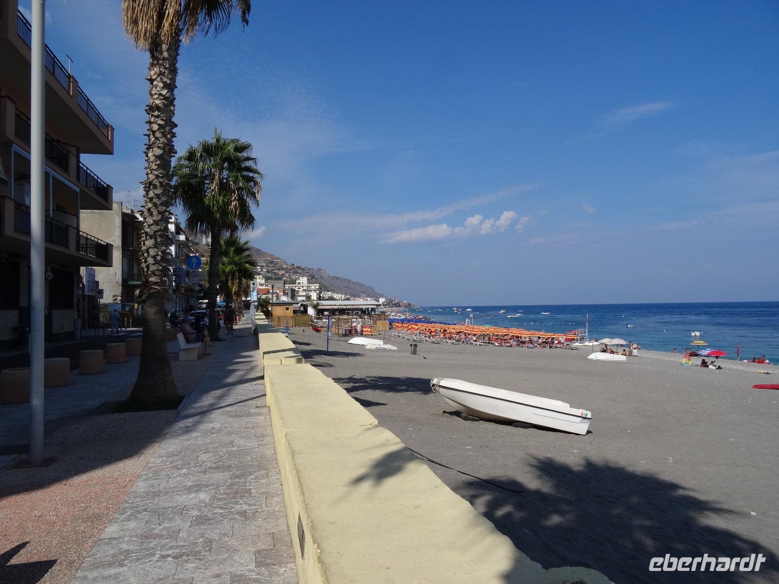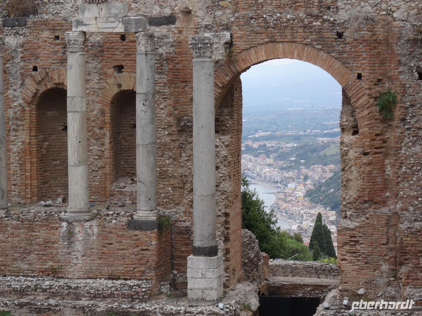 Wir fuhren anschließend weiter nach Giardini Naxos, wo wir unsere Mittagspause einlegten. Nachdem wir uns gestärkt hatten, ging es über die Küstenstraße später weiter nach Taormina, dem aus touristischer Sicht wohl wichtigsten und schönsten Städtchen auf Sizilien. Dabei passierten wir die zauberhafte Isola Bella, die schöne Insel, welche über eine kleine Sandbank mit dem "Festland" verbunden ist und mittlerweile unter Naturschutz steht. Unser Ziel war aber das antike Theater von Taormina, in seiner Größe nur dem Theater in Syrakus nachstehend. Im dritten Jahrhundert vor Christus errichtet und später weiter aus- und umgebaut, bot es neben Theateraufführungen später auch Gladiatorenkämpfe und Tierhatzen. Knapp 5500 Zuschauer konnten so in früherer Zeit "Brot und Spiele" genießen. Heute hat man von seinen Rängen einen traumhaften Blick auf den Ätna und die Küstenlinie des Golfs von Giardini Naxos. Auf unserem Rückweg in die Altstadt durchquerten wir den Giardino Pubblico, eine öffentliche Gartenanlage englischer Prägung, mit kleinen Tempeln und Skulpturen, welche von Bougainville und allerlei mediterranen Gewächsen gesäumt sind. Auf dem Corso Umberto, einer schönen Fußgängerzone, bummelten wir an den bunten Auslagen vorbei, genossen einen Café Latte oder Espresso und sahen dem Treiben der Besucher aus aller Welt zu. Über die Porta Messina, das nördliche Tor, verließen wir die Altstadt, bestiegen unseren Bus und begaben uns auf die kurze Rückfahrt zu unserem Hotel im nahegelegenen Letojanni.