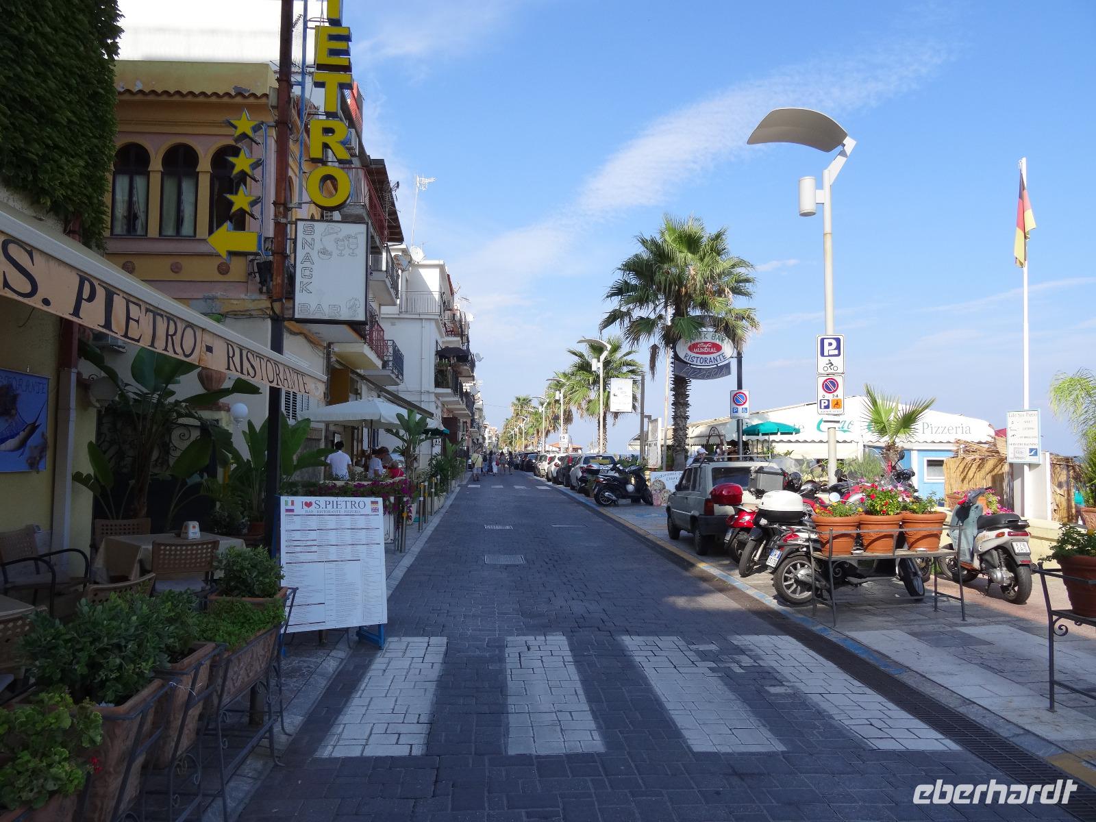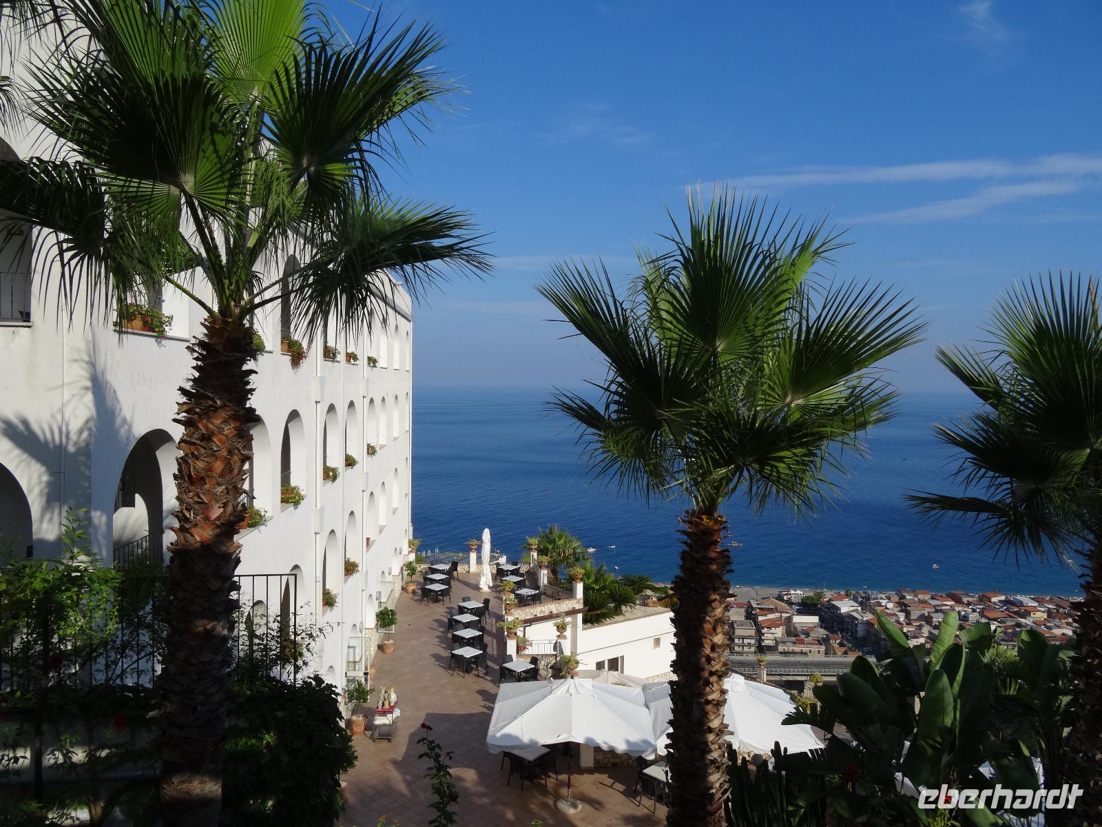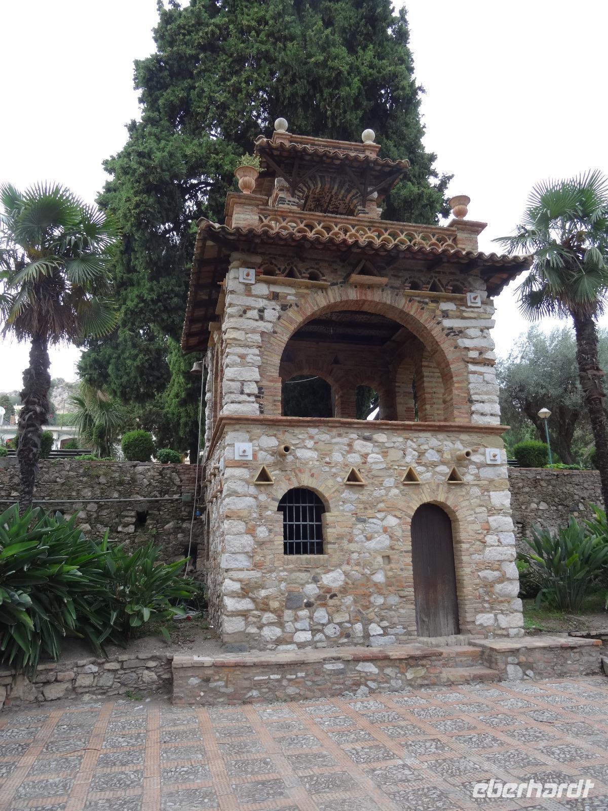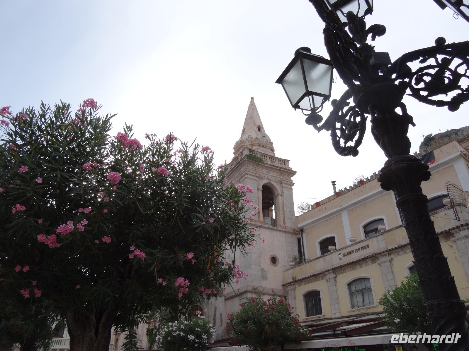 Wir fuhren anschließend weiter nach Giardini Naxos, wo wir unsere Mittagspause einlegten. Nachdem wir uns gestärkt hatten, ging es über die Küstenstraße später weiter nach Taormina, dem aus touristischer Sicht wohl wichtigsten und schönsten Städtchen auf Sizilien. Dabei passierten wir die zauberhafte Isola Bella, die schöne Insel, welche über eine kleine Sandbank mit dem "Festland" verbunden ist und mittlerweile unter Naturschutz steht. Unser Ziel war aber das antike Theater von Taormina, in seiner Größe nur dem Theater in Syrakus nachstehend. Im dritten Jahrhundert vor Christus errichtet und später weiter aus- und umgebaut, bot es neben Theateraufführungen später auch Gladiatorenkämpfe und Tierhatzen. Knapp 5500 Zuschauer konnten so in früherer Zeit "Brot und Spiele" genießen. Heute hat man von seinen Rängen einen traumhaften Blick auf den Ätna und die Küstenlinie des Golfs von Giardini Naxos. Auf unserem Rückweg in die Altstadt durchquerten wir den Giardino Pubblico, eine öffentliche Gartenanlage englischer Prägung, mit kleinen Tempeln und Skulpturen, welche von Bougainville und allerlei mediterranen Gewächsen gesäumt sind. Auf dem Corso Umberto, einer schönen Fußgängerzone, bummelten wir an den bunten Auslagen vorbei, genossen einen Café Latte oder Espresso und sahen dem Treiben der Besucher aus aller Welt zu. Über die Porta Messina, das nördliche Tor, verließen wir die Altstadt, bestiegen unseren Bus und begaben uns auf die kurze Rückfahrt zu unserem Hotel im nahegelegenen Letojanni.