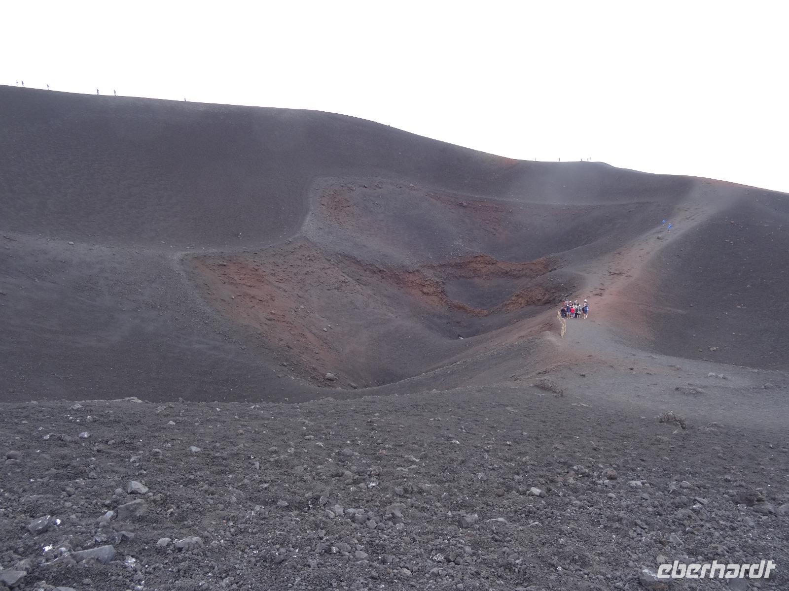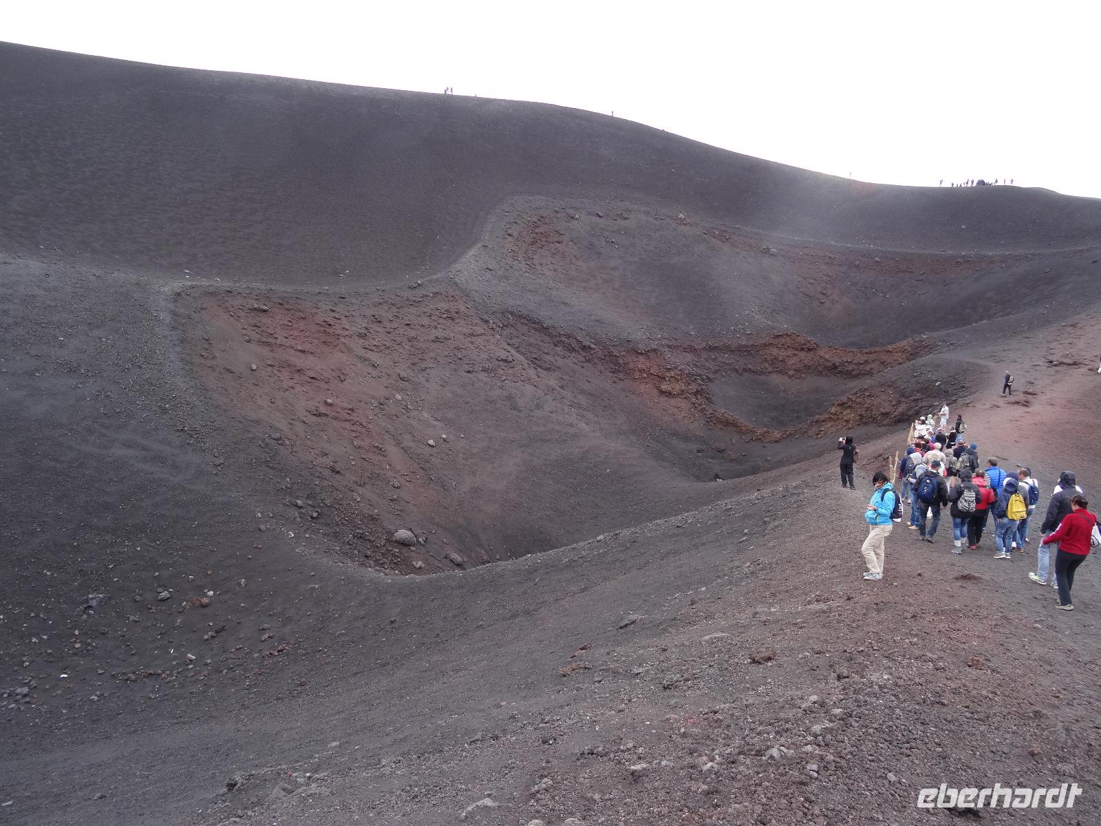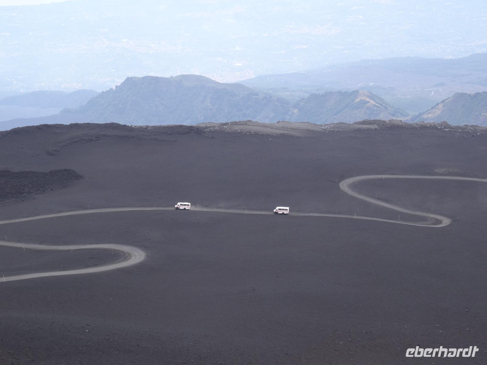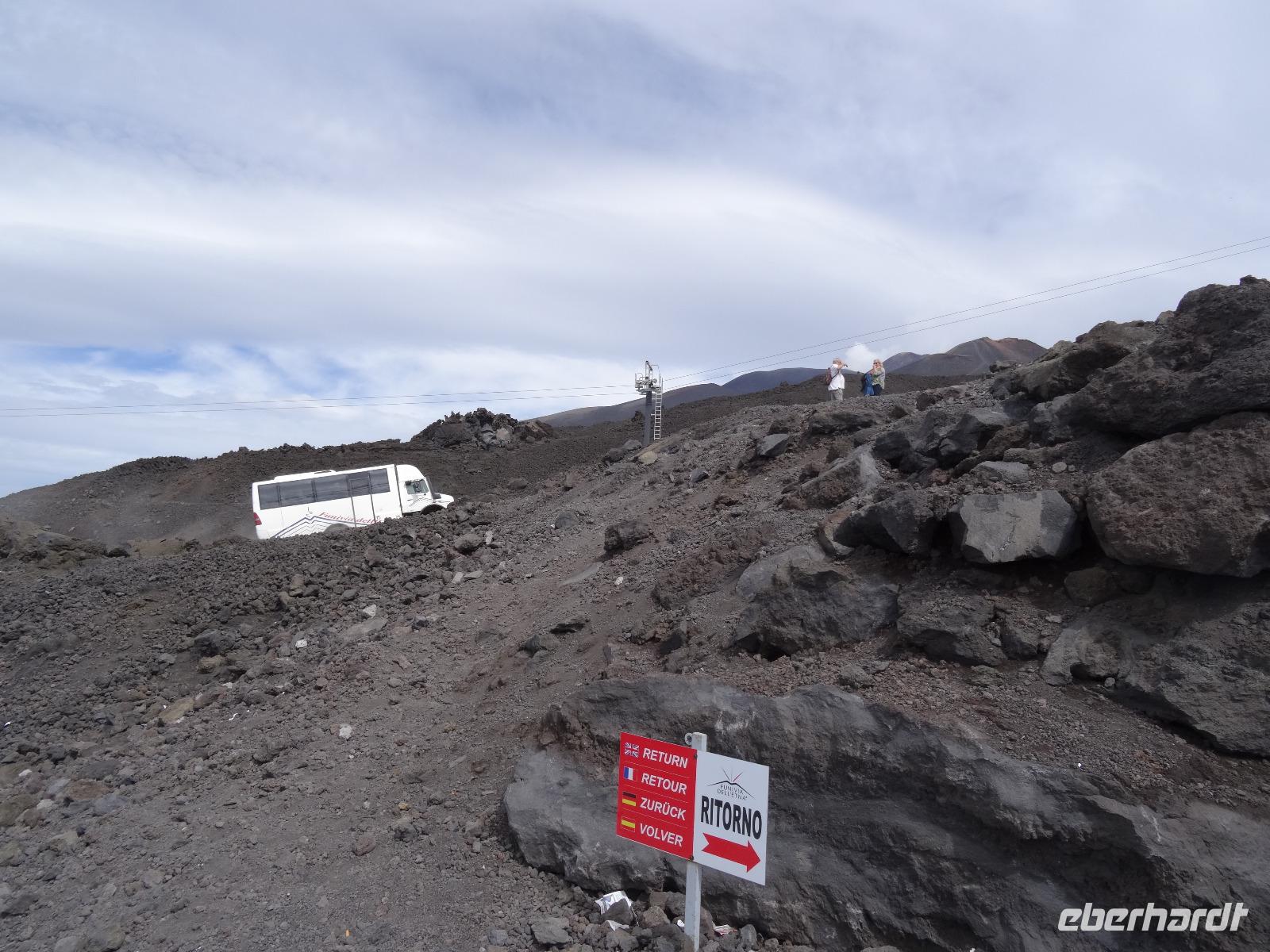 Der zweite Tag auf Sizilien hielt gleich zwei Highlights bereit, welche in keinem Besuchsprogramm fehlen sollten. Insofern waren wir sehr froh, dass das Wetter mitspielte und uns einen sonnigen Tag mit möglicherweise klarer Sicht verhieß. Denn unser erster Stopp sollte heute am Ätna erfolgen, den alles beherrschenden Berg an der Ostküste der Insel, dessen vulkanische Aktivitäten immer wieder zu mehr oder minder großen Zerstörungen und Tragödien geführt haben, andererseits den hier siedelnden Menschen fruchtbare Böden für die landwirtschaftliche Nutzung "bereitstellte". In unterschiedlichen Höhenlagen wachsen hier Oliven-, Zitronen- und Feigenbäume, an der dem Landesinneren zugewandten Seite bei dem kleinen Städtchen Pronte gedeihen die angeblich besten Pistazien Europas und in den höheren Lagen sieht man Esskastanien und den weit verbreiteten Ginster. Nach der Durchquerung des Ortes Zafferana Etnae, der Stadt des Honigs gelangen wir über eine Serpentinenstraße auf knapp 2000 Meter Höhe. Hier verlassen wir unseren Bus und steigen in eine Seilbahn um, die uns in weniger als 15 Minuten auf 2500 Meter Höhe bringt. Die Landschaft wird karger und beim Ausstieg an der oberen Bahnstation empfangen uns kühle Temperaturen. Man kann von hier aus den Gipfel zu Fuß erklimmen oder in geländegängige Midibusse umsteigen, die den geneigten Bergenthusiasten auf 2900 Meter Höhe bringen. Hier befindet man sich knapp 400 Meter unterhalb des Gipfels und ein weiteres Hinaufsteigen ist nur noch mit professionellen Guides möglich. Wir benutzen einen Rundweg, der uns weitere fünfzig Meter der Spitze entgegenbringt, lauschen den Ausführungen unseres Bergführers und trotzen dabei dem kalten und überaus starken Wind. Wir werden mit einem herrlichen Blick, der weit in das umliegende Land reicht, belohnt. Dabei sind wir uns stets bewusst, dass wir gerade auf einem der aktivsten Vulkane Europas stehen, welcher jedes Jahr mit vulkanischen Aktivitäten von sich reden macht. Doch bei unserem "Besuch" blieb alles ruhig und keinerlei Magma drängte durch die Ritzen und Spalten des Gesteins an die Oberfläche. Trotzdem war es für alle ein beeindruckendes Erlebnis, welches sicherlich noch lange in Erinnerung bleiben wird.