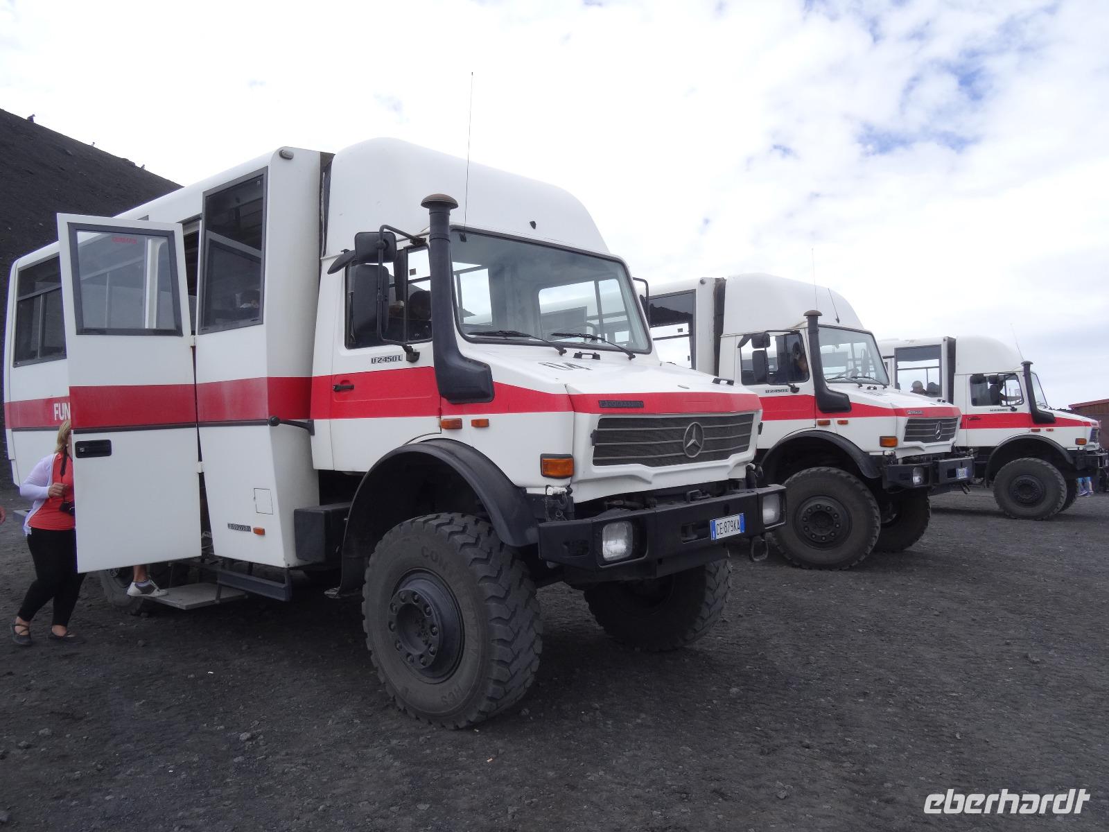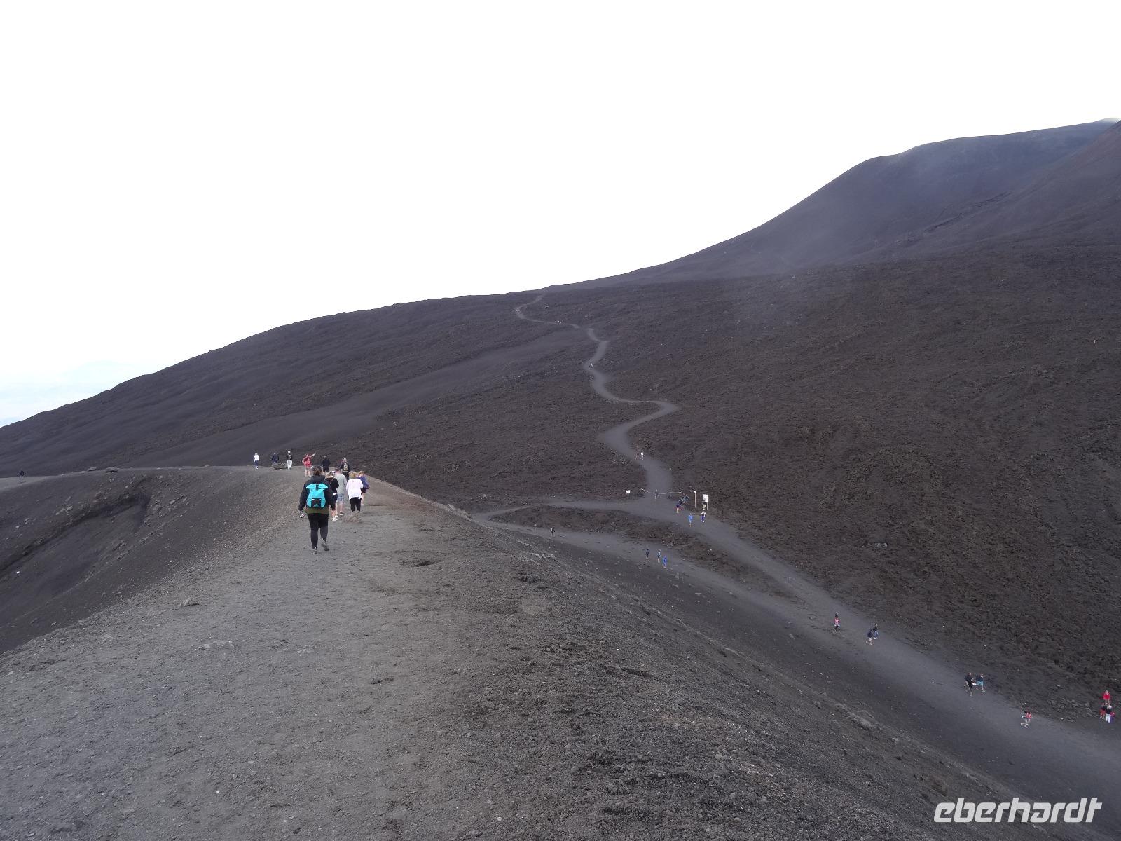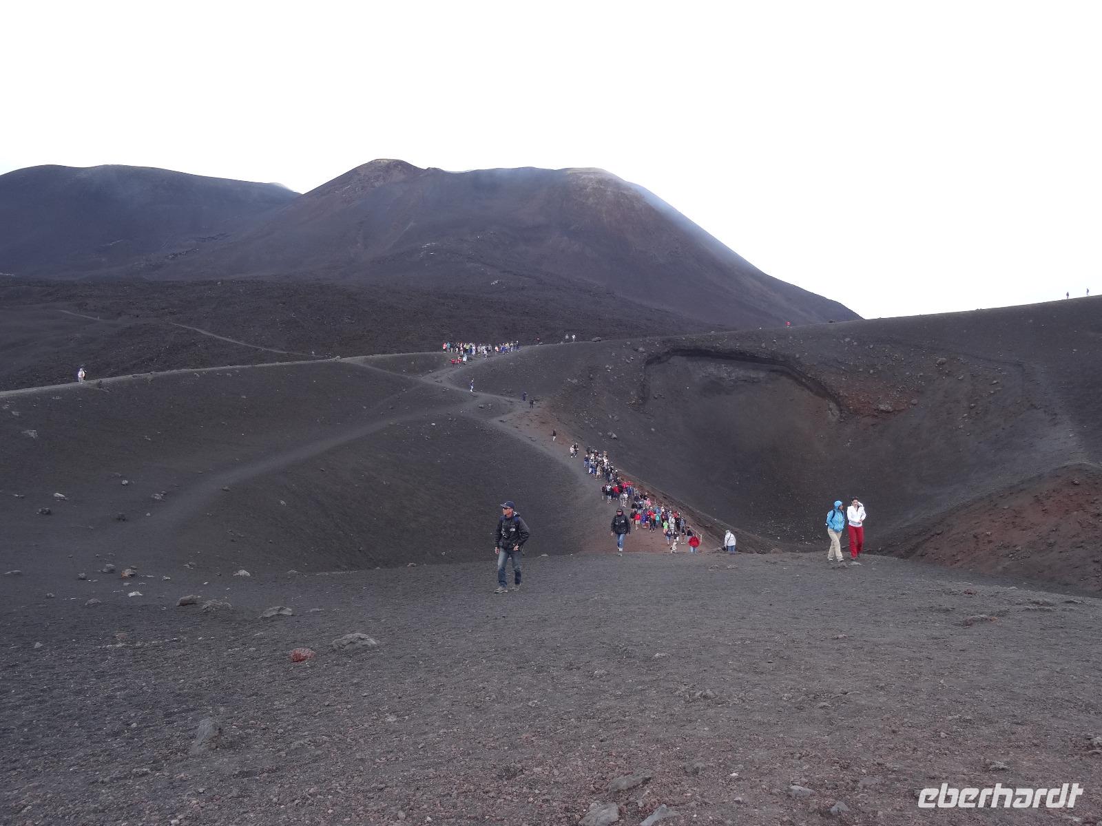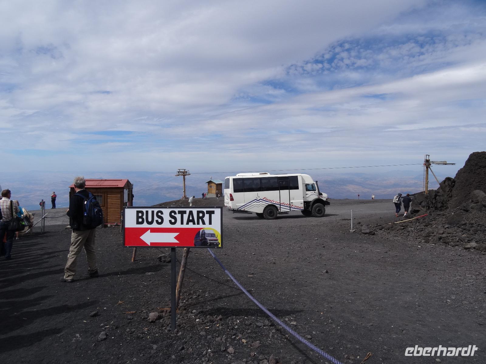 Der zweite Tag auf Sizilien hielt gleich zwei Highlights bereit, welche in keinem Besuchsprogramm fehlen sollten. Insofern waren wir sehr froh, dass das Wetter mitspielte und uns einen sonnigen Tag mit möglicherweise klarer Sicht verhieß. Denn unser erster Stopp sollte heute am Ätna erfolgen, den alles beherrschenden Berg an der Ostküste der Insel, dessen vulkanische Aktivitäten immer wieder zu mehr oder minder großen Zerstörungen und Tragödien geführt haben, andererseits den hier siedelnden Menschen fruchtbare Böden für die landwirtschaftliche Nutzung "bereitstellte". In unterschiedlichen Höhenlagen wachsen hier Oliven-, Zitronen- und Feigenbäume, an der dem Landesinneren zugewandten Seite bei dem kleinen Städtchen Pronte gedeihen die angeblich besten Pistazien Europas und in den höheren Lagen sieht man Esskastanien und den weit verbreiteten Ginster. Nach der Durchquerung des Ortes Zafferana Etnae, der Stadt des Honigs gelangen wir über eine Serpentinenstraße auf knapp 2000 Meter Höhe. Hier verlassen wir unseren Bus und steigen in eine Seilbahn um, die uns in weniger als 15 Minuten auf 2500 Meter Höhe bringt. Die Landschaft wird karger und beim Ausstieg an der oberen Bahnstation empfangen uns kühle Temperaturen. Man kann von hier aus den Gipfel zu Fuß erklimmen oder in geländegängige Midibusse umsteigen, die den geneigten Bergenthusiasten auf 2900 Meter Höhe bringen. Hier befindet man sich knapp 400 Meter unterhalb des Gipfels und ein weiteres Hinaufsteigen ist nur noch mit professionellen Guides möglich. Wir benutzen einen Rundweg, der uns weitere fünfzig Meter der Spitze entgegenbringt, lauschen den Ausführungen unseres Bergführers und trotzen dabei dem kalten und überaus starken Wind. Wir werden mit einem herrlichen Blick, der weit in das umliegende Land reicht, belohnt. Dabei sind wir uns stets bewusst, dass wir gerade auf einem der aktivsten Vulkane Europas stehen, welcher jedes Jahr mit vulkanischen Aktivitäten von sich reden macht. Doch bei unserem "Besuch" blieb alles ruhig und keinerlei Magma drängte durch die Ritzen und Spalten des Gesteins an die Oberfläche. Trotzdem war es für alle ein beeindruckendes Erlebnis, welches sicherlich noch lange in Erinnerung bleiben wird.
