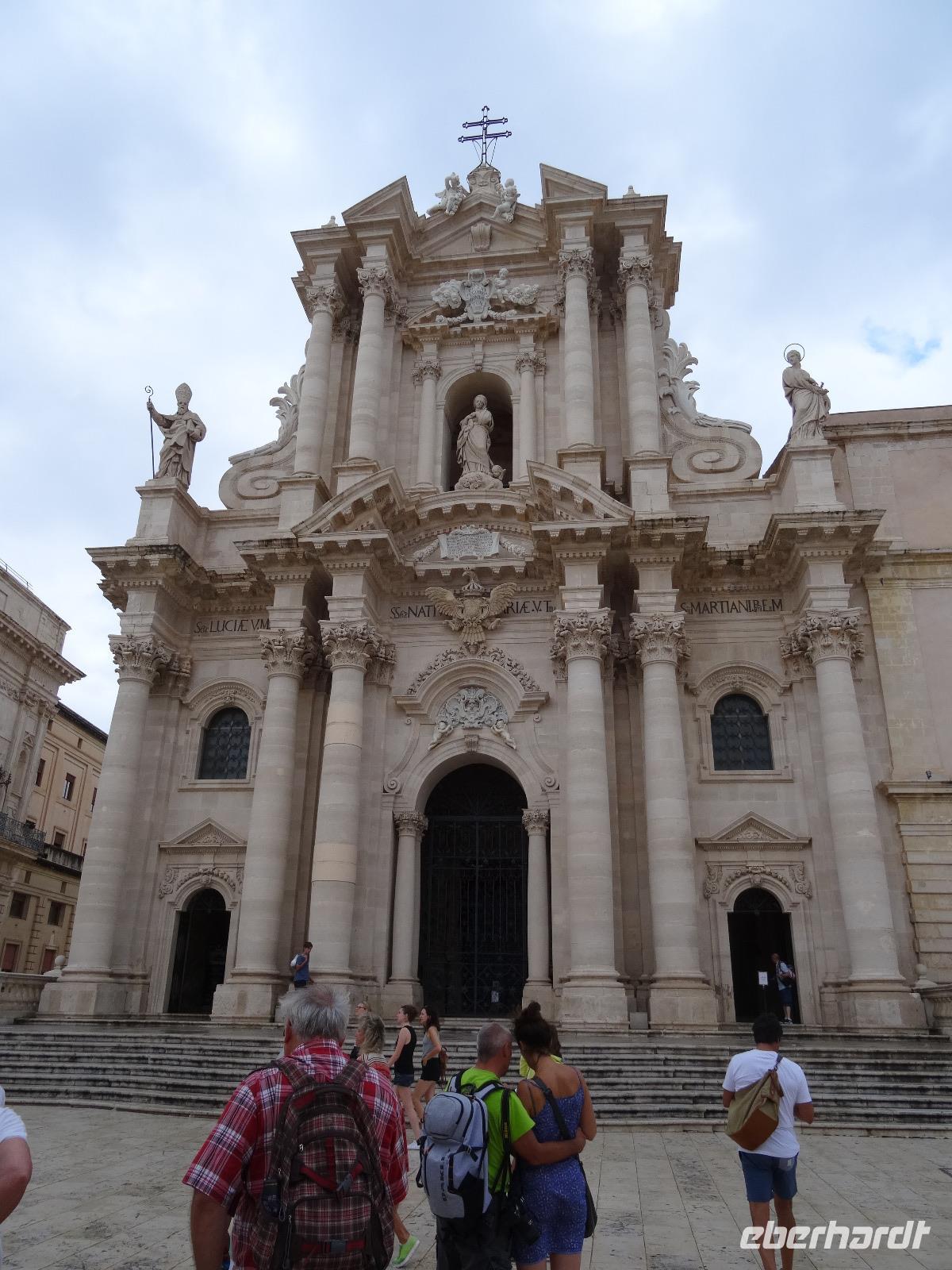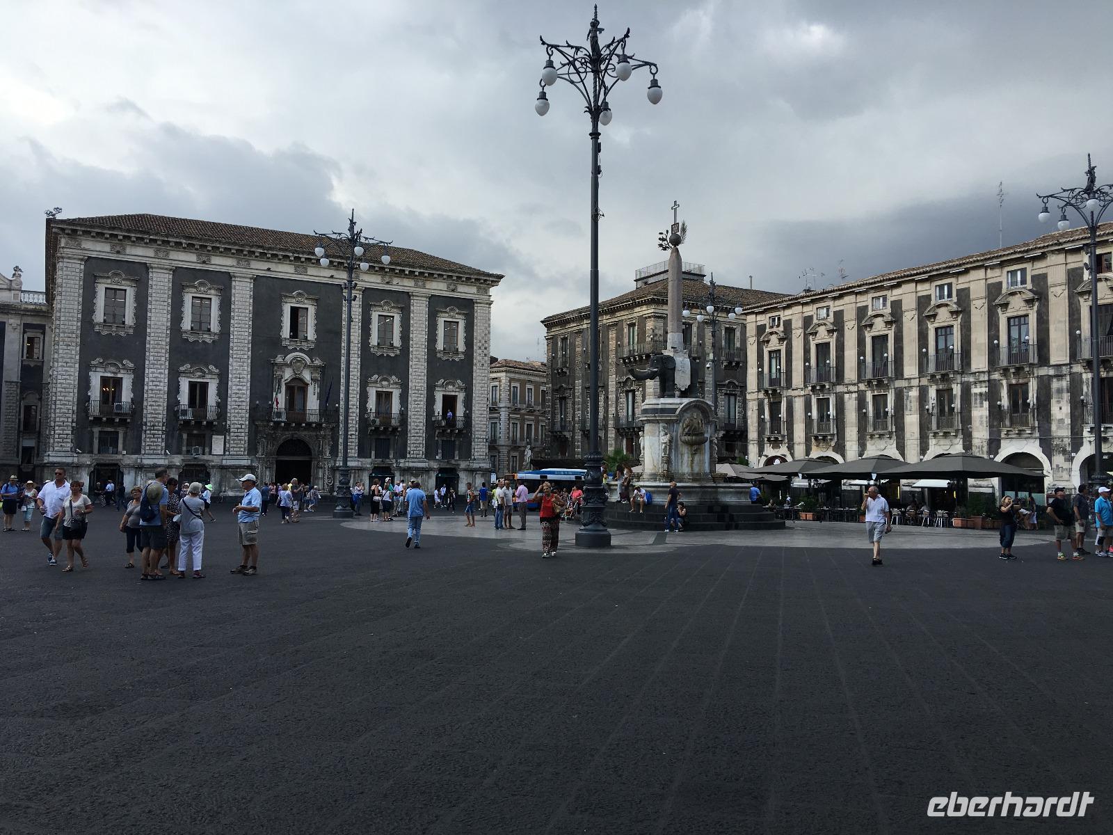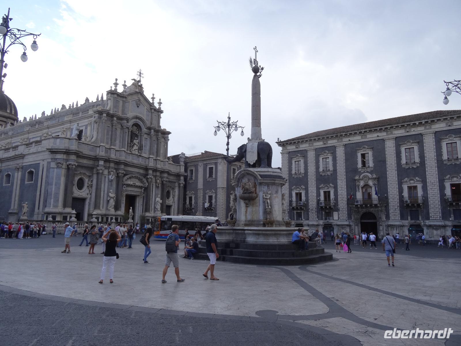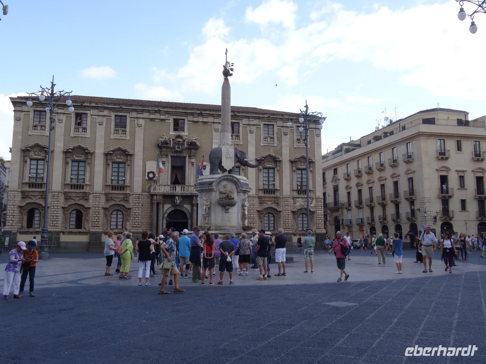 Heute bewegten wir uns entlang der Ostküste und besichtigten als erstes die Hafenstadt Catania, die zum UNESCO-Welterbe gehört. Griechen, Römer und Araber prägten die wechselvolle Geschichte der Stadt, die darüber hinaus durch die Ausbrüche des nahen Ätna und durch Erdbeben im ausgehenden Mittelalter fast vollständig zerstört wurde. Wir verließen unseren Bus bei schönstem Sonnenschein an der Piazza Alcala, um von hier aus zur Piazza del Duomo zu spazieren. Dieser zentrale Platz im Herzen der Altstadt wird vom Rathaus und der Kathedrale flankiert. In seinem Zentrum erblickt man das Wahrzeichen Catanias, den Elefantenbrunnen von Vaccarini. Bevor wir die Kathedrale der Heiligen Agatha betraten, erfuhren wir von unserer Reiseleiterin Christiane viel Wissenswertes zur Entstehungsgeschichte der Stadt. Die Kathedrale beherbergt zudem die Grabstätte von Vincenzo Bellini, dessen Kompositionen einem breiten Publikum bekannt sind. Anschließend bummelten wir über den bekannten Fischmarkt von Catania, welcher hauptsächlich von Männern besucht wird, da Fischkauf auf Sizilien seit jeher Männersache ist. Abschließend lauschten wir dem Akkordeon-Spieler auf der Piazza del Duomo, bevor wir in südlicher Richtung zur alten griechischen Stadt Syrakus weiterfuhren.