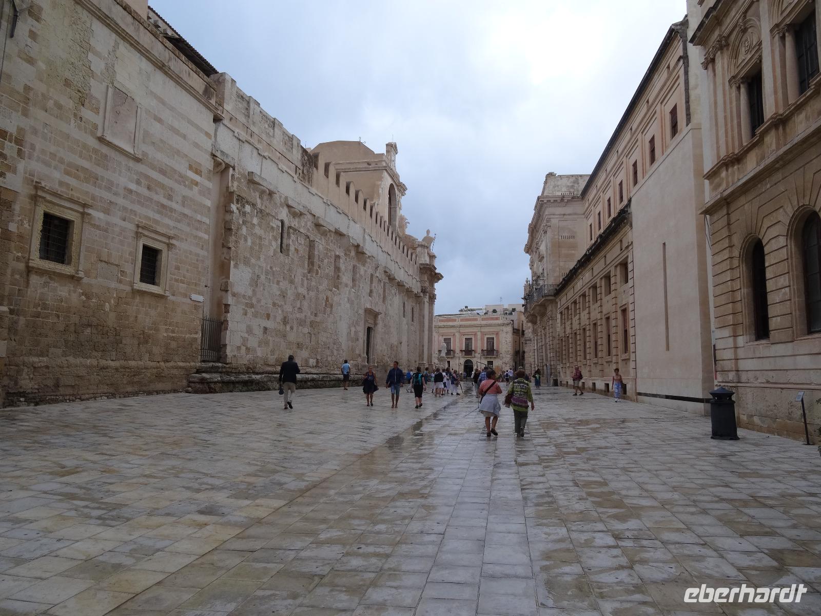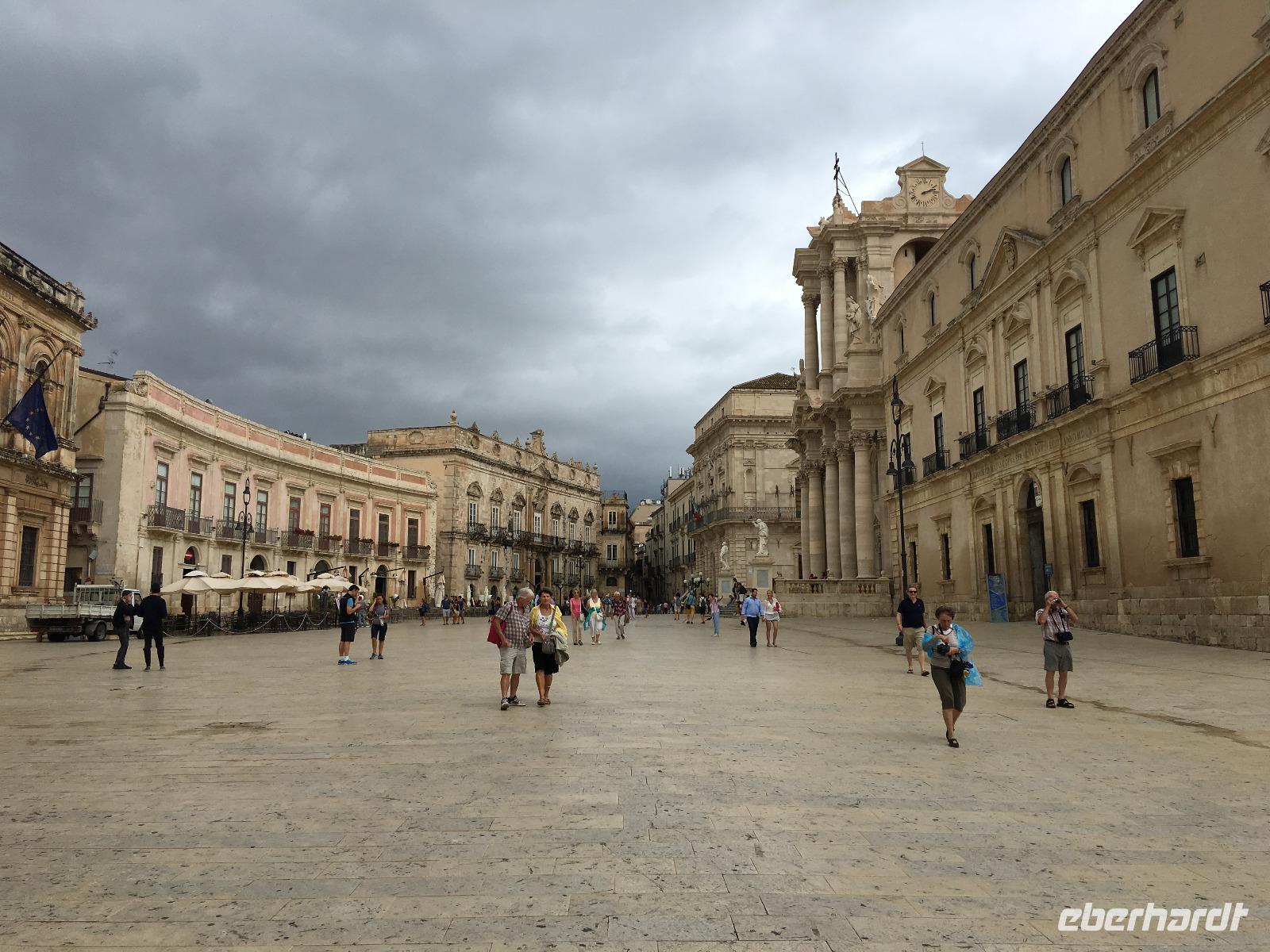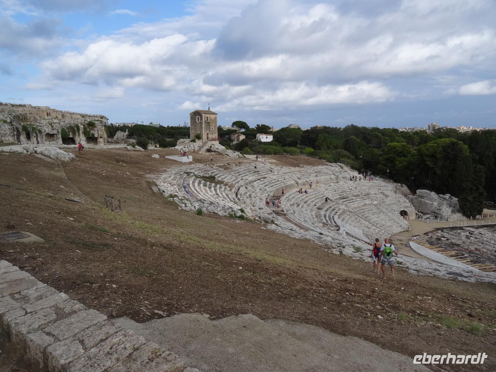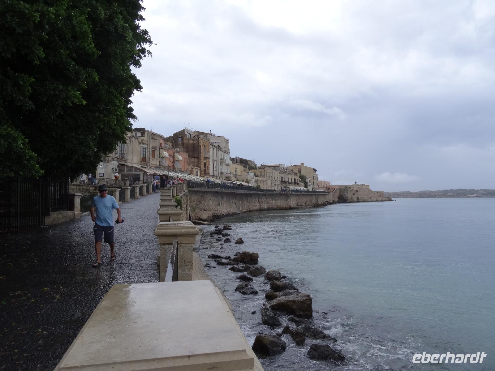 Sie war über viele Jahrhunderte die größte Stadt Siziliens und wurde Aufgrund ihrer einzigartigen geschichtlichen Bedeutung und der noch vorhandenen Bauwerke zum Weltkulturerbe erklärt. Leider war das dem Wetterverantwortlichen relativ egal, denn als wir in Syrakus ankamen und mit der Stadtbesichtigung beginnen wollten, öffneten sich die himmlischen Schleusen und ein Wolkenbruch ging auf uns hernieder. So mussten wir notgedrungen eine Stunde in einer kleinen Cafeteria ausharren, bevor wir mit unserem Besichtigungsprogramm beginnen konnten. Wir begaben uns zur Insel Ortigia, dem Altstadtkern und besichtigten die Reste des Apollon Tempels aus dem sechsten Jahrhundert vor Christi, die Piazza Archimedes, die dem großen Mathematiker und Sohn der Stadt gewidmet ist, sowie den Dom an der Piazza Minerva. War uns das Wetter zwischenzeitlich gewogen, stürzte beim verlassen des Doms ein erneutes Unwetter über uns herein, welches wir Eisessend in einer nahen Gelateria "aussaßen". Auf dem Rückweg umrundeten wir den Brunnen Fonte Aretusa, bevor wir am Hafen entlang unseren Bus wieder erreichten. Als letzter Punkt des heutigen Tages stand ein Besuch des Archäologischen Parks auf dem Programm, doch zuvor durften wir an den elektronischen Segnungen der aktuellen Busgeneration deutscher Bauart teilhaben. Wir gewährten unserem Chauffeur Guiseppe die benötigte Bastelstunde an seinem Bus und erreichten stattdessen die Reste der antiken Stadt mit kurzerhand bestellten Taxen. Bei wieder schönstem Sonnenschein besichtigten wir das Teatro Greco, das Griechische Theater, eines der größten seiner Zeit, und lauschten im Giardino Pubblico einer künstlichen Höhle, der hervorragenden Akustik. Am Ausgang des Parks erwartete uns zur Freude aller Guiseppe mit dem zwischenzeitlich reparierten Bus und brachte uns in anderthalb Stunden die knapp einhundert Kilometer zurück zum Hotel. Ein schöner, aber auch zeitweise feuchter und anstrengender Tag nahm damit sein trockenes Ende.