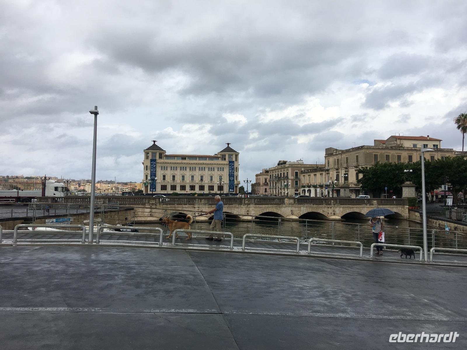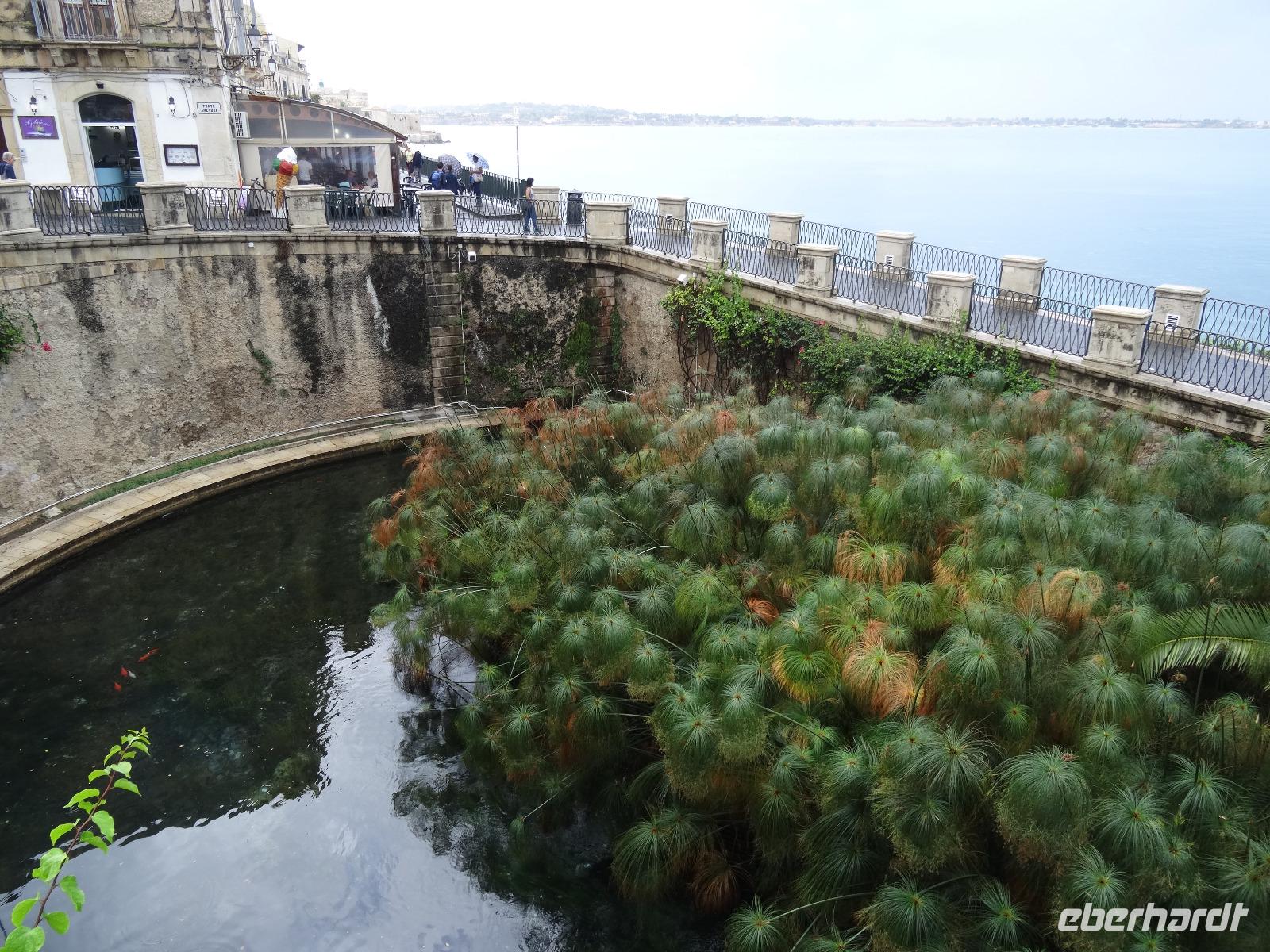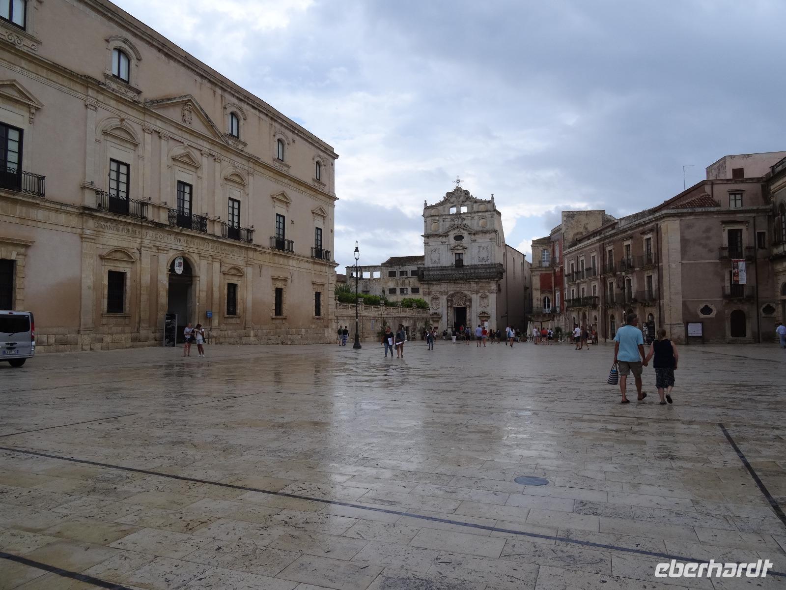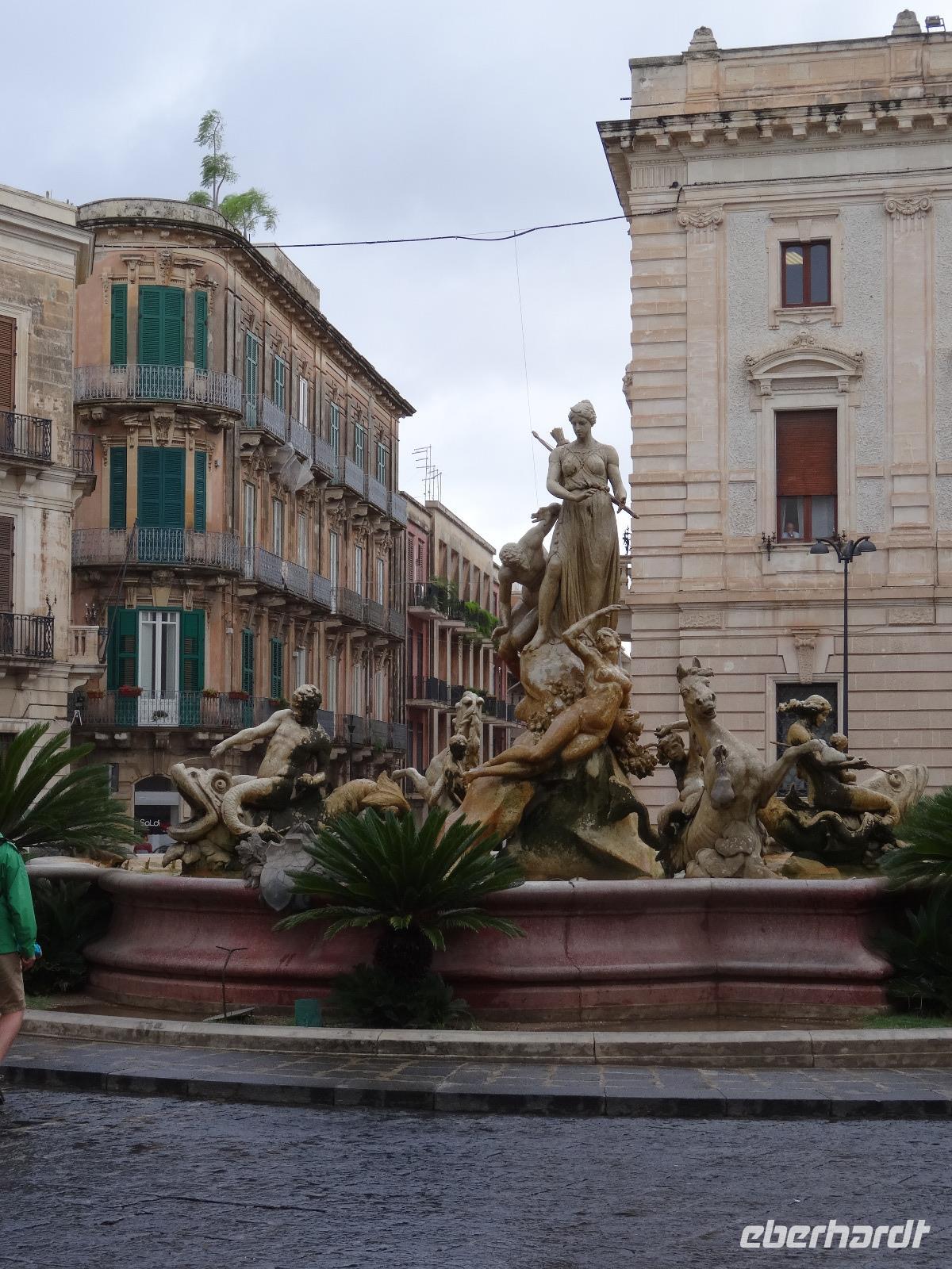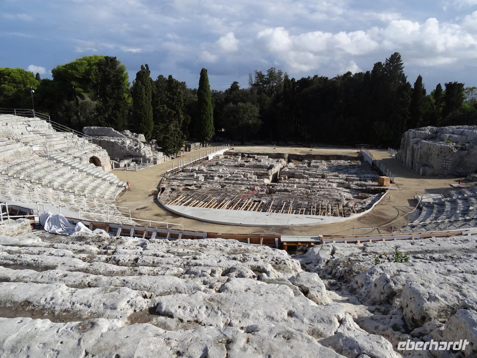 Sie war über viele Jahrhunderte die größte Stadt Siziliens und wurde Aufgrund ihrer einzigartigen geschichtlichen Bedeutung und der noch vorhandenen Bauwerke zum Weltkulturerbe erklärt. Leider war das dem Wetterverantwortlichen relativ egal, denn als wir in Syrakus ankamen und mit der Stadtbesichtigung beginnen wollten, öffneten sich die himmlischen Schleusen und ein Wolkenbruch ging auf uns hernieder. So mussten wir notgedrungen eine Stunde in einer kleinen Cafeteria ausharren, bevor wir mit unserem Besichtigungsprogramm beginnen konnten. Wir begaben uns zur Insel Ortigia, dem Altstadtkern und besichtigten die Reste des Apollon Tempels aus dem sechsten Jahrhundert vor Christi, die Piazza Archimedes, die dem großen Mathematiker und Sohn der Stadt gewidmet ist, sowie den Dom an der Piazza Minerva. War uns das Wetter zwischenzeitlich gewogen, stürzte beim verlassen des Doms ein erneutes Unwetter über uns herein, welches wir Eisessend in einer nahen Gelateria "aussaßen". Auf dem Rückweg umrundeten wir den Brunnen Fonte Aretusa, bevor wir am Hafen entlang unseren Bus wieder erreichten. Als letzter Punkt des heutigen Tages stand ein Besuch des Archäologischen Parks auf dem Programm, doch zuvor durften wir an den elektronischen Segnungen der aktuellen Busgeneration deutscher Bauart teilhaben. Wir gewährten unserem Chauffeur Guiseppe die benötigte Bastelstunde an seinem Bus und erreichten stattdessen die Reste der antiken Stadt mit kurzerhand bestellten Taxen. Bei wieder schönstem Sonnenschein besichtigten wir das Teatro Greco, das Griechische Theater, eines der größten seiner Zeit, und lauschten im Giardino Pubblico einer künstlichen Höhle, der hervorragenden Akustik. Am Ausgang des Parks erwartete uns zur Freude aller Guiseppe mit dem zwischenzeitlich reparierten Bus und brachte uns in anderthalb Stunden die knapp einhundert Kilometer zurück zum Hotel. Ein schöner, aber auch zeitweise feuchter und anstrengender Tag nahm damit sein trockenes Ende.