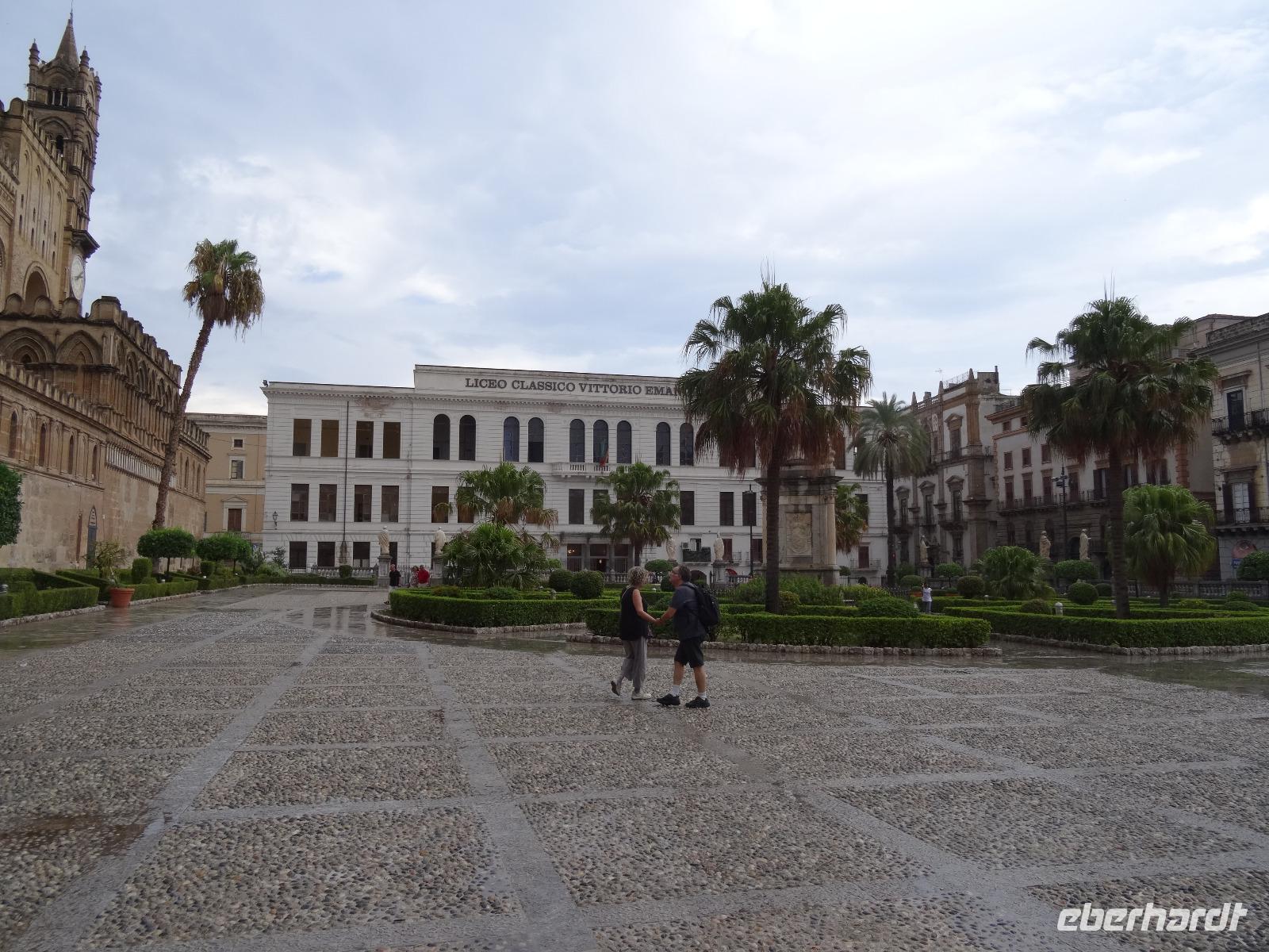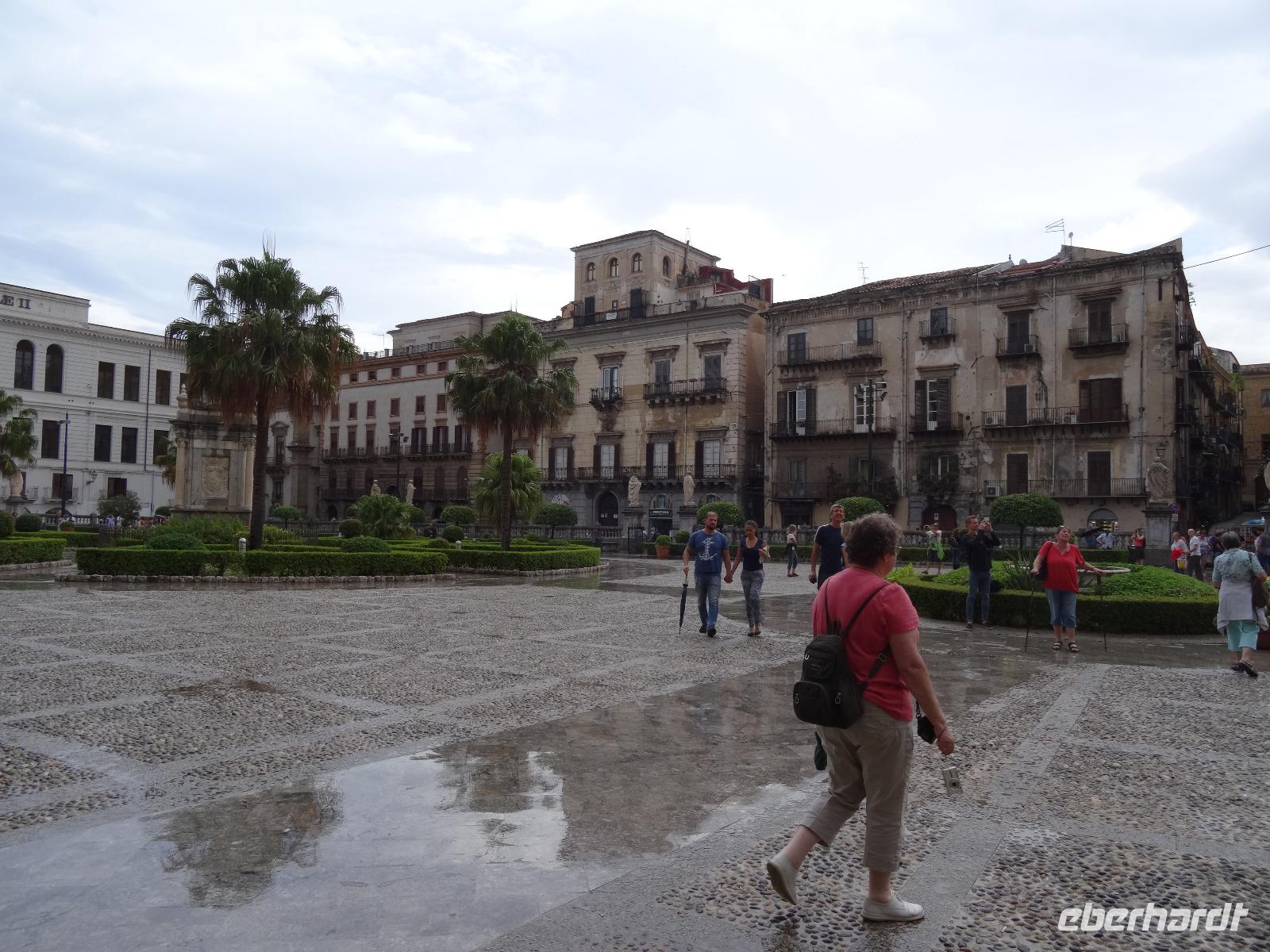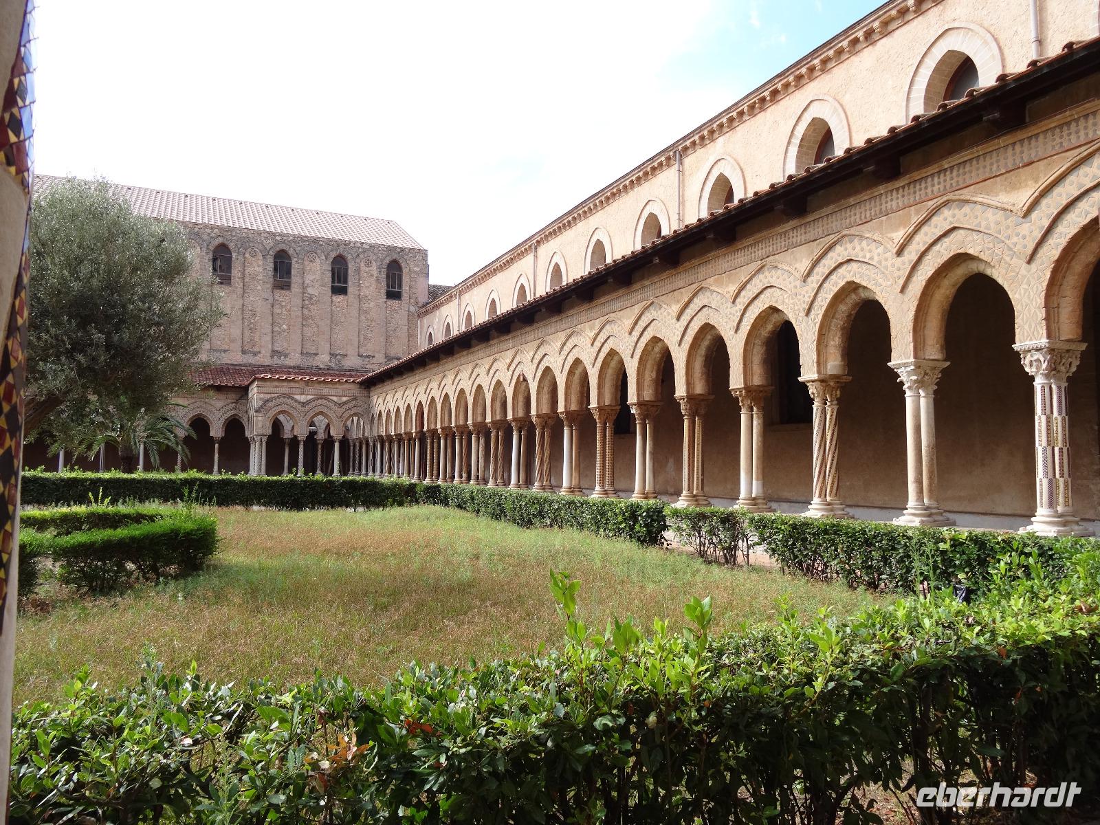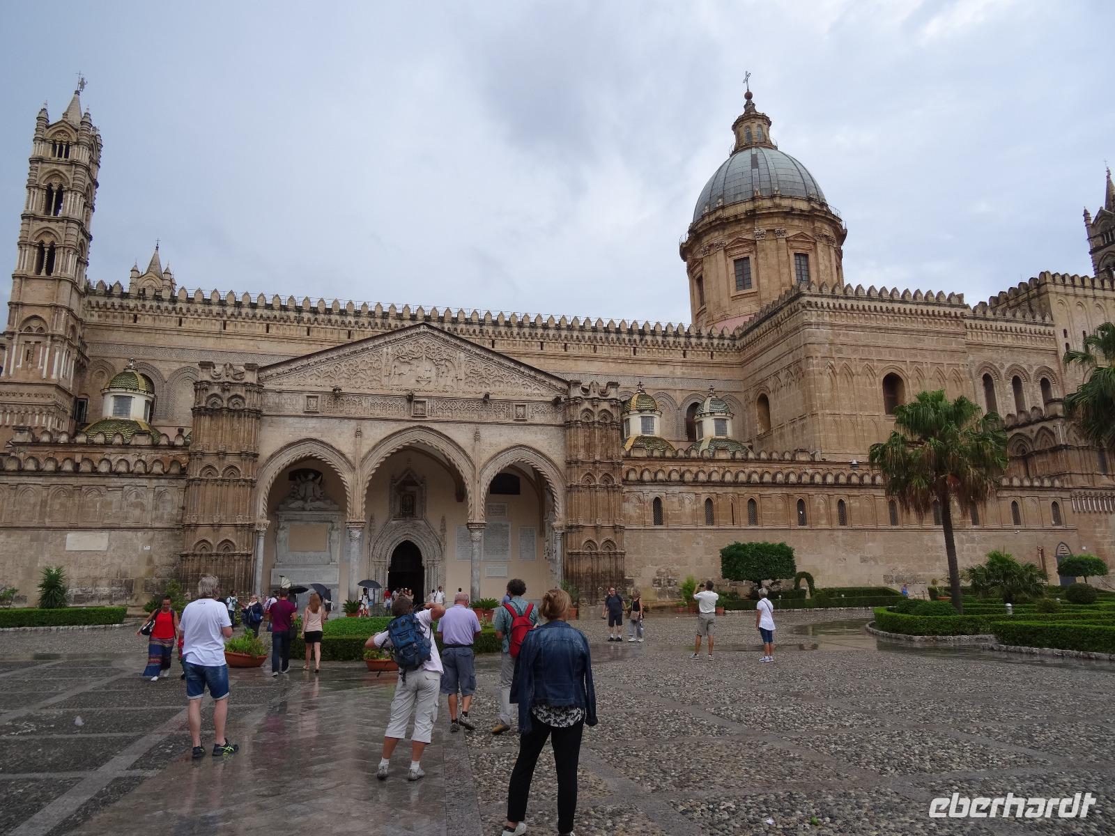 Der heutige Tag stand entweder im Zeichen von Geschichte und Kultur oder bot Freiraum für individuelle Betätigungen. Wer ein wenig Ruhe und Entspannung suchte, verbrachte den Tag am Pool oder bummelte durch Mondello, der andere Teil der Gruppe ging auf eine geschichtliche Entdeckungstour auf den Spuren der Araber, Normannen und Staufer. Erstes Ziel war der nur wenige Kilometer außerhalb Palermos gelegene Ort Monreale, in welchem eine aus dem 12. Jahrhundert stammende normannische Kathedrale mit romanischem Kreuzgang und angeschlossenem Benediktinerkloster steht. Den Höhenunterschied zwischen Park- und Domplatz überwand man über mehrere Dutzend Stufen, vorbei an den Auslagen der allgegenwärtigen Souvenirstände, oder man nutzte die bereitstehenden Taxen, um sich entspannt noch oben bringen zu lassen. Ein Rundgang durch die prunkvoll und wunderschön ausgestaltete Kathedrale sowie den dazugehörigen Kreuzgang mit den Erklärungen von unserer Reiseleiterin ließen die Kirchengeschichte auferstehen. Wir verließen um die Mittagszeit Monreale und fuhren zurück in die Provinzhauptstadt, um dem mächtigen Normannenpalast, dem Palazzo Reale, einen Besuch abzustatten. Heute Refugium des Parlaments war es in früheren Zeiten der Sitz der sizilianischen Könige. Nach dem Durchschreiten der Sicherheitskontrollen und dem Aufstieg in den ersten Stock des Gebäudes besichtigten wir die Capella Palatina, die mosaikgeschmückte, im arabisch-byzantinisch-normannischen Stil errichtete Hofkapelle. Unserer weiterer Programmablauf wurde bei verlassen des Palastes empfindlich gestört, hatte es doch mittlerweile zu regnen angefangen. Uns blieb vorerst keine andere Möglichkeit, als uns so gut es ging unterzustellen und den Regen vorbeigehen zulassen. Das glückte nur bedingt, so dass wir, statt zu laufen, mit dem Bus die wenigen Meter zur Kathedrale zurücklegten. Sie ist nicht nur das bedeutendste Kirchengebäude der Hauptstadt, sondern beherbergt darüber hinaus die Gräber von Heinrich dem 6. und von Friedrich dem 2., welche wir ebenfalls besichtigten. Nach diesem umfassenden Einblick in die kirchliche und weltliche Vergangenheit der Region machte sich Vorfreude auf das avisierte Picknick breit. Leider ließ das immer noch schlechte Wetter keine Freiluftveranstaltung zu, so dass wir uns die leckeren sizilianischen Spezialitäten im Bus schmecken ließen. Dieser parkte dabei am Rande eines kleinen Parks in unmittelbarer Nähe des Mittelmeeres, so das wenigstens die Umgebung eine gewisse Picknickatmosphäre aufkommen lies. Es gab Arancini, eine mit Hackfleisch gefüllte und frittierte Reiskugel, ein Stück schmackhafte Gemüse-Schinken-Pastete, Mandelgebäck, Obst und natürlich den obligatorischen Rotwein zu genießen. In kulinarischer Hinsicht ein kleiner Höhepunkt des Tages, der nur durch die widrigen Wetterbedingungen beeinträchtigt wurde. Gestärkt setzten wir bei einer kleinen Stadtrundfahrt die Erkundung Palermos fort, bevor wir am Opernhaus ausstiegen, um die Stadt noch auf eigene Faust "unsicher" zu machen. Manche besuchten das Stadtmuseum, manche ließen sich einen Café Latte auf der Piazza schmecken oder schaufensterbummelten die Ladenstraßen entlang. Nach der Rückkehr im Hotel genoss man noch schnell ein paar Schwimmzüge im Pool oder ließ den Blick von der Terrasse über die mittlerweile wieder im Sonnenschein liegende Bucht gleiten.
