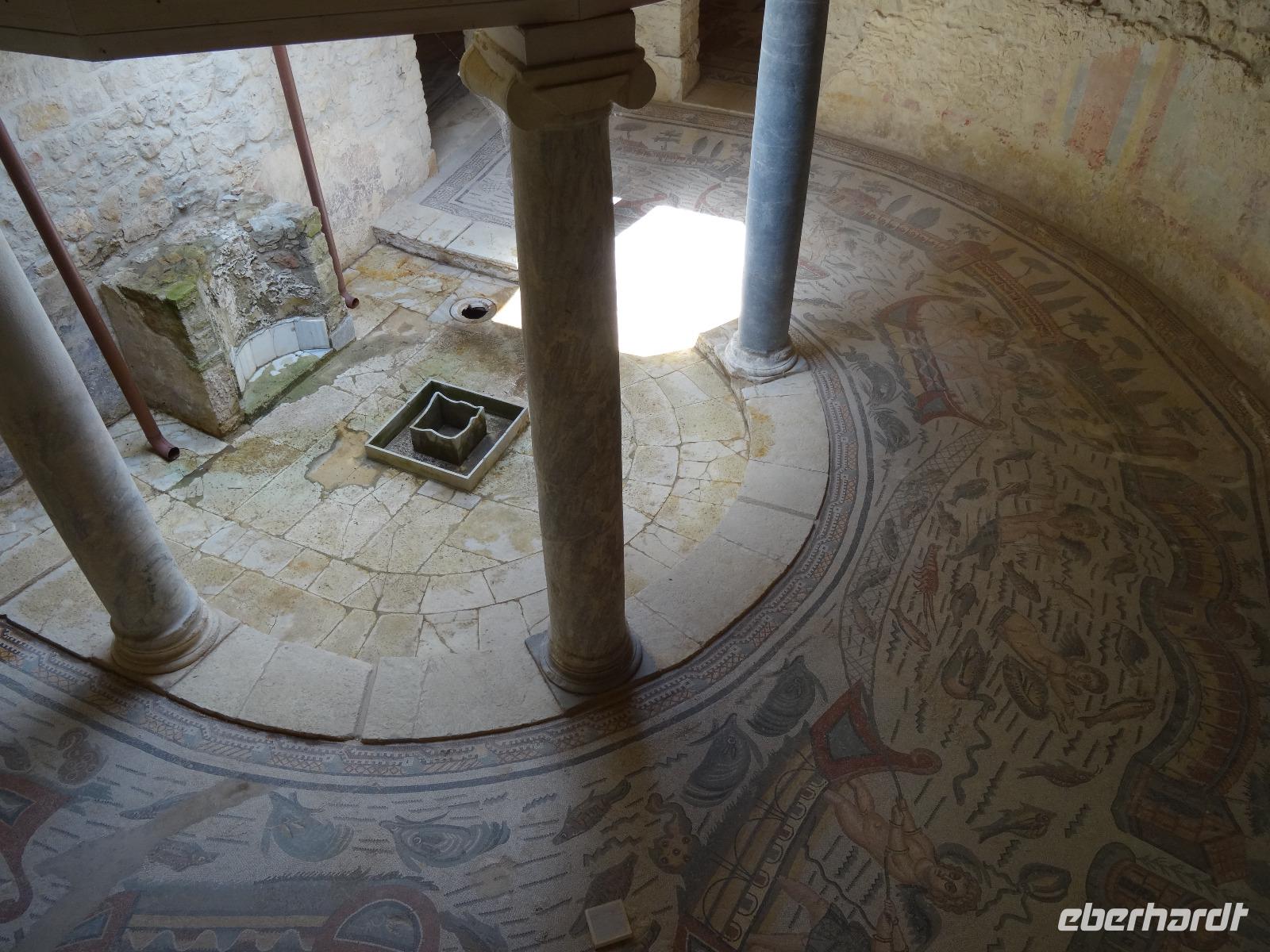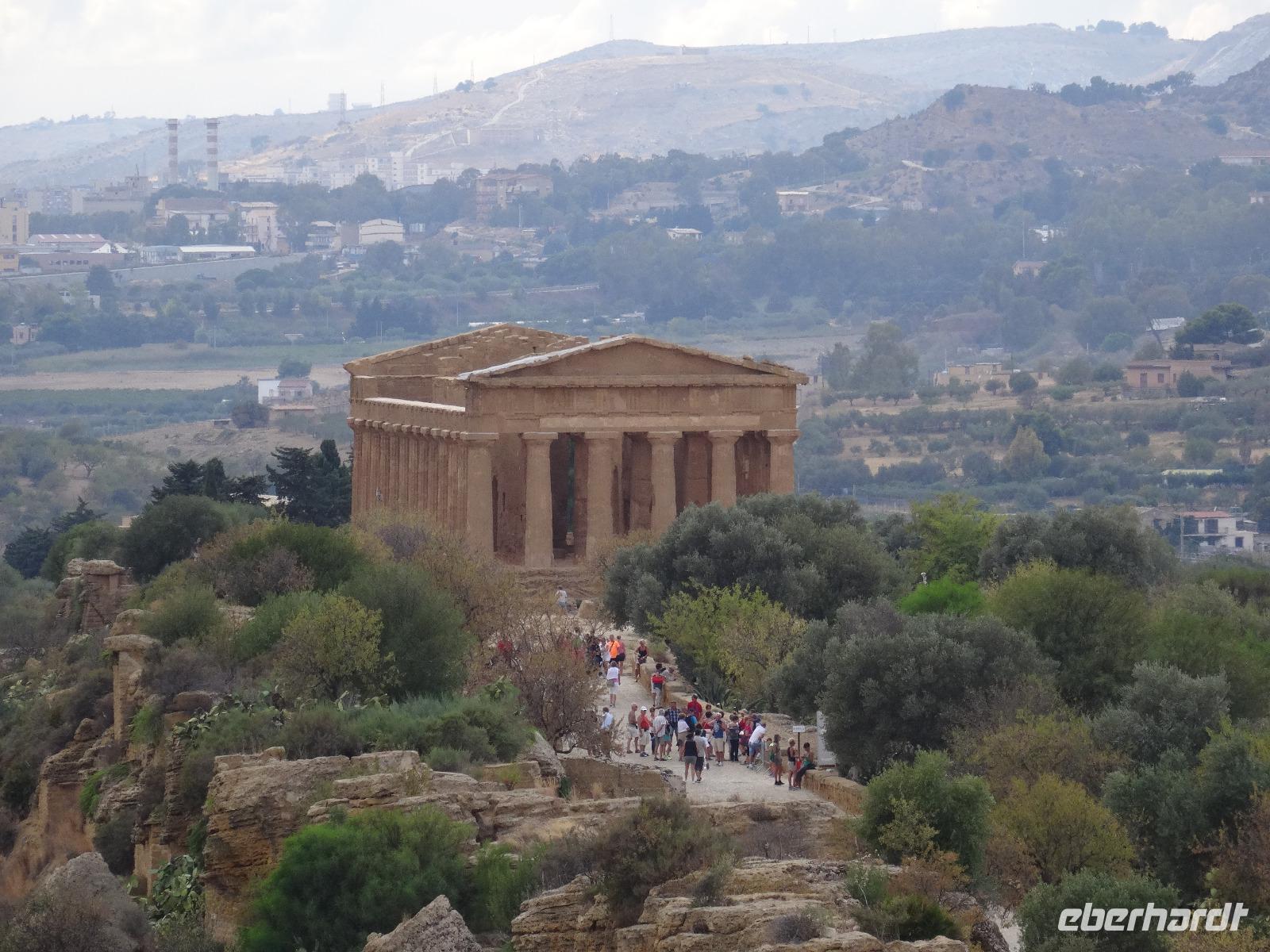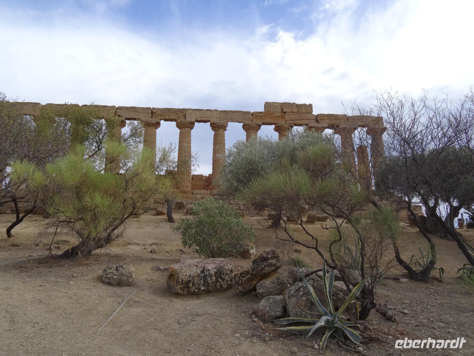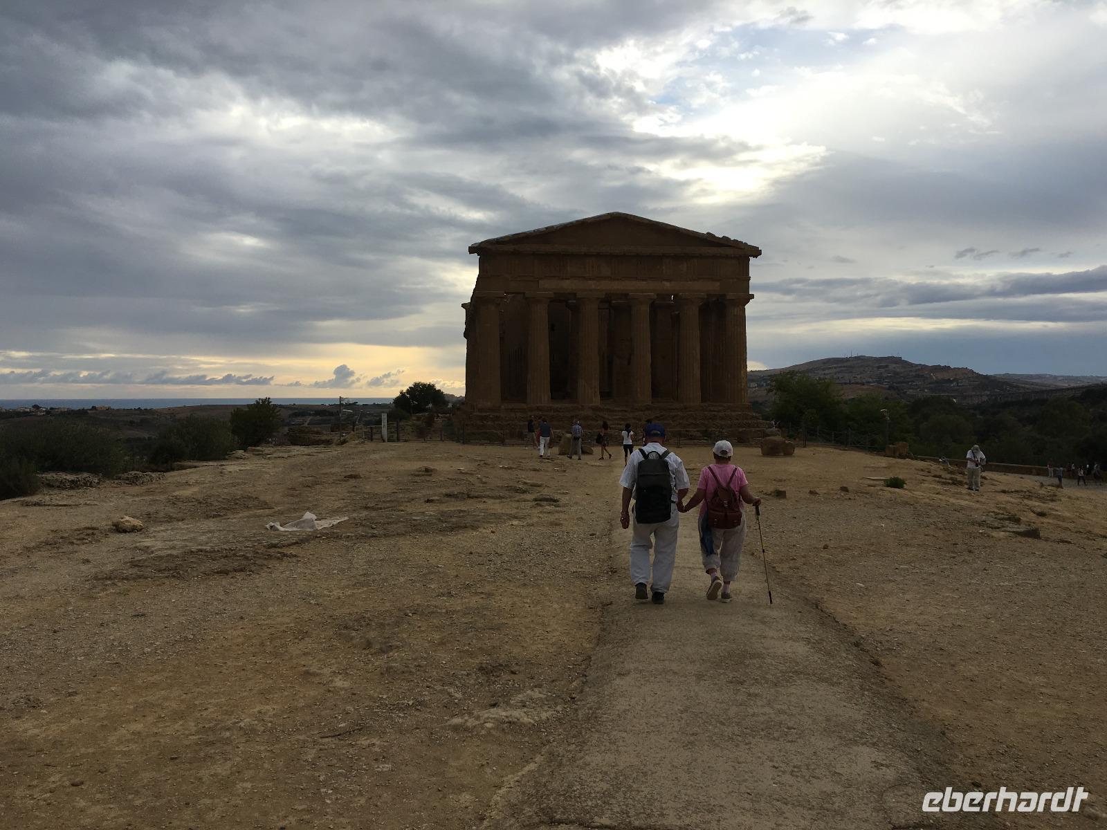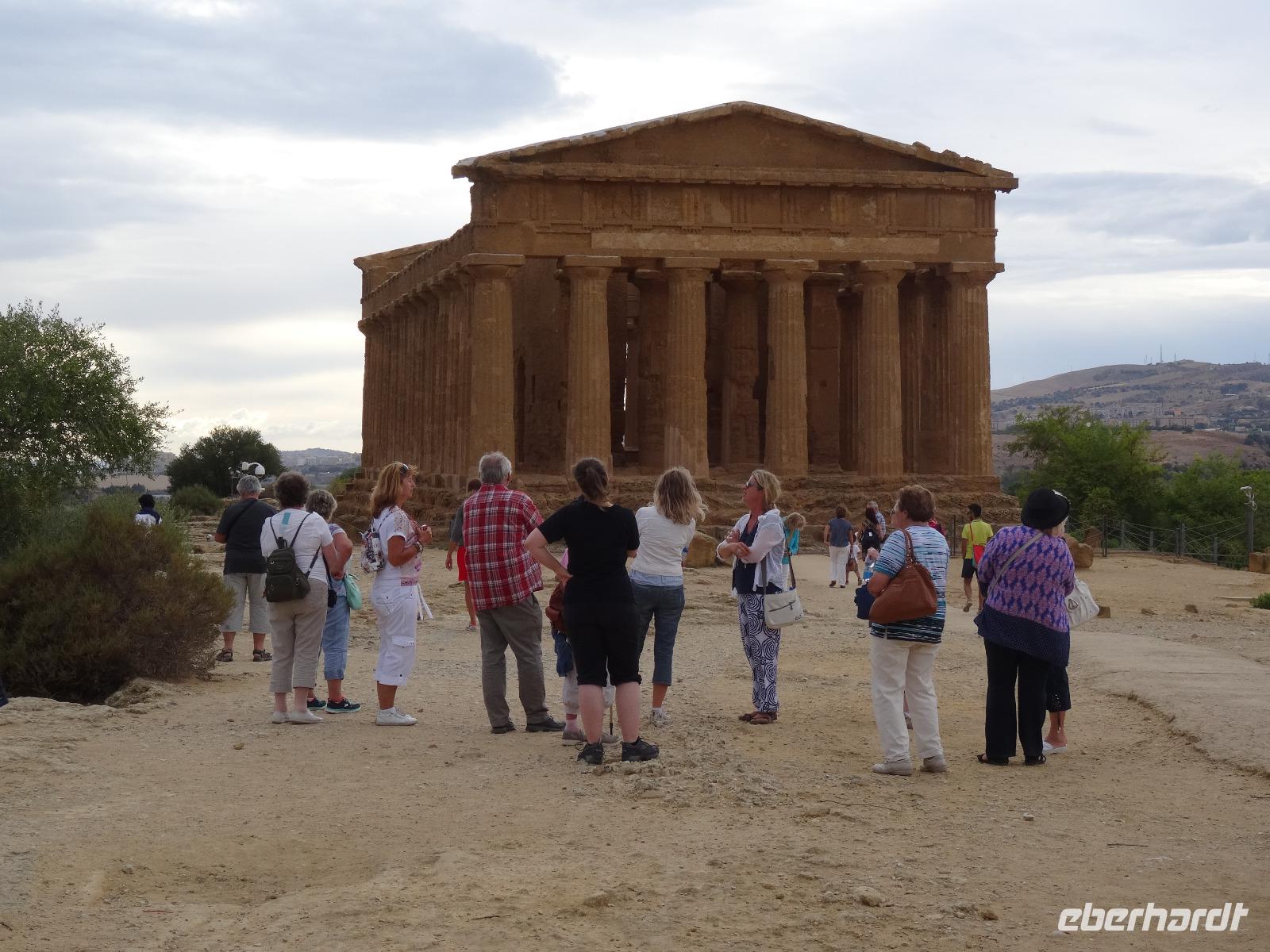 Wir verließen die Nordostküste Siziliens und folgten der Autostrada 18 bis Catania, bevor wir südlich des Ätnas ins Landesinnere abbogen. Die Landschaft formte sich links und rechts der Straße zu weichen Hügelketten, in denen sich pittoreske Dörfchen und weitläufige Nutzflächen abwechselten. Kurz vor dem Höchststand der Sonne durchfuhren wir den kleinen Ort Piazza Armerina, in dessen Einzugsgebiet sich die Villa Romana del Casale, unser erster Stopp an diesem Tag, befand. Weit über die Grenzen Siziliens hinaus berühmt geworden sind die Reste dieser römischen Villa durch ihre sehr gut erhaltenen Bodenmosaiken und durch die Größe und ehemaligen Ausstattung der Anlage. Der gesamte noch erhaltene Gebäudekomplex ist deshalb ein historisch bedeutendes Zeugnis der römischen Herrschaft auf Sizilien. Christiane führte uns durch die erst Mitte des 18. Jahrhunderts wiederentdeckte Villa und gab ausführliche Erklärungen zu den einzelnen Räumlichkeiten, den Darstellungen und Bedeutungen der wunderschönen Mosaiken. Anderthalb Stunden später und um viele Informationen reicher setzten wir unsere Fahrt nach Süden fort und erreichten, mit einem kurzen Toilettenstopp, am frühen Nachmittag das Tal der Tempel in der Nähe der Stadt Agrigent. Die mehrere Hektar großen archäologischen Stätten beherbergen die Überreste der antiken griechischen Stadt Akragas, welche im fünften Jahrhundert vor Christi zu den bedeutendsten Städten auf Sizilien gehörte. Einige gut erhaltene Bauwerke waren das Ziel unseres Rundganges, unter anderem der Hera- oder Juno-Tempel, der Concordia- sowie der Herkules-Tempel. Entlang der antiken Stadtmauer, im dürftigen Schatten der Mandel- und Olivenbäume schritten wir von Tempel zu Tempel und bestaunten die Baukunst der alten Griechen und die Anmut ihrer Schöpfungen. Mit eindrucksvollen Bildern vor Augen erreichten wir am frühen Abend unser Hotel in Agrigento. Nach einer kurzen Ruhephase nahmen wir ein viergängiges Abendessen zu uns und entspannten im Anschluss bei einem guten Glas Wein an der Bar oder auf der Terrasse des Hotels.