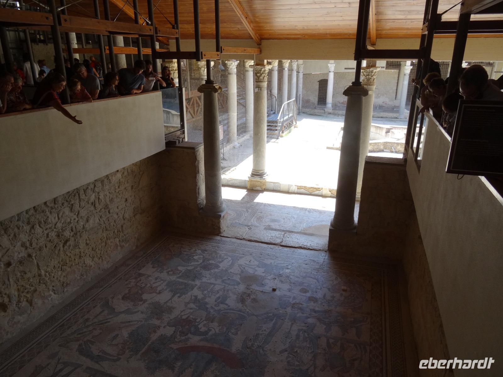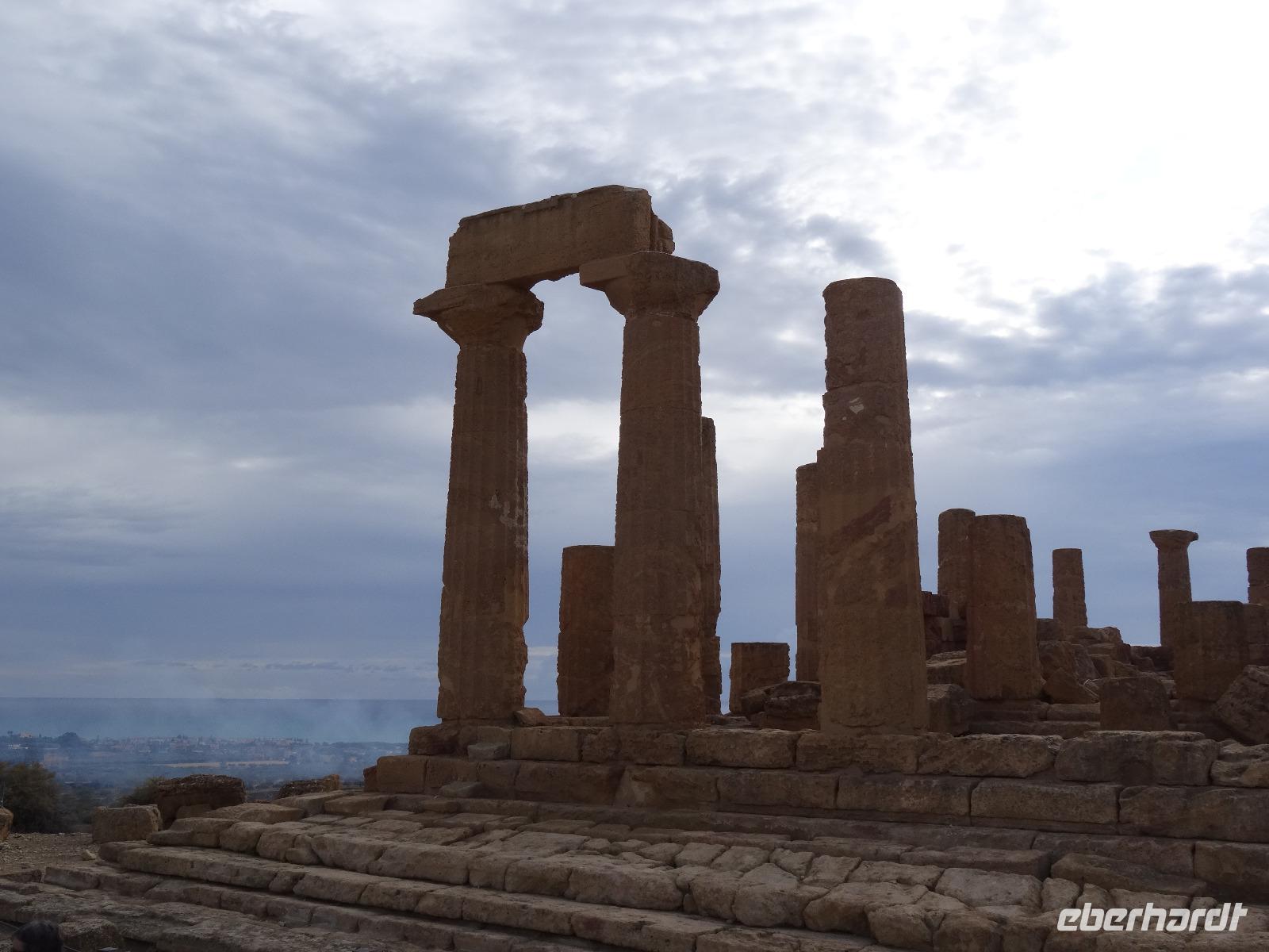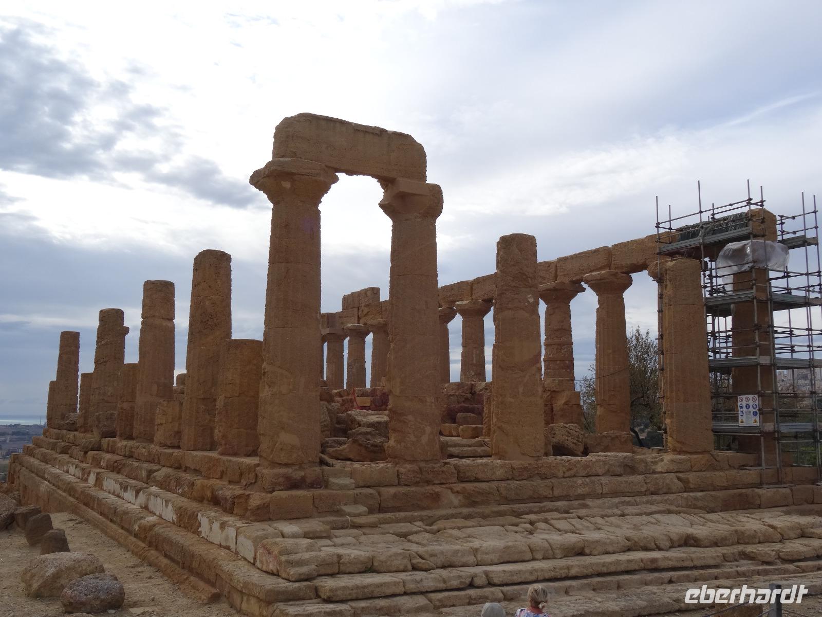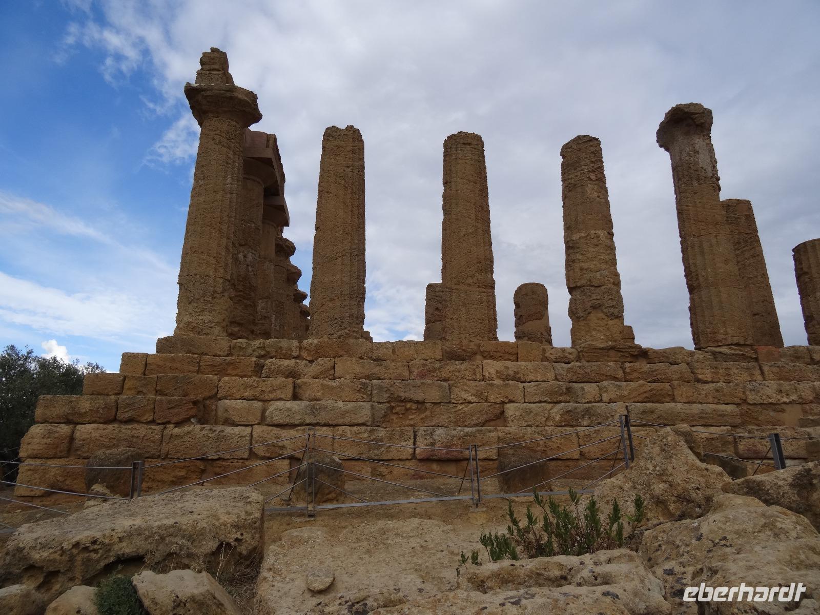 Wir verließen die Nordostküste Siziliens und folgten der Autostrada 18 bis Catania, bevor wir südlich des Ätnas ins Landesinnere abbogen. Die Landschaft formte sich links und rechts der Straße zu weichen Hügelketten, in denen sich pittoreske Dörfchen und weitläufige Nutzflächen abwechselten. Kurz vor dem Höchststand der Sonne durchfuhren wir den kleinen Ort Piazza Armerina, in dessen Einzugsgebiet sich die Villa Romana del Casale, unser erster Stopp an diesem Tag, befand. Weit über die Grenzen Siziliens hinaus berühmt geworden sind die Reste dieser römischen Villa durch ihre sehr gut erhaltenen Bodenmosaiken und durch die Größe und ehemaligen Ausstattung der Anlage. Der gesamte noch erhaltene Gebäudekomplex ist deshalb ein historisch bedeutendes Zeugnis der römischen Herrschaft auf Sizilien. Christiane führte uns durch die erst Mitte des 18. Jahrhunderts wiederentdeckte Villa und gab ausführliche Erklärungen zu den einzelnen Räumlichkeiten, den Darstellungen und Bedeutungen der wunderschönen Mosaiken. Anderthalb Stunden später und um viele Informationen reicher setzten wir unsere Fahrt nach Süden fort und erreichten, mit einem kurzen Toilettenstopp, am frühen Nachmittag das Tal der Tempel in der Nähe der Stadt Agrigent. Die mehrere Hektar großen archäologischen Stätten beherbergen die Überreste der antiken griechischen Stadt Akragas, welche im fünften Jahrhundert vor Christi zu den bedeutendsten Städten auf Sizilien gehörte. Einige gut erhaltene Bauwerke waren das Ziel unseres Rundganges, unter anderem der Hera- oder Juno-Tempel, der Concordia- sowie der Herkules-Tempel. Entlang der antiken Stadtmauer, im dürftigen Schatten der Mandel- und Olivenbäume schritten wir von Tempel zu Tempel und bestaunten die Baukunst der alten Griechen und die Anmut ihrer Schöpfungen. Mit eindrucksvollen Bildern vor Augen erreichten wir am frühen Abend unser Hotel in Agrigento. Nach einer kurzen Ruhephase nahmen wir ein viergängiges Abendessen zu uns und entspannten im Anschluss bei einem guten Glas Wein an der Bar oder auf der Terrasse des Hotels.