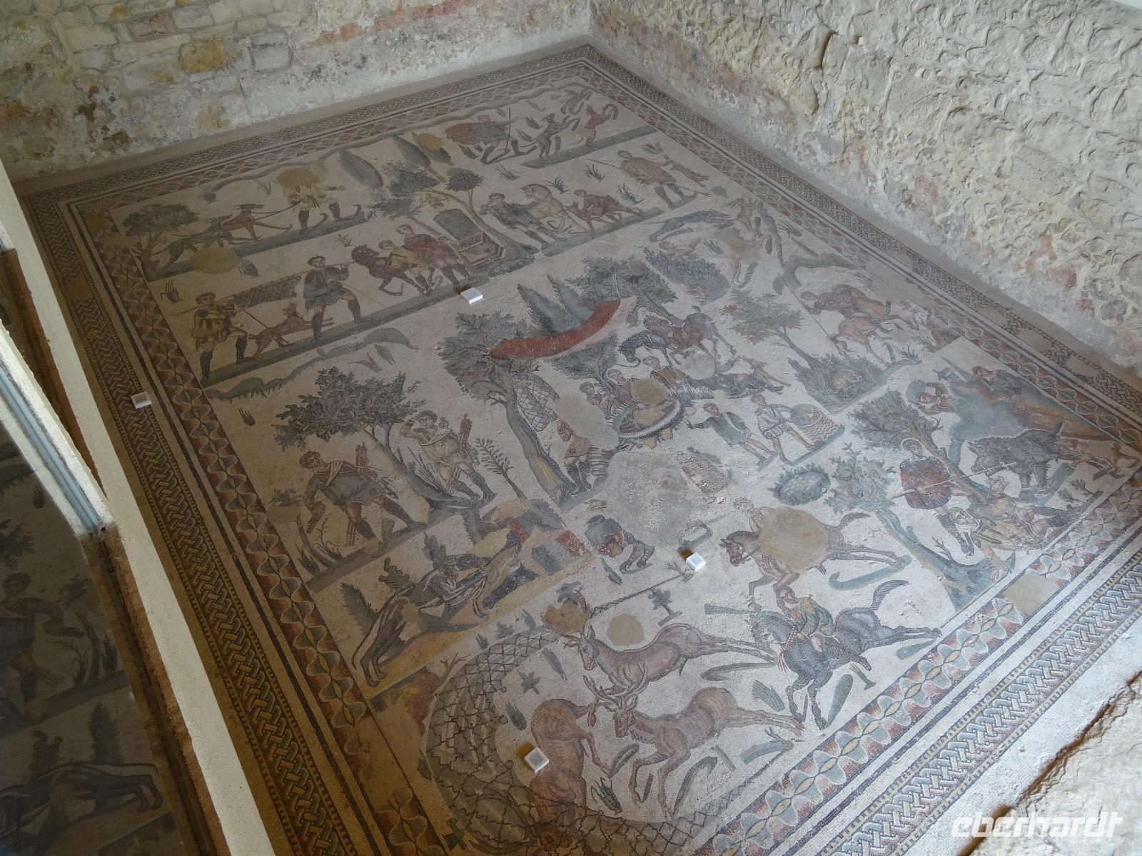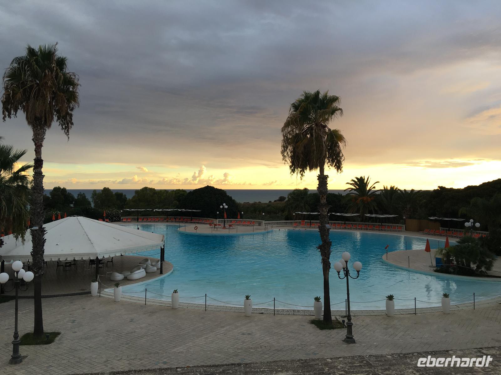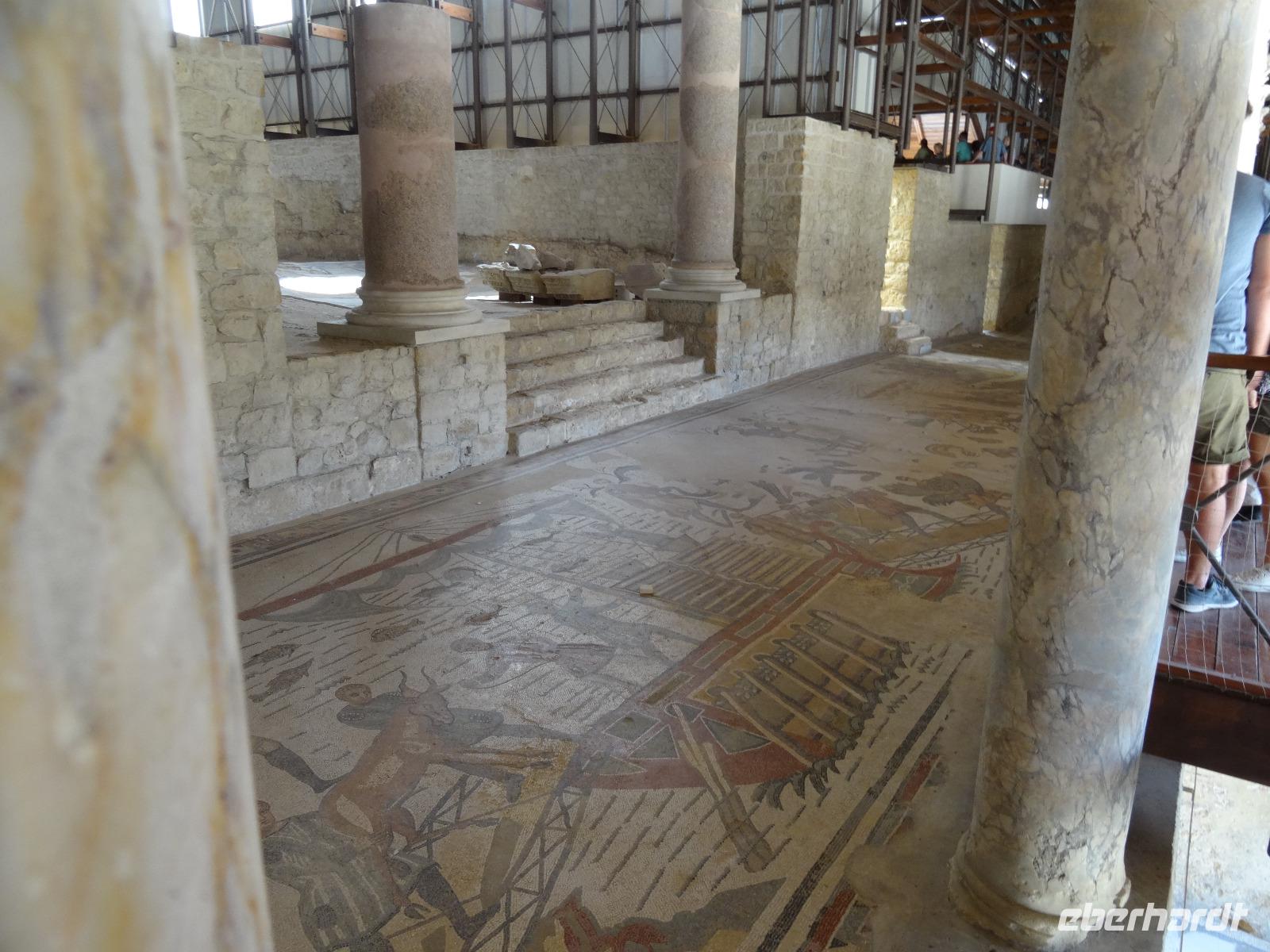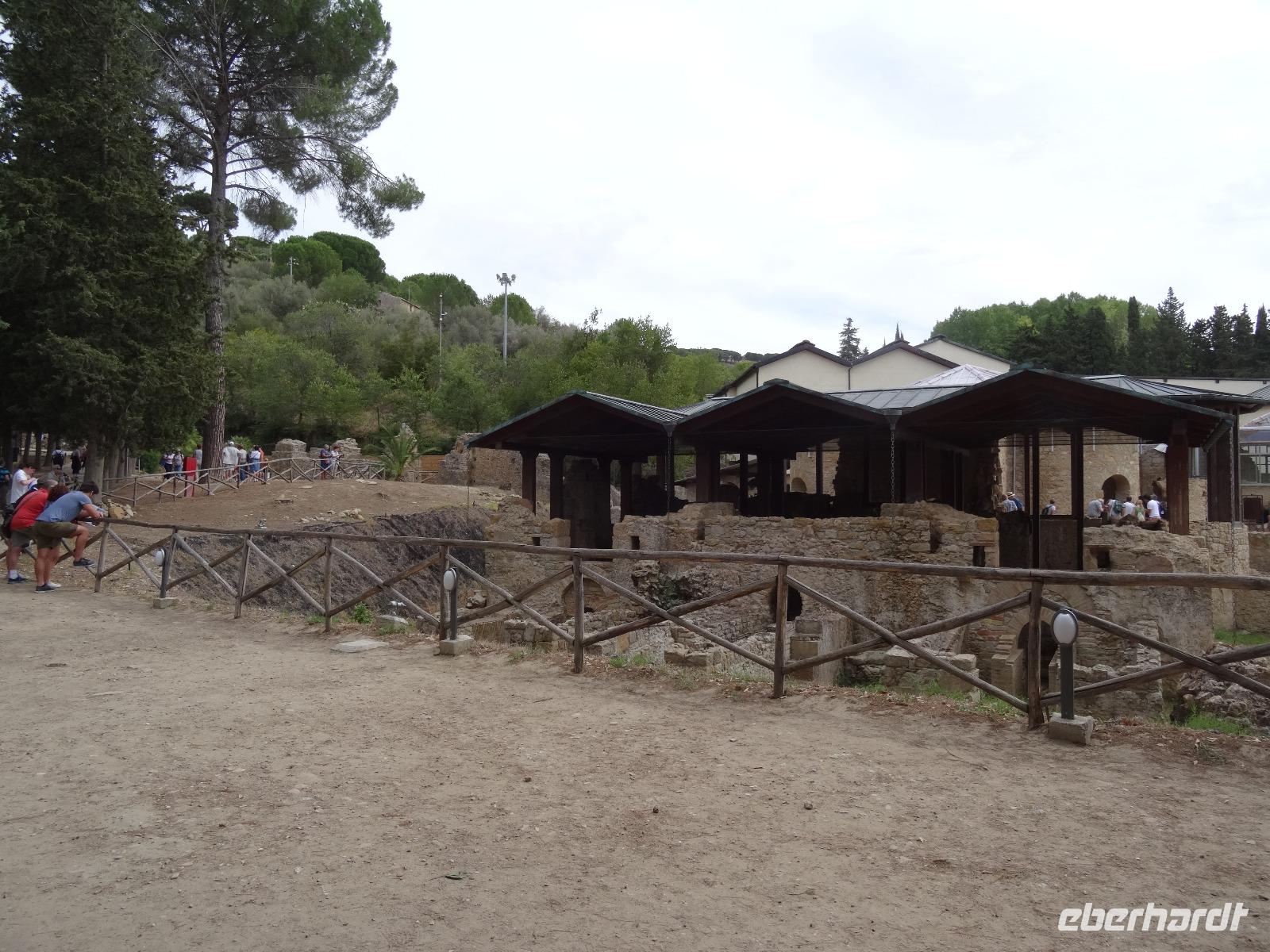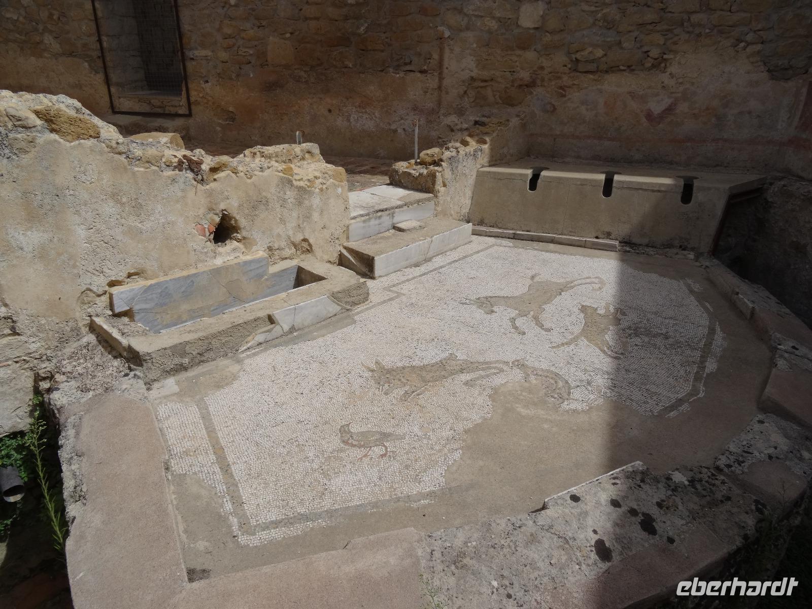 Wir verließen die Nordostküste Siziliens und folgten der Autostrada 18 bis Catania, bevor wir südlich des Ätnas ins Landesinnere abbogen. Die Landschaft formte sich links und rechts der Straße zu weichen Hügelketten, in denen sich pittoreske Dörfchen und weitläufige Nutzflächen abwechselten. Kurz vor dem Höchststand der Sonne durchfuhren wir den kleinen Ort Piazza Armerina, in dessen Einzugsgebiet sich die Villa Romana del Casale, unser erster Stopp an diesem Tag, befand. Weit über die Grenzen Siziliens hinaus berühmt geworden sind die Reste dieser römischen Villa durch ihre sehr gut erhaltenen Bodenmosaiken und durch die Größe und ehemaligen Ausstattung der Anlage. Der gesamte noch erhaltene Gebäudekomplex ist deshalb ein historisch bedeutendes Zeugnis der römischen Herrschaft auf Sizilien. Christiane führte uns durch die erst Mitte des 18. Jahrhunderts wiederentdeckte Villa und gab ausführliche Erklärungen zu den einzelnen Räumlichkeiten, den Darstellungen und Bedeutungen der wunderschönen Mosaiken. Anderthalb Stunden später und um viele Informationen reicher setzten wir unsere Fahrt nach Süden fort und erreichten, mit einem kurzen Toilettenstopp, am frühen Nachmittag das Tal der Tempel in der Nähe der Stadt Agrigent. Die mehrere Hektar großen archäologischen Stätten beherbergen die Überreste der antiken griechischen Stadt Akragas, welche im fünften Jahrhundert vor Christi zu den bedeutendsten Städten auf Sizilien gehörte. Einige gut erhaltene Bauwerke waren das Ziel unseres Rundganges, unter anderem der Hera- oder Juno-Tempel, der Concordia- sowie der Herkules-Tempel. Entlang der antiken Stadtmauer, im dürftigen Schatten der Mandel- und Olivenbäume schritten wir von Tempel zu Tempel und bestaunten die Baukunst der alten Griechen und die Anmut ihrer Schöpfungen. Mit eindrucksvollen Bildern vor Augen erreichten wir am frühen Abend unser Hotel in Agrigento. Nach einer kurzen Ruhephase nahmen wir ein viergängiges Abendessen zu uns und entspannten im Anschluss bei einem guten Glas Wein an der Bar oder auf der Terrasse des Hotels.