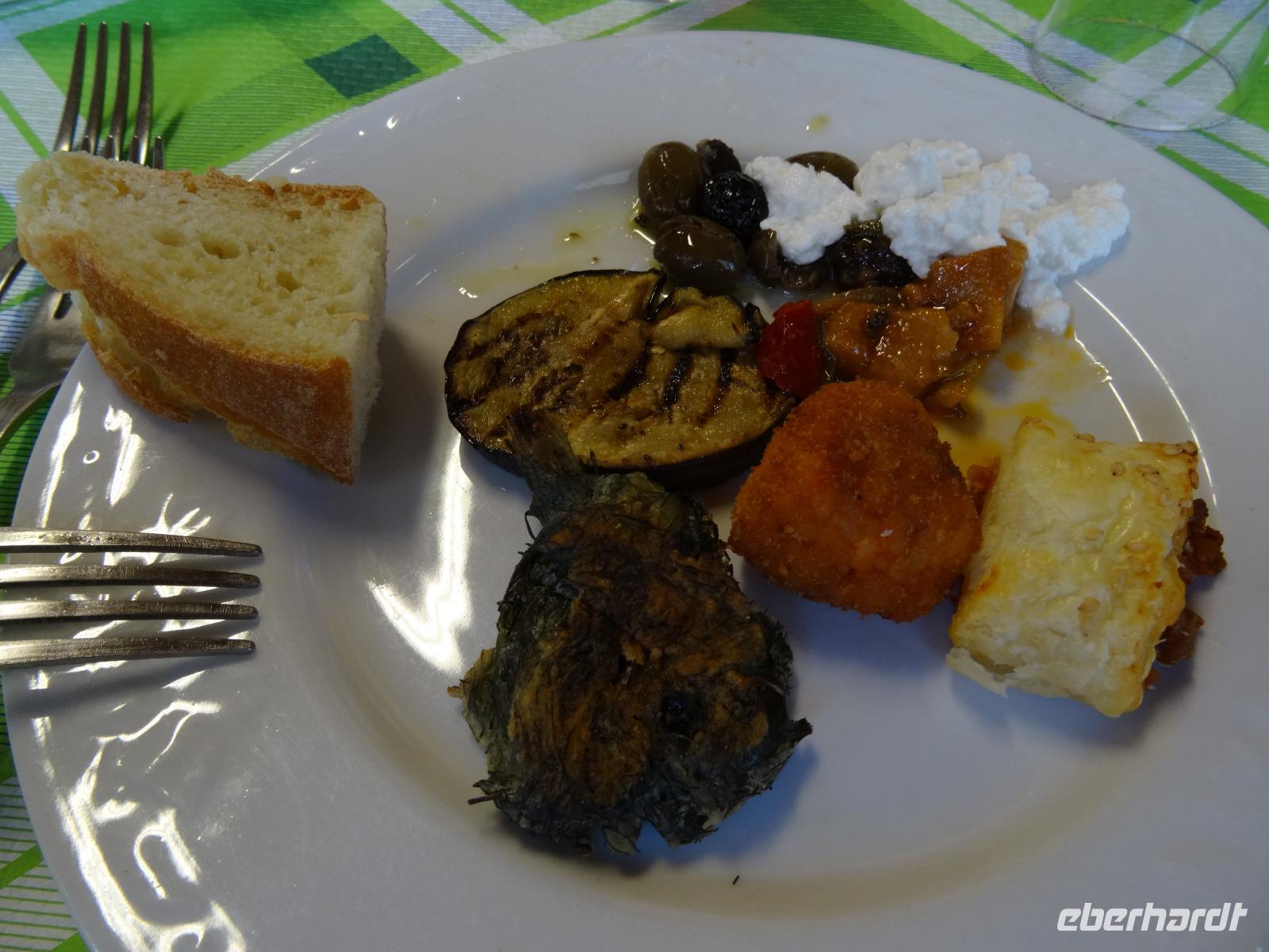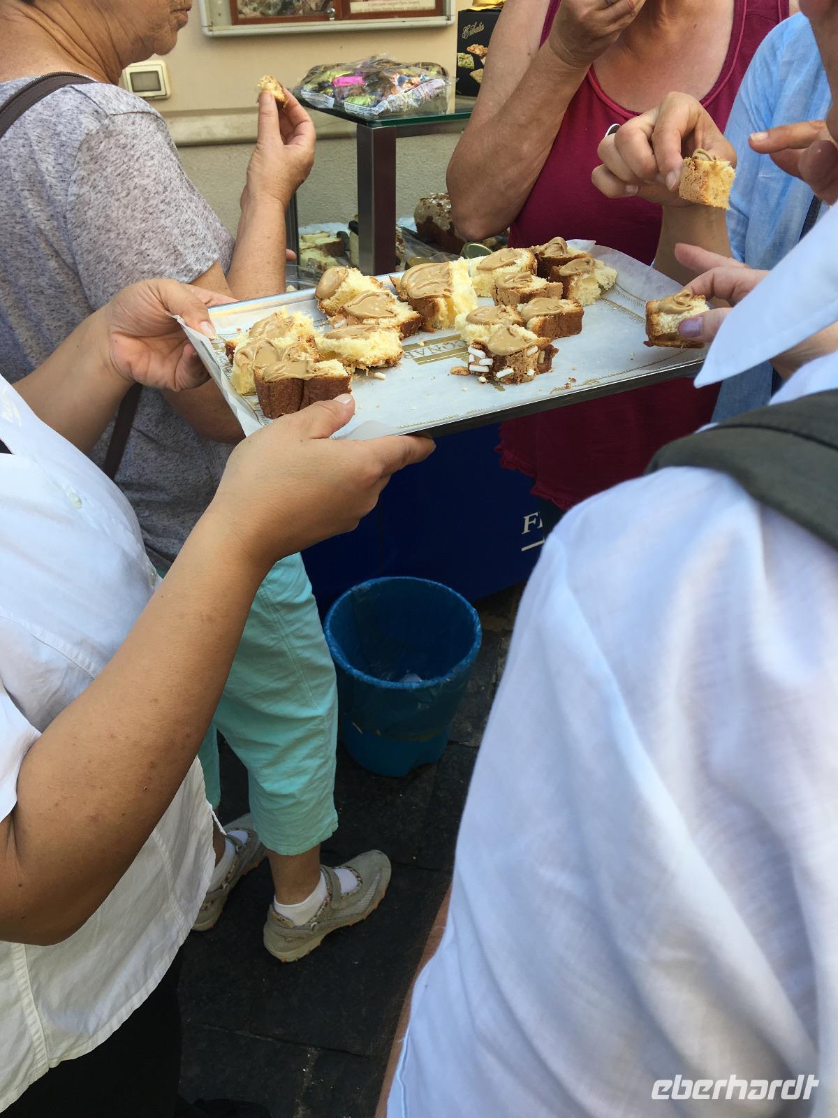 Bei schönstem Sonnenschein begaben wir uns heute in das bergige Hinterland der Madonie. Doch bevor wir diese Serpentinenreiche Strecke in Angriff nahmen, führte uns der Weg ostwärts nach Cefalu, der malerischen Kleinstadt am Tyrrhenischen Meer. Wir bummelten durch die Gassen der Altstadt und besichtigten den Dom aus dem 12. Jahrhundert, der wie seine Pendants in Monreale und Palermo arabisch-byzantinisch-normannische Stilelemente aufweist. Unser nächstes Ziel war das beschauliche Örtchen Castelbuono am Fuße des Pizzo Carbonara, der höchsten Erhebung der Madonie. Neben seinem urigen Flair zeichnet den Ort vor allem die Produktion von Manna aus, einer aus Eschensaft hergestellten Süßigkeit mit laxativen Eigenschaften. Wir probierten Manna in unterschiedlichen Formen aus, einmal als Torroncini und einmal als Haselnuss-Manna-Creme auf einem Stück Pannettone. Wer wollte, konnte auch Mannettino probieren. Anschließend setzten wir unsere Fahrt durch die Madonie fort und erreichten am frühen Nachmittag den kleinen Bauernhof Agriturismo Gelso von Daniela und Claudio. Uns wurde ein herzlicher Empfang zuteil und wir konnten die Produkte des Hofes in Augenschein nehmen. Wein- und Olivenanbau sowie die Marmeladenherstellung waren einige davon. Nachdem wir ein leckeres Bauernbrot mit Olivenöl gekostet hatten, begaben wir uns in die Gaststube, wo uns allerlei typische sizilianische Speisen bei einem guten Wein kredenzt wurden. Alle Produkte stammten direkt vom Hof oder aus der Region, was sich im köstlichen Geschmack widerspiegelte. Zum Abschluss gab es noch ein Gläschen Maulbeerlikör, welcher herrlich süß und fruchtig war. So hätte man noch ewig sitzen, essen und trinken können! Doch leider neigte sich ein wieder sehr schöner Tag dem Ende entgegen und wir hatten noch den weiten Rückweg nach Mondello vor uns. So nahmen wir Abschied von Claudio und seinem kleinen Hof und bewegten uns letztmalig während dieser Reise in Richtung unseres Hotels im Norden der Insel. Morgen hieß es leider schon Abschied nehmen...