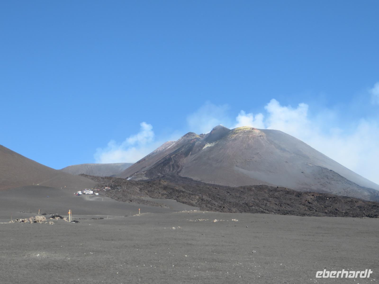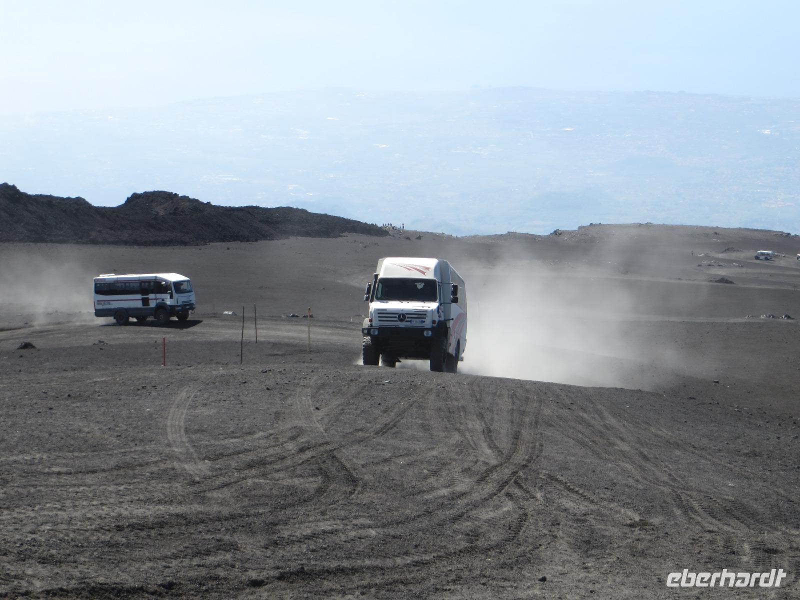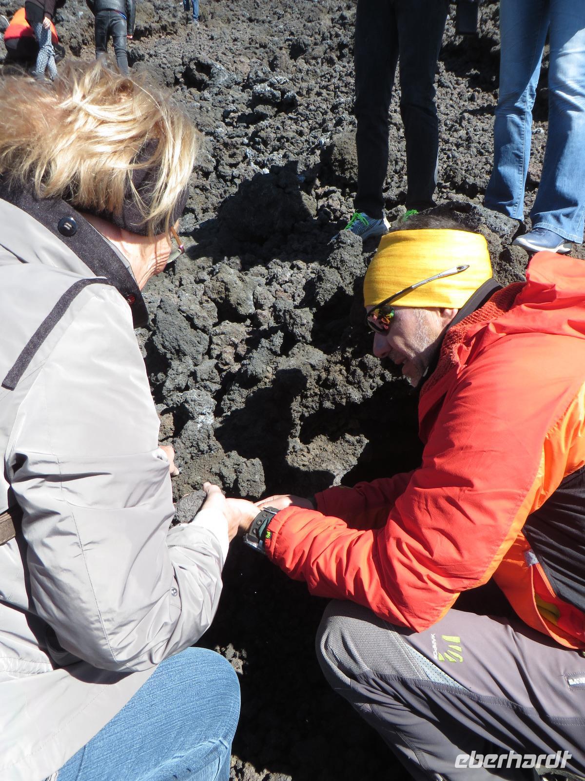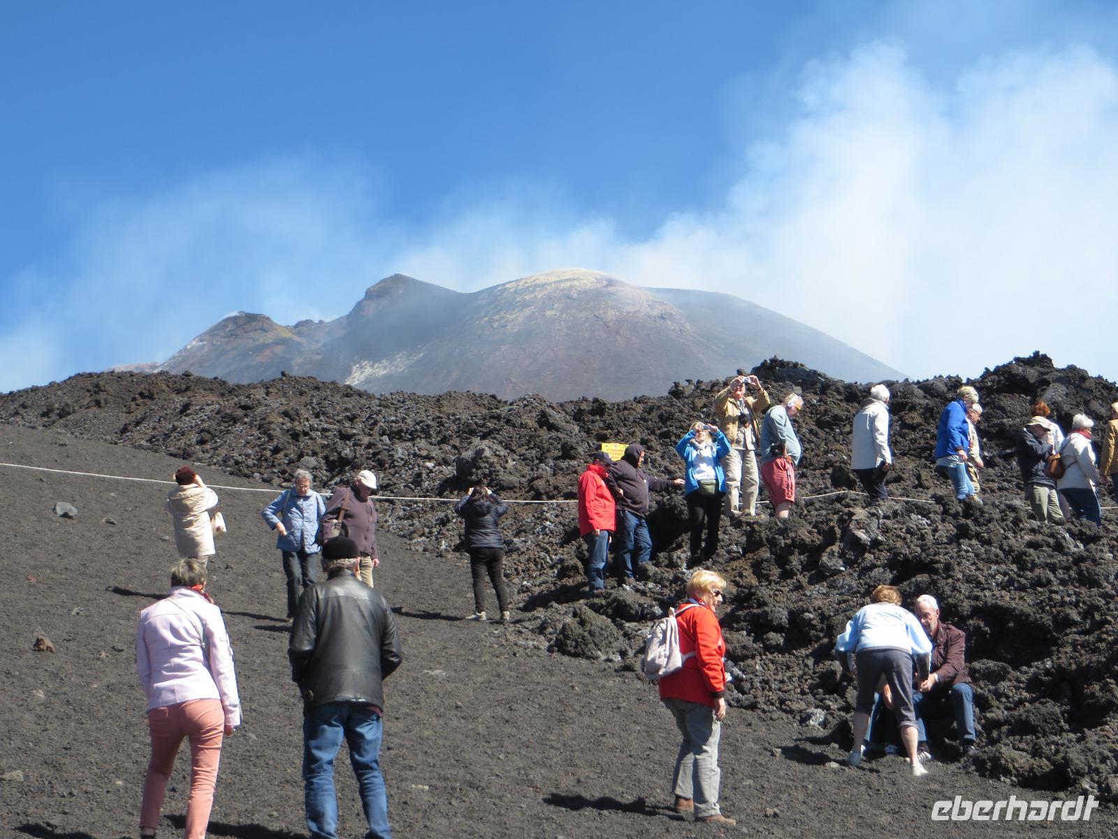 Über zahlreiche Serpentinen erreichten wir schließlich die Talstation der Seilbahn. Es war wunderbares Wetter. Deshalb entschieden sich alle Gäste für die Auffahrt mit der Bergbahn sowie anschließende Weiterfahrt mit umgebauten Mercedes Unimogs durch letzte Schneereste bis auf knapp 3000 m Höhe. Hier erwartete uns schon ein Bergführer, welcher erst durch Gäste unserer Gruppe auf die letzte Eruption vom 27. April 2017 in Kenntnis gesetzt wurde. Jeder erhielt ein Stück noch warmes Lavagestein zum Wärmen der Hände. Ein weiterer Stopp erfolgte am Valle del Bove.