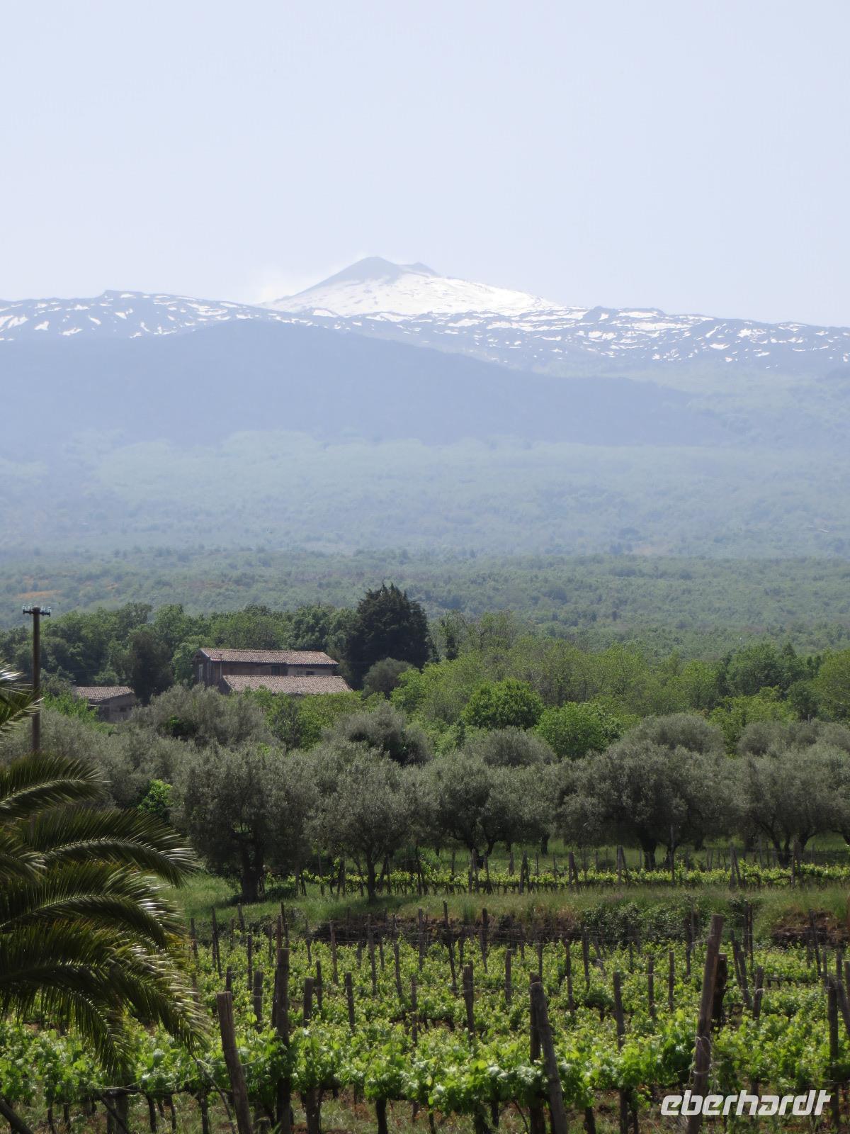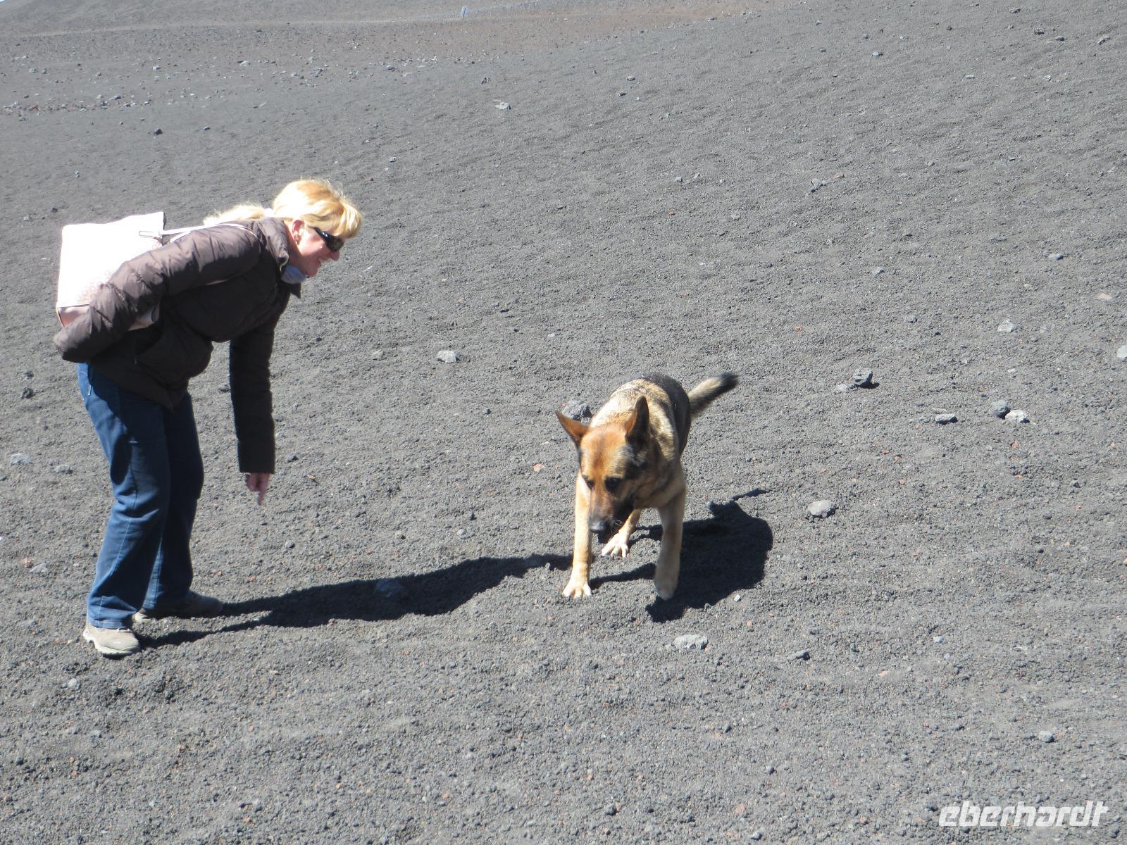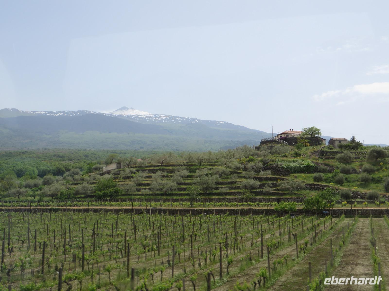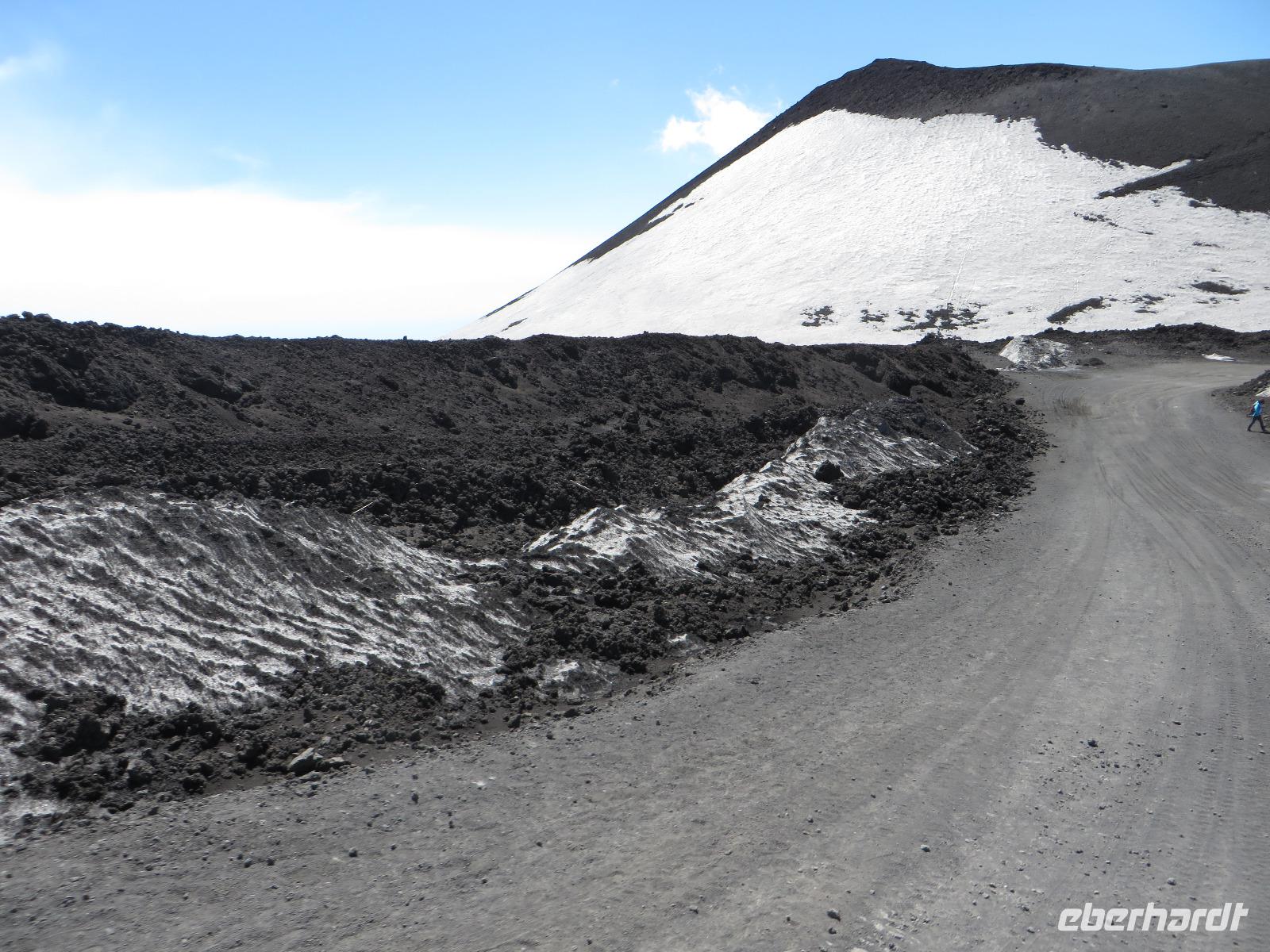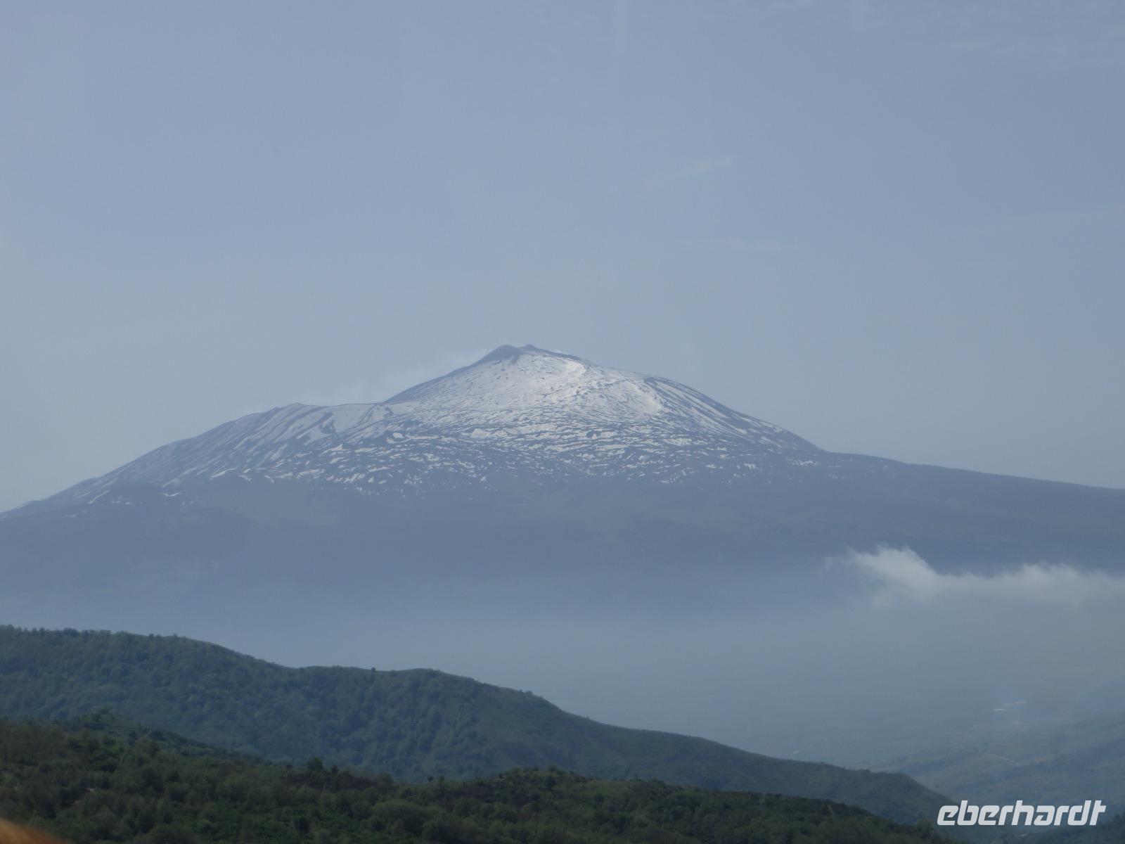 Über zahlreiche Serpentinen erreichten wir schließlich die Talstation der Seilbahn. Es war wunderbares Wetter. Deshalb entschieden sich alle Gäste für die Auffahrt mit der Bergbahn sowie anschließende Weiterfahrt mit umgebauten Mercedes Unimogs durch letzte Schneereste bis auf knapp 3000 m Höhe. Hier erwartete uns schon ein Bergführer, welcher erst durch Gäste unserer Gruppe auf die letzte Eruption vom 27. April 2017 in Kenntnis gesetzt wurde. Jeder erhielt ein Stück noch warmes Lavagestein zum Wärmen der Hände. Ein weiterer Stopp erfolgte am Valle del Bove.