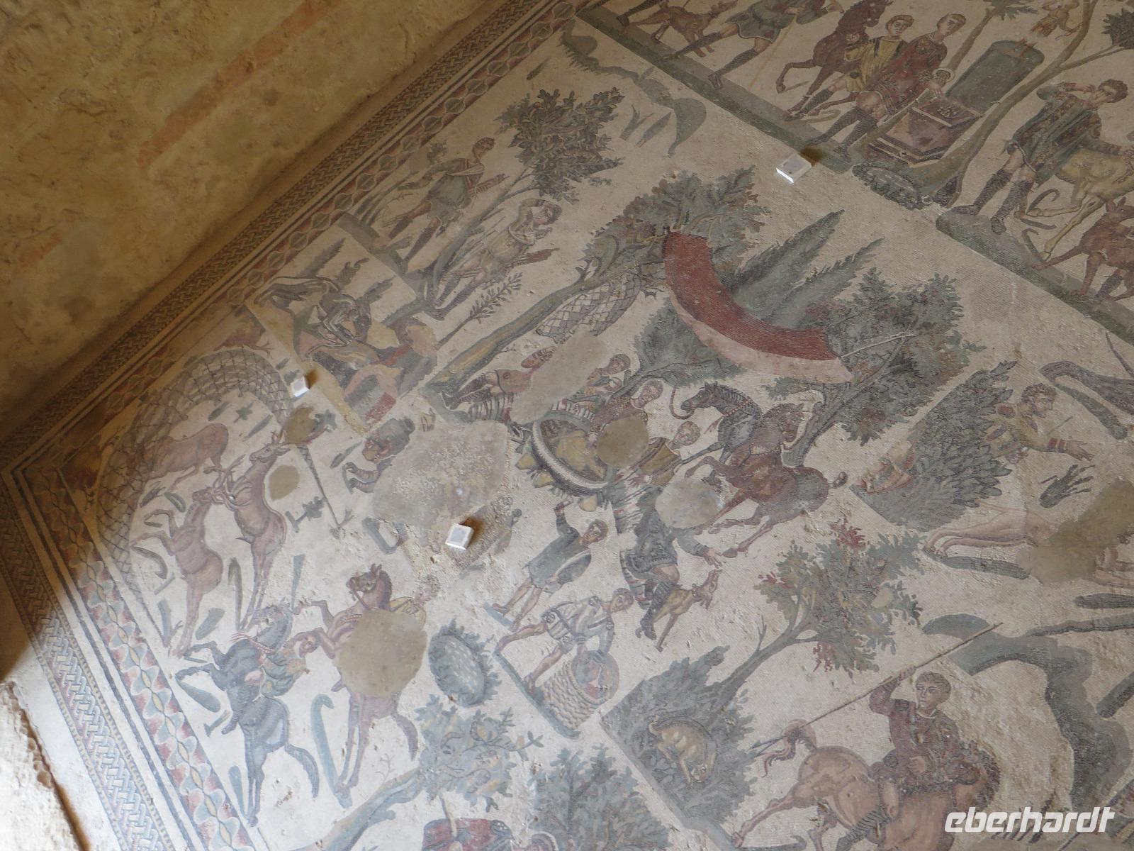 Gebaut wurde sie vermutlich Ende des 3. Jahrhunderts. Ein Erdbeben verschüttete die Villa und sicherte sie zugleich für die Nachwelt. In den Mosaiken werden u. a. Jagdszenen dargestellt. Es gibt auch ein Zimmer, was bspw. spielende Kinder, aber auch Mädchen in Bikinis, zeigt.