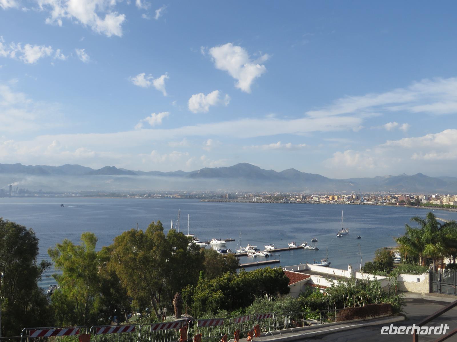 Um das Tagesendziel Milazzo zu erreichen, musste noch das Nebrodi-Gebirge durchquert werden. So fuhren wir durch zahlreiche Tunnel und sahen neben den Bergen auch immer wieder das strahlendblaue Meer. In Milazzo erwies sich die Polizei als Freund und Helfer, denn mehrere Autos parkten in der zweiten Reihe, was ein Passieren der Straße mit unserem Bus unmöglich machte. Während die Gäste eines Restaurants zunächst das Hupen ignorierten, sprangen sie plötzlich auf, als Knöllchen geschrieben wurden.