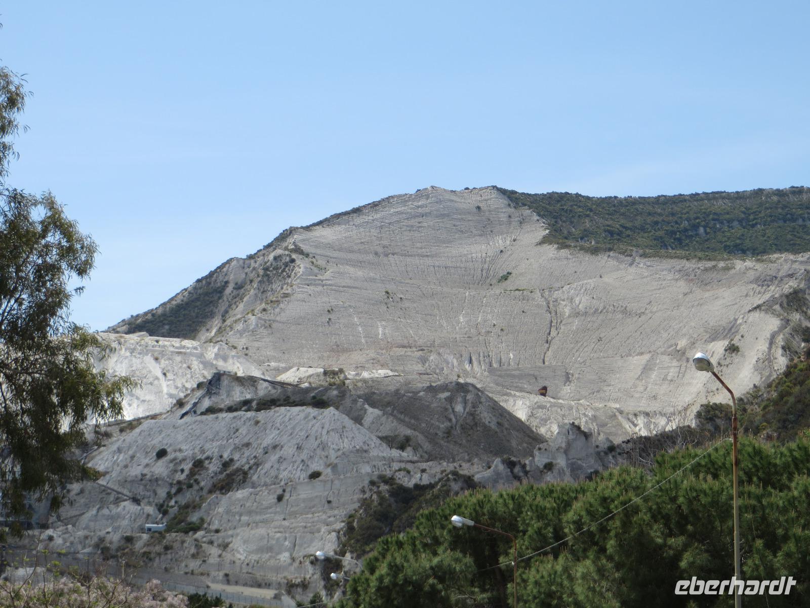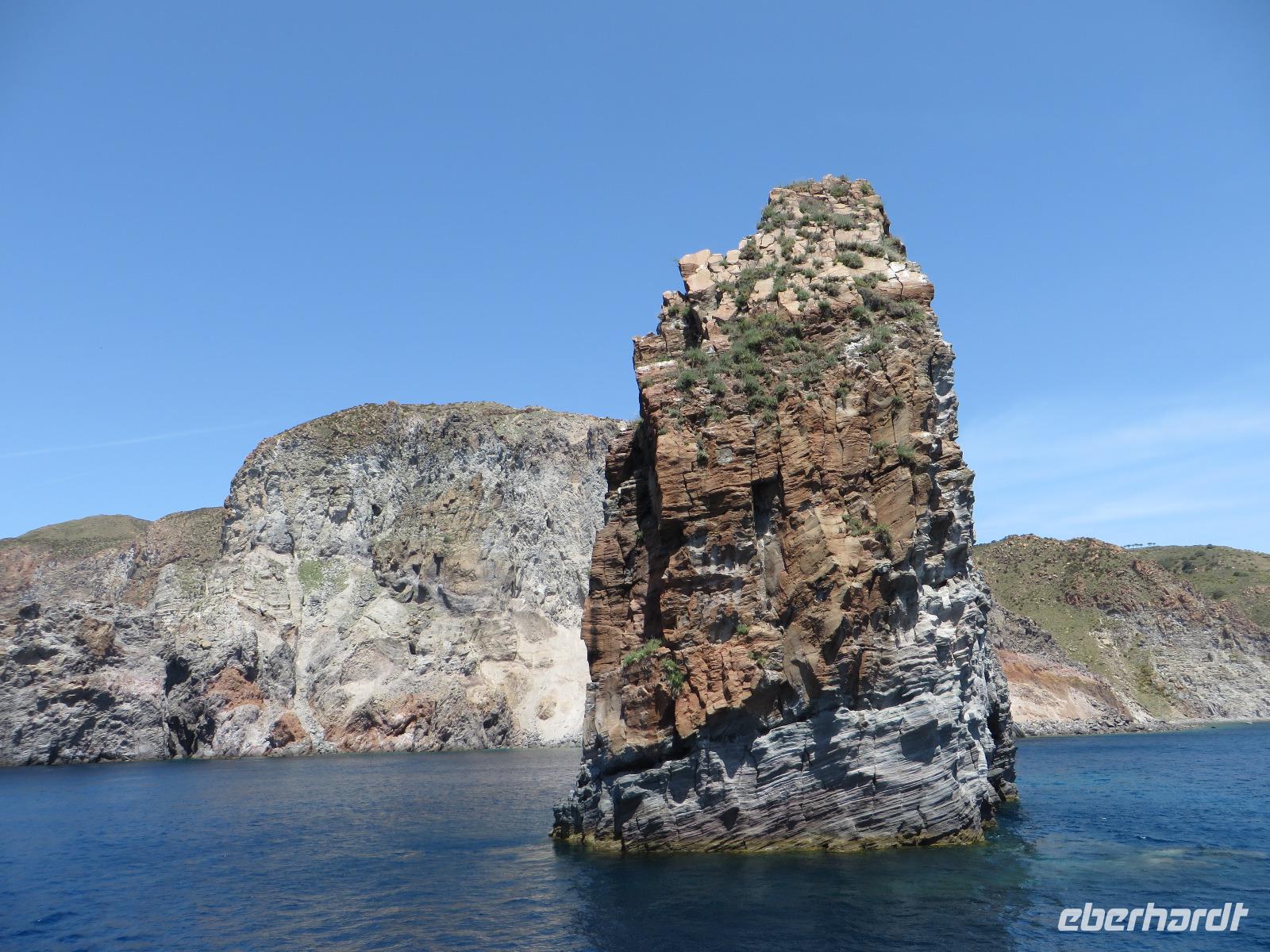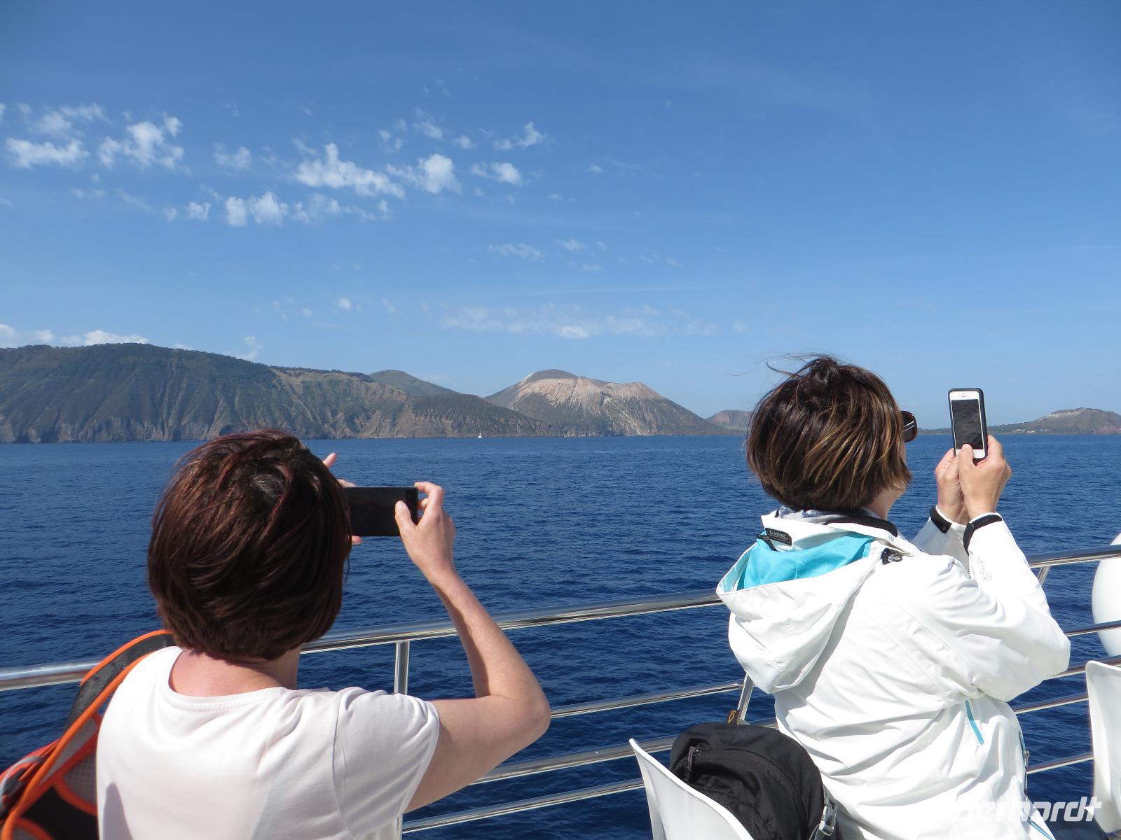 Wir setzten die Fahrt fort und hielten am nächsten Aussichtspunkt, dieses Mal mit Blick auf die Nachbarinsel Salina. Ein alter weißer Fiat 500 hatte es einem Teil unserer Gruppe angetan und so wurden Erinnerungsfotos geschossen. In Acquacalda machten wir noch einen kurzen Fotostopp, bevor wir in das ehemalige Bimssteinabbau-Gebiet fuhren. Mit Ernennung der Liparischen Inseln zum UNESCO-Welterbe wurde der Abbau eingestellt, die Steinbrüche und der Bimsstein-Canyon geben jedoch noch einen Einblick in vergangene Tage. Über Canneto erreichten wir wieder den Ort Lipari und beendeten unsere Inselrundfahrt. Es blieb noch ein wenig Freizeit, bevor wir zur Nachbarinsel Vulcano übersetzten. Auf dem Weg nach Vulcano fuhren wir an einigen freistehenden Felsen, u. a. an der sogenannten „Mumie" vorbei.