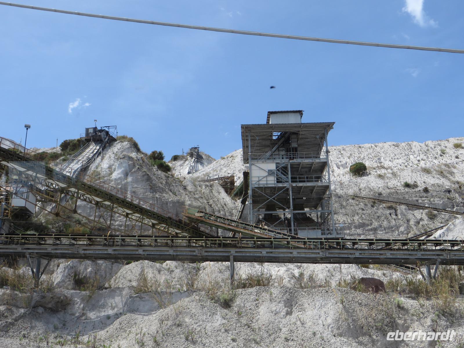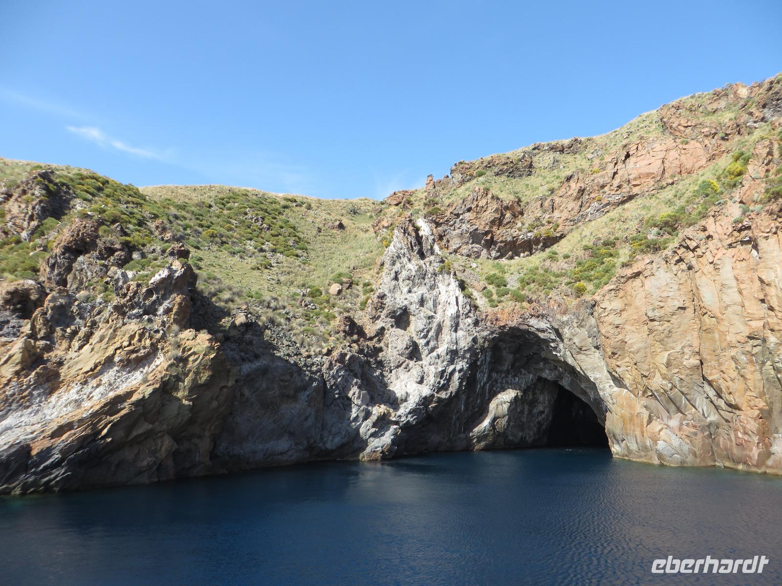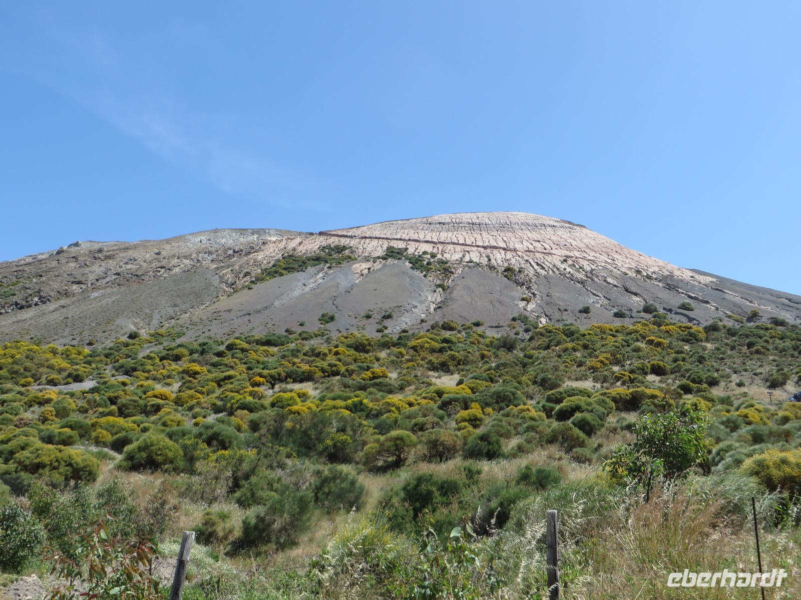 Wir setzten die Fahrt fort und hielten am nächsten Aussichtspunkt, dieses Mal mit Blick auf die Nachbarinsel Salina. Ein alter weißer Fiat 500 hatte es einem Teil unserer Gruppe angetan und so wurden Erinnerungsfotos geschossen. In Acquacalda machten wir noch einen kurzen Fotostopp, bevor wir in das ehemalige Bimssteinabbau-Gebiet fuhren. Mit Ernennung der Liparischen Inseln zum UNESCO-Welterbe wurde der Abbau eingestellt, die Steinbrüche und der Bimsstein-Canyon geben jedoch noch einen Einblick in vergangene Tage. Über Canneto erreichten wir wieder den Ort Lipari und beendeten unsere Inselrundfahrt. Es blieb noch ein wenig Freizeit, bevor wir zur Nachbarinsel Vulcano übersetzten. Auf dem Weg nach Vulcano fuhren wir an einigen freistehenden Felsen, u. a. an der sogenannten „Mumie" vorbei.