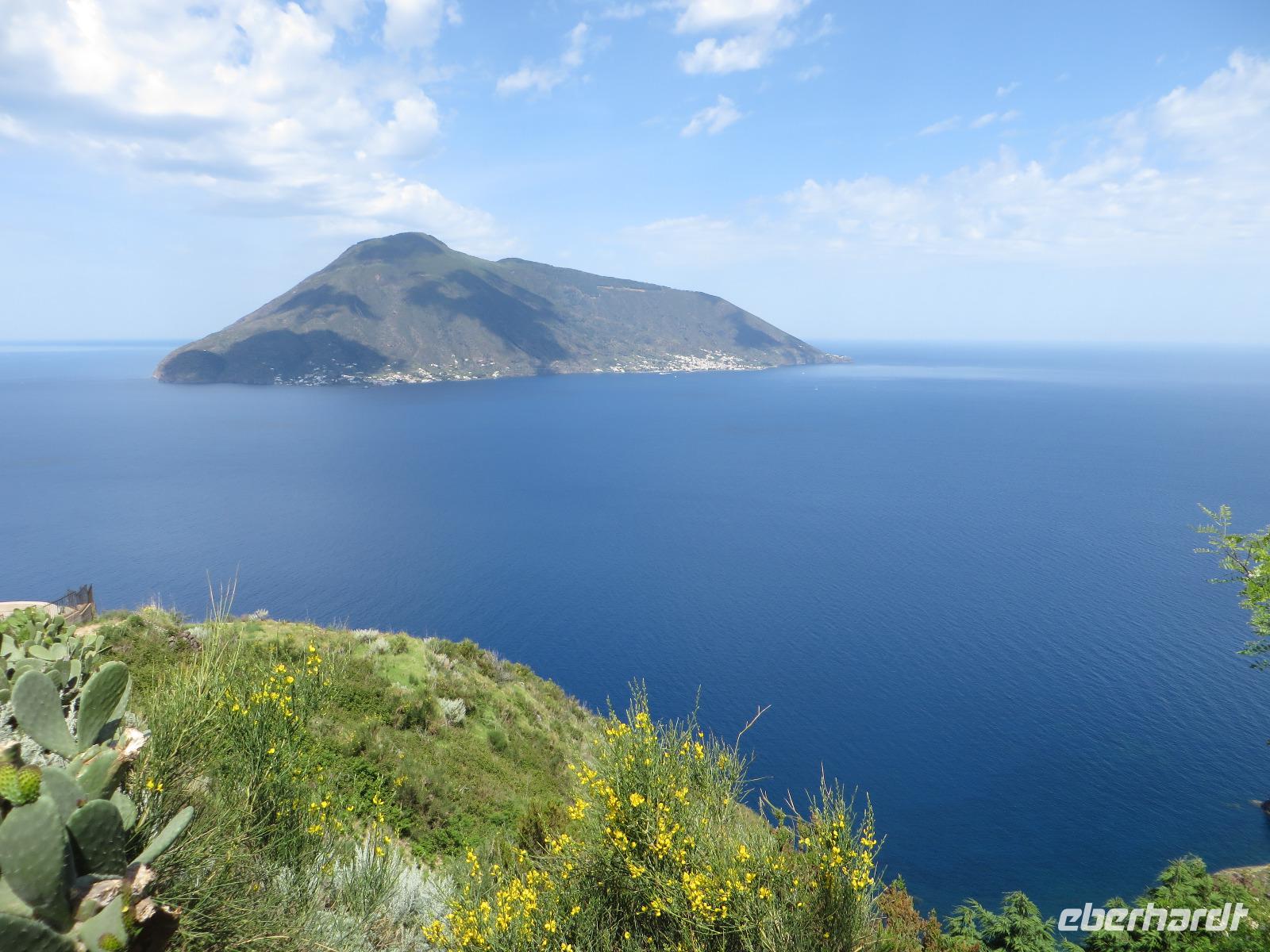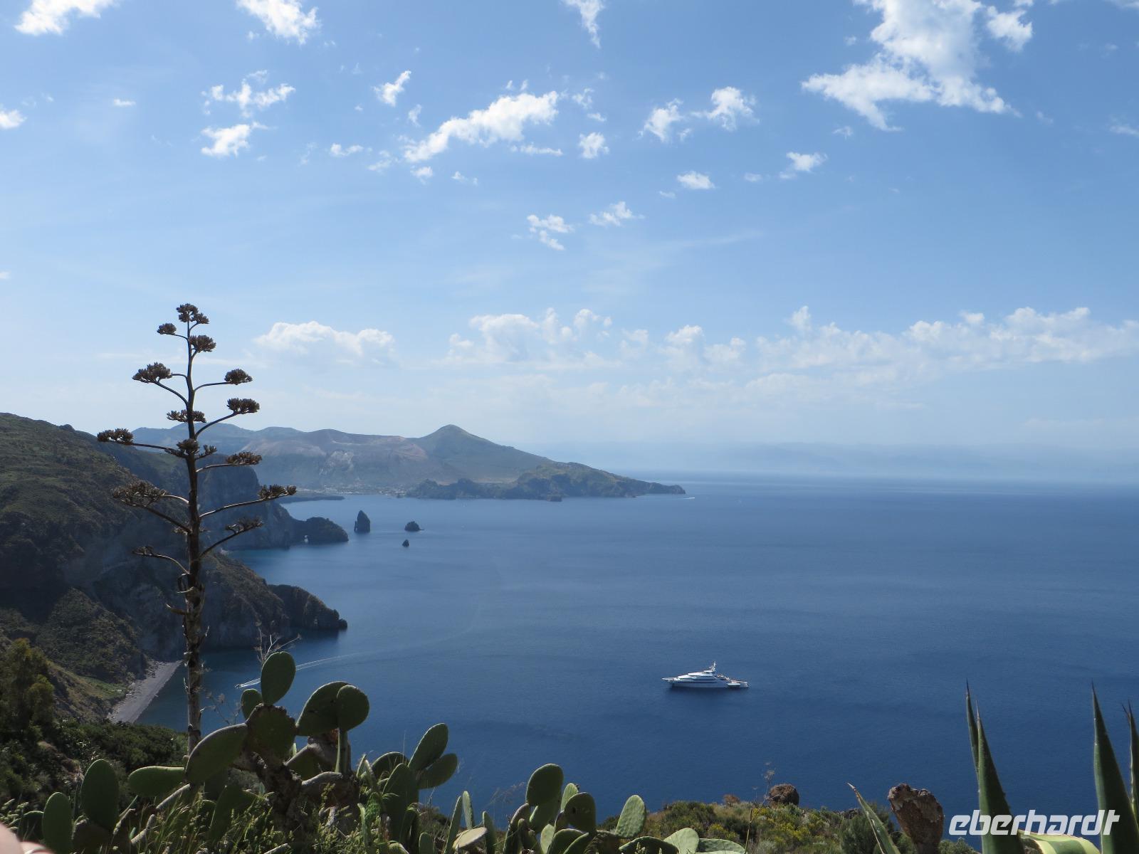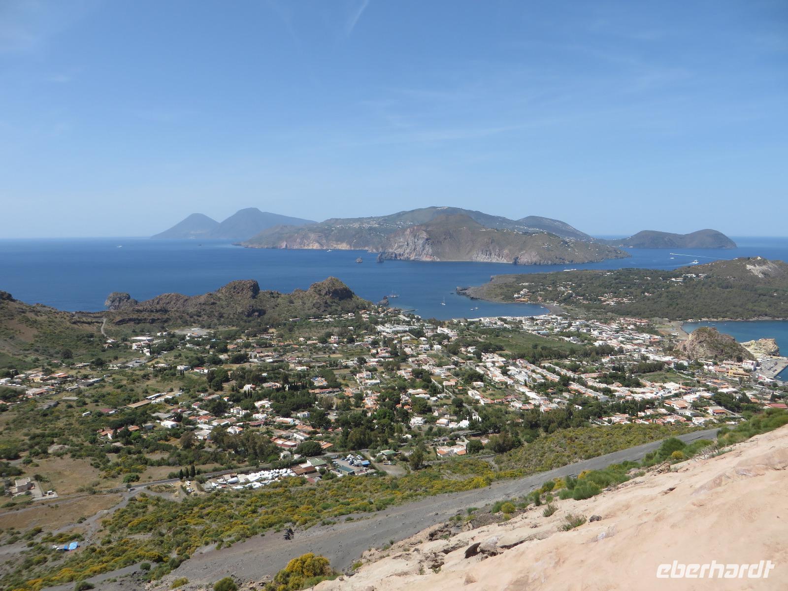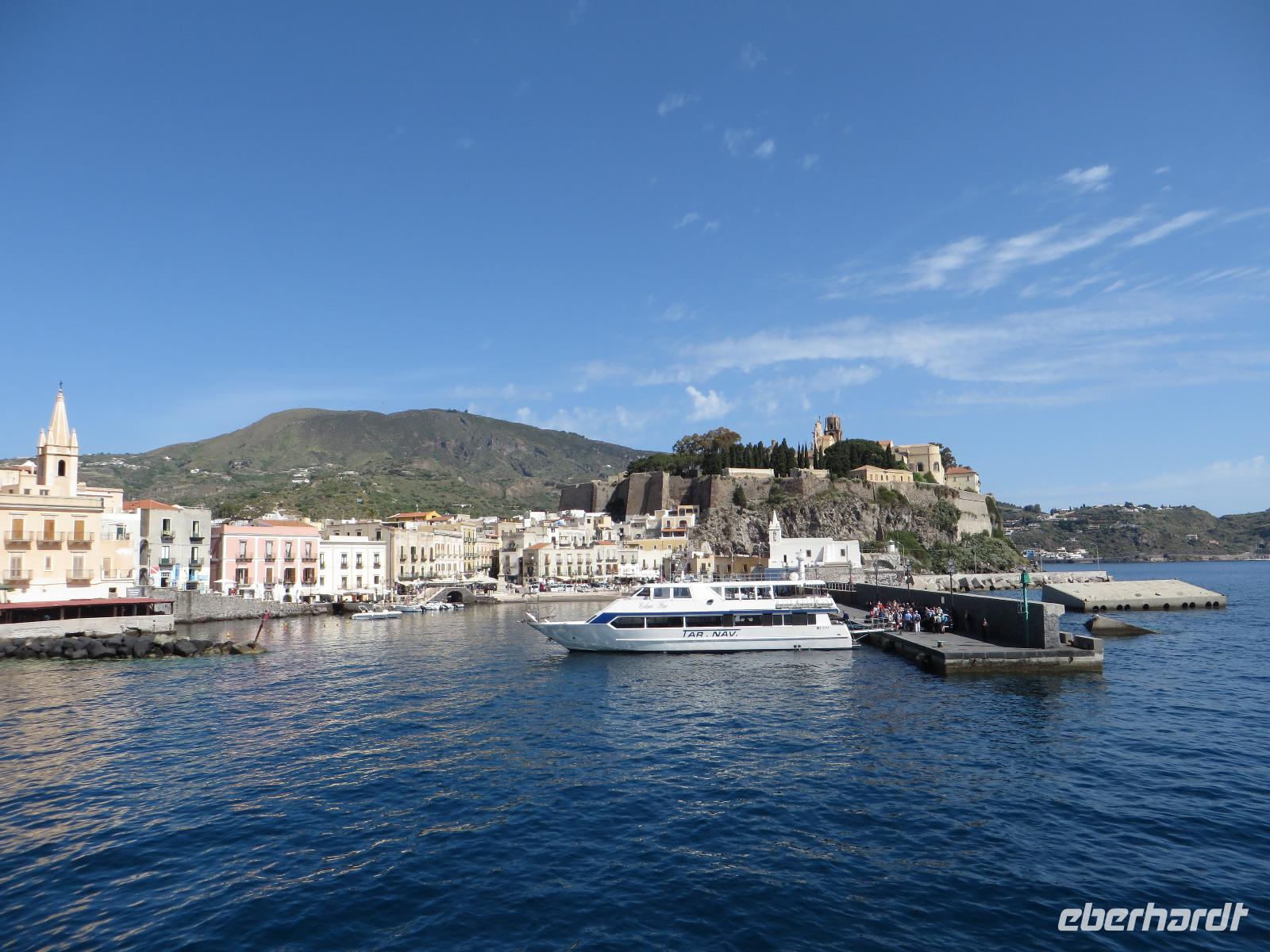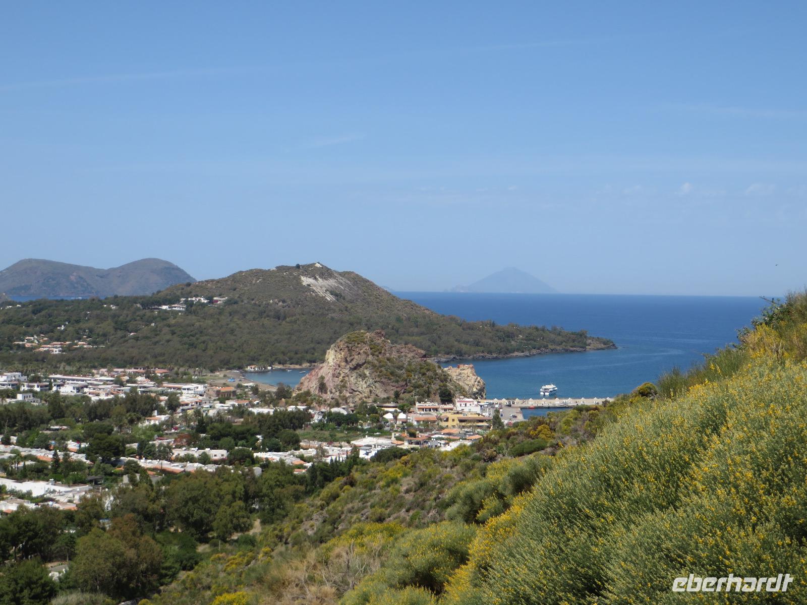 Diesmal brachte uns unser Reisebus zum nur 2 Kilometer entfernten Hafen von Milazzo. Wir stiegen auf das Schiff „Sweet Harmony", welches uns nach Lipari brachte. Nach einem kurzen Spaziergang durch die Stadt Lipari umrundeten wir in einem örtlichen Bus die Insel. Der erste Halt war am berühmtesten Aussichtspunkt der Insel, dem Belvedere Quattrocchi - auf Deutsch „4 Augen". Für den wunderbaren Blick auf das blaue Meer und in Richtung Krater Vulcano reichten zwei Augen kaum aus. Während des Stopps probierten wir Kapern. In der Zwischenzeit pflückte unser Fahrer wilden Fenchel und einen Kapernast, welche anschließend im Bus zum Riechen und Fühlen herumgegeben wurden.