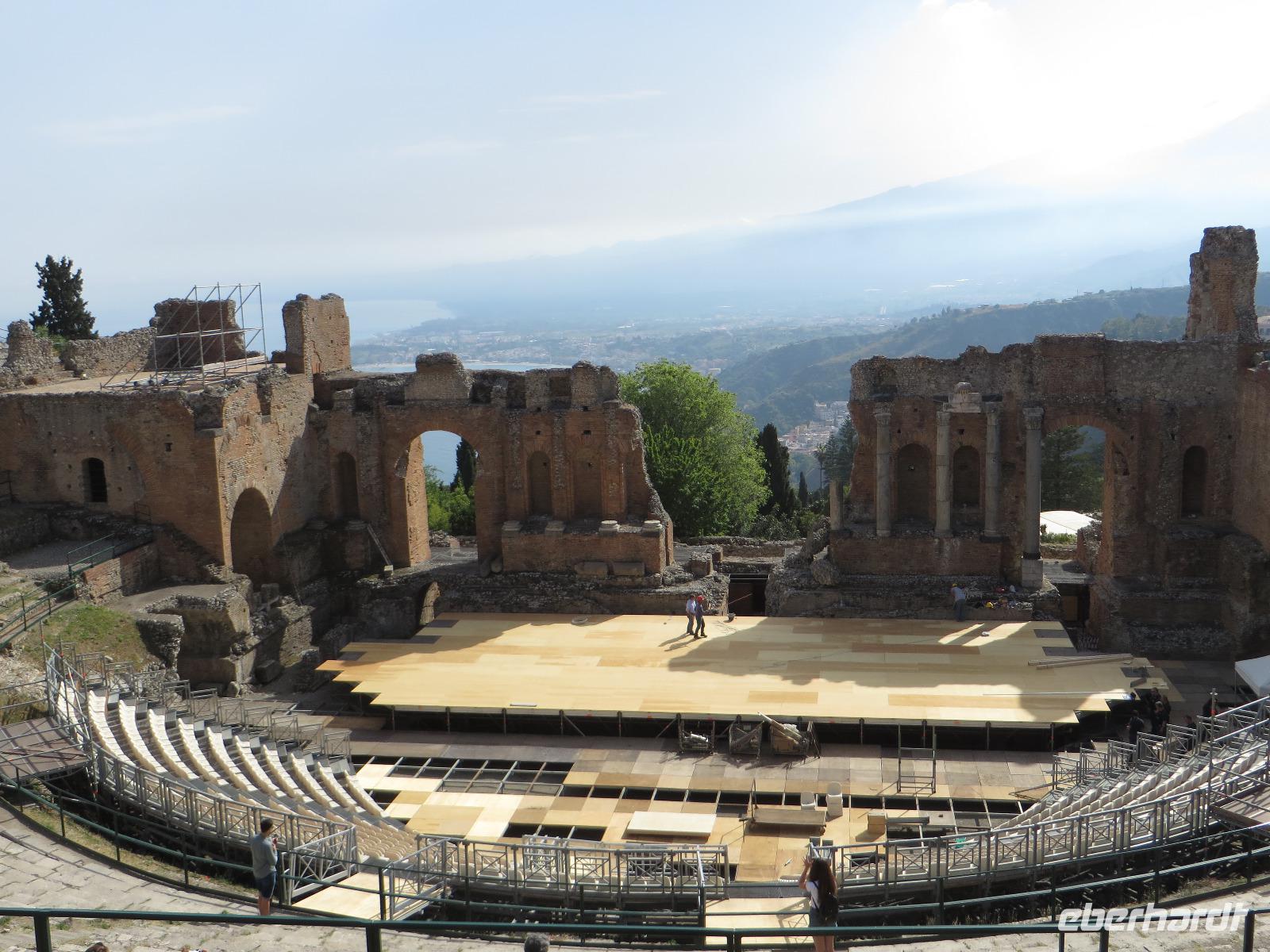 Unser letzter gemeinsamer Programmpunkt war der Besuch des antiken Theaters. Leider war der Zugang aufgrund gesperrter Straßen, in Vorbereitung für den bevorstehenden G7-Gipfel, beschwerlich. Aber Renate fand den richtigen Weg. Mit dem traumhaften Blick auf die Bucht von Giardini Naxos und dem Ätna verabschiedeten wir die beiden Gäste aus Hannover.