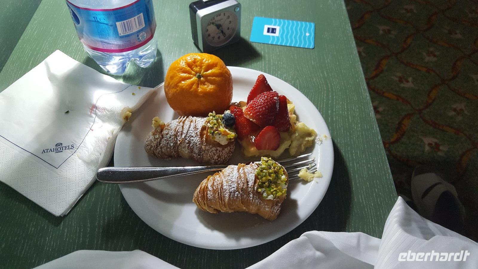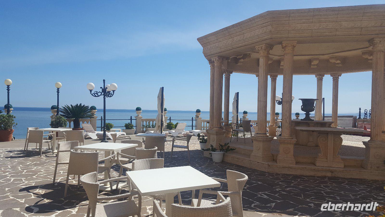 Eine wunderschöne, elegante Hotelanlage mit Pool und direktem Blick auf das im Sonnenschein glänzende Meer, ist unser zu Hause für die nächsten 2 Nächte. Jetzt wird erst einmal eine kleine Pause gemacht und auch der Nachmittag steht zur freien Verfügung, um sich vom zeitigen Aufstehen zu erholen und einen kleinen Spaziergang durch Giardini Naxos zu unternehmen.