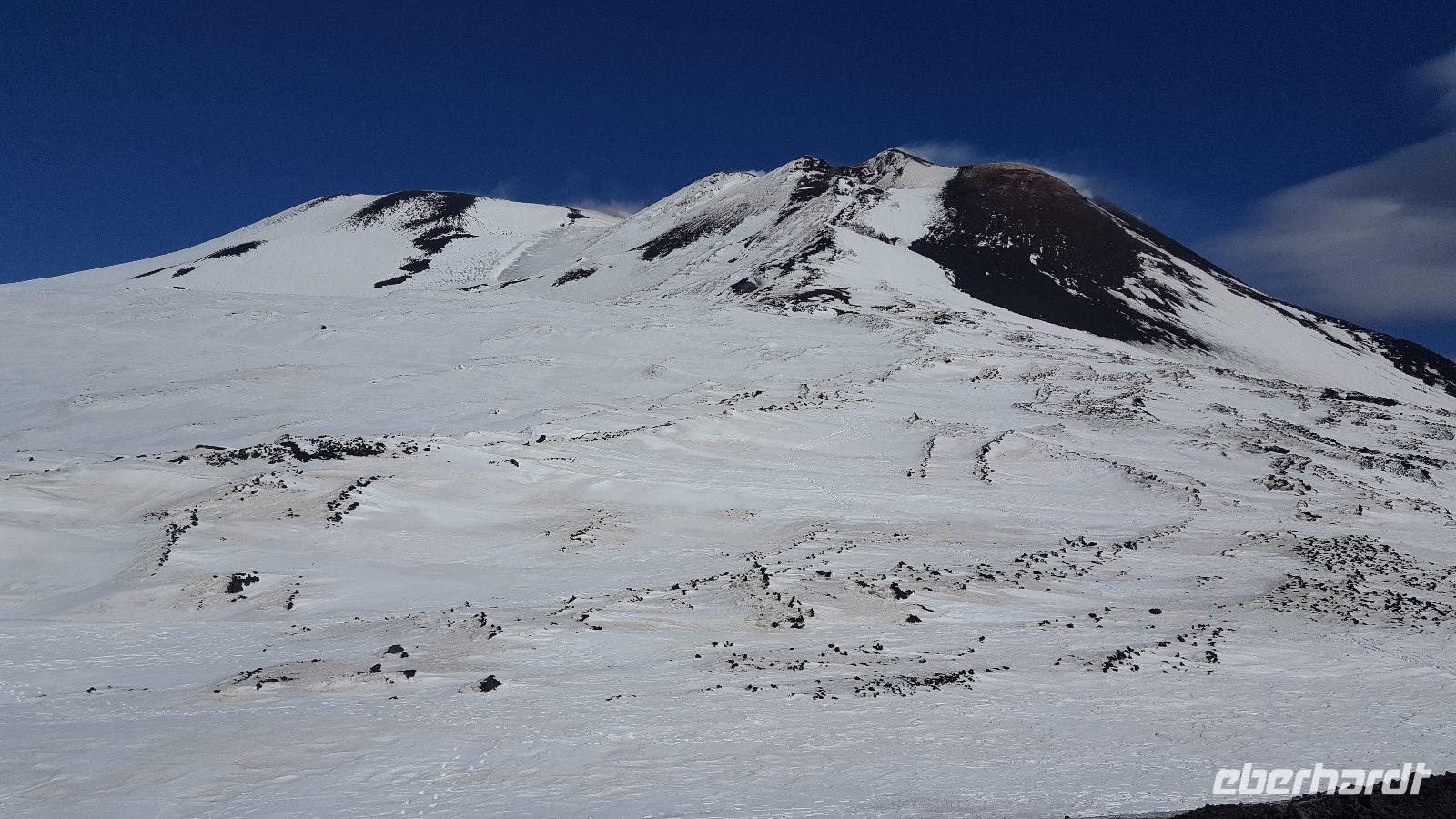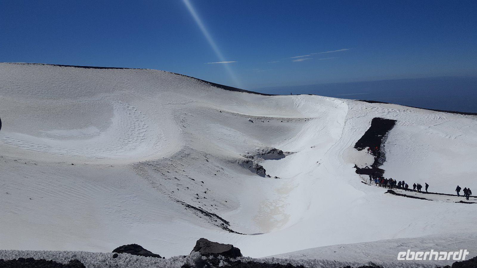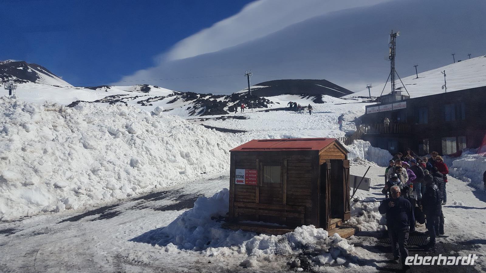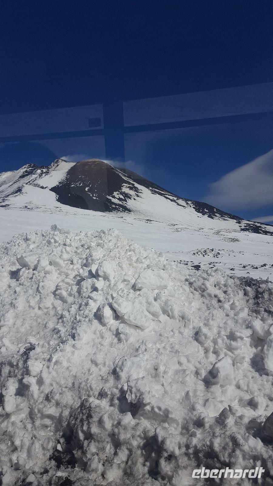 Heute wird es spannend, denn wir werden den Ätna erklimmen. Nach einem stärkenden Frühstück, machen wir uns auf den Weg. Mit dem Bus geht es zuerst durch kleinere Orte und Serpentinen auf eine Höhe von knapp 2000 m. Wer möchte, konnte sich nun entscheiden, ob er auch bis ca. 3000 m weiter hoch möchte. Ungefähr die Hälfte der Gruppe war so abenteuerlustig und so stellten wir uns in die Schlange, um die Tickets für die Seilbahn und die anschließende Jeep-Fahrt zu holen. Von den Seilbahngondeln aus, sahen wir immer wieder mutige Skifahrer, welche sich den steilen Hang hinauf bemühten. Der Ätna im Schnee ist ein Erlebnis, welches man nicht so schnell findet und vergisst. Auf ca. 3000 m Höhe bläßt ein unfassbar starker Wind, der es einem mitunter sehr schwer macht, nicht fortgeweht zu werden. Hinzu kommt eine beißende Kälte, die ohne Mütze über den Ohren und einen dicken Schaal um den Hals, zu einer echten Herausforderung wird. Die schneebedeckte Vulkanlandschaft mit eigenen Augen gesehen zu haben ist es jedoch auf jeden Fall wert.