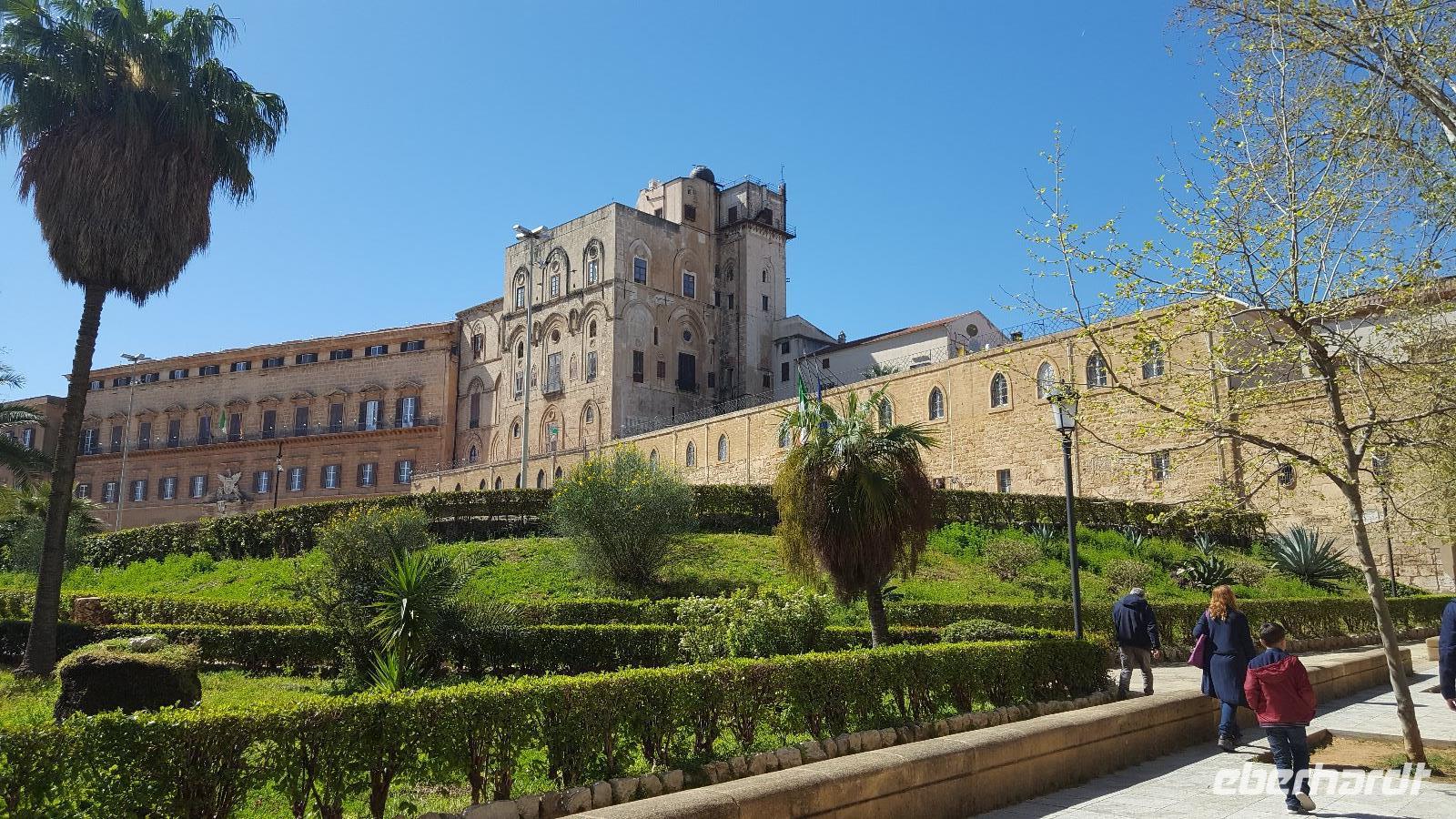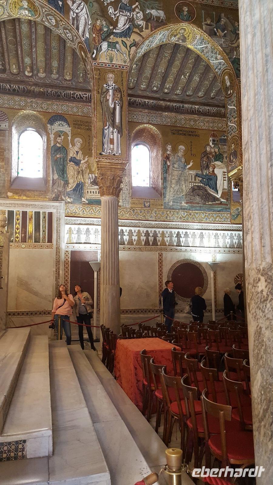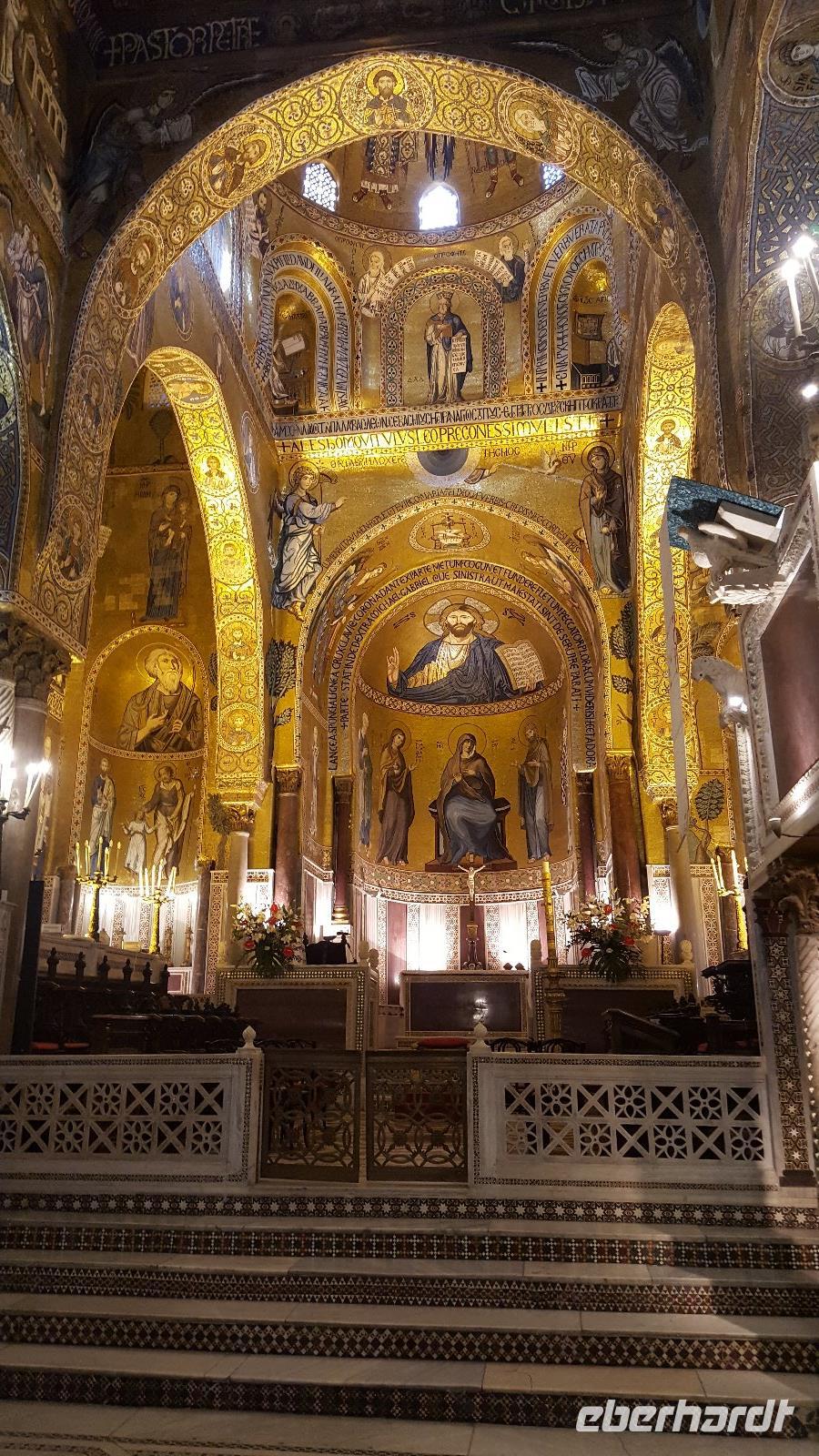 Am Morgen heißt es wieder Koffer packen, denn wir verlassen das Örtchen Castrelvetrano in Richtung Palermo. Dort angekommen führte uns Desiree in den Normannenpalast und darin in die berühmte Capella Palatina, die Hofkapelle in byzantinisch-arabisch-normannischen Stil erbaut. Besonders beeindruckend ist hier das kunstvolle Mosaik in der Kuppel der Kapelle.