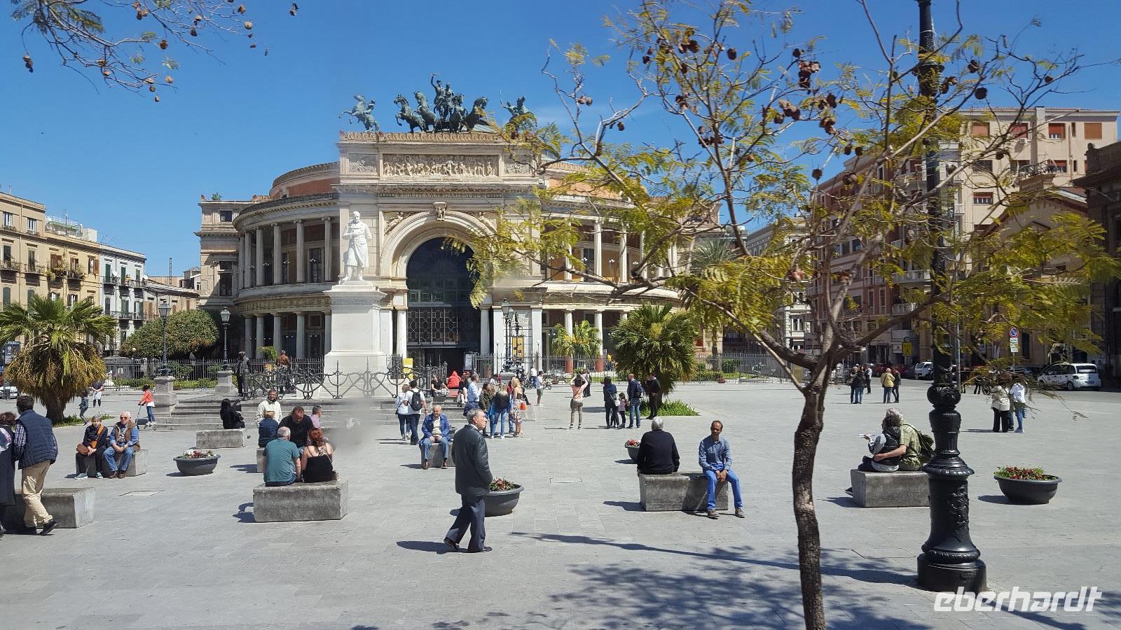 Gestärkt können wir dann unseren Rundgang durch Palermo, vorbei am Brunnen "Fontana Pretoria", fortsetzen. Unser Chauffeur Rosario ist pünktlich zur Stelle und so springen wir schnell in den Bus und fahren einmal um das Teatro Massimo, das Opernhaus von Palermo, rundherum.